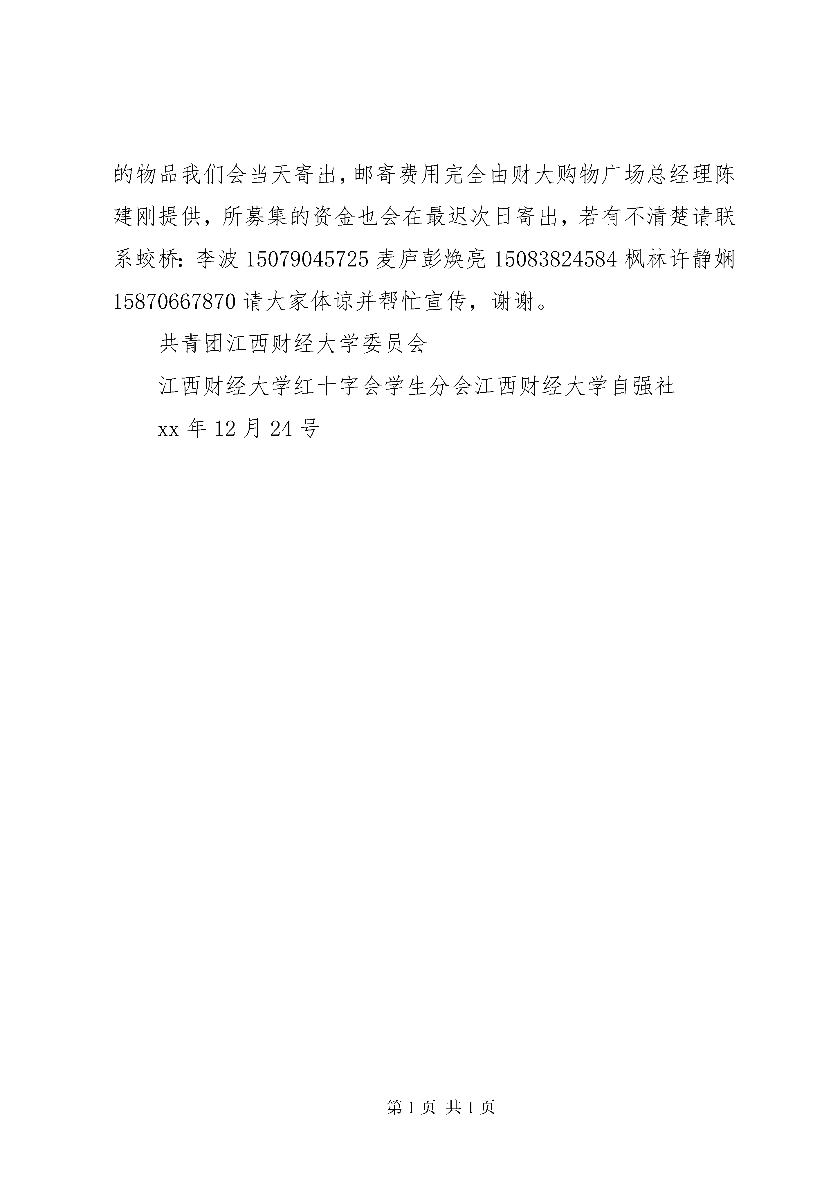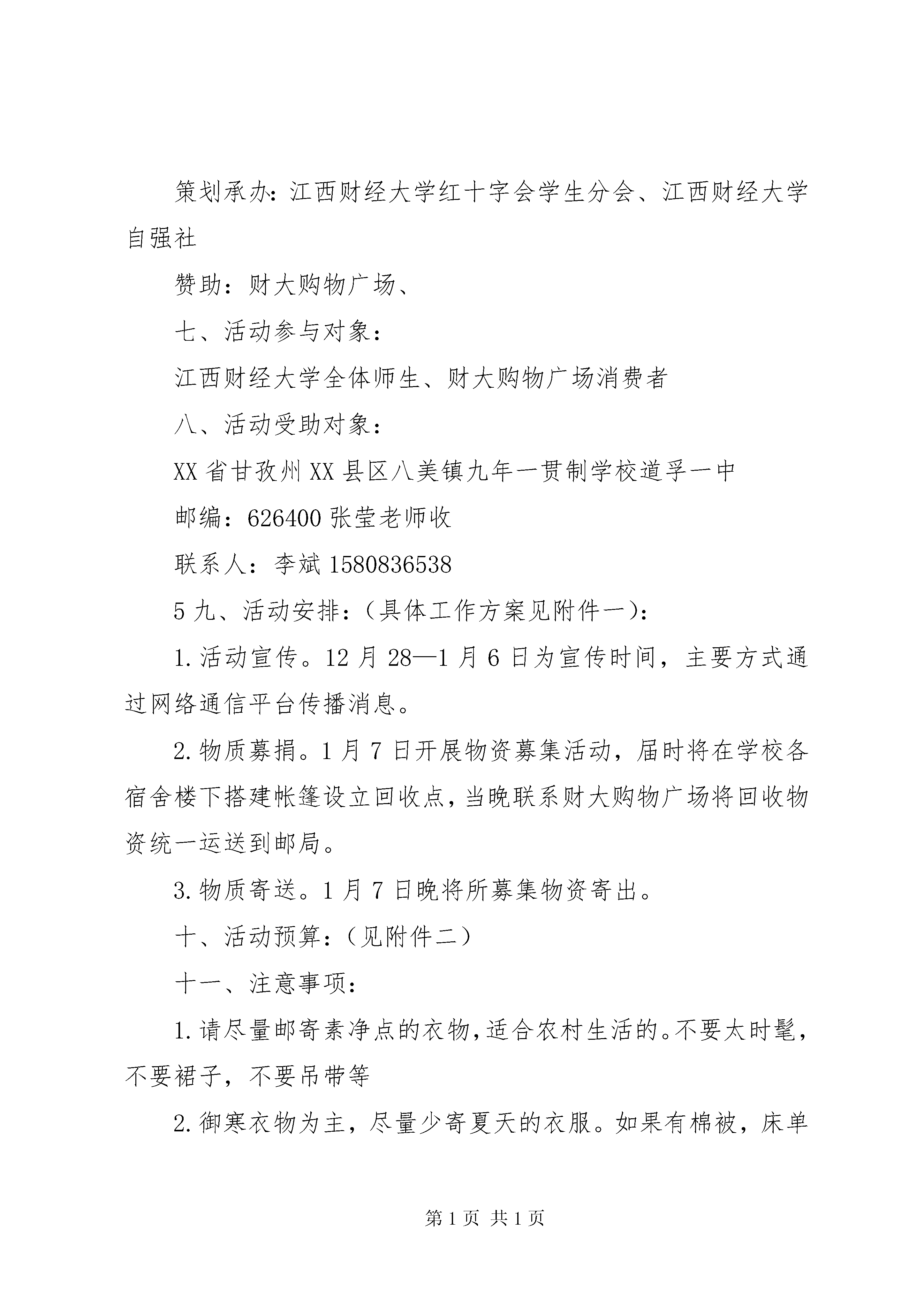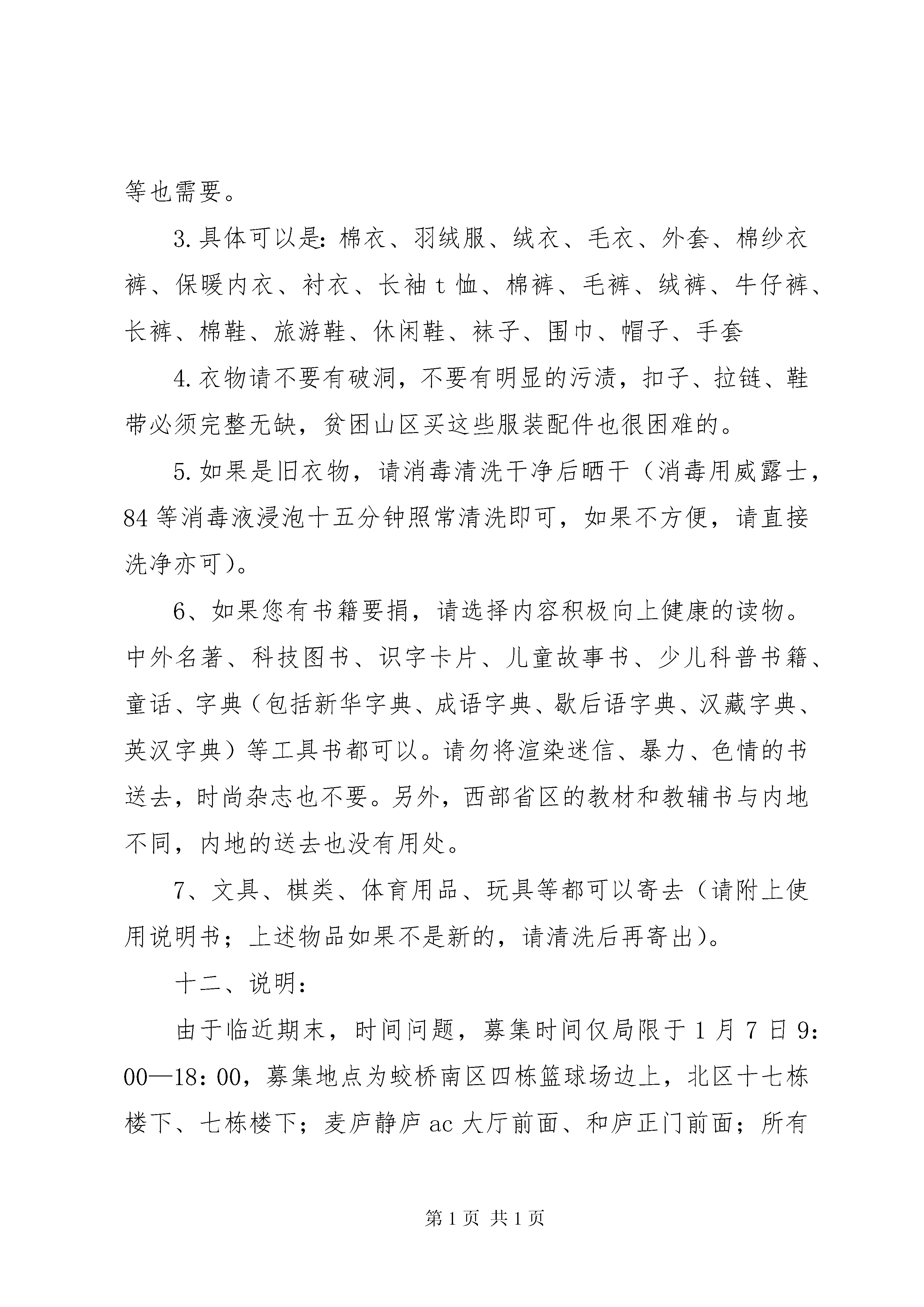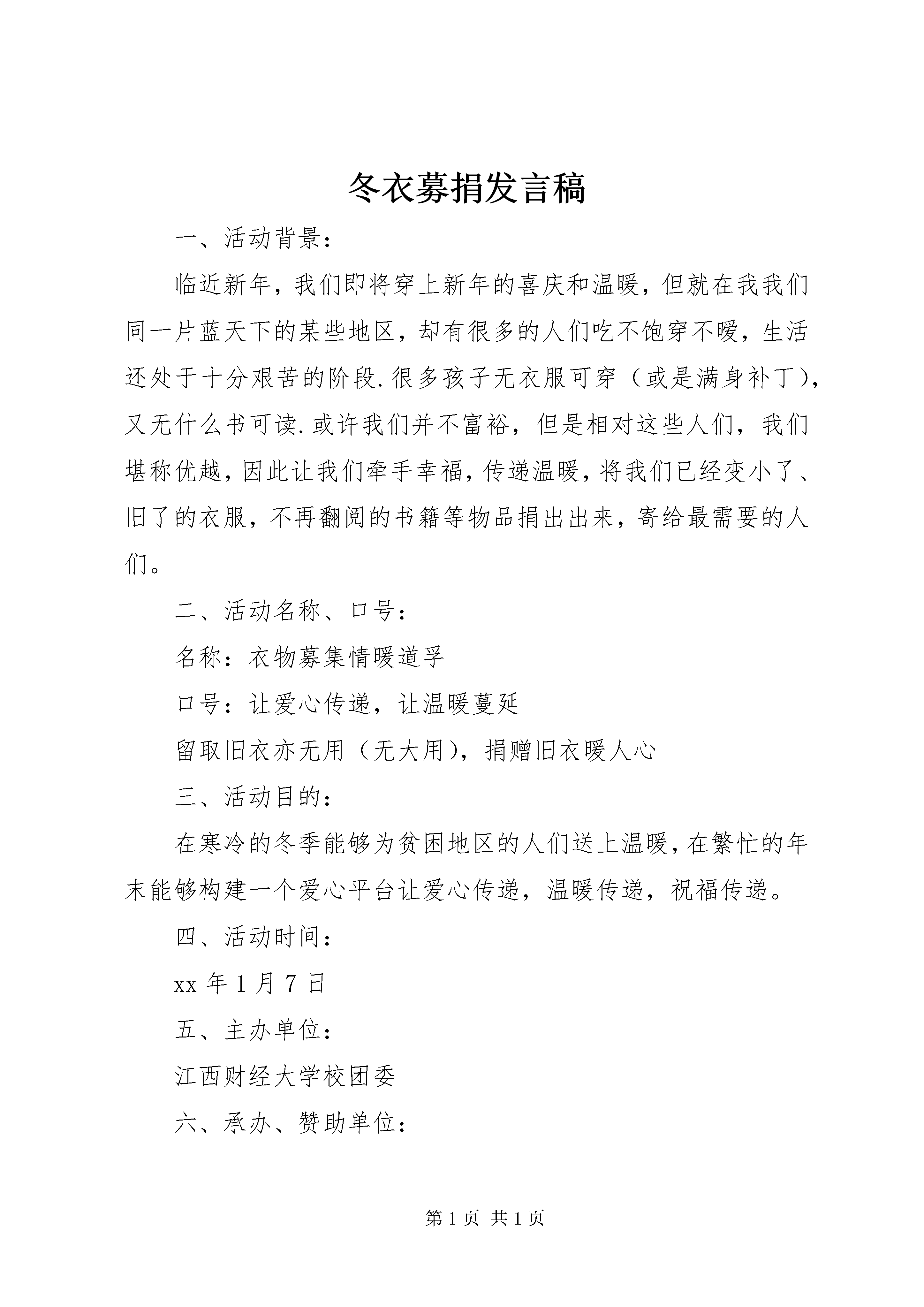 冬衣募捐发言稿一、活动背景:临近新年,我们即将穿上新年的喜庆和温暖,但就在我我们同一片蓝天下的某些地区,却有很多的人们吃不饱穿不暧,生活还处于十分艰苦的阶段.很多孩子无衣服可穿(或是满身补丁),又无什么书可读.或许我们并不富裕,但是相对这些人们,我们堪称优越,因此让我们牵手幸福,传递温暖,将我们已经变小了、旧了的衣服,不再翻阅的书籍等物品捐出出来,寄给最需要的人们。二、活动名称、口号:名称:衣物募集情暖道孚口号:让爱心传递,让温暖蔓延留取旧衣亦无用(无大用),捐赠旧衣暖人心三、活动目的:在寒冷的冬季能够为贫困地区的人们送上温暖,在繁忙的年末能够构建一个爱心平台让爱心传递,温暖传递,祝福传递。四、活动时间:xx年1月7日五、主办单位:江西财经大学校团委六、承办、赞助单位:策划承办:江西财经大学红十字会学生分会、江西财经大学自强社赞助:财大购物广场、七、活动参与对象:江西财经大学全体师生、财大购物广场消费者八、活动受助对象:XX省甘孜州XX县区八美镇九年一贯制学校道孚一中邮编:626400张莹老师收联系人:李斌15808365385九、活动安排:(具体工作方案见附件一):1.活动宣传。12月28—1月6日为宣传时间,主要方式通过网络通信平台传播消息。2.物质募捐。1月7日开展物资募集活动,届时将在学校各宿舍楼下搭建帐篷设立回收点,当晚联系财大购物广场将回收物资统一运送到邮局。3.物质寄送。1月7日晚将所募集物资寄出。十、活动预算:(见附件二)十一、注意事项:1.请尽量邮寄素净点的衣物,适合农村生活的。不要太时髦,不要裙子,不要吊带等2.御寒衣物为主,尽量少寄夏天的衣服。如果有棉被,床单等也需要。3.具体可以是:棉衣、羽绒服、绒衣、毛衣、外套、棉纱衣裤、保暖内衣、衬衣、长袖t恤、棉裤、毛裤、绒裤、牛仔裤、长裤、棉鞋、旅游鞋、休闲鞋、袜子、围巾、帽子、手套4.衣物请不要有破洞,不要有明显的污渍,扣子、拉链、鞋带必须完整无缺,贫困山区买这些服装配件也很困难的。5.如果是旧衣物,请消毒清洗干净后晒干(消毒用威露士,84等消毒液浸泡十五分钟照常清洗即可,如果不方便,请直接洗净亦可)。6、如果您有书籍要捐,请选择内容积极向上健康的读物。中外名著、科技图书、识字卡片、儿童故事书、少儿科普书籍、童话、字典(包括新华字典、成语字典、歇后语字典、汉藏字典、英汉字典)等工具书都可以。请勿将渲染迷信、暴力、色情的书送去,时尚杂志也不要。另外,西部省区的教材和教辅书与内地不同,内地的送去也没有用处。7、文具、棋类、体育用品、玩具等都可以寄去(请附上使用说明书;上述物品如果不是新的,请清洗后再寄出)。十二、说明:由于临近期末,时间问题,募集时间仅局限于1月7日9:00—18:00,募集地点为蛟桥南区四栋篮球场边上,北区十七栋楼下、七栋楼下;麦庐静庐ac大厅前面、和庐正门前面;所有的物品我们会当天寄出,邮寄费用完全由财大购物广场总经理陈建刚提供,所募集的资金也会在最迟次日寄出,若有不清楚请联系蛟桥:李波15079045725麦庐彭焕亮15083824584枫林许静娴15870667870请大家体谅并帮忙宣传,谢谢。共青团江西财经大学委员会江西财经大学红十字会学生分会江西财经大学自强社xx年12月24号