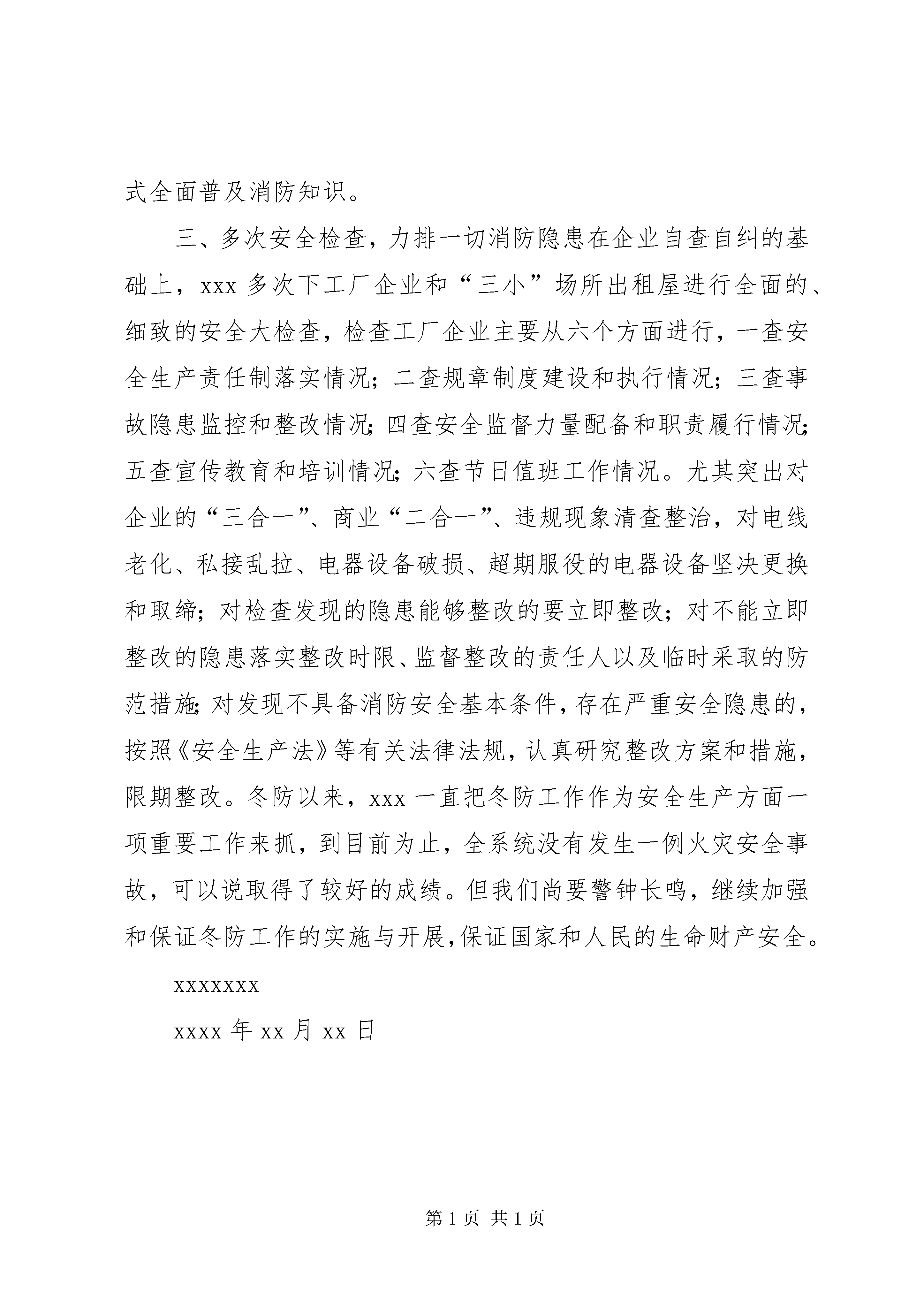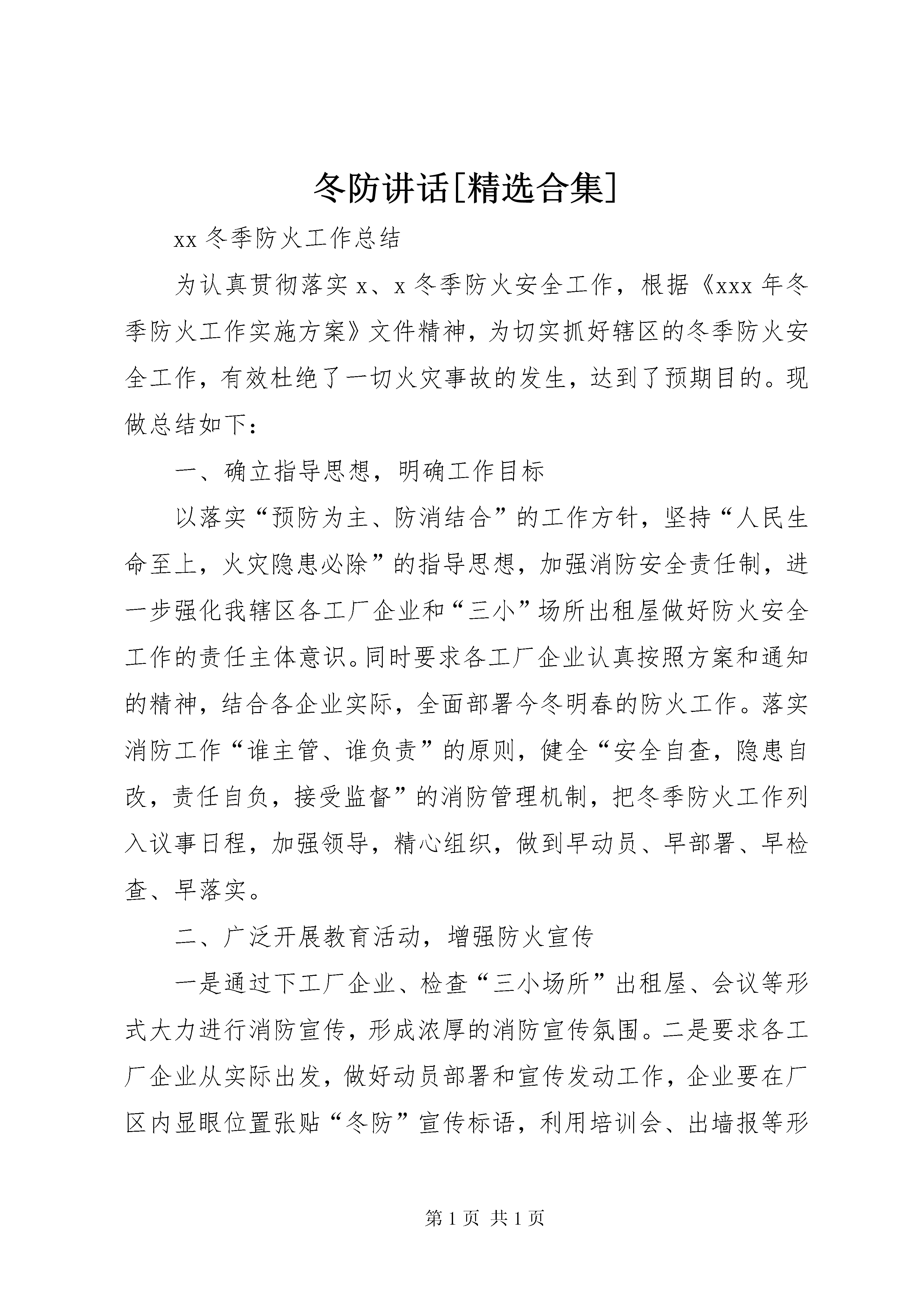 冬防讲话[精选合集]xx冬季防火工作总结为认真贯彻落实x、x冬季防火安全工作,根据《xxx年冬季防火工作实施方案》文件精神,为切实抓好辖区的冬季防火安全工作,有效杜绝了一切火灾事故的发生,达到了预期目的。现做总结如下:一、确立指导思想,明确工作目标以落实“预防为主、防消结合”的工作方针,坚持“人民生命至上,火灾隐患必除”的指导思想,加强消防安全责任制,进一步强化我辖区各工厂企业和“三小”场所出租屋做好防火安全工作的责任主体意识。同时要求各工厂企业认真按照方案和通知的精神,结合各企业实际,全面部署今冬明春的防火工作。落实消防工作“谁主管、谁负责”的原则,健全“安全自查,隐患自改,责任自负,接受监督”的消防管理机制,把冬季防火工作列入议事日程,加强领导,精心组织,做到早动员、早部署、早检查、早落实。二、广泛开展教育活动,增强防火宣传一是通过下工厂企业、检查“三小场所”出租屋、会议等形式大力进行消防宣传,形成浓厚的消防宣传氛围。二是要求各工厂企业从实际出发,做好动员部署和宣传发动工作,企业要在厂区内显眼位置张贴“冬防”宣传标语,利用培训会、出墙报等形式全面普及消防知识。三、多次安全检查,力排一切消防隐患在企业自查自纠的基础上,xxx多次下工厂企业和“三小”场所出租屋进行全面的、细致的安全大检查,检查工厂企业主要从六个方面进行,一查安全生产责任制落实情况;二查规章制度建设和执行情况;三查事故隐患监控和整改情况;四查安全监督力量配备和职责履行情况;五查宣传教育和培训情况;六查节日值班工作情况。尤其突出对企业的“三合一”、商业“二合一”、违规现象清查整治,对电线老化、私接乱拉、电器设备破损、超期服役的电器设备坚决更换和取缔;对检查发现的隐患能够整改的要立即整改;对不能立即整改的隐患落实整改时限、监督整改的责任人以及临时采取的防范措施;对发现不具备消防安全基本条件,存在严重安全隐患的,按照《安全生产法》等有关法律法规,认真研究整改方案和措施,限期整改。冬防以来,xxx一直把冬防工作作为安全生产方面一项重要工作来抓,到目前为止,全系统没有发生一例火灾安全事故,可以说取得了较好的成绩。但我们尚要警钟长鸣,继续加强和保证冬防工作的实施与开展,保证国家和人民的生命财产安全。xxxxxxxxxxx年xx月xx日