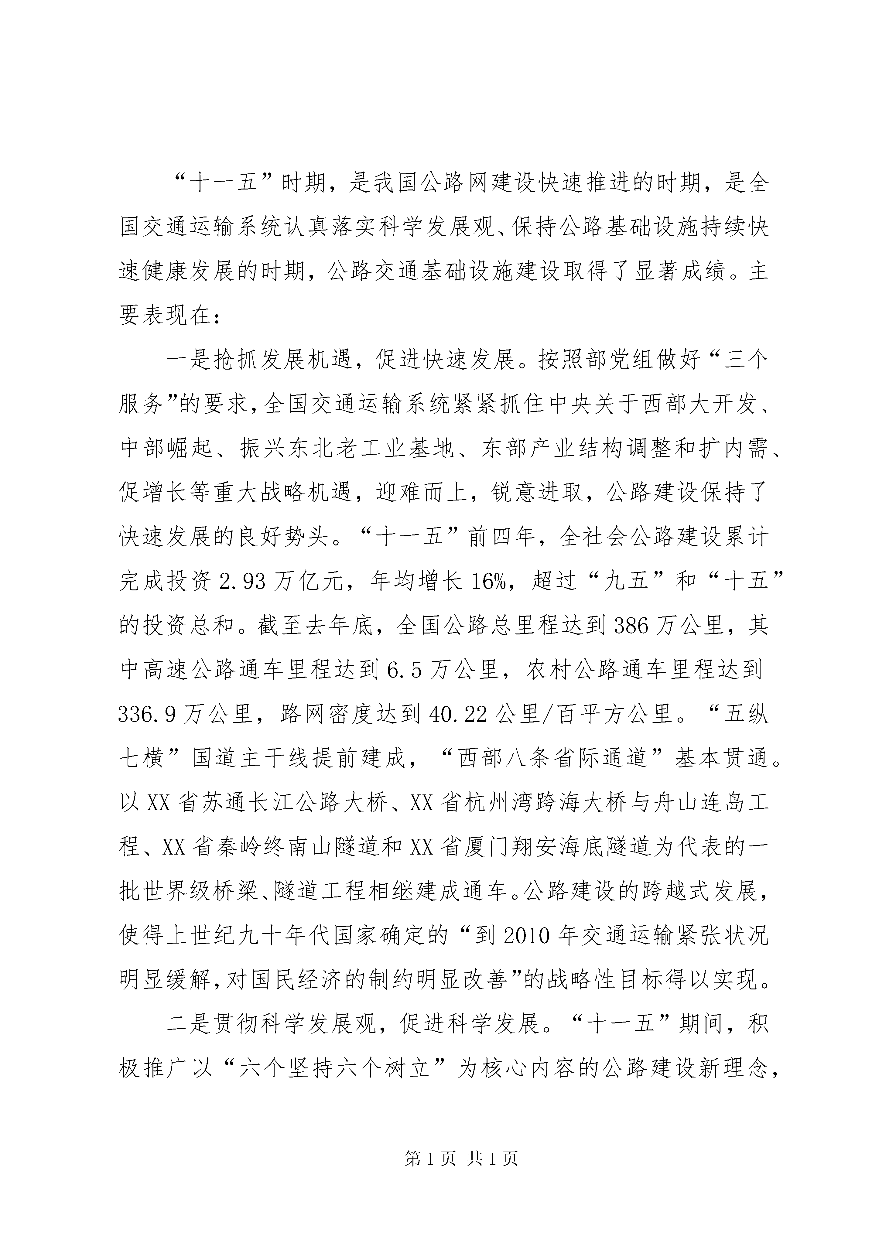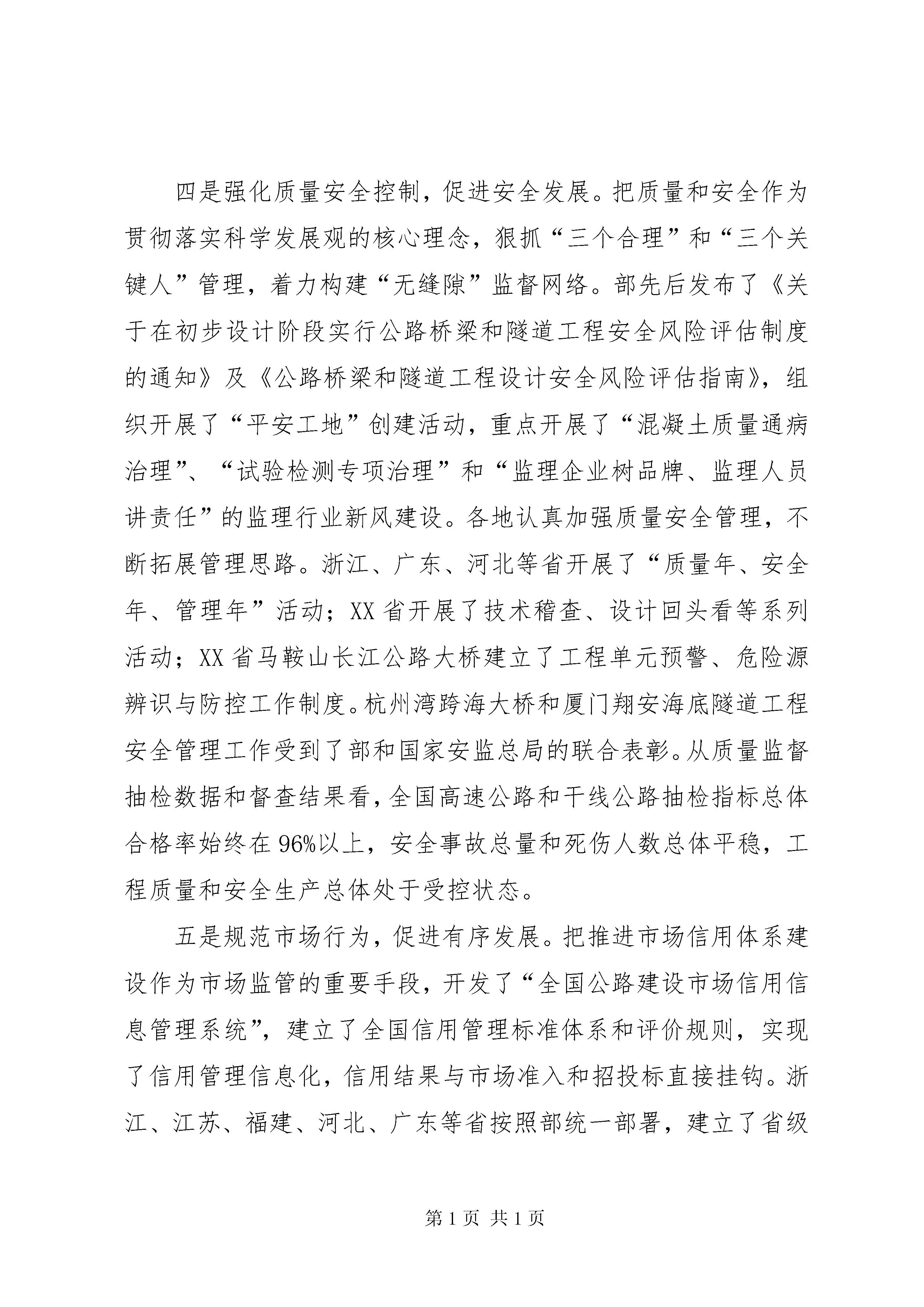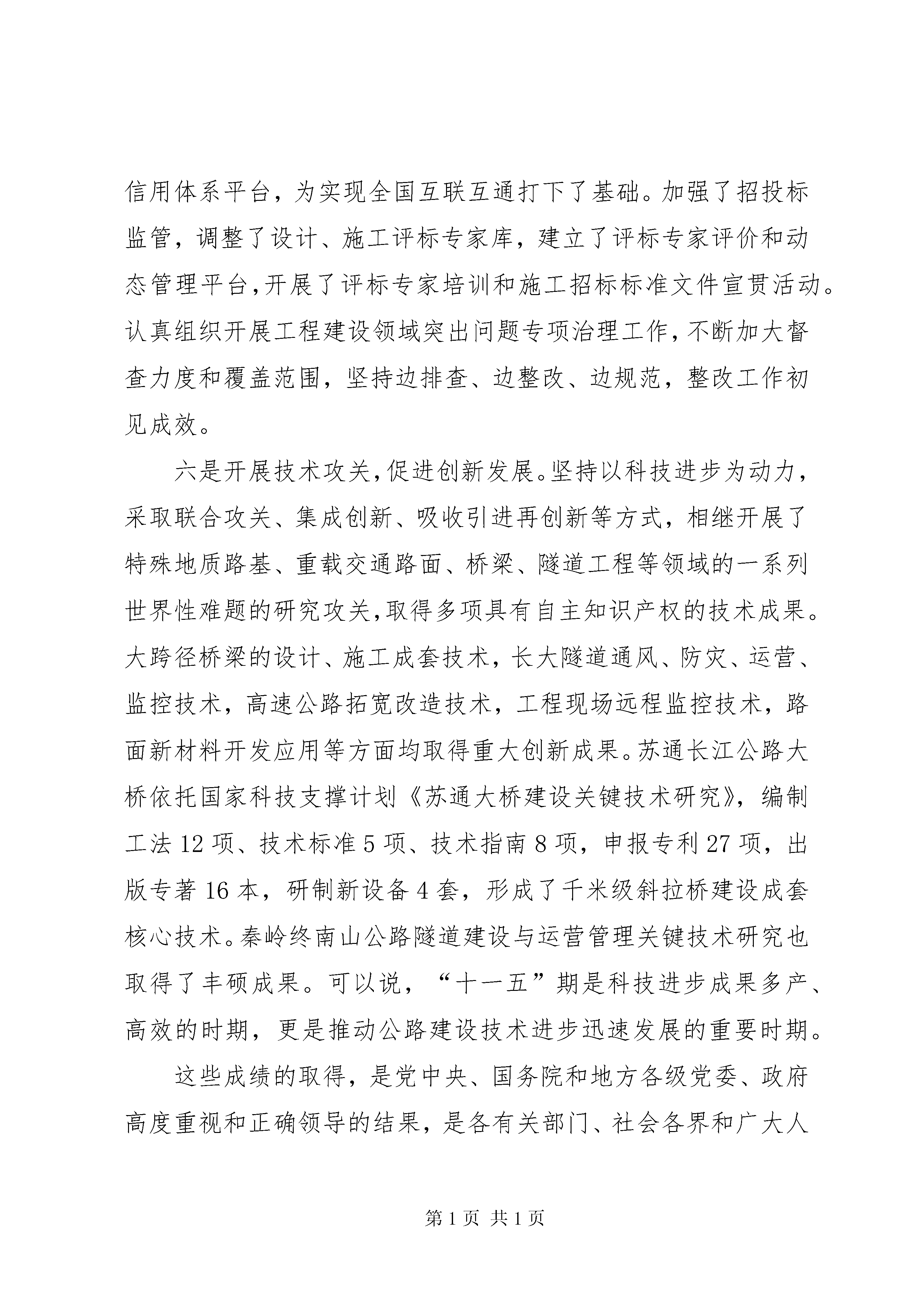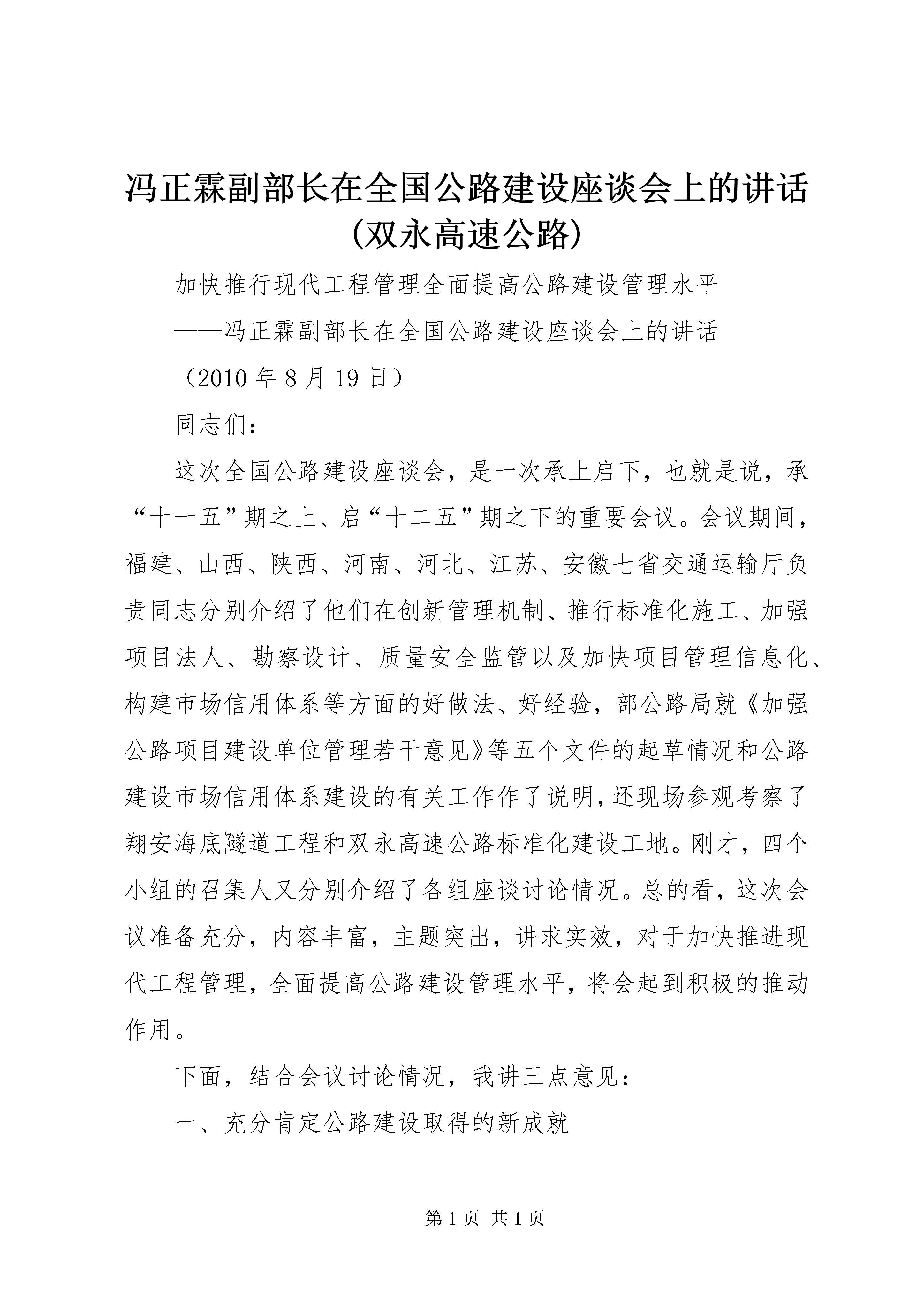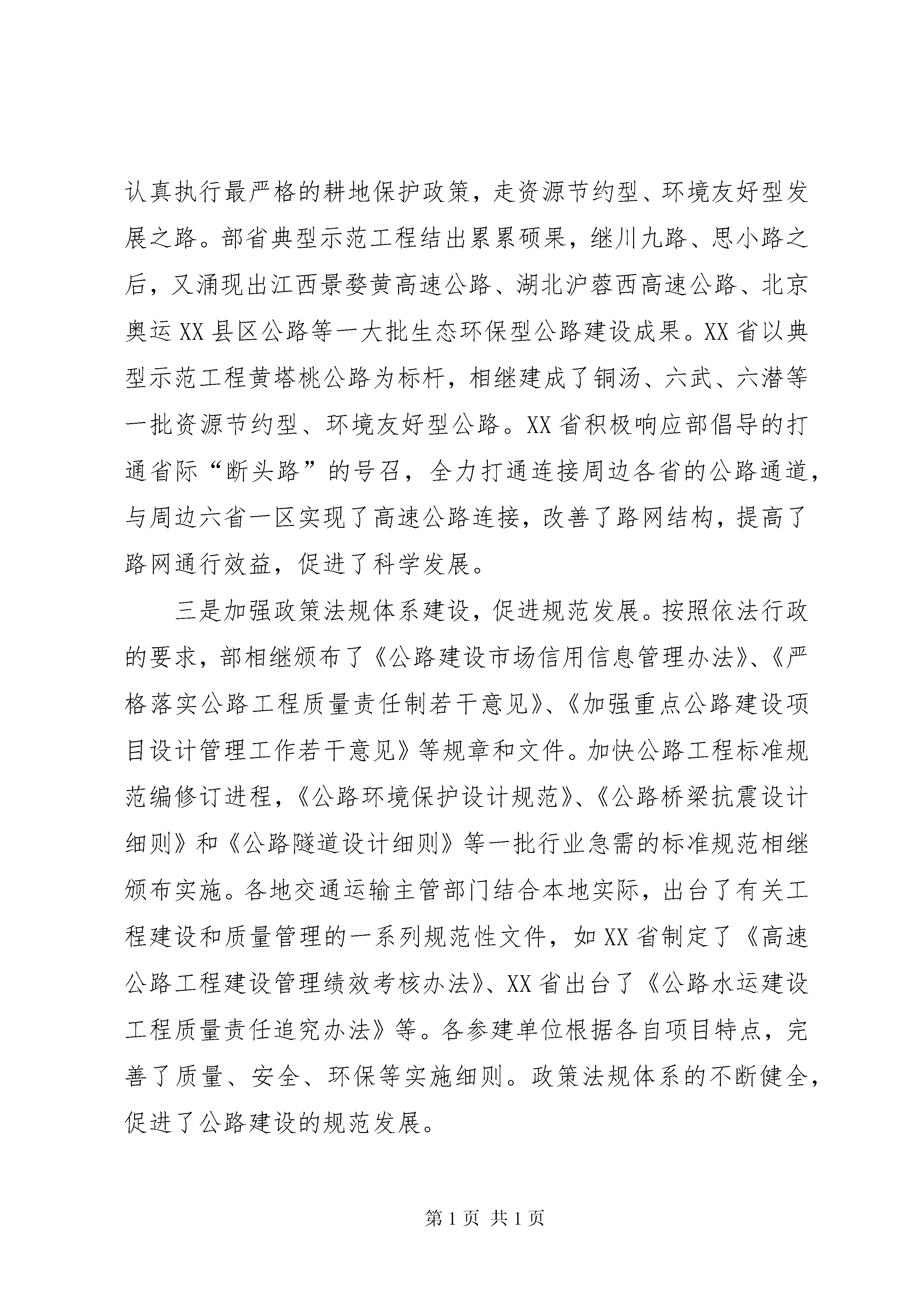 冯正霖副部长在全国公路建设座谈会上的讲话(双永高速公路)加快推行现代工程管理全面提高公路建设管理水平——冯正霖副部长在全国公路建设座谈会上的讲话(2010年8月19日)同志们:这次全国公路建设座谈会,是一次承上启下,也就是说,承“十一五”期之上、启“十二五”期之下的重要会议。会议期间,福建、山西、陕西、河南、河北、江苏、安徽七省交通运输厅负责同志分别介绍了他们在创新管理机制、推行标准化施工、加强项目法人、勘察设计、质量安全监管以及加快项目管理信息化、构建市场信用体系等方面的好做法、好经验,部公路局就《加强公路项目建设单位管理若干意见》等五个文件的起草情况和公路建设市场信用体系建设的有关工作作了说明,还现场参观考察了翔安海底隧道工程和双永高速公路标准化建设工地。刚才,四个小组的召集人又分别介绍了各组座谈讨论情况。总的看,这次会议准备充分,内容丰富,主题突出,讲求实效,对于加快推进现代工程管理,全面提高公路建设管理水平,将会起到积极的推动作用。下面,结合会议讨论情况,我讲三点意见:一、充分肯定公路建设取得的新成就“十一五”时期,是我国公路网建设快速推进的时期,是全国交通运输系统认真落实科学发展观、保持公路基础设施持续快速健康发展的时期,公路交通基础设施建设取得了显著成绩。主要表现在:一是抢抓发展机遇,促进快速发展。按照部党组做好“三个服务”的要求,全国交通运输系统紧紧抓住中央关于西部大开发、中部崛起、振兴东北老工业基地、东部产业结构调整和扩内需、促增长等重大战略机遇,迎难而上,锐意进取,公路建设保持了快速发展的良好势头。“十一五”前四年,全社会公路建设累计完成投资2.93万亿元,年均增长16%,超过“九五”和“十五”的投资总和。截至去年底,全国公路总里程达到386万公里,其中高速公路通车里程达到6.5万公里,农村公路通车里程达到336.9万公里,路网密度达到40.22公里/百平方公里。“五纵七横”国道主干线提前建成,“西部八条省际通道”基本贯通。以XX省苏通长江公路大桥、XX省杭州湾跨海大桥与舟山连岛工程、XX省秦岭终南山隧道和XX省厦门翔安海底隧道为代表的一批世界级桥梁、隧道工程相继建成通车。公路建设的跨越式发展,使得上世纪九十年代国家确定的“到2010年交通运输紧张状况明显缓解,对国民经济的制约明显改善”的战略性目标得以实现。二是贯彻科学发展观,促进科学发展。“十一五”期间,积极推广以“六个坚持六个树立”为核心内容的公路建设新理念,认真执行最严格的耕地保护政策,走资源节约型、环境友好型发展之路。部省典型示范工程结出累累硕果,继川九路、思小路之后,又涌现出江西景婺黄高速公路、湖北沪蓉西高速公路、北京奥运XX县区公路等一大批生态环保型公路建设成果。XX省以典型示范工程黄塔桃公路为标杆,相继建成了铜汤、六武、六潜等一批资源节约型、环境友好型公路。XX省积极响应部倡导的打通省际“断头路”的号召,全力打通连接周边各省的公路通道,与周边六省一区实现了高速公路连接,改善了路网结构,提高了路网通行效益,促进了科学发展。三是加强政策法规体系建设,促进规范发展。按照依法行政的要求,部相继颁布了《公路建设市场信用信息管理办法》、《严格落实公路工程质量责任制若干意见》、《加强重点公路建设项目设计管理工作若干意见》等规章和文件。加快公路工程标准规范编修订进程,《公路环境保护设计规范》、《公路桥梁抗震设计细则》和《公路隧道设计细则》等一批行业急需的标准规范相继颁布实施。各地交通运输主管部门结合本地实际,出台了有关工程建设和质量管理的一系列规范性文件,如XX省制定了《高速公路工程建设管理绩效考核办法》、XX省出台了《公路水运建设工程质量责任追究办法》等。各参建单位根据各自项目特点,完善了质量、安全、环保等实施细则。政策法规体系的不断健全,促进了公路建设的规范发展。四是强化质量安全控制,促进安全发展。把质量和安全作为贯彻落实科学发展观的核心理念,狠抓“三个合理”和“三个关键人”管理,着力构建“无缝隙”监督网络。部先后发布了《关于在初步设计阶段实行公路桥梁和隧道工程安全风险评估制度的通知》及《公路桥梁和隧道工程设计安全风险评估指南》,组织开展了“平安工地”创建活动,重点开展了“混凝土质量通病治理”、“试验检测专项治理”和“监理企业树品牌、监理人员讲责任”的监理行业新风建设。各地认真加强质量安全管理,不断拓展管理思路。浙江、广东、河北等省开展了“质量年、安全年、管理年”活动;XX省开展了技术稽查、设计回头看等系列活动;XX省马鞍山长江公路大桥建立了工程单元预警、危险源辨识与防控工作制度。杭州湾跨海大桥和厦门翔安海底隧道工程安全管理工作受到了部和国家安监总局的联合表彰。从质量监督抽检数据和督查结果看,全国高速公路和干线公路抽检指标总体合格