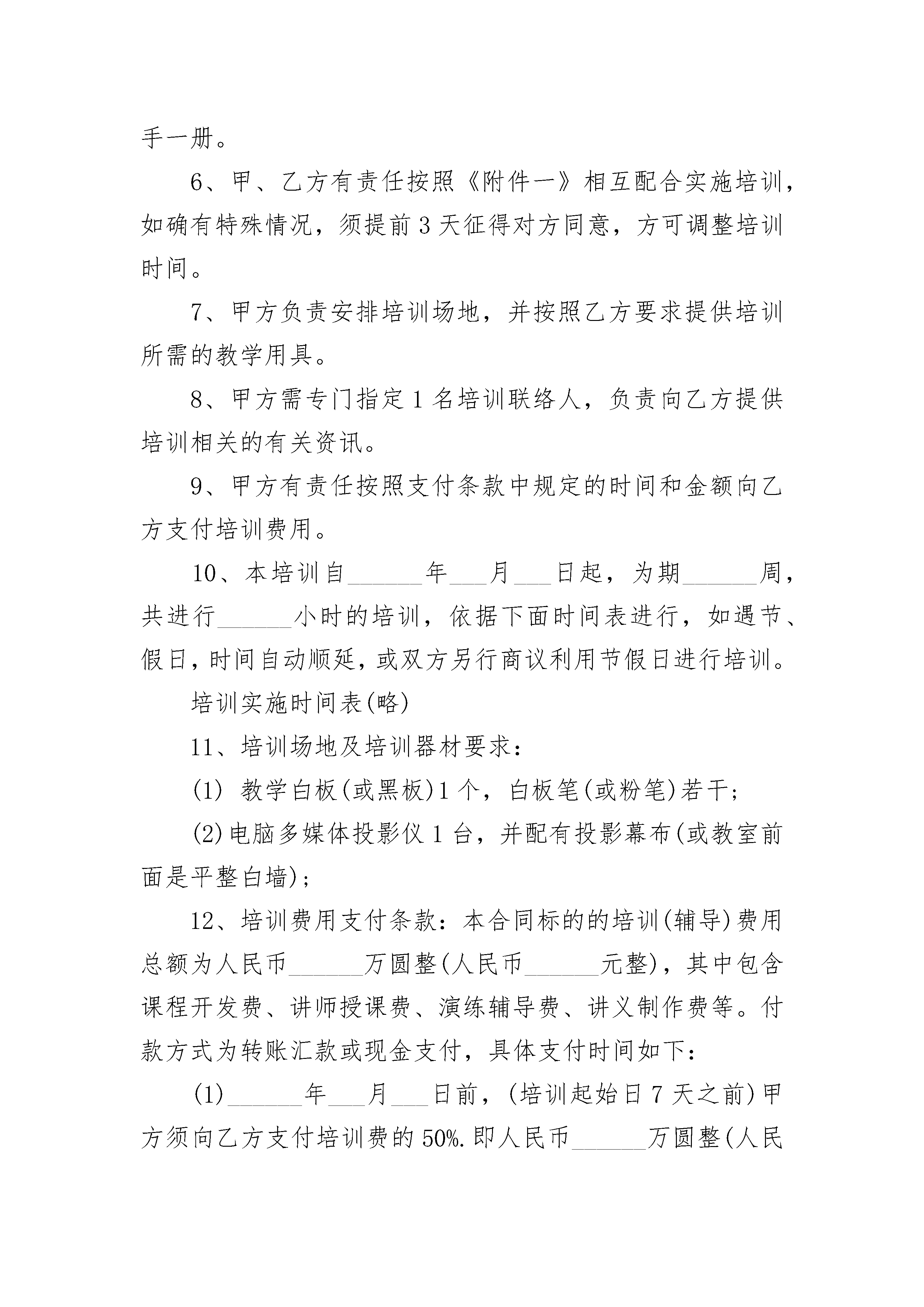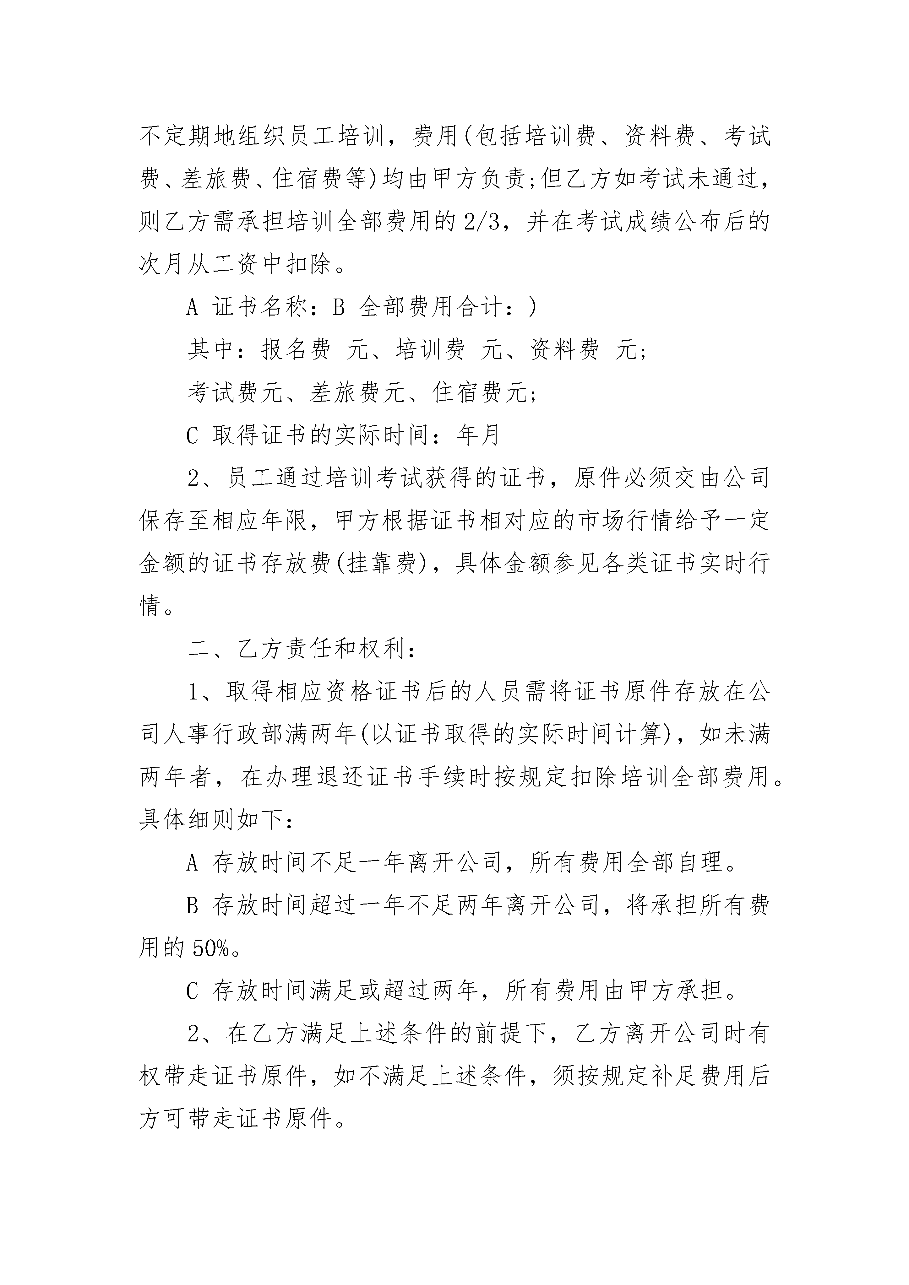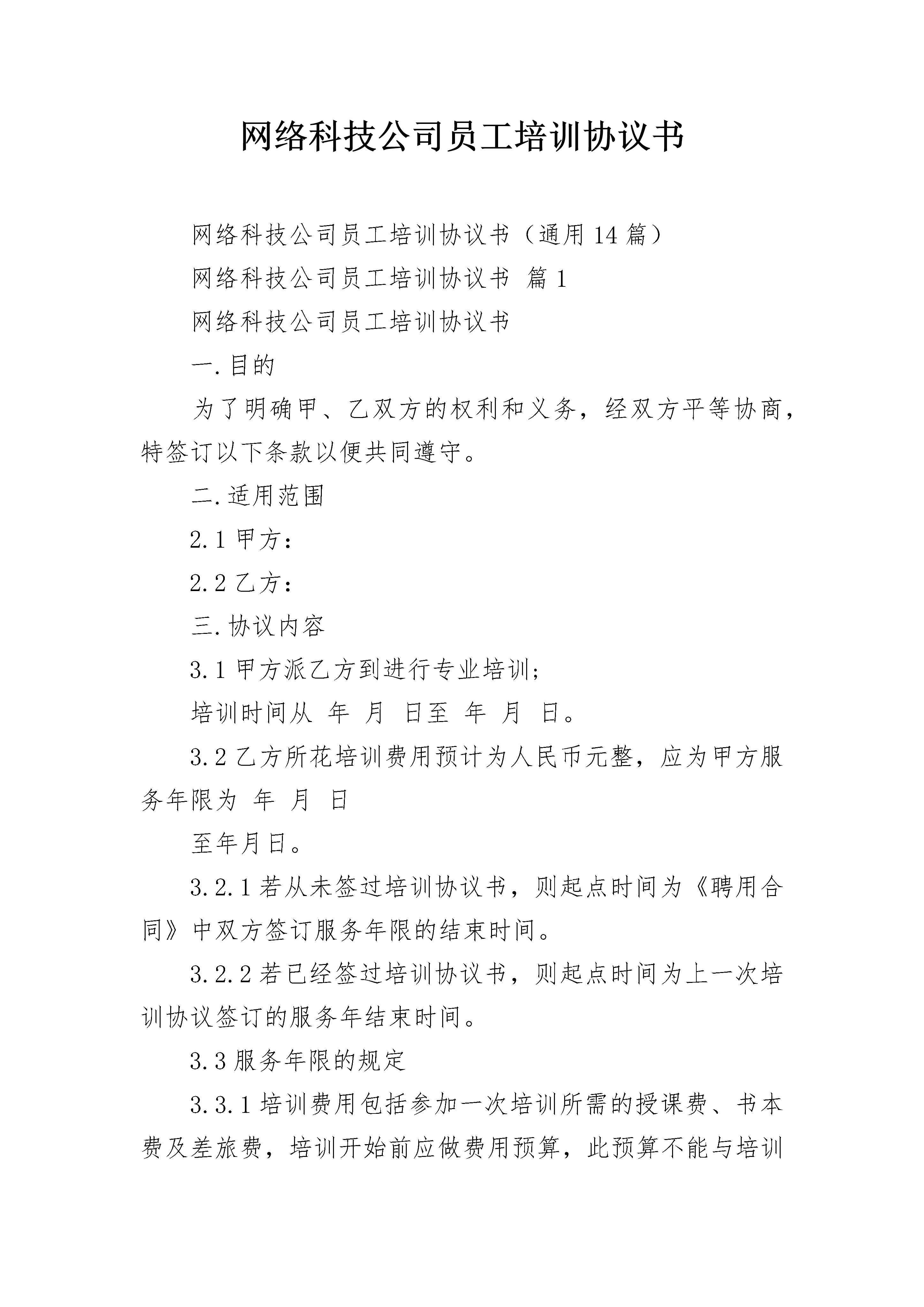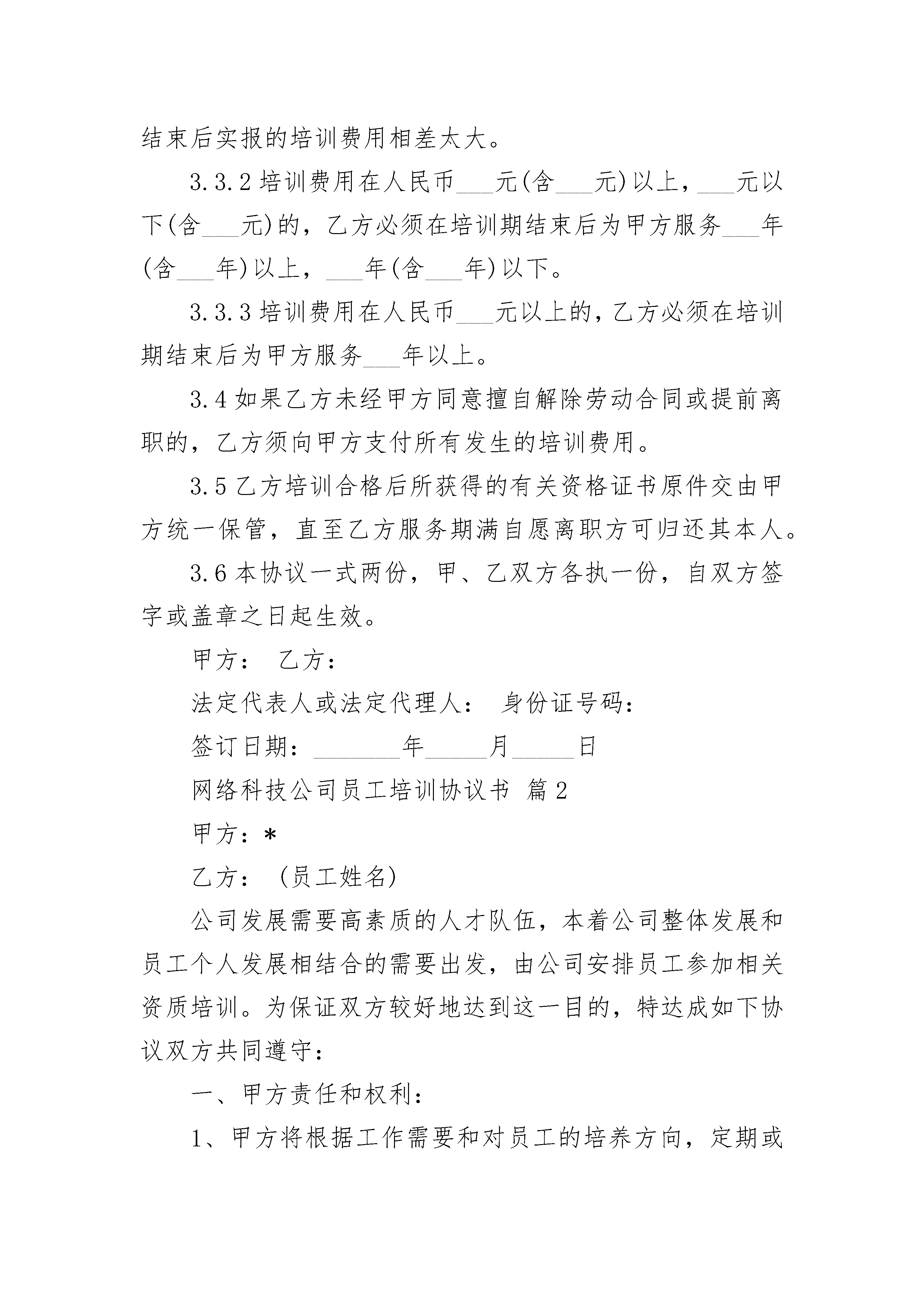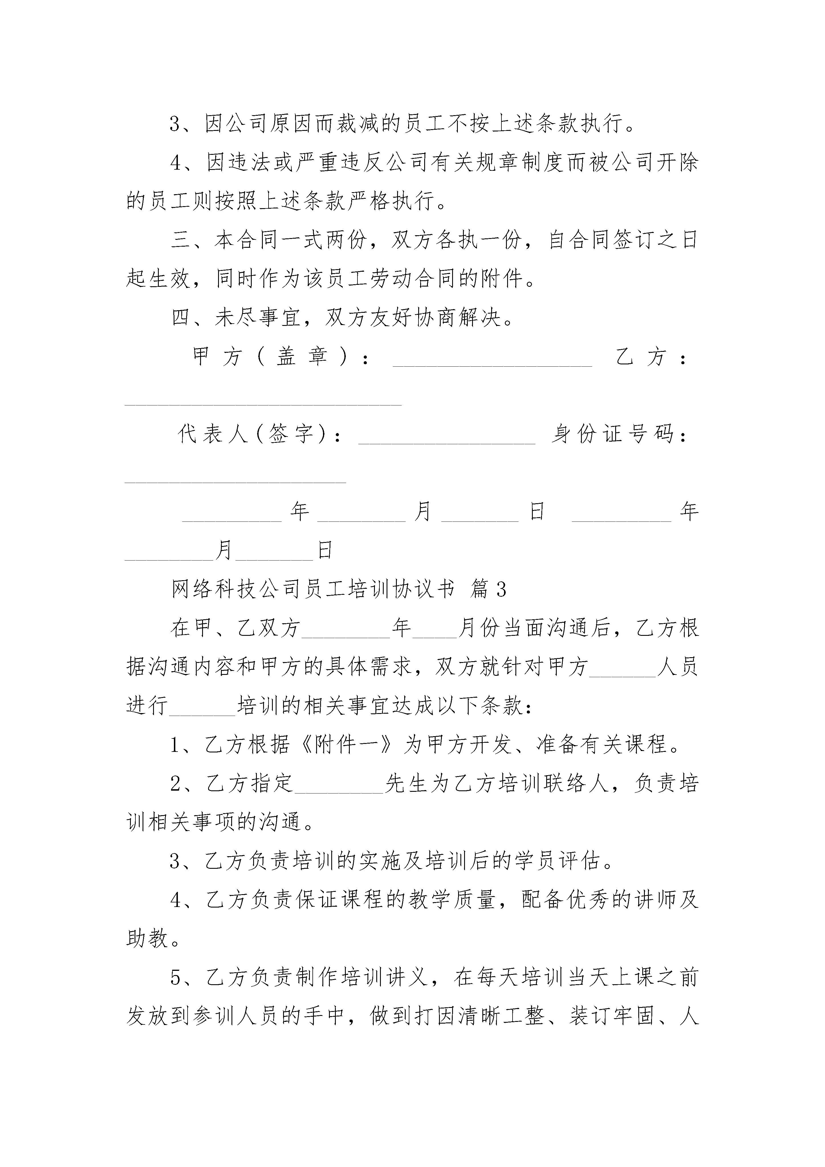 网络科技公司员工培训协议书网络科技公司员工培训协议书(通用14篇)网络科技公司员工培训协议书篇1网络科技公司员工培训协议书一.目的为了明确甲、乙双方的权利和义务,经双方平等协商,特签订以下条款以便共同遵守。二.适用范围2.1甲方:2.2乙方:三.协议内容3.1甲方派乙方到进行专业培训;培训时间从年月日至年月日。3.2乙方所花培训费用预计为人民币元整,应为甲方服务年限为年月日至年月日。3.2.1若从未签过培训协议书,则起点时间为《聘用合同》中双方签订服务年限的结束时间。3.2.2若已经签过培训协议书,则起点时间为上一次培训协议签订的服务年结束时间。3.3服务年限的规定3.3.1培训费用包括参加一次培训所需的授课费、书本费及差旅费,培训开始前应做费用预算,此预算不能与培训结束后实报的培训费用相差太大。3.3.2培训费用在人民币___元(含___元)以上,___元以下(含___元)的,乙方必须在培训期结束后为甲方服务___年(含___年)以上,___年(含___年)以下。3.3.3培训费用在人民币___元以上的,乙方必须在培训期结束后为甲方服务___年以上。3.4如果乙方未经甲方同意擅自解除劳动合同或提前离职的,乙方须向甲方支付所有发生的培训费用。3.5乙方培训合格后所获得的有关资格证书原件交由甲方统一保管,直至乙方服务期满自愿离职方可归还其本人。3.6本协议一式两份,甲、乙双方各执一份,自双方签字或盖章之日起生效。甲方:乙方:法定代表人或法定代理人:身份证号码:签订日期:_______年_____月_____日网络科技公司员工培训协议书篇2甲方:*乙方:(员工姓名)公司发展需要高素质的人才队伍,本着公司整体发展和员工个人发展相结合的需要出发,由公司安排员工参加相关资质培训。为保证双方较好地达到这一目的,特达成如下协议双方共同遵守:一、甲方责任和权利:1、甲方将根据工作需要和对员工的培养方向,定期或不定期地组织员工培训,费用(包括培训费、资料费、考试费、差旅费、住宿费等)均由甲方负责;但乙方如考试未通过,则乙方需承担培训全部费用的2/3,并在考试成绩公布后的次月从工资中扣除。A证书名称:B全部费用合计:)其中:报名费元、培训费元、资料费元;考试费元、差旅费元、住宿费元;C取得证书的实际时间:年月2、员工通过培训考试获得的证书,原件必须交由公司保存至相应年限,甲方根据证书相对应的市场行情给予一定金额的证书存放费(挂靠费),具体金额参见各类证书实时行情。二、乙方责任和权利:1、取得相应资格证书后的人员需将证书原件存放在公司人事行政部满两年(以证书取得的实际时间计算),如未满两年者,在办理退还证书手续时按规定扣除培训全部费用。具体细则如下:A存放时间不足一年离开公司,所有费用全部自理。B存放时间超过一年不足两年离开公司,将承担所有费用的50%。C存放时间满足或超过两年,所有费用由甲方承担。2、在乙方满足上述条件的前提下,乙方离开公司时有权带走证书原件,如不满足上述条件,须按规定补足费用后方可带走证书原件。3、因公司原因而裁减的员工不按上述条款执行。4、因违法或严重违反公司有关规章制度而被公司开除的员工则按照上述条款严格执行。三、本合同一式两份,双方各执一份,自合同签订之日起生效,同时作为该员工劳动合同的附件。四、未尽事宜,双方友好协商解决。甲方(盖章):__________________乙方:_________________________代表人(签字):________________身份证号码:_____________________________年________月_______日_________年________月_______日网络科技公司员工培训协议书篇3在甲、乙双方________年____月份当面沟通后,乙方根据沟通内容和甲方的具体需求,双方就针对甲方______人员进行______培训的相关事宜达成以下条款:1、乙方根据《附件一》为甲方开发、准备有关课程。2、乙方指定________先生为乙方培训联络人,负责培训相关事项的沟通。3、乙方负责培训的实施及培训后的学员评估。4、乙方负责保证课程的教学质量,配备优秀的讲师及助教。5、乙方负责制作培训讲义,在每天培训当天上课之前发放到参训人员的手中,做到打因清晰工整、装订牢固、人手一册。6、甲、乙方有责任按照《附件一》相互配合实施培训,如确有特殊情况,须提前3天征得对方同意,方可调整培训时间。7、甲方负责安排培训场地,并按照乙方要求提供培训所需的教学用具。8、甲方需专门指定1名培训联络人,负责向乙方提供培训相关的有关资讯。9、甲方有责任按照支付条款中规定的时间和金额向乙方支付培训费用。10、本培训自______年___月___日起,为期______周,共进行____