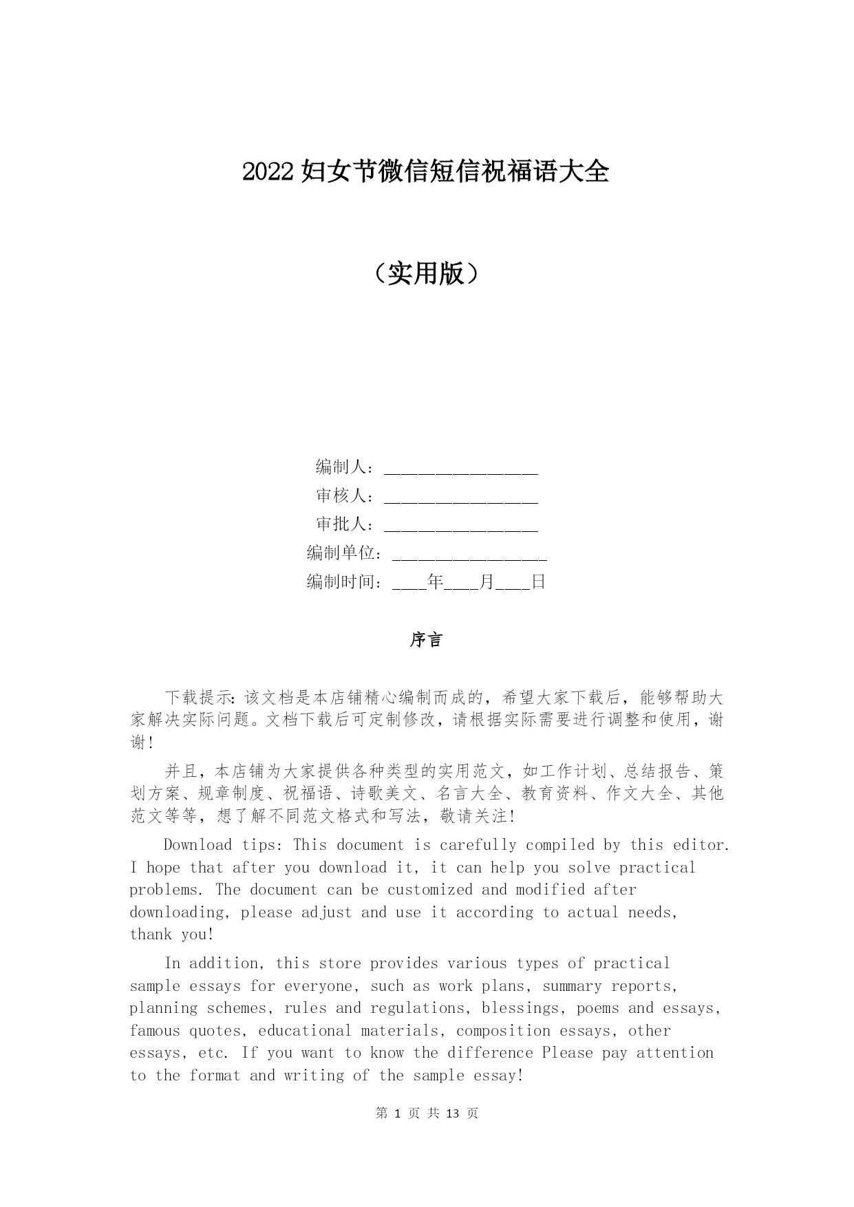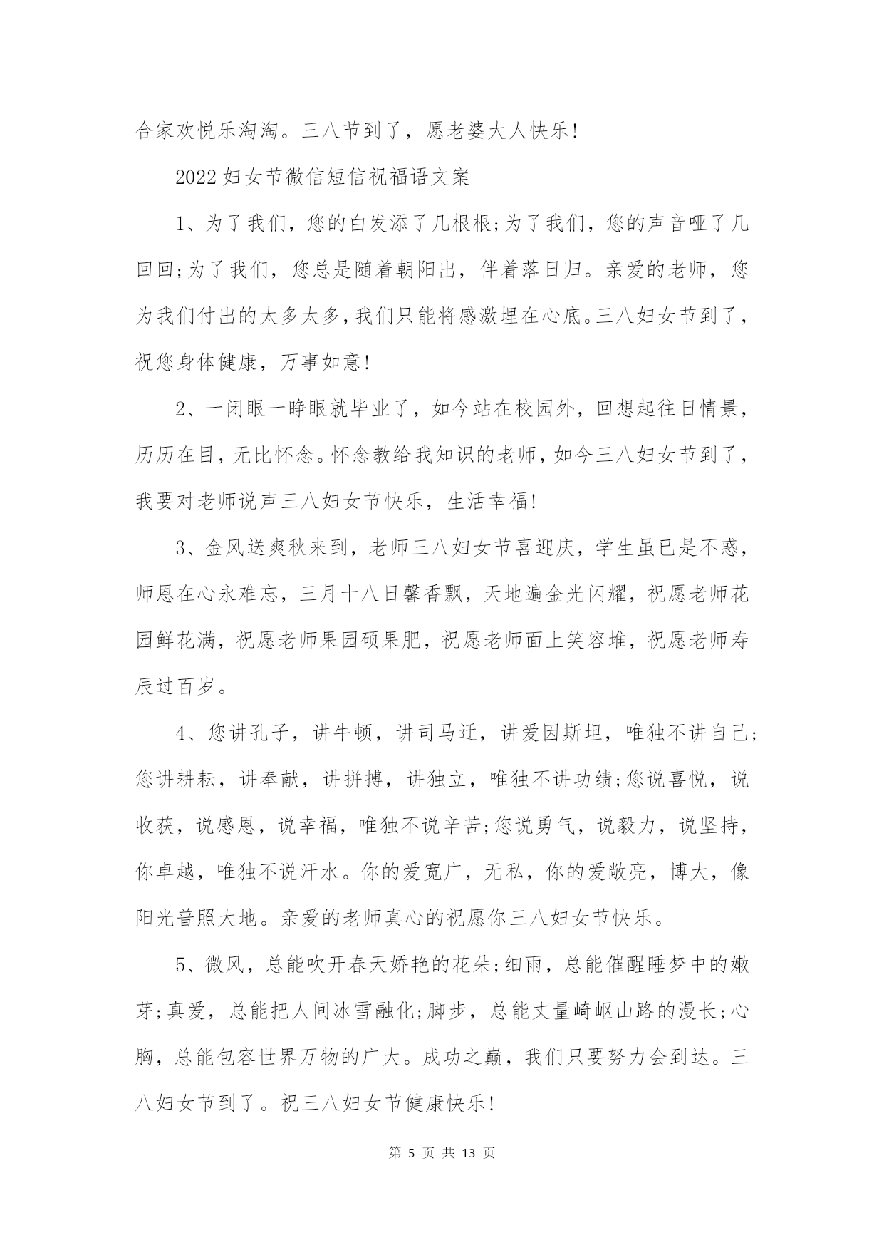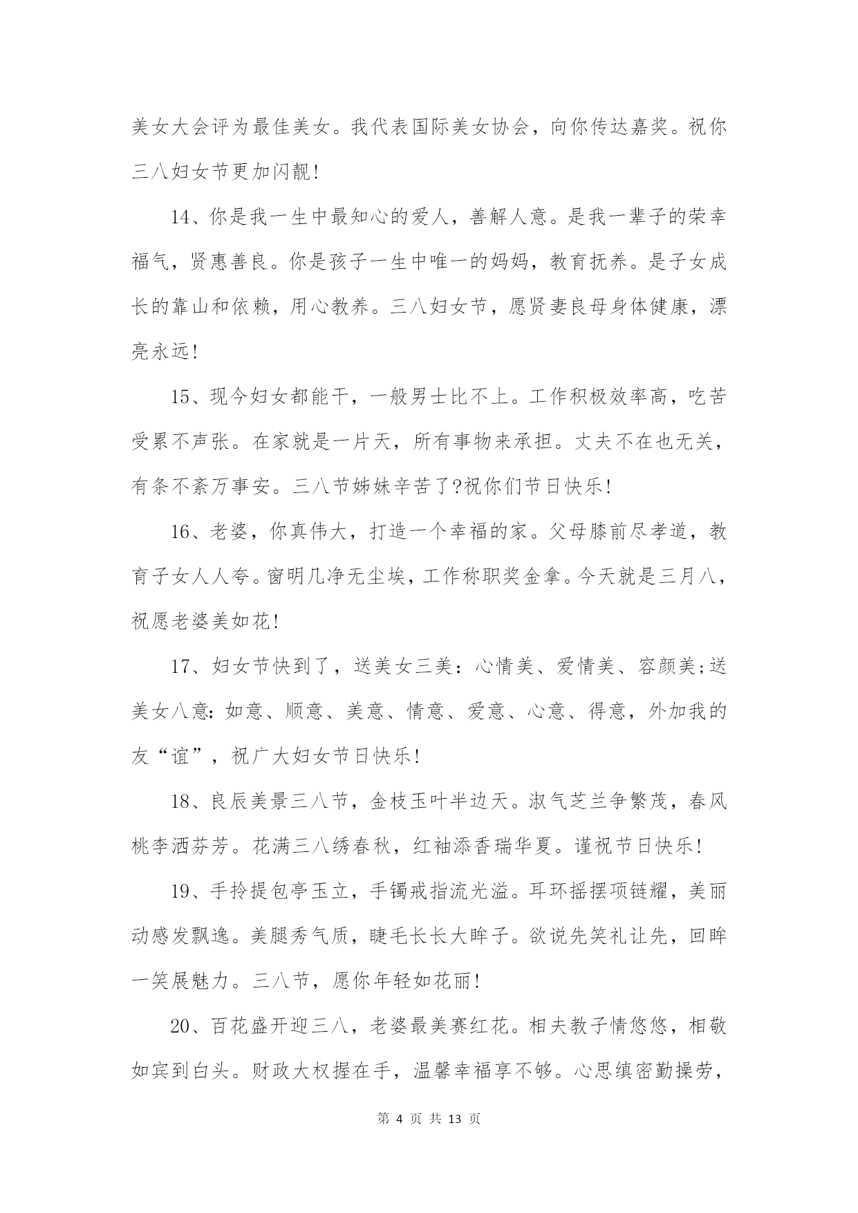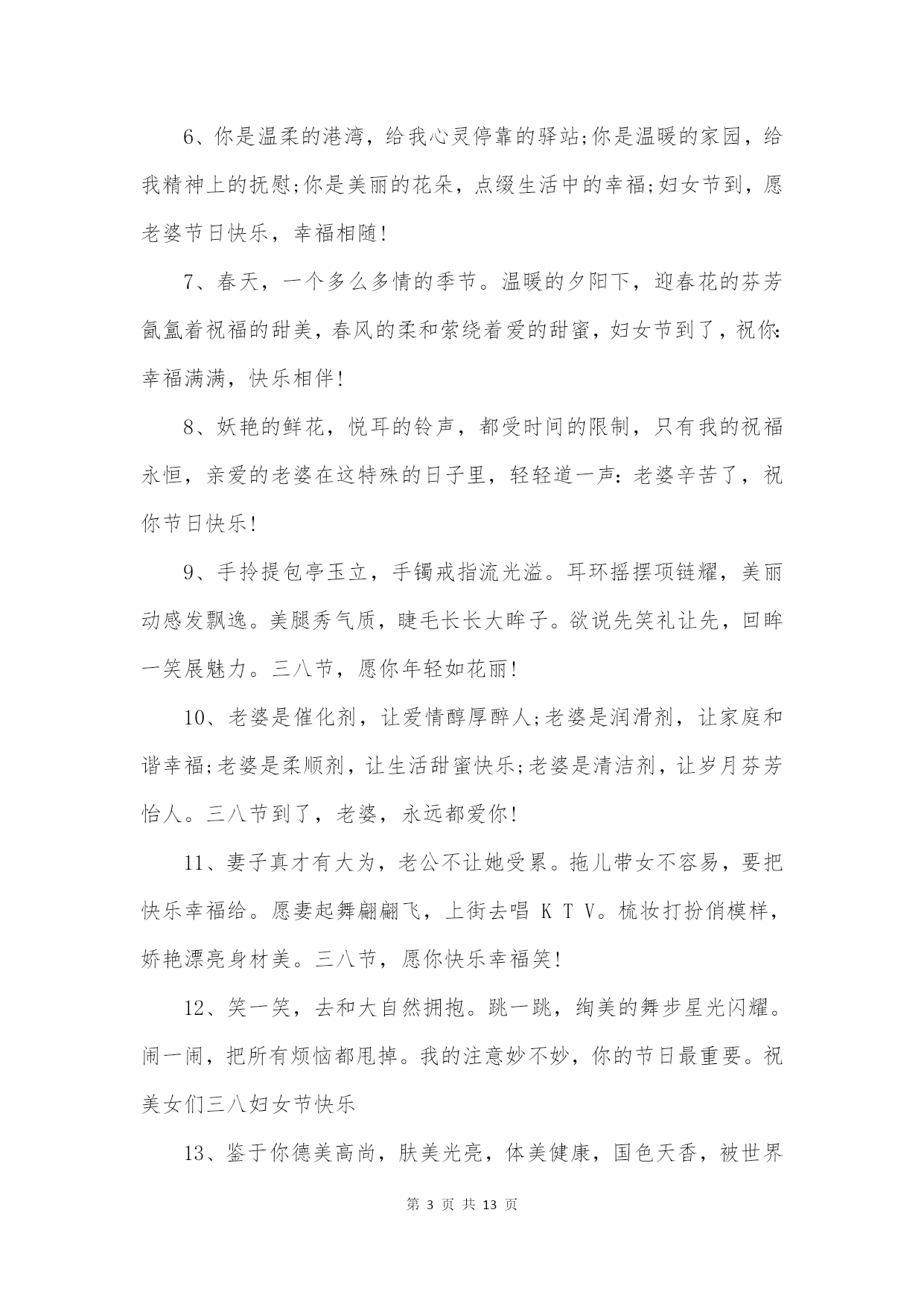 第PAGE\*MERGEFORMAT13页共NUMPAGES\*MERGEFORMAT13页2022妇女节微信短信祝福语大全(实用版)编制人:__________________审核人:__________________审批人:__________________编制单位:__________________编制时间:____年____月____日序言下载提示:该文档是本店铺精心编制而成的,希望大家下载后,能够帮助大家解决实际问题。文档下载后可定制修改,请根据实际需要进行调整和使用,谢谢!并且,本店铺为大家提供各种类型的实用范文,如工作计划、总结报告、策划方案、规章制度、祝福语、诗歌美文、名言大全、教育资料、作文大全、其他范文等等,想了解不同范文格式和写法,敬请关注!Downloadtips:Thisdocumentiscarefullycompiledbythiseditor.Ihopethatafteryoudownloadit,itcanhelpyousolvepracticalproblems.Thedocumentcanbecustomizedandmodifiedafterdownloading,pleaseadjustanduseitaccordingtoactualneeds,thankyou!Inaddition,thisstoreprovidesvarioustypesofpracticalsampleessaysforeveryone,suchasworkplans,summaryreports,planningschemes,rulesandregulations,blessings,poemsandessays,famousquotes,educationalmaterials,compositionessays,otheressays,etc.IfyouwanttoknowthedifferencePleasepayattentiontotheformatandwritingofthesampleessay!2022妇女节微信短信祝福语大全在日常生活或是工作学习中,大家总免不了要接触或使用祝福语吧,祝福语可以给人们带去温暖和好心情。那么妇女节的祝福语,大家都有想好了吗?下面是本店铺给大家整理的2022妇女节微信短信祝福语大全,仅供参考希望能够帮助到大家。2022妇女节微信短信祝福语大全1、温柔贤惠善言慈心,老人孩子家务全包。洗衣做饭样样能干,打扮上妆美丽漂亮。不细分辨难以相信,穿锦戴银魅力无穷。愿你三八节日欢,细腰柳眉喜乐天!2、今天妇女节,我们的节日,别让快乐原地踏步走,让好心情跟着春天的脚步,抛却久积的烦恼,唤醒沉睡的心灵,给我们自己好好放个假吧!3、三八妇女节,告诉你个小秘密:八卦能抗压,增强心理承受力;唱歌炼肌肉,抵得强运动;偷懒减压力,中午小憩助长寿。愿你用实践来检验,用幸福来表现!4、美好的生活要靠你敏睿的智慧来美化,幸福的家庭要靠你辛劳的双手来创造,圆满的爱情要靠你诚挚的真心来呵护。三八妇女节,愿你是天下数一的好老婆!5、尊敬的女性同胞,快乐已被你折服,幸福在向你招手,富贵等着你碰头,吉祥全归你所有,三八妇女节,托短信送去祝福,祝你节气快乐,万事大吉。6、你是温柔的港湾,给我心灵停靠的驿站;你是温暖的家园,给我精神上的抚慰;你是美丽的花朵,点缀生活中的幸福;妇女节到,愿老婆节日快乐,幸福相随!7、春天,一个多么多情的季节。温暖的夕阳下,迎春花的芬芳氤氲着祝福的甜美,春风的柔和萦绕着爱的甜蜜,妇女节到了,祝你:幸福满满,快乐相伴!8、妖艳的鲜花,悦耳的铃声,都受时间的限制,只有我的祝福永恒,亲爱的老婆在这特殊的日子里,轻轻道一声:老婆辛苦了,祝你节日快乐!9、手拎提包亭玉立,手镯戒指流光溢。耳环摇摆项链耀,美丽动感发飘逸。美腿秀气质,睫毛长长大眸子。欲说先笑礼让先,回眸一笑展魅力。三八节,愿你年轻如花丽!10、老婆是催化剂,让爱情醇厚醉人;老婆是润滑剂,让家庭和谐幸福;老婆是柔顺剂,让生活甜蜜快乐;老婆是清洁剂,让岁月芬芳怡人。三八节到了,老婆,永远都爱你!11、妻子真才有大为,老公不让她受累。拖儿带女不容易,要把快乐幸福给。愿妻起舞翩翩飞,上街去唱KTV。梳妆打扮俏模样,娇艳漂亮身材美。三八节,愿你快乐幸福笑!12、笑一笑,去和大自然拥抱。跳一跳,绚美的舞步星光闪耀。闹一闹,把所有烦恼都甩掉。我的注意妙不妙,你的节日最重要。祝美女们三八妇女节快乐13、鉴于你德美高尚,肤美光亮,体美健康,国色天香,被世界美女大会评为最佳美女。我代表国际美女协会,向你传达嘉奖。祝你三八妇女节更加闪靓!14、你是我一生中最知心的爱人,善解人意。是我一辈子的荣幸福气,贤惠善良。你是孩子一生中唯一