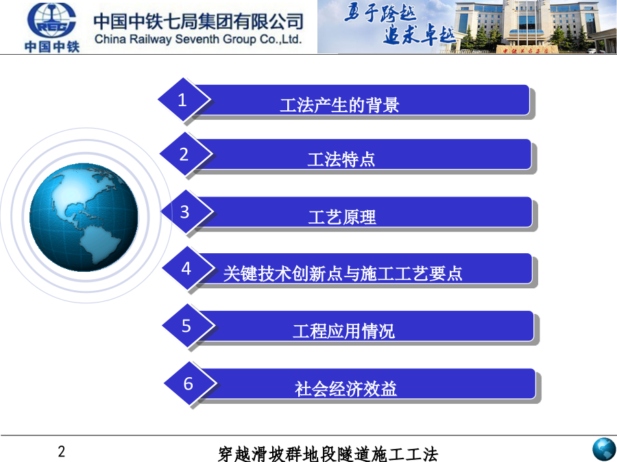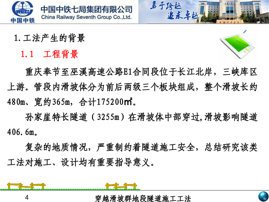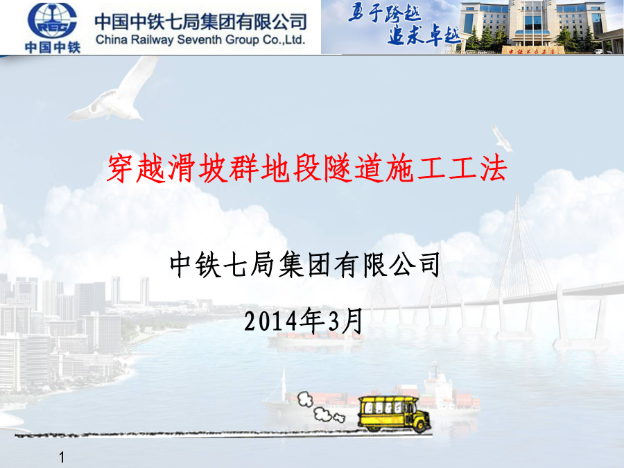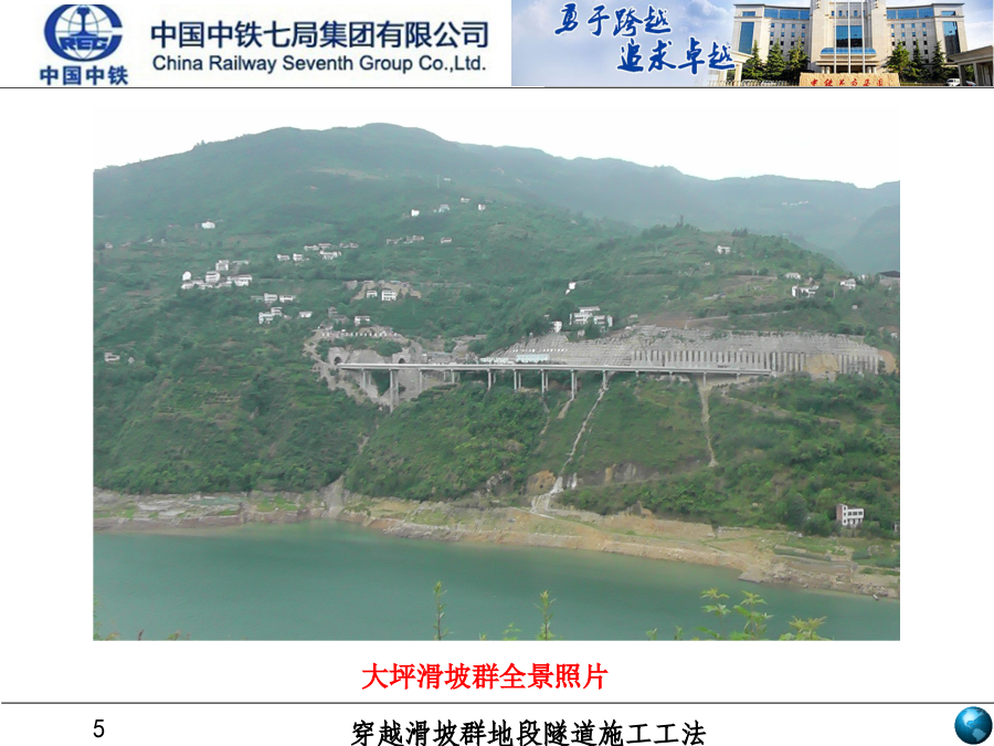 中铁七局集团有限公司2014年3月1.工法产生的背景1.1工程背景1.工法产生的背景1.2技术背景大坪滑坡群剖面图1.工法产生的背景1.3技术水平2.工法特点2.1质量、安全方面2.工法特点2.2工期、进度方面通过隧道洞外顶部地表注浆和抗滑桩施工,隧道洞内应用碗扣式锁脚导管、系统锚杆(管)加长、钢拱架、仰拱群桩加固,通过洞内外联合加固的方式,改变隧道受力结构体系,提高隧道的抗剪和抗滑能力,达到控制隧道变形和抑制滑坡蠕动的目的。4.关键技术创新点与施工工艺操作要点4.关键技术创新点与施工工艺操作要点4.关键技术创新点与施工工艺操作要点4.关键技术创新点与施工工艺操作要点施工要点(1)①钢拱架与格栅间隔布置。型钢钢架架设后能立即受力,控制围岩变形,增加结构的刚度,在前期效果明显,不易出现钢架扭曲等现象,但是型钢拱架易与喷砼剥离,相互粘结性差。为避免此种弊端,在钢拱架之间间隔布置格栅拱架。格栅拱架与混凝土结合好,钢筋全部被混凝土包裹,在后期受力效果较好。施工要点②下斜式锚管代替传统锁脚锚杆本工法将锁脚锚杆的施作角度由0°改变为15°~30°,使锁脚锚管产生上托作用,提高其承载能力,不仅起到锁定拱架的作用,更能形成一个新的承载平台,增强抗拉、抗弯及抗剪能力。施工要点④加强型工字钢连接改变传统的钢架连接采用的钢筋焊接的方式,在钢拱架连接钢筋之间增焊一道宽100mm、厚5mm钢带,见右图所示。作为加强连接措施,可以有效的提高初期支护的整体刚度和强度。施工要点①仰拱施工前预加固先增加中部横向支撑与下断面初期支护之间的斜向支撑,完成后拆除下断面侧壁临时支撑,为仰拱施工创造条件,每次拆除长度不得大于5m。②增加群桩抗滑基础仰拱强度达到设计的85%后,在仰拱上方实做钢管桩群,提高隧道的承载力和抗剪力因为隧道排水沟设置在隧道中部,将仰拱填充分为两部分,本工法通过分部施工,及时贯通全副路面,起到了较好效果。施工步骤:实施仰拱部分①→实施仰拱填充部分②→实施中心水沟部分③→实施路面底基层④填充连接为整体。滑坡群隧道应力监测主要包括地表监测、滑坡内部深孔测斜监控、隧道收敛、沉降、压力、钢筋应力、混凝土应力、锚杆轴力等。观测频率见《工法》255工程应用情况6社会经济效益6.3社会(间接)效益孙家崖隧道成功成功穿越滑坡体施工,不仅为我国滑坡群地段隧道建设提供了借鉴依据,同时为三峡库区沿线结构物设计提供了可靠参数。该隧道建设得到了重庆市交通建设委员会等相关单位的关注,重庆多家电视台、报纸对工程进展情况进行了报道,诸多施工单位和设计勘察单位进行了考察,地方政府也给了很高评价。2012年10月23日经专家委员会对《三峡库区滑坡群地段隧道施工变形控制技术研究》项目进行了成果鉴定,该技术达到国际先进水平,同时取得三项专利技术。中铁七局集团欢迎您
