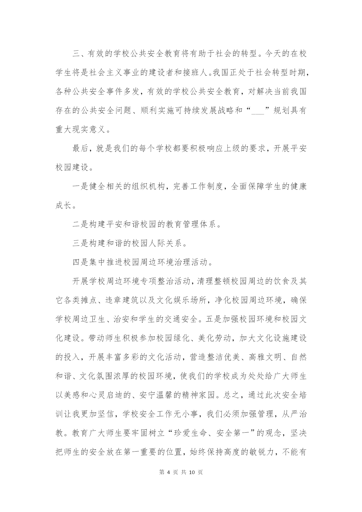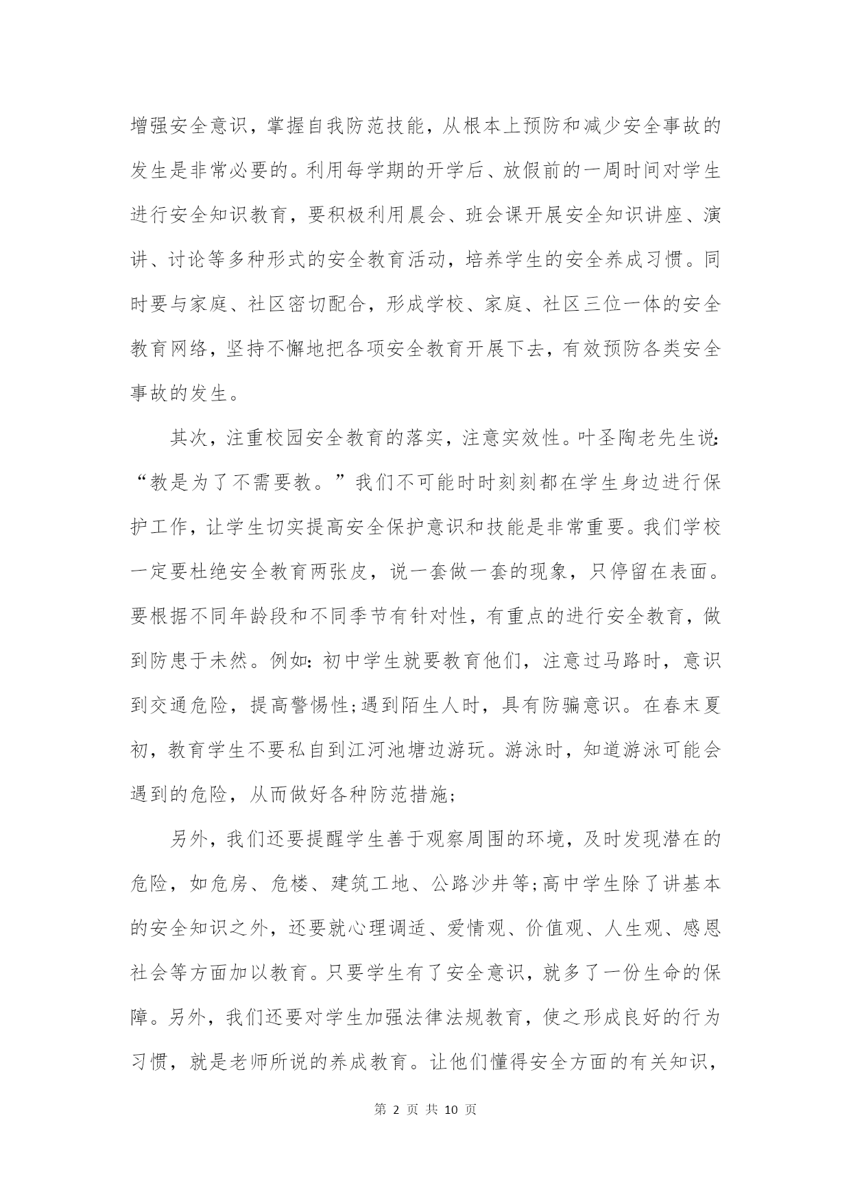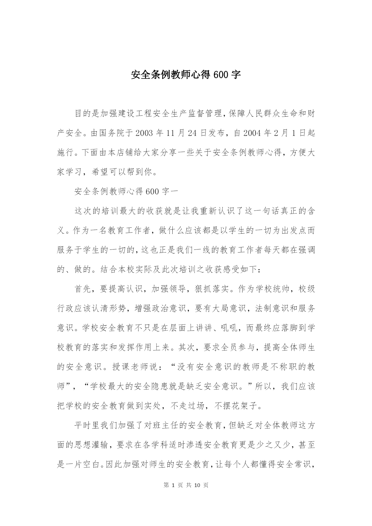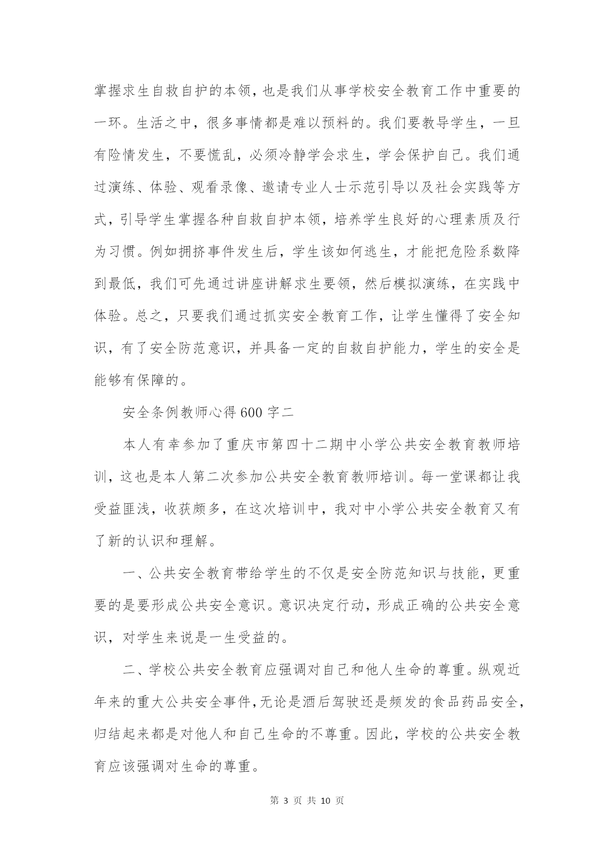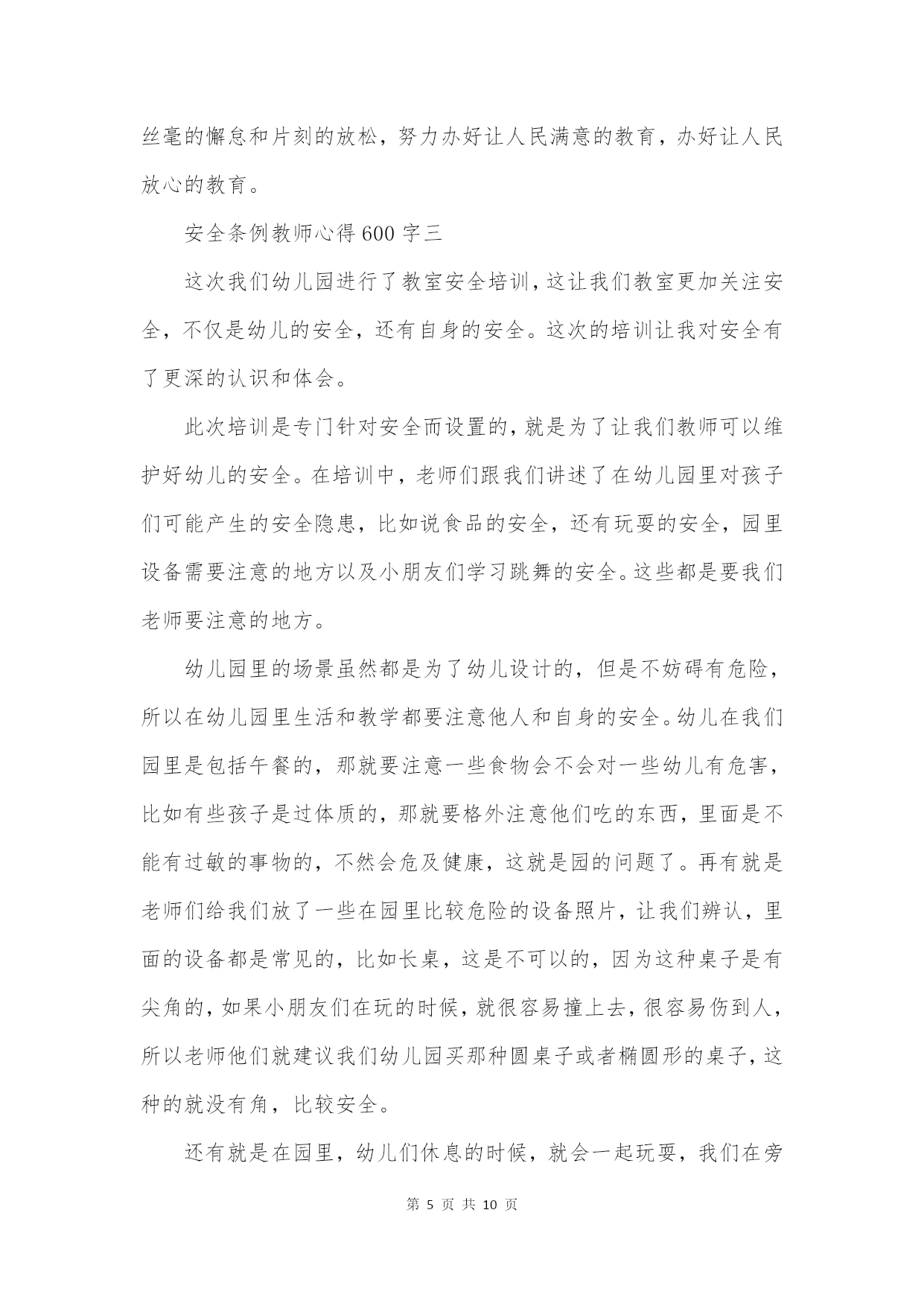 第PAGE\*MERGEFORMAT10页共NUMPAGES\*MERGEFORMAT10页安全条例教师心得600字目的是加强建设工程安全生产监督管理,保障人民群众生命和财产安全。由国务院于2003年11月24日发布,自2004年2月1日起施行。下面由本店铺给大家分享一些关于安全条例教师心得,方便大家学习,希望可以帮到你。安全条例教师心得600字一这次的培训最大的收获就是让我重新认识了这一句话真正的含义。作为一名教育工作者,做什么应该都是以学生的一切为出发点而服务于学生的一切的,这也正是我们一线的教育工作者每天都在强调的、做的。结合本校实际及此次培训之收获感受如下:首先,要提高认识,加强领导,狠抓落实。作为学校统帅,校级行政应该认清形势,增强政治意识,要有大局意识,法制意识和服务意识。学校安全教育不只是在层面上讲讲、吼吼,而最终应落脚到学校教育的落实和发挥作用上来。其次,要求全员参与,提高全体师生的安全意识。授课老师说:“没有安全意识的教师是不称职的教师”,“学校最大的安全隐患就是缺乏安全意识。”所以,我们应该把学校的安全教育做到实处,不走过场,不摆花架子。平时里我们加强了对班主任的安全教育,但缺乏对全体教师这方面的思想灌输,要求在各学科适时渗透安全教育更是少之又少,甚至是一片空白。因此加强对师生的安全教育,让每个人都懂得安全常识,增强安全意识,掌握自我防范技能,从根本上预防和减少安全事故的发生是非常必要的。利用每学期的开学后、放假前的一周时间对学生进行安全知识教育,要积极利用晨会、班会课开展安全知识讲座、演讲、讨论等多种形式的安全教育活动,培养学生的安全养成习惯。同时要与家庭、社区密切配合,形成学校、家庭、社区三位一体的安全教育网络,坚持不懈地把各项安全教育开展下去,有效预防各类安全事故的发生。其次,注重校园安全教育的落实,注意实效性。叶圣陶老先生说:“教是为了不需要教。”我们不可能时时刻刻都在学生身边进行保护工作,让学生切实提高安全保护意识和技能是非常重要。我们学校一定要杜绝安全教育两张皮,说一套做一套的现象,只停留在表面。要根据不同年龄段和不同季节有针对性,有重点的进行安全教育,做到防患于未然。例如:初中学生就要教育他们,注意过马路时,意识到交通危险,提高警惕性;遇到陌生人时,具有防骗意识。在春末夏初,教育学生不要私自到江河池塘边游玩。游泳时,知道游泳可能会遇到的危险,从而做好各种防范措施;另外,我们还要提醒学生善于观察周围的环境,及时发现潜在的危险,如危房、危楼、建筑工地、公路沙井等;高中学生除了讲基本的安全知识之外,还要就心理调适、爱情观、价值观、人生观、感恩社会等方面加以教育。只要学生有了安全意识,就多了一份生命的保障。另外,我们还要对学生加强法律法规教育,使之形成良好的行为习惯,就是老师所说的养成教育。让他们懂得安全方面的有关知识,掌握求生自救自护的本领,也是我们从事学校安全教育工作中重要的一环。生活之中,很多事情都是难以预料的。我们要教导学生,一旦有险情发生,不要慌乱,必须冷静学会求生,学会保护自己。我们通过演练、体验、观看录像、邀请专业人士示范引导以及社会实践等方式,引导学生掌握各种自救自护本领,培养学生良好的心理素质及行为习惯。例如拥挤事件发生后,学生该如何逃生,才能把危险系数降到最低,我们可先通过讲座讲解求生要领,然后模拟演练,在实践中体验。总之,只要我们通过抓实安全教育工作,让学生懂得了安全知识,有了安全防范意识,并具备一定的自救自护能力,学生的安全是能够有保障的。安全条例教师心得600字二本人有幸参加了重庆市第四十二期中小学公共安全教育教师培训,这也是本人第二次参加公共安全教育教师培训。每一堂课都让我受益匪浅,收获颇多,在这次培训中,我对中小学公共安全教育又有了新的认识和理解。一、公共安全教育带给学生的不仅是安全防范知识与技能,更重要的是要形成公共安全意识。意识决定行动,形成正确的公共安全意识,对学生来说是一生受益的。二、学校公共安全教育应强调对自己和他人生命的尊重。纵观近年来的重大公共安全事件,无论是酒后驾驶还是频发的食品药品安全,归结起来都是对他人和自己生命的不尊重。因此,学校的公共安全教育应该强调对生命的尊重。三、有效的学校公共安全教育将有助于社会的转型。今天的在校学生将是社会主义事业的建设者和接班人。我国正处于社会转型时期,各种公共安全事件多发,有效的学校公共安全教育,对解决当前我国存在的公共安全问题、顺利实施可持续发展战略和“___”规划具有重大现实意义。最后,就是我们的每个学校都要积极响应上级的要求,开展平安校园建设。一是健全相关的组织机构,完善工作制度,全面保障学生的健康成长。二是构建平安和谐校园的教育管理体系。三是构建和谐的校园人际关系。四是集中推进校园周边环境治理活动。开