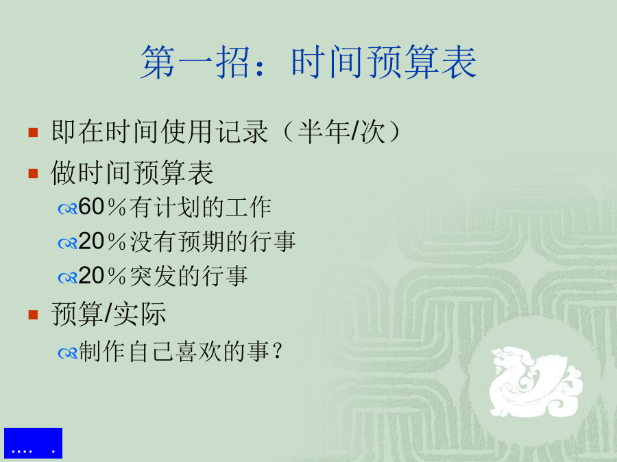 时间管理理论演变第一招:时间预算表第二招:跳出时间的陷阱第三招:区分掌控的时间第四招:每日工作预定表第五招:排定Priority第六招:今日事、今日毕第八招:上班前的小动作第七招:找出最佳生理时间第九招:同时做两、三件事情第十招:决不轻易“迟到”第11招:没定期限就不叫工作第12招:整理工作环境第13招:各种文件只看一次第14招:没有淘汰就不叫档案管理第15招:时间管理的利器第16招:名片式的小卡第17招:会议笔记第18招:咨询专人、专线第19招:花钱买时间第21招:集合零碎时间做大事第22招:勇敢说“不”第23招:休息是为了走更多的路第25招:打着灯笼找对人第26招:学习永不嫌晚第27招:掌握最佳时机第28招:生涯规划第29招:把握人生的方向第30招:潇洒走一回第24招:把兴趣当事业第20招:舍弃完美主义9、静夜四无邻,荒居旧业贫。。7月-247月-24Friday,July5,202410、雨中黄叶树,灯下白头人。。11:24:0411:24:0411:247/5/202411:24:04AM11、以我独沈久,愧君相见频。。7月-2411:24:0411:24Jul-2405-Jul-2412、故人江海别,几度隔山川。。11:24:0411:24:0411:24Friday,July5,202413、乍见翻疑梦,相悲各问年。。7月-247月-2411:24:0411:24:04July5,202414、他乡生白发,旧国见青山。。05七月2024上午11时24分4秒11:24:047月-2415、比不了得就不比,得不到的就不要。。。七月24上午11时24分7月-2411:24July5,202416、行动出成果,工作出财富。。2024年7月5日星期五11时24分4秒11:24:0405July202417、做前,能够环视四周;做时,你只能或者最好沿着以脚为起点的射线向前。。上午11时24分4秒上午11时24分11:24:047月-249、没有失败,只有暂时停止成功!。7月-247月-24Friday,July5,202410、很多事情努力了未必有结果,但是不努力却什么改变也没有。。11:24:0411:24:0411:247/5/202411:24:04AM11、成功就是日复一日那一点点小小努力的积累。。7月-2411:24:0411:24Jul-2405-Jul-2412、世间成事,不求其绝对圆满,留一份不足,可得无限完美。。11:24:0411:24:0411:24Friday,July5,202413、不知香积寺,数里入云峰。。7月-247月-2411:24:0411:24:04July5,202414、意志坚强的人能把世界放在手中像泥块一样任意揉捏。05七月2024上午11时24分4秒11:24:047月-2415、楚塞三湘接,荆门九派通。。。七月24上午11时24分7月-2411:24July5,202416、少年十五二十时,步行夺得胡马骑。。2024年7月5日星期五11时24分4秒11:24:0405July202417、空山新雨后,天气晚来秋。。上午11时24分4秒上午11时24分11:24:047月-249、杨柳散和风,青山澹吾虑。。7月-247月-24Friday,July5,202410、阅读一切好书如同和过去最杰出的人谈话。11:24:0411:24:0411:247/5/202411:24:04AM11、越是没有本领的就越加自命不凡。7月-2411:24:0411:24Jul-2405-Jul-2412、越是无能的人,越喜欢挑剔别人的错儿。11:24:0411:24:0411:24Friday,July5,202413、知人者智,自知者明。胜人者有力,自胜者强。7月-247月-2411:24:0411:24:04July5,202414、意志坚强的人能把世界放在手中像泥块一样任意揉捏。05七月2024上午11时24分4秒11:24:047月-2415、最具挑战性的挑战莫过于提升自我。。七月24上午11时24分7月-2411:24July5,202416、业余生活要有意义,不要越轨。2024年7月5日星期五11时24分4秒11:24:0405July202417、一个人即使已登上顶峰,也仍要自强不息。上午11时24分4秒上午11时24分11:24:047月-24