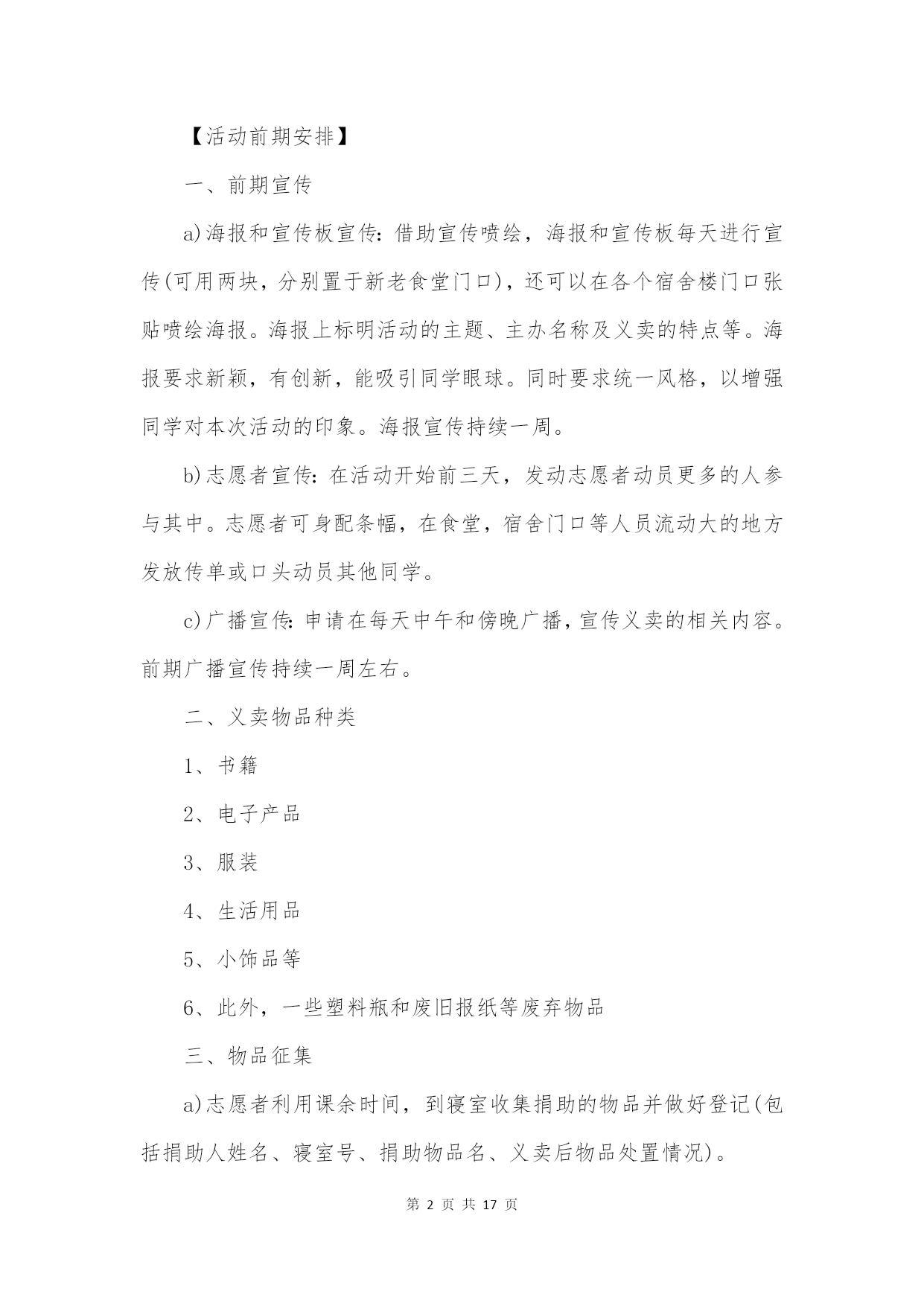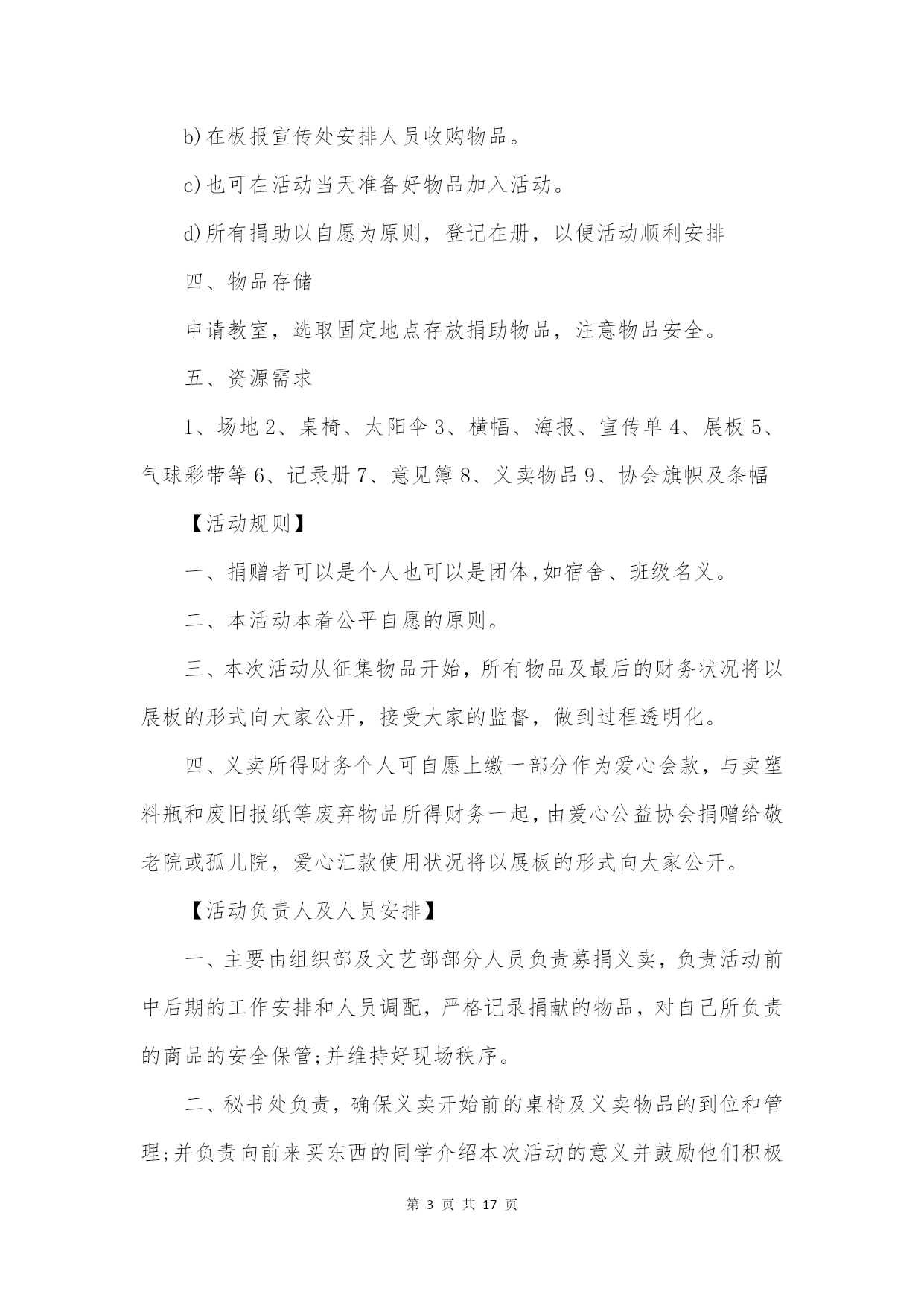 第PAGE\*MERGEFORMAT17页共NUMPAGES\*MERGEFORMAT17页爱心义卖活动的策划书爱心义卖是指以慈善为目的的义卖,策划一场爱心义卖的活动,帮助需要帮助的人。爱心义卖活动的策划书怎么写?今天本店铺在这里给大家分享一些关于爱心义卖活动的策划书,希望能帮到各位。爱心义卖活动的策划书1【活动名称】爱,需要我们共同付出【活动背景】随着社会经济发展和人们生活水平的提高,大学生已经成为消费领域里一支不可忽视的力量,由此引发的过度消费、铺张浪费等问题越来越多。同时,部分同学面临换校区的问题,学生手里拥有很多闲置的东西,毫无用处又弃之不舍,造成严重浪费。【活动目的】一、爱心公益协会举办义卖活动,在提高物品使用率减少浪费的同时,可以把废置的东西通过义卖的形式变换成现金,直接帮助需要帮助的人,同时对我校学生养成勤俭节约的好习惯起到一定的推动作用。二、以此为契机,向在校大学生宣传爱心服务的意义,培养大学生的社会责任感,同时带动校内外公益精神,倡导互助互爱的精神及无私奉献的爱心,以鼓励更多人参与到社会爱心活动当中。【活动前期安排】一、前期宣传a)海报和宣传板宣传:借助宣传喷绘,海报和宣传板每天进行宣传(可用两块,分别置于新老食堂门口),还可以在各个宿舍楼门口张贴喷绘海报。海报上标明活动的主题、主办名称及义卖的特点等。海报要求新颖,有创新,能吸引同学眼球。同时要求统一风格,以增强同学对本次活动的印象。海报宣传持续一周。b)志愿者宣传:在活动开始前三天,发动志愿者动员更多的人参与其中。志愿者可身配条幅,在食堂,宿舍门口等人员流动大的地方发放传单或口头动员其他同学。c)广播宣传:申请在每天中午和傍晚广播,宣传义卖的相关内容。前期广播宣传持续一周左右。二、义卖物品种类1、书籍2、电子产品3、服装4、生活用品5、小饰品等6、此外,一些塑料瓶和废旧报纸等废弃物品三、物品征集a)志愿者利用课余时间,到寝室收集捐助的物品并做好登记(包括捐助人姓名、寝室号、捐助物品名、义卖后物品处置情况)。b)在板报宣传处安排人员收购物品。c)也可在活动当天准备好物品加入活动。d)所有捐助以自愿为原则,登记在册,以便活动顺利安排四、物品存储申请教室,选取固定地点存放捐助物品,注意物品安全。五、资源需求1、场地2、桌椅、太阳伞3、横幅、海报、宣传单4、展板5、气球彩带等6、记录册7、意见簿8、义卖物品9、协会旗帜及条幅【活动规则】一、捐赠者可以是个人也可以是团体,如宿舍、班级名义。二、本活动本着公平自愿的原则。三、本次活动从征集物品开始,所有物品及最后的财务状况将以展板的形式向大家公开,接受大家的监督,做到过程透明化。四、义卖所得财务个人可自愿上缴一部分作为爱心会款,与卖塑料瓶和废旧报纸等废弃物品所得财务一起,由爱心公益协会捐赠给敬老院或孤儿院,爱心汇款使用状况将以展板的形式向大家公开。【活动负责人及人员安排】一、主要由组织部及文艺部部分人员负责募捐义卖,负责活动前中后期的工作安排和人员调配,严格记录捐献的物品,对自己所负责的商品的安全保管;并维持好现场秩序。二、秘书处负责,确保义卖开始前的桌椅及义卖物品的到位和管理;并负责向前来买东西的同学介绍本次活动的意义并鼓励他们积极捐款三、文艺部人员负责活动前期海报及宣传板的制作和悬挂;负责现场互动,调动活跃现场气氛。并负责现场的卫生问题及负责在活动结束后现场的收尾及物品的回收;四、宣传部负责拍照,并做好向同学们宣传和讲解的工作,随时解答同学们的疑惑。五、外联部负责场地的租借,负责活动中活动经费的筹集以及负责部分硬件设施的租借,并联系好参加义卖的同学。六、会长及各部长召开各部小组会议,对活动进行专项培训。七、剩余人员负责协助其他各组的工作【活动参与对象】山东财经大学圣井校区所有师生【活动预算】(具体费用具体计算)饮用水、海报及宣传板的制作、宣传板、白纸、颜料、马克笔、A4纸、太阳伞、便利贴、纸箱、绳子、笔、其他总计【活动注意事项】一、每位志愿者的言行都代表着我们爱协的形象,因此在整个维持秩序的活动中一定要注意自己的一言一行,注意礼貌问题。二、活动期间要求协会负责人需合理安排人员,认真执行布置的任务,做到现场秩序有条不紊。三、爱惜财物,保管好财物,及时归还所借财物;四、各部门之间要团结协作,遇到不能解决的问题,及时与部长、沟通;五、相关工作人员必须按照要求,认真负责完成工作,做好前期准备及善后工作。六、工作人员要佩戴代表爱协的条幅【活动应急方案】如果天气不合适当天的安排还可以推迟几天,具体内容不变爱心义卖活动的策划书2一、指导思想为深入践行社会主义核心价值观,认真落实《__中学20__年工作计划》和《__中学德育工作三年规划(20__—20__年)》相关要求,坚持“提供适合学生的教育,创办学生喜欢的学校”的