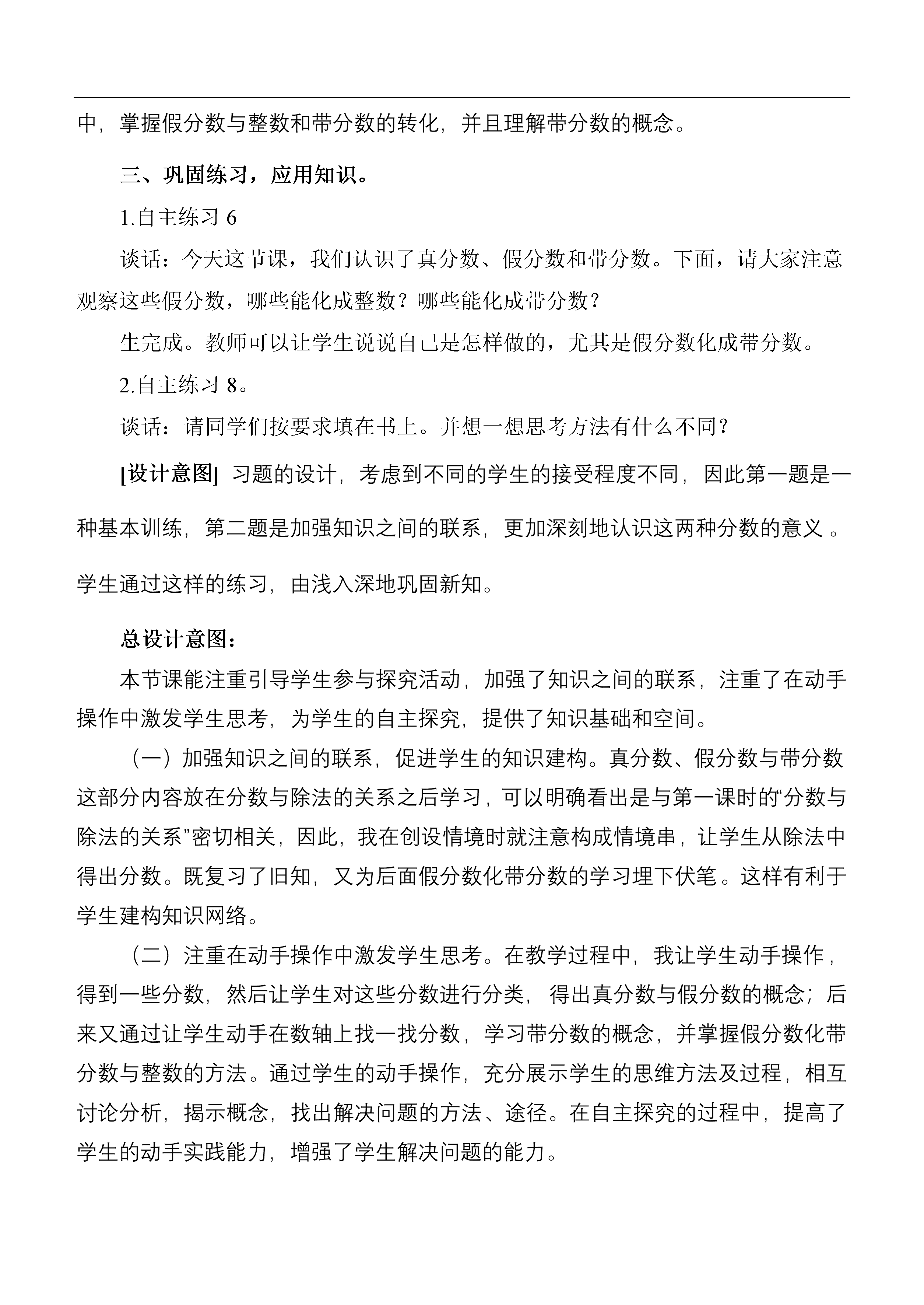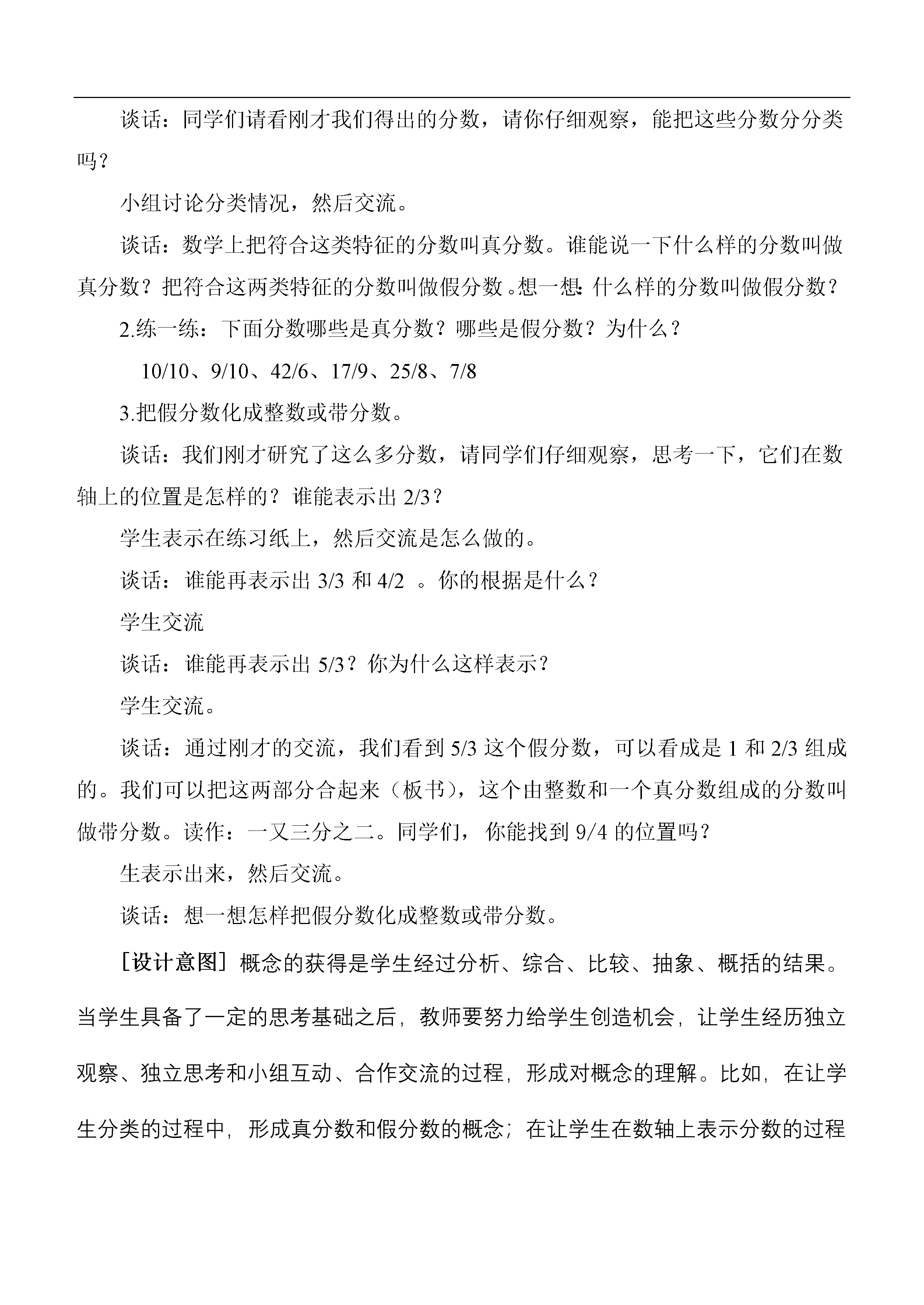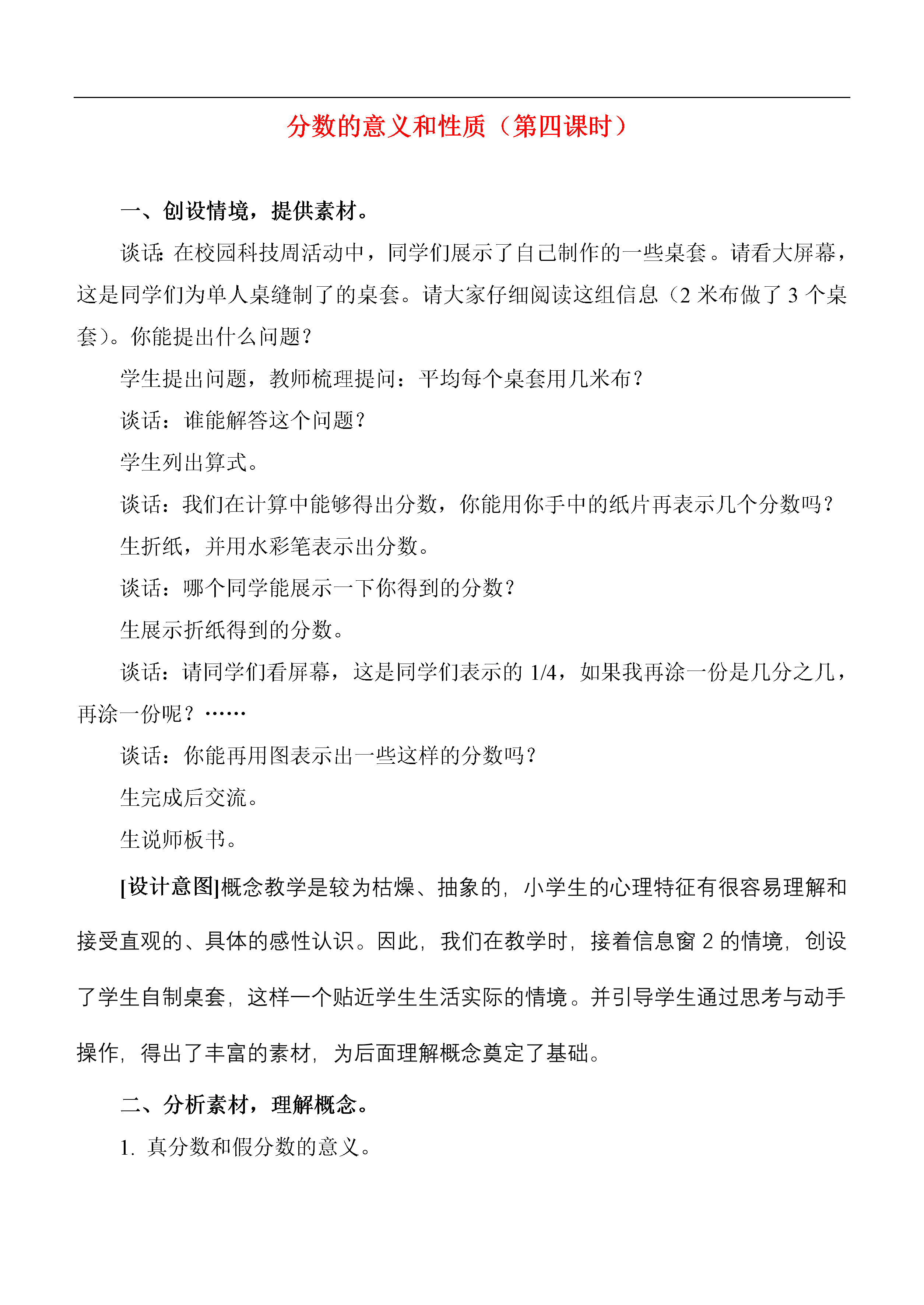 分数的意义和性质(第四课时)一、创设情境,提供素材。谈话:在校园科技周活动中,同学们展示了自己制作的一些桌套。请看大屏幕,这是同学们为单人桌缝制了的桌套。请大家仔细阅读这组信息(2米布做了3个桌套)。你能提出什么问题?学生提出问题,教师梳理提问:平均每个桌套用几米布?谈话:谁能解答这个问题?学生列出算式。谈话:我们在计算中能够得出分数,你能用你手中的纸片再表示几个分数吗?生折纸,并用水彩笔表示出分数。谈话:哪个同学能展示一下你得到的分数?生展示折纸得到的分数。谈话:请同学们看屏幕,这是同学们表示的1/4,如果我再涂一份是几分之几,再涂一份呢?……谈话:你能再用图表示出一些这样的分数吗?生完成后交流。生说师板书。[设计意图]概念教学是较为枯燥、抽象的,小学生的心理特征有很容易理解和接受直观的、具体的感性认识。因此,我们在教学时,接着信息窗2的情境,创设了学生自制桌套,这样一个贴近学生生活实际的情境。并引导学生通过思考与动手操作,得出了丰富的素材,为后面理解概念奠定了基础。二、分析素材,理解概念。1.真分数和假分数的意义。谈话:同学们请看刚才我们得出的分数,请你仔细观察,能把这些分数分分类吗?小组讨论分类情况,然后交流。谈话:数学上把符合这类特征的分数叫真分数。谁能说一下什么样的分数叫做真分数?把符合这两类特征的分数叫做假分数。想一想:什么样的分数叫做假分数?2.练一练:下面分数哪些是真分数?哪些是假分数?为什么?10/10、9/10、42/6、17/9、25/8、7/83.把假分数化成整数或带分数。谈话:我们刚才研究了这么多分数,请同学们仔细观察,思考一下,它们在数轴上的位置是怎样的?谁能表示出2/3?学生表示在练习纸上,然后交流是怎么做的。谈话:谁能再表示出3/3和4/2。你的根据是什么?学生交流谈话:谁能再表示出5/3?你为什么这样表示?学生交流。谈话:通过刚才的交流,我们看到5/3这个假分数,可以看成是1和2/3组成的。我们可以把这两部分合起来(板书),这个由整数和一个真分数组成的分数叫做带分数。读作:一又三分之二。同学们,你能找到9/4的位置吗?生表示出来,然后交流。谈话:想一想怎样把假分数化成整数或带分数。[设计意图]概念的获得是学生经过分析、综合、比较、抽象、概括的结果。当学生具备了一定的思考基础之后,教师要努力给学生创造机会,让学生经历独立观察、独立思考和小组互动、合作交流的过程,形成对概念的理解。比如,在让学生分类的过程中,形成真分数和假分数的概念;在让学生在数轴上表示分数的过程中,掌握假分数与整数和带分数的转化,并且理解带分数的概念。三、巩固练习,应用知识。1.自主练习6谈话:今天这节课,我们认识了真分数、假分数和带分数。下面,请大家注意观察这些假分数,哪些能化成整数?哪些能化成带分数?生完成。教师可以让学生说说自己是怎样做的,尤其是假分数化成带分数。2.自主练习8。谈话:请同学们按要求填在书上。并想一想思考方法有什么不同?[设计意图]习题的设计,考虑到不同的学生的接受程度不同,因此第一题是一种基本训练,第二题是加强知识之间的联系,更加深刻地认识这两种分数的意义。学生通过这样的练习,由浅入深地巩固新知。总设计意图:本节课能注重引导学生参与探究活动,加强了知识之间的联系,注重了在动手操作中激发学生思考,为学生的自主探究,提供了知识基础和空间。(一)加强知识之间的联系,促进学生的知识建构。真分数、假分数与带分数这部分内容放在分数与除法的关系之后学习,可以明确看出是与第一课时的“分数与除法的关系”密切相关,因此,我在创设情境时就注意构成情境串,让学生从除法中得出分数。既复习了旧知,又为后面假分数化带分数的学习埋下伏笔。这样有利于学生建构知识网络。(二)注重在动手操作中激发学生思考。在教学过程中,我让学生动手操作,得到一些分数,然后让学生对这些分数进行分类,得出真分数与假分数的概念;后来又通过让学生动手在数轴上找一找分数,学习带分数的概念,并掌握假分数化带分数与整数的方法。通过学生的动手操作,充分展示学生的思维方法及过程,相互讨论分析,揭示概念,找出解决问题的方法、途径。在自主探究的过程中,提高了学生的动手实践能力,增强了学生解决问题的能力。