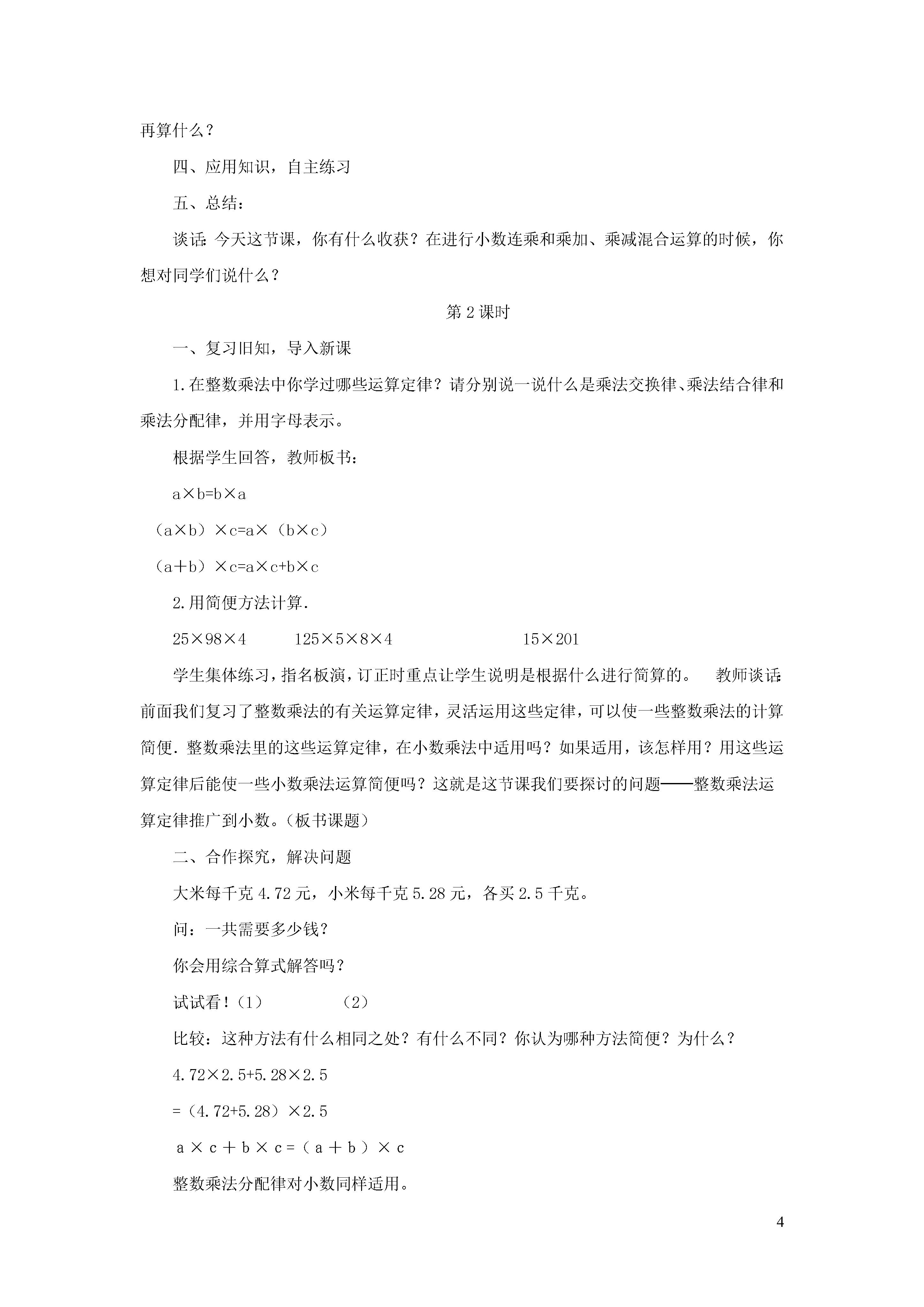 4信息窗3——小数的四则混合运算及简便运算教学内容义务教育课程标准实验教科书青岛版小学数学五年级上册第10—12页教材简析这部分知识是在学生掌握了小数乘法的计算法则、整数的乘加、乘减、整数乘法的运算定律等相关知识的基础上进行教学的。本信息窗呈现的仍然是逛超市的情景,图中以各种豆类和米类的单价为题材,引导学生提出计算绿豆多少钱等问题,引导对小数混合运算知识的学习。教学目标1.掌握小数的连乘、乘加、乘减的运算顺序,并能按运算顺序正确计算结果。2.理解整数乘法的交换律、结合律、分配律对于小数同样适用。3.提高学生的类推能力,培养学生知识间存在着内在联系的思想。教学重点掌握小数乘法的运算顺序和运算定律的应用。教学难点掌握小数乘法运算定律的应用。教学过程:第1课时一、复习旧知,导入新课谈话:同学们,前面我们学习了小数乘法,通过学习我们发现小数乘法与整数乘法间存在着紧密的联系。老师先看看大家前面的知识掌握得如何,我们一起来做练习检验一下:1.口算练习0.7×0.71.1×100.24×0.23.5×0.10.2×0.40.6×52.计算,并说说各题的运算顺序是怎样的:12×5×330×7+85250×4-320根据学生回答,教师小结:在计算整数连乘的时候,一般是从左往右依次运算,在计算整数乘加、乘减运算的时候,一般是先算乘法,后算加、减法。二、创设情境,提出问题(出示情境图)提问:仔细观察情境图,你从中都能知道哪些数学信息?根据这些信息,你能提出什么数学问题?以小组为单位提出问题,组长负责记录、整理,一步计算的题目在小组内解决。引导学生提出两步计算的问题,根据学生回答板书:买2.5千克绿豆需要多少钱?三、合作探究,解决问题1.解决问题:买2.5千克绿豆需要多少钱?问题怎样解决?如何列式?学生尝试自己列式解决。(教师了解学生做的情况,对少数独立计算有困难的学生适当给予的指导和帮助。)小组讨论:观察算式,这道题有什么特点?计算时运算顺序是怎样的?每一步分别求的是什么?指名小组进行展示:计算方法:先算每千克绿豆的价钱,再算买2.5千克需要多少钱?计算时按照从左到右的顺序计算。4.82×1.5×2.5=7.23×2.5=18.075(元)≈18.08(元)提问:现在,如果是你来付钱,需要付多少钱呢?为什么?根据学生回答,教师讲解:收现款时,通常只算到“分”,所以把18.075保留两位小数,取近似值18.08。在生活当中,很多地方都要根据实际情况或者按照要求求积的近似值,因此,要学会灵活应用这一知识。2.西红柿每千克5.46元,黄瓜每千克2.24元。买1千克西红柿比买2千克黄瓜要多花多少钱?5.46-2.24×2=5.46-4.48=0.98(元)答:买1千克西红柿比买2千克黄瓜要多花0.98元钱。想一想,在一个小数四则混合运算的算式里,既有乘法,又有加(或减)法,应先算什么?再算什么?四、应用知识,自主练习五、总结:谈话:今天这节课,你有什么收获?在进行小数连乘和乘加、乘减混合运算的时候,你想对同学们说什么?第2课时一、复习旧知,导入新课1.在整数乘法中你学过哪些运算定律?请分别说一说什么是乘法交换律、乘法结合律和乘法分配律,并用字母表示。根据学生回答,教师板书:a×b=b×a(a×b)×c=a×(b×c)(a+b)×c=a×c+b×c2.用简便方法计算.25×98×4125×5×8×415×201学生集体练习,指名板演,订正时重点让学生说明是根据什么进行简算的。教师谈话:前面我们复习了整数乘法的有关运算定律,灵活运用这些定律,可以使一些整数乘法的计算简便.整数乘法里的这些运算定律,在小数乘法中适用吗?如果适用,该怎样用?用这些运算定律后能使一些小数乘法运算简便吗?这就是这节课我们要探讨的问题──整数乘法运算定律推广到小数。(板书课题)二、合作探究,解决问题大米每千克4.72元,小米每千克5.28元,各买2.5千克。问:一共需要多少钱?你会用综合算式解答吗?试试看!(1)(2)比较:这种方法有什么相同之处?有什么不同?你认为哪种方法简便?为什么?4.72×2.5+5.28×2.5=(4.72+5.28)×2.5a×c