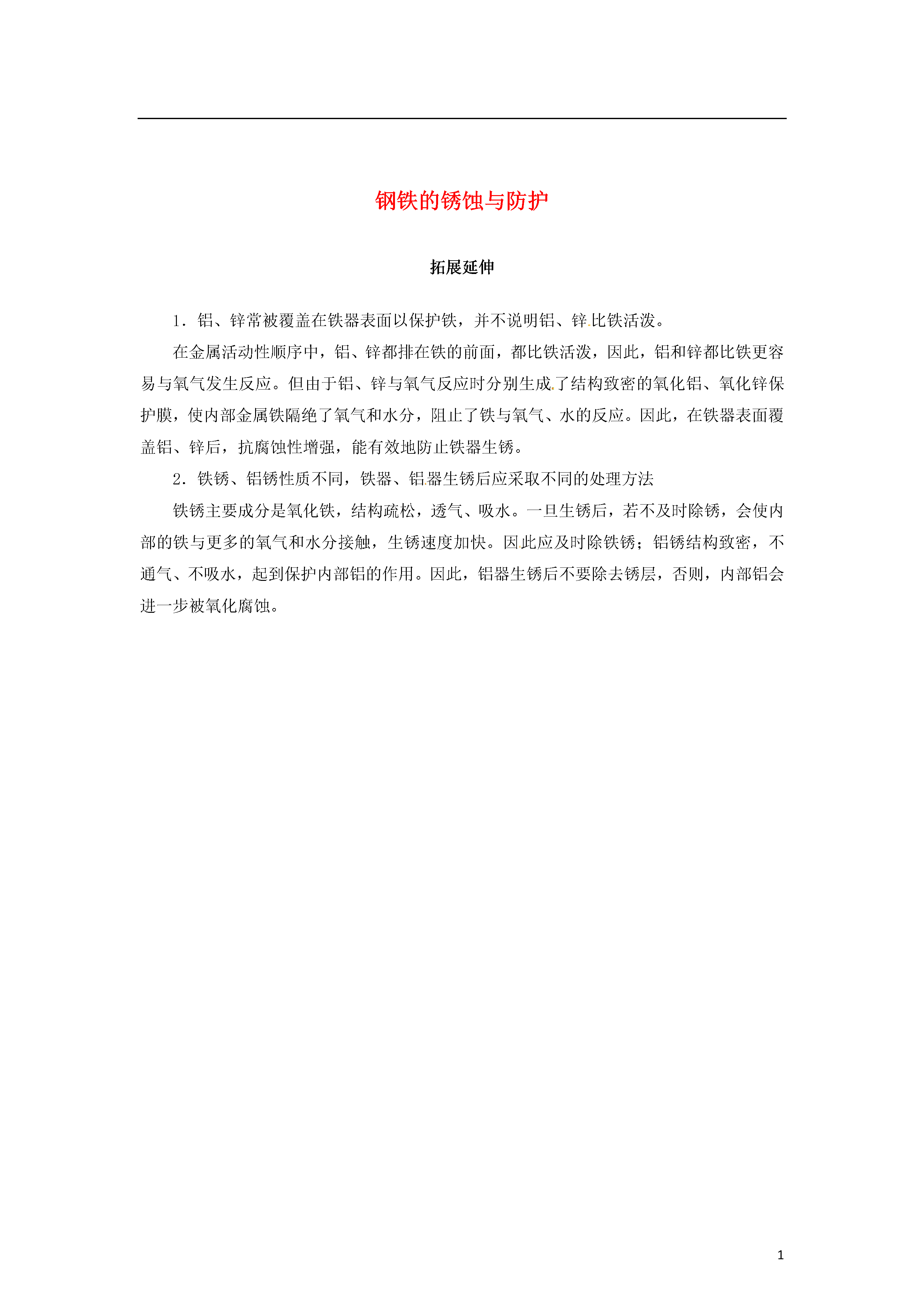 1钢铁的锈蚀与防护拓展延伸1.铝、锌常被覆盖在铁器表面以保护铁,并不说明铝、锌比铁活泼。在金属活动性顺序中,铝、锌都排在铁的前面,都比铁活泼,因此,铝和锌都比铁更容易与氧气发生反应。但由于铝、锌与氧气反应时分别生成了结构致密的氧化铝、氧化锌保护膜,使内部金属铁隔绝了氧气和水分,阻止了铁与氧气、水的反应。因此,在铁器表面覆盖铝、锌后,抗腐蚀性增强,能有效地防止铁器生锈。2.铁锈、铝锈性质不同,铁器、铝器生锈后应采取不同的处理方法铁锈主要成分是氧化铁,结构疏松,透气、吸水。一旦生锈后,若不及时除锈,会使内部的铁与更多的氧气和水分接触,生锈速度加快。因此应及时除铁锈;铝锈结构致密,不通气、不吸水,起到保护内部铝的作用。因此,铝器生锈后不要除去锈层,否则,内部铝会进一步被氧化腐蚀。