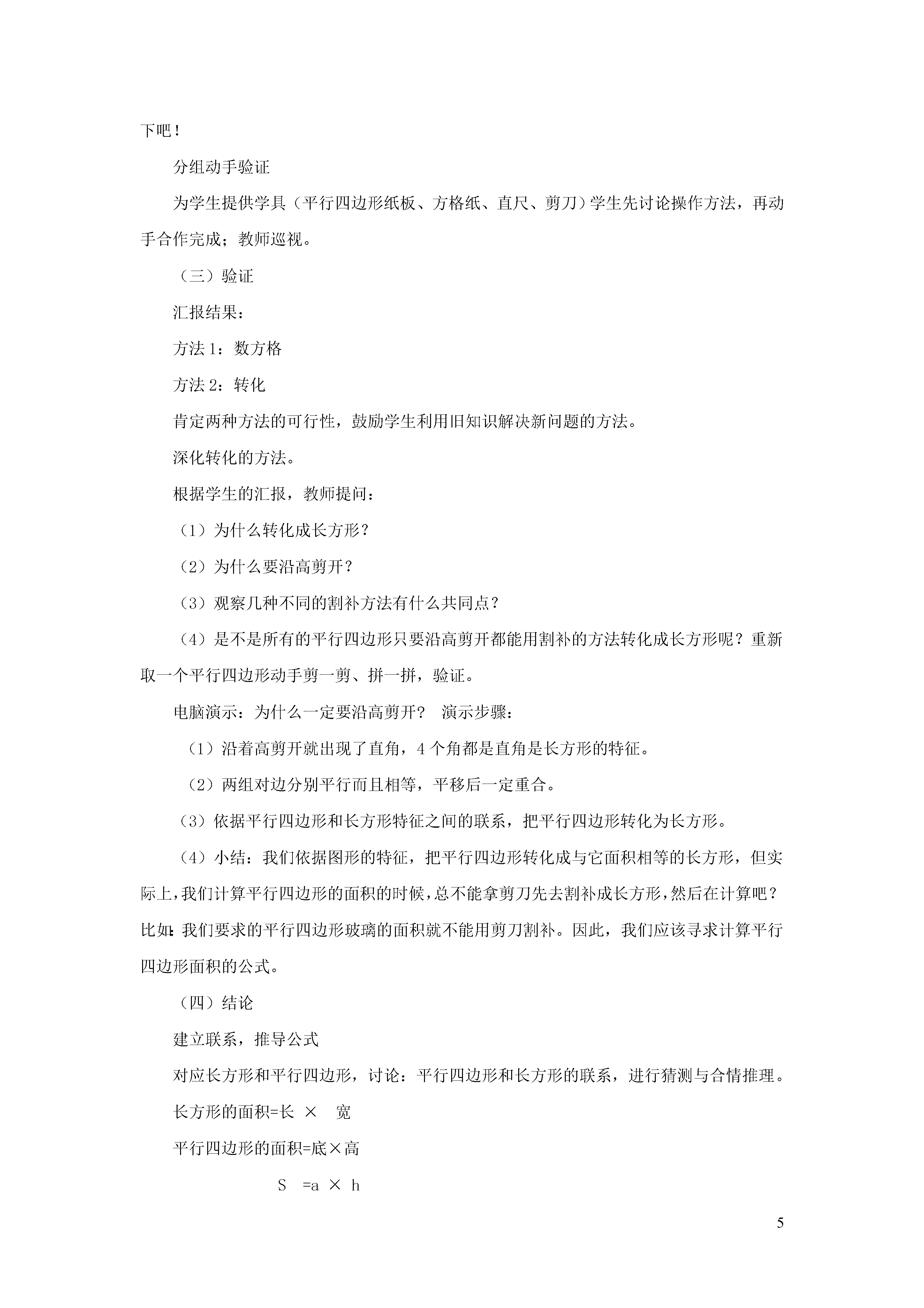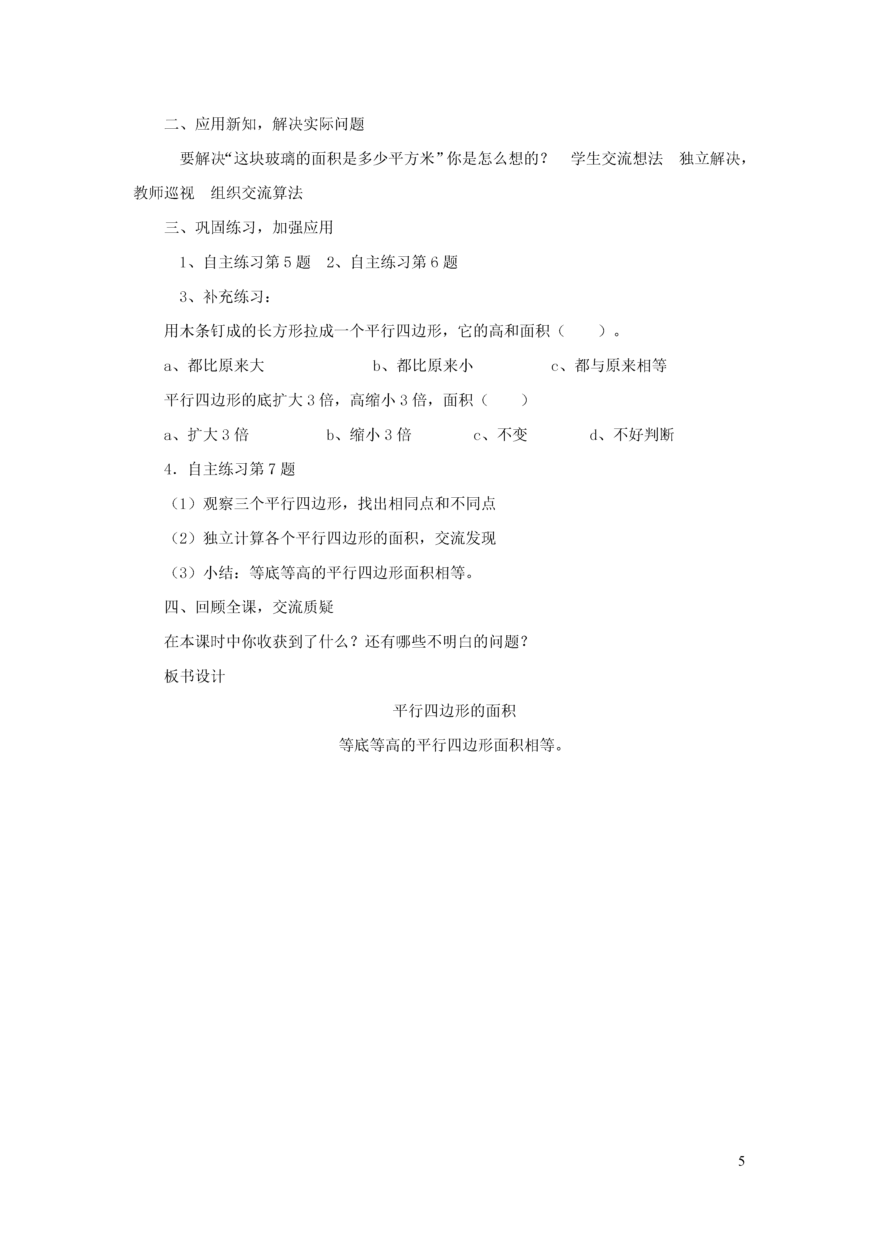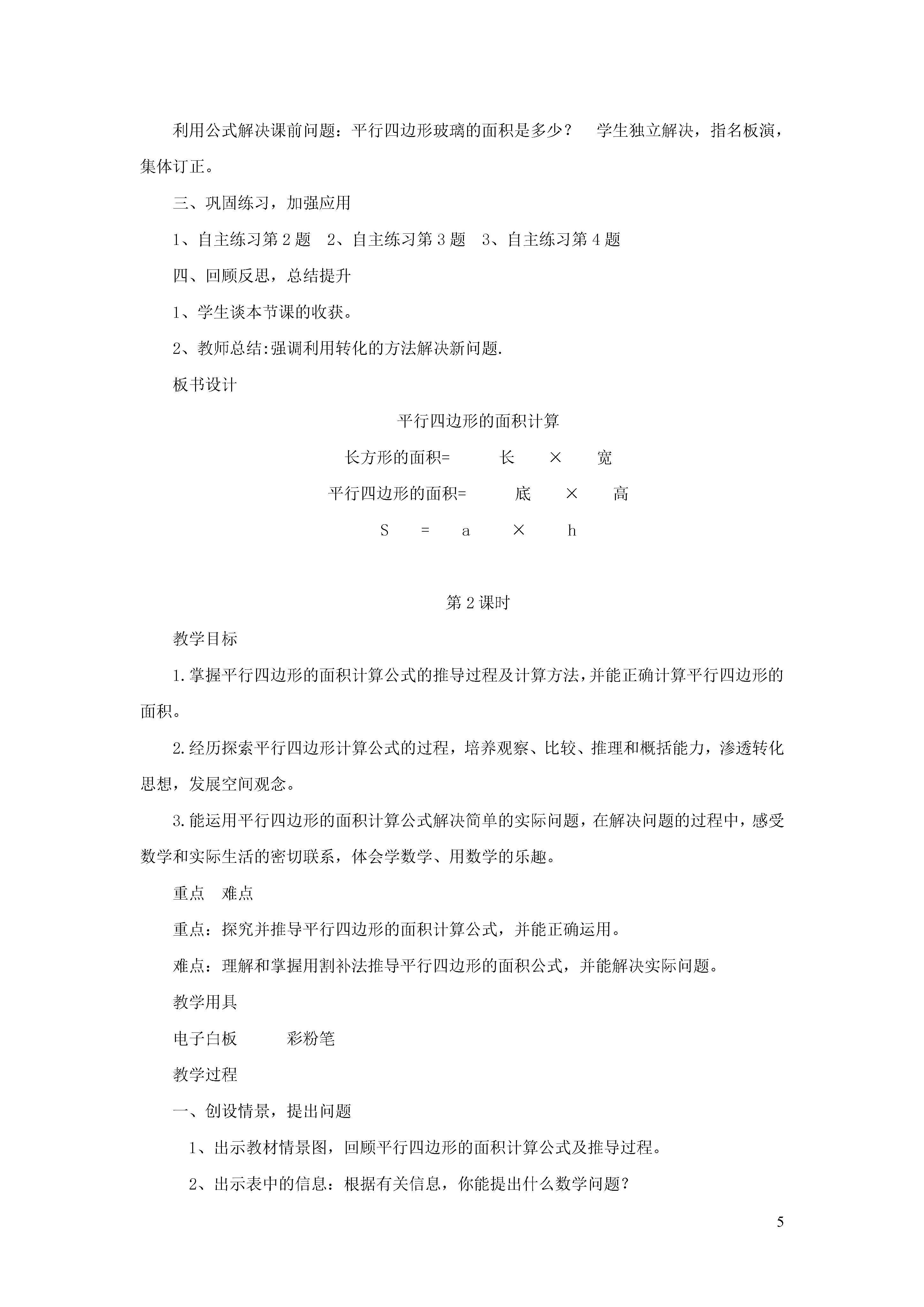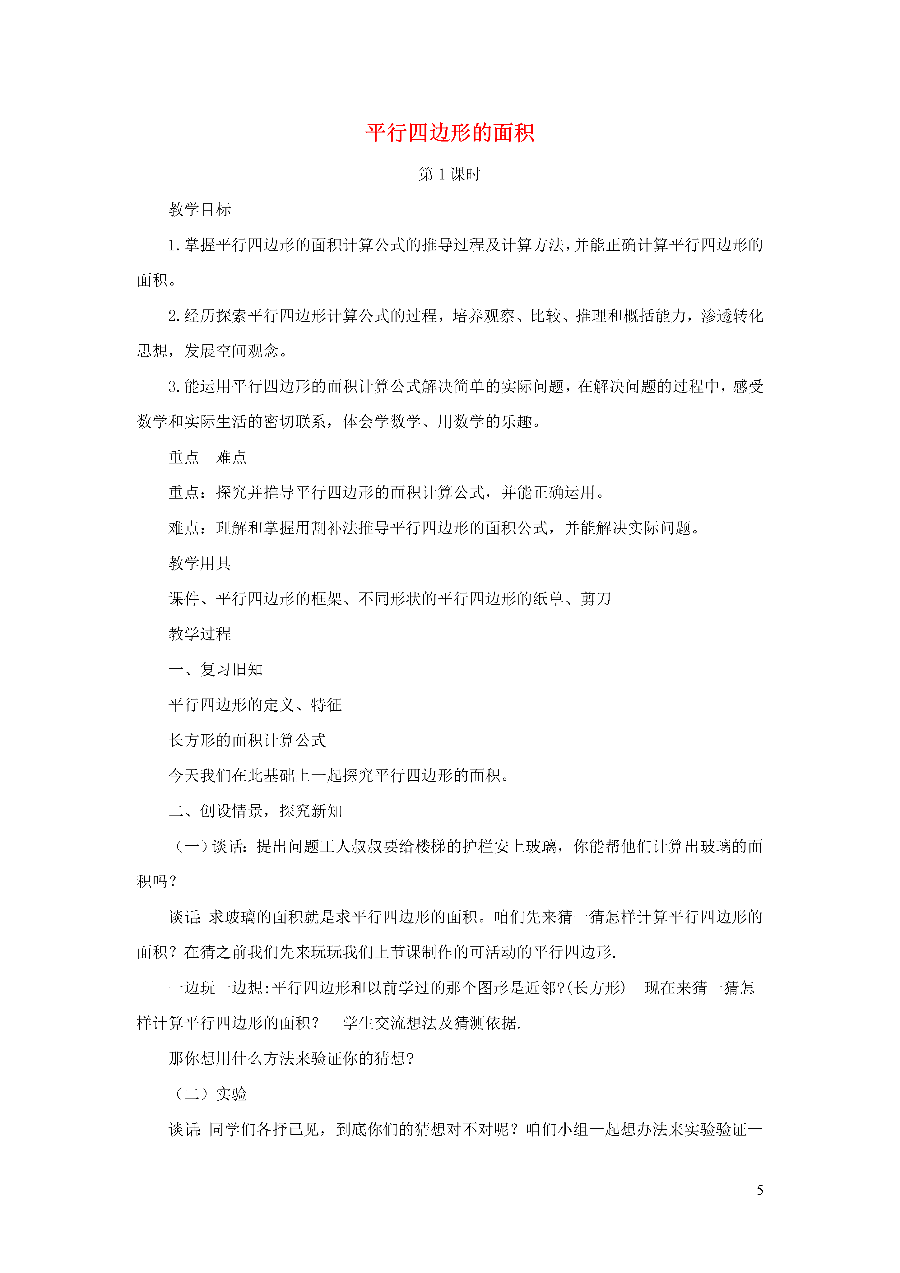 5平行四边形的面积第1课时教学目标1.掌握平行四边形的面积计算公式的推导过程及计算方法,并能正确计算平行四边形的面积。2.经历探索平行四边形计算公式的过程,培养观察、比较、推理和概括能力,渗透转化思想,发展空间观念。3.能运用平行四边形的面积计算公式解决简单的实际问题,在解决问题的过程中,感受数学和实际生活的密切联系,体会学数学、用数学的乐趣。重点难点重点:探究并推导平行四边形的面积计算公式,并能正确运用。难点:理解和掌握用割补法推导平行四边形的面积公式,并能解决实际问题。教学用具课件、平行四边形的框架、不同形状的平行四边形的纸单、剪刀教学过程一、复习旧知平行四边形的定义、特征长方形的面积计算公式今天我们在此基础上一起探究平行四边形的面积。二、创设情景,探究新知(一)谈话:提出问题工人叔叔要给楼梯的护栏安上玻璃,你能帮他们计算出玻璃的面积吗?谈话:求玻璃的面积就是求平行四边形的面积。咱们先来猜一猜怎样计算平行四边形的面积?在猜之前我们先来玩玩我们上节课制作的可活动的平行四边形.一边玩一边想:平行四边形和以前学过的那个图形是近邻?(长方形)现在来猜一猜怎样计算平行四边形的面积?学生交流想法及猜测依据.那你想用什么方法来验证你的猜想?(二)实验谈话:同学们各抒己见,到底你们的猜想对不对呢?咱们小组一起想办法来实验验证一下吧!分组动手验证为学生提供学具(平行四边形纸板、方格纸、直尺、剪刀)学生先讨论操作方法,再动手合作完成;教师巡视。(三)验证汇报结果:方法1:数方格方法2:转化肯定两种方法的可行性,鼓励学生利用旧知识解决新问题的方法。深化转化的方法。根据学生的汇报,教师提问:(1)为什么转化成长方形?(2)为什么要沿高剪开?(3)观察几种不同的割补方法有什么共同点?(4)是不是所有的平行四边形只要沿高剪开都能用割补的方法转化成长方形呢?重新取一个平行四边形动手剪一剪、拼一拼,验证。电脑演示:为什么一定要沿高剪开?演示步骤:(1)沿着高剪开就出现了直角,4个角都是直角是长方形的特征。(2)两组对边分别平行而且相等,平移后一定重合。(3)依据平行四边形和长方形特征之间的联系,把平行四边形转化为长方形。(4)小结:我们依据图形的特征,把平行四边形转化成与它面积相等的长方形,但实际上,我们计算平行四边形的面积的时候,总不能拿剪刀先去割补成长方形,然后在计算吧?比如:我们要求的平行四边形玻璃的面积就不能用剪刀割补。因此,我们应该寻求计算平行四边形面积的公式。(四)结论建立联系,推导公式对应长方形和平行四边形,讨论:平行四边形和长方形的联系,进行猜测与合情推理。长方形的面积=长×宽平行四边形的面积=底×高S=a×h利用公式解决课前问题:平行四边形玻璃的面积是多少?学生独立解决,指名板演,集体订正。三、巩固练习,加强应用1、自主练习第2题2、自主练习第3题3、自主练习第4题四、回顾反思,总结提升1、学生谈本节课的收获。2、教师总结:强调利用转化的方法解决新问题.板书设计平行四边形的面积计算长方形的面积=长×宽平行四边形的面积=底×高S=a×h第2课时教学目标1.掌握平行四边形的面积计算公式的推导过程及计算方法,并能正确计算平行四边形的面积。2.经历探索平行四边形计算公式的过程,培养观察、比较、推理和概括能力,渗透转化思想,发展空间观念。3.能运用平行四边形的面积计算公式解决简单的实际问题,在解决问题的过程中,感受数学和实际生活的密切联系,体会学数学、用数学的乐趣。重点难点重点:探究并推导平行四边形的面积计算公式,并能正确运用。难点:理解和掌握用割补法推导平行四边形的面积公式,并能解决实际问题。教学用具电子白板彩粉笔教学过程一、创设情景,提出问题1、出示教材情景图,回顾平行四边形的面积计算公式及推导过程。2、出示表中的信息:根据有关信息,你能提出什么数学问题?二、应用新知,解决实际问题要解决“这块玻璃的面积是多少平方米”你是怎么想的?学生交流想法独立解决,教师巡视组织交流算法三、巩固练习,加强应用1、自主练习第5题2、自主练习第6题3、补充练习:用木条钉成的长方形拉成一个平行四边形,它的高和面积()。a、都比原来大b、都比原来小c、都与原来相等平行四边形的底扩大3倍,高缩小3倍,面积()扩大3倍b、缩小3倍c、不变d、不好判断4.自主