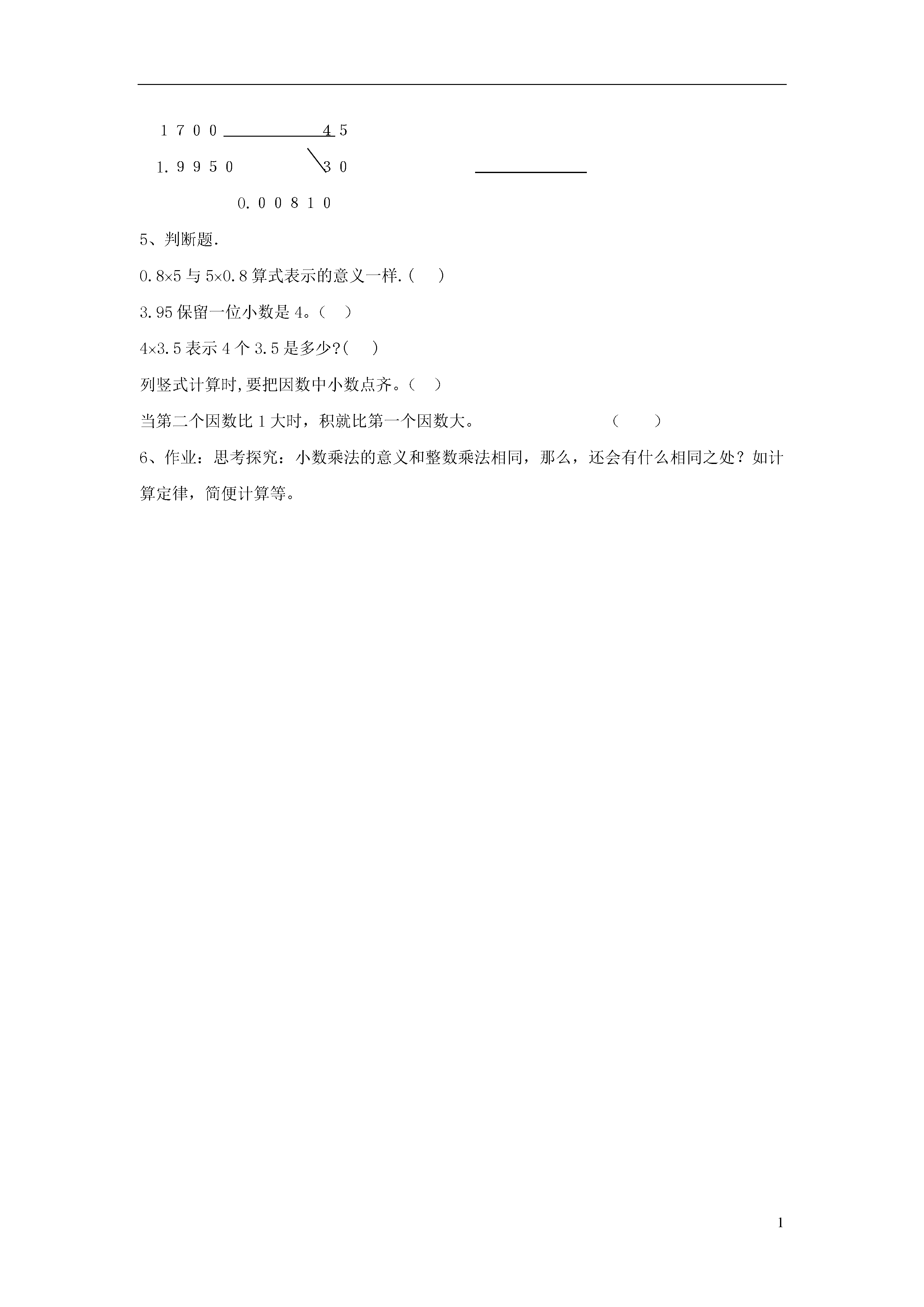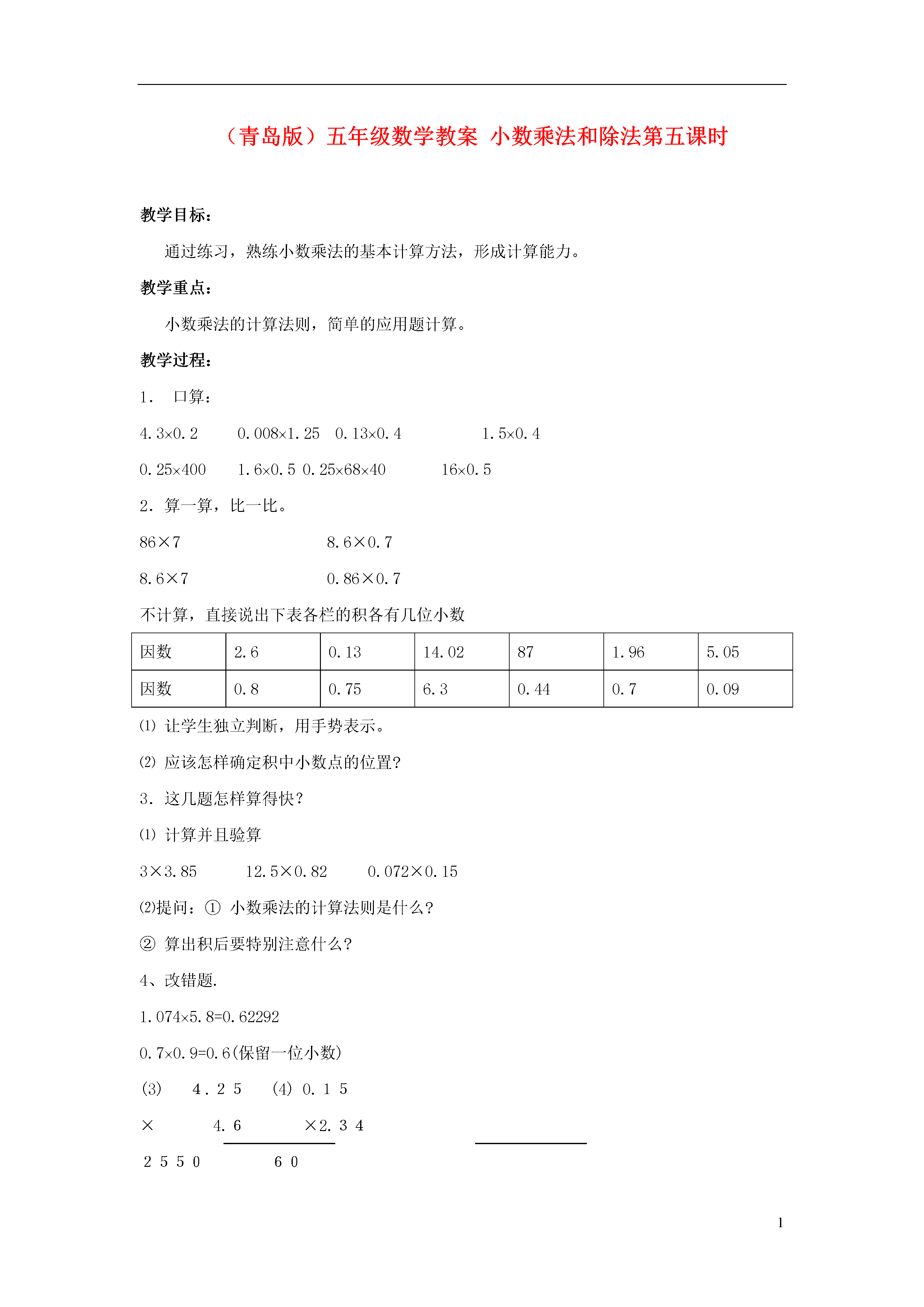 1(青岛版)五年级数学教案小数乘法和除法第五课时教学目标:通过练习,熟练小数乘法的基本计算方法,形成计算能力。教学重点:小数乘法的计算法则,简单的应用题计算。教学过程:1.口算:4.30.20.0081.250.130.41.50.40.254001.60.50.256840160.52.算一算,比一比。86×78.6×0.78.6×70.86×0.7不计算,直接说出下表各栏的积各有几位小数因数2.60.1314.02871.965.05因数0.80.756.30.440.70.09⑴让学生独立判断,用手势表示。⑵应该怎样确定积中小数点的位置?3.这几题怎样算得快?⑴计算并且验算3×3.8512.5×0.820.072×0.15⑵提问:①小数乘法的计算法则是什么?②算出积后要特别注意什么?4、改错题.1.0745.8=0.622920.70.9=0.6(保留一位小数)(3)4.25(4)0.15×4.6×2.342550601700451.9950300.008105、判断题.0.85与50.8算式表示的意义一样.()3.95保留一位小数是4。()43.5表示4个3.5是多少?()列竖式计算时,要把因数中小数点齐。()当第二个因数比1大时,积就比第一个因数大。()6、作业:思考探究:小数乘法的意义和整数乘法相同,那么,还会有什么相同之处?如计算定律,简便计算等。