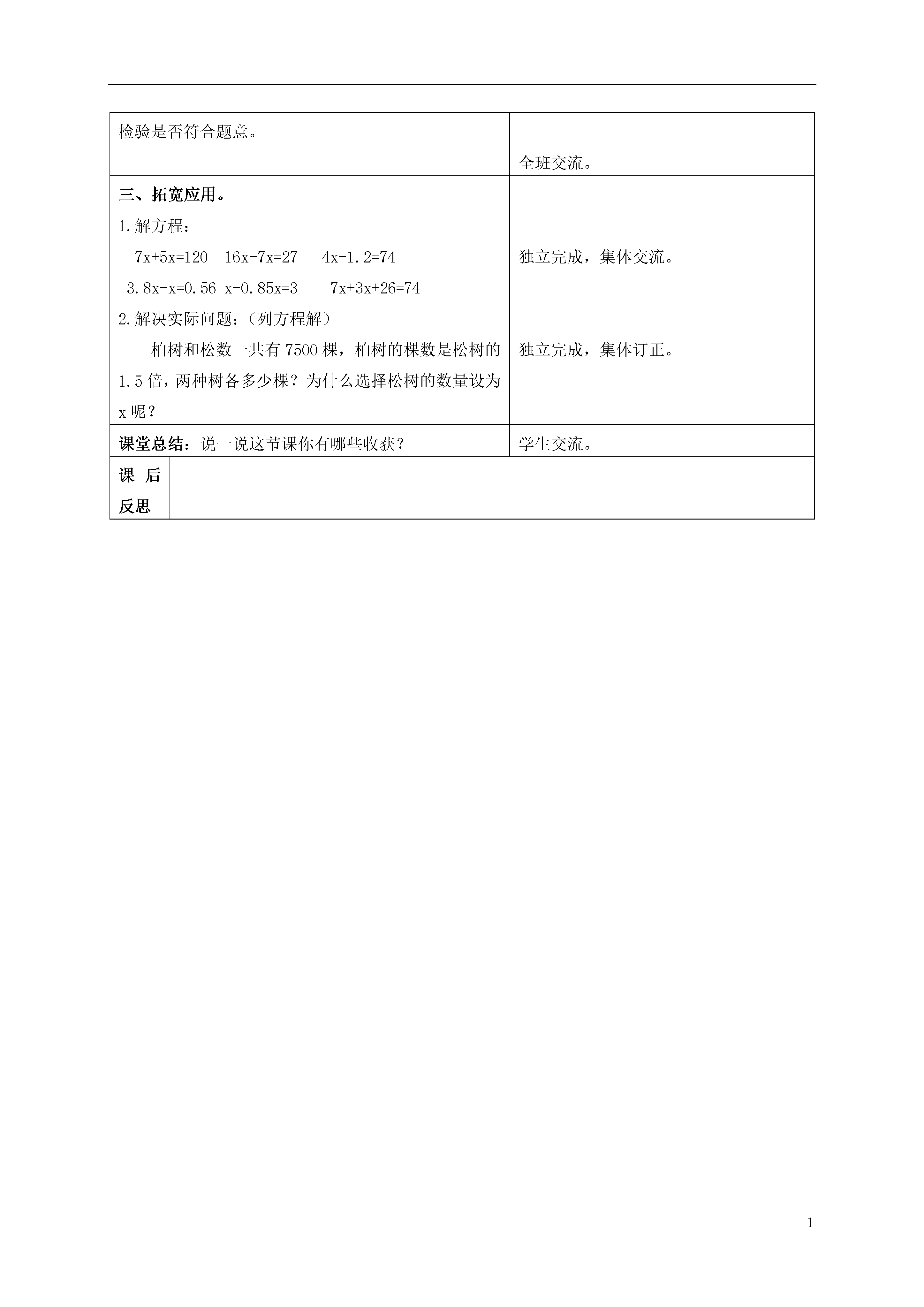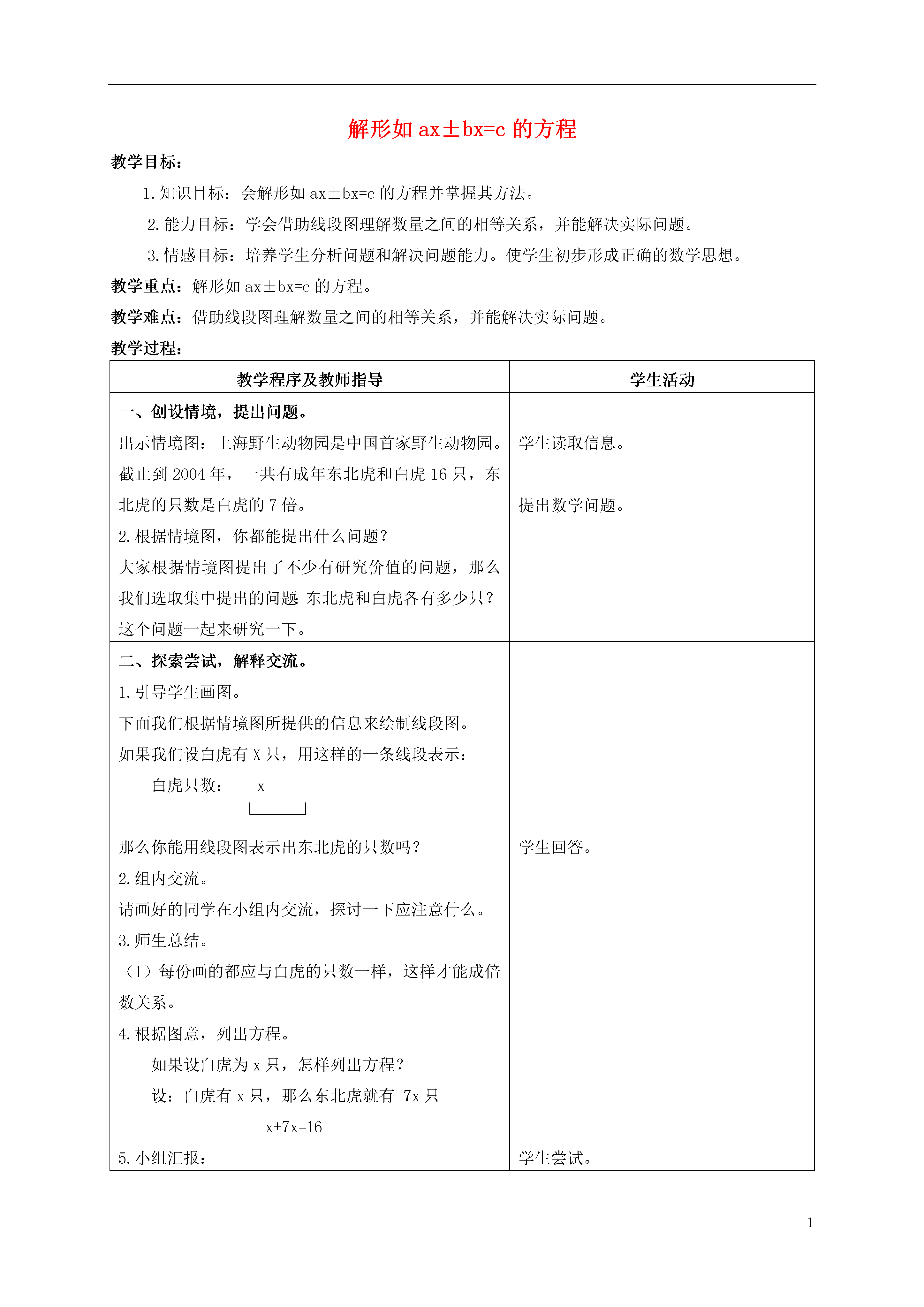 1解形如ax±bx=c的方程教学目标:1.知识目标:会解形如ax±bx=c的方程并掌握其方法。2.能力目标:学会借助线段图理解数量之间的相等关系,并能解决实际问题。3.情感目标:培养学生分析问题和解决问题能力。使学生初步形成正确的数学思想。教学重点:解形如ax±bx=c的方程。教学难点:借助线段图理解数量之间的相等关系,并能解决实际问题。教学过程:教学程序及教师指导学生活动一、创设情境,提出问题。出示情境图:上海野生动物园是中国首家野生动物园。截止到2004年,一共有成年东北虎和白虎16只,东北虎的只数是白虎的7倍。2.根据情境图,你都能提出什么问题?大家根据情境图提出了不少有研究价值的问题,那么我们选取集中提出的问题:东北虎和白虎各有多少只?这个问题一起来研究一下。学生读取信息。提出数学问题。二、探索尝试,解释交流。1.引导学生画图。下面我们根据情境图所提供的信息来绘制线段图。如果我们设白虎有X只,用这样的一条线段表示:白虎只数:x那么你能用线段图表示出东北虎的只数吗?2.组内交流。请画好的同学在小组内交流,探讨一下应注意什么。3.师生总结。(1)每份画的都应与白虎的只数一样,这样才能成倍数关系。4.根据图意,列出方程。如果设白虎为x只,怎样列出方程?设:白虎有x只,那么东北虎就有7x只x+7x=165.小组汇报:检验是否符合题意。学生回答。学生尝试。全班交流。三、拓宽应用。1.解方程:7x+5x=12016x-7x=274x-1.2=743.8x-x=0.56x-0.85x=37x+3x+26=742.解决实际问题:(列方程解)柏树和松数一共有7500棵,柏树的棵数是松树的1.5倍,两种树各多少棵?为什么选择松树的数量设为x呢?独立完成,集体交流。独立完成,集体订正。课堂总结:说一说这节课你有哪些收获?学生交流。课后反思