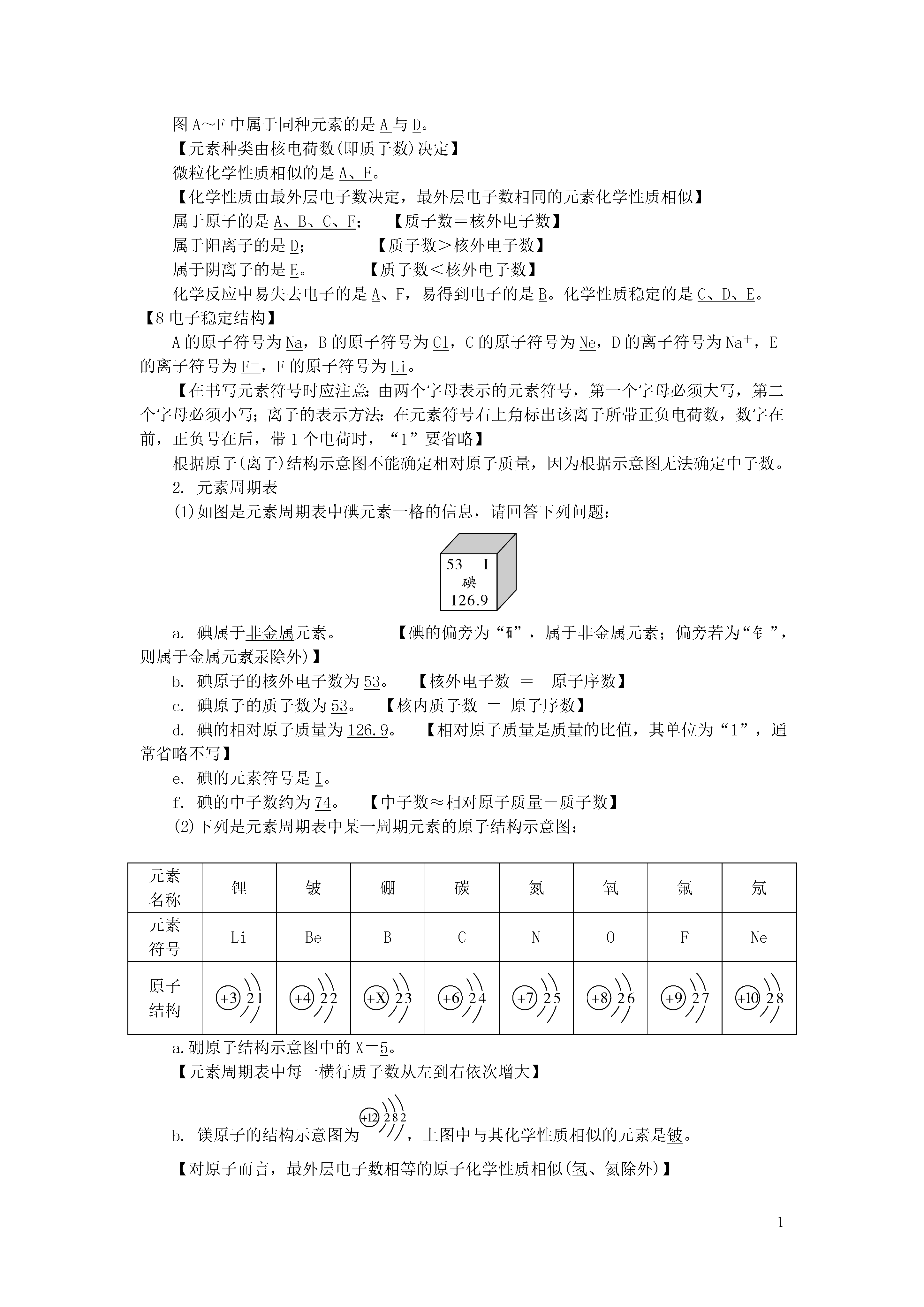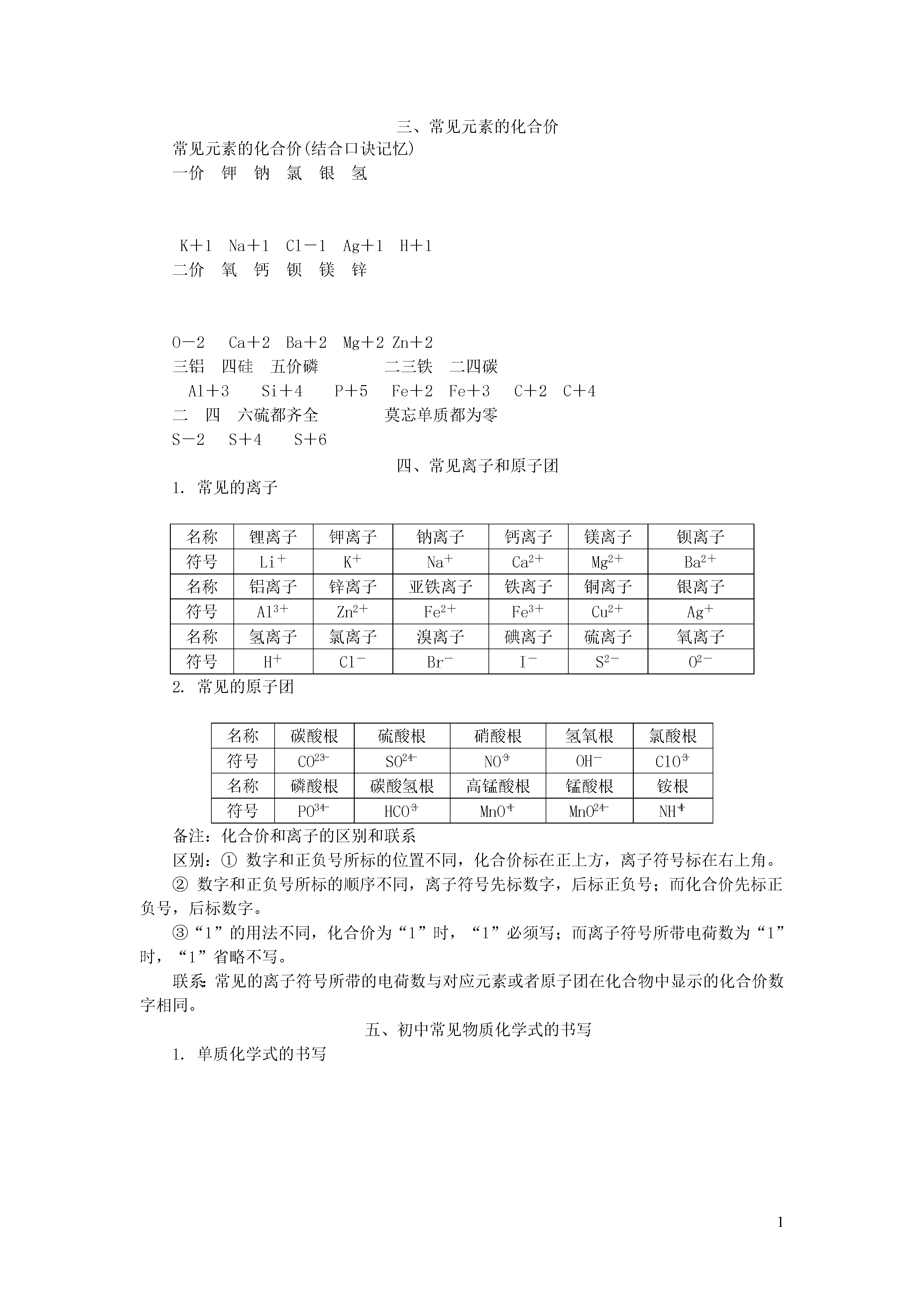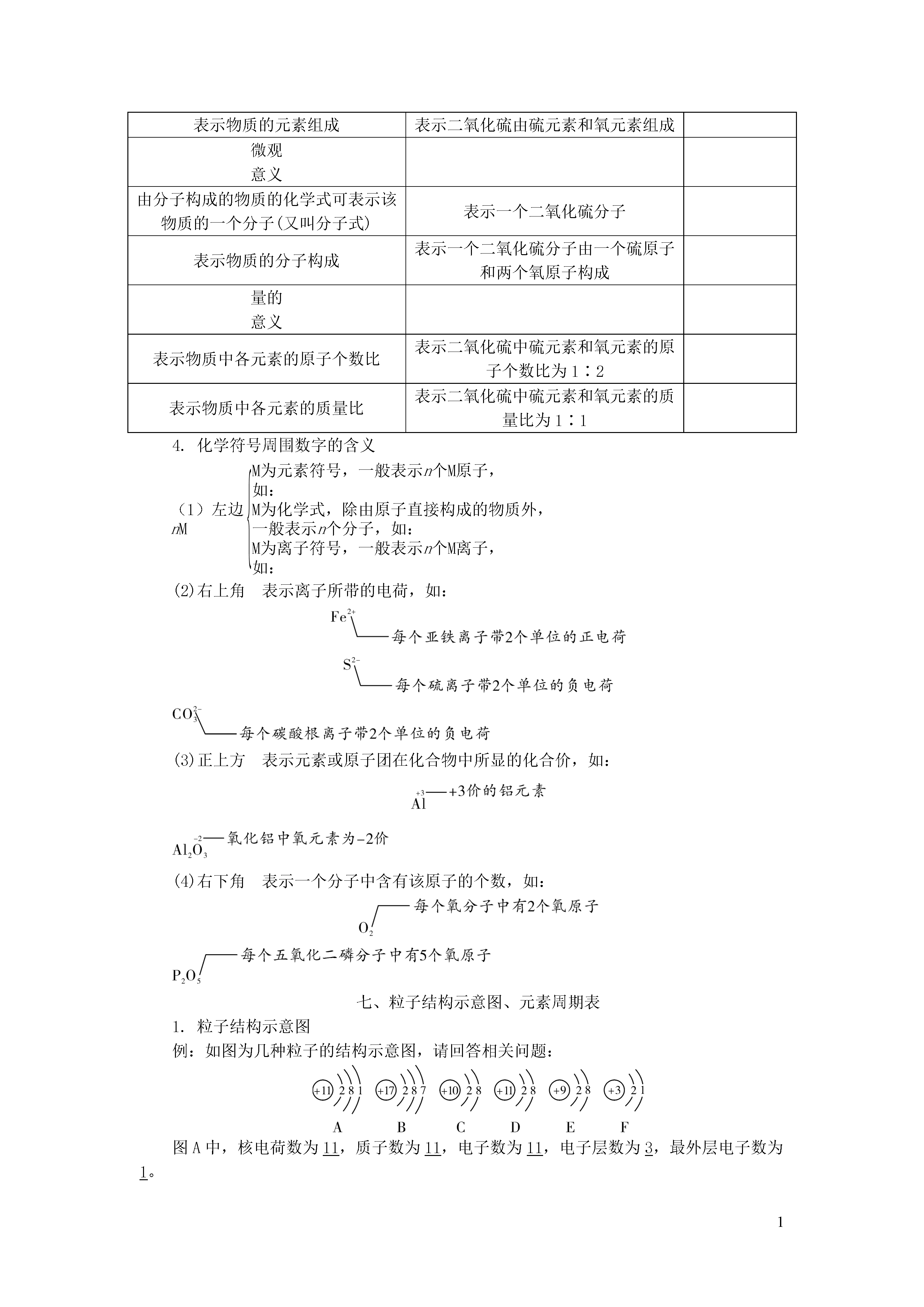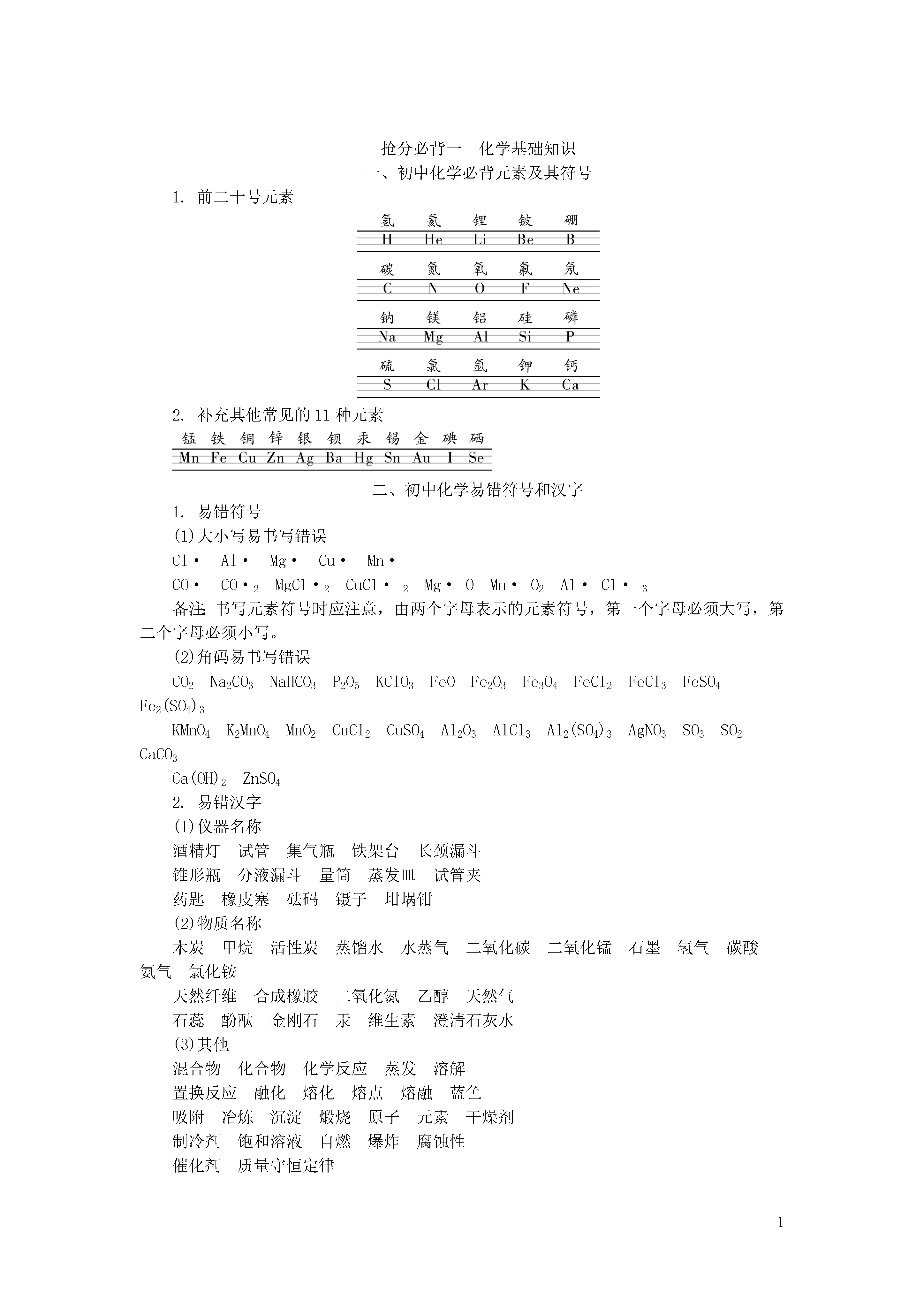 1抢分必背一化学基础知识一、初中化学必背元素及其符号1.前二十号元素2.补充其他常见的11种元素eq\a\vs4\al(二、初中化学易错符号和汉字)1.易错符号(1)大小写易书写错误Cl·Al·Mg·Cu·Mn·CO·CO·2MgCl·2CuCl·2Mg·OMn·O2Al·Cl·3备注:书写元素符号时应注意,由两个字母表示的元素符号,第一个字母必须大写,第二个字母必须小写。(2)角码易书写错误CO2Na2CO3NaHCO3P2O5KClO3FeOFe2O3Fe3O4FeCl2FeCl3FeSO4Fe2(SO4)3KMnO4K2MnO4MnO2CuCl2CuSO4Al2O3AlCl3Al2(SO4)3AgNO3SO3SO2CaCO3Ca(OH)2ZnSO42.易错汉字(1)仪器名称酒精灯试管集气瓶铁架台长颈漏斗锥形瓶分液漏斗量筒蒸发皿试管夹药匙橡皮塞砝码镊子坩埚钳(2)物质名称木炭甲烷活性炭蒸馏水水蒸气二氧化碳二氧化锰石墨氢气碳酸氨气氯化铵天然纤维合成橡胶二氧化氮乙醇天然气石蕊酚酞金刚石汞维生素澄清石灰水(3)其他混合物化合物化学反应蒸发溶解置换反应融化熔化熔点熔融蓝色吸附冶炼沉淀煅烧原子元素干燥剂制冷剂饱和溶液自燃爆炸腐蚀性催化剂质量守恒定律eq\a\vs4\al(三、常见元素的化合价)常见元素的化合价(结合口诀记忆)一价钾钠氯银氢K+1Na+1Cl-1Ag+1H+1二价氧钙钡镁锌O-2Ca+2Ba+2Mg+2Zn+2三铝四硅五价磷二三铁二四碳Al+3Si+4P+5Fe+2Fe+3C+2C+4二四六硫都齐全莫忘单质都为零S-2S+4S+6eq\a\vs4\al(四、常见离子和原子团)1.常见的离子名称锂离子钾离子钠离子钙离子镁离子钡离子符号Li+K+Na+Ca2+Mg2+Ba2+名称铝离子锌离子亚铁离子铁离子铜离子银离子符号Al3+Zn2+Fe2+Fe3+Cu2+Ag+名称氢离子氯离子溴离子碘离子硫离子氧离子符号H+Cl-Br-I-S2-O2-2.常见的原子团名称碳酸根硫酸根硝酸根氢氧根氯酸根符号COeq\o\al(2-,3)SOeq\o\al(2-,4)NOeq\o\al(-,3)OH-ClOeq\o\al(-,3)名称磷酸根碳酸氢根高锰酸根锰酸根铵根符号POeq\o\al(3-,4)HCOeq\o\al(-,3)MnOeq\o\al(-,4)MnOeq\o\al(2-,4)NHeq\o\al(+,4)备注:化合价和离子的区别和联系区别:①数字和正负号所标的位置不同,化合价标在正上方,离子符号标在右上角。②数字和正负号所标的顺序不同,离子符号先标数字,后标正负号;而化合价先标正负号,后标数字。③“1”的用法不同,化合价为“1”时,“1”必须写;而离子符号所带电荷数为“1”时,“1”省略不写。联系:常见的离子符号所带的电荷数与对应元素或者原子团在化合物中显示的化合价数字相同。五、初中常见物质化学式的书写1.单质化学式的书写单质eq\b\lc\{(\a\vs4\al\co1(金属单质:元素即可表示该物质的化学式,,如:钠—Na、钾—K,\a\vs4\al(非金属,单质)\b\lc\{(\a\vs4\al\co1(元素即可表示该物质的化学式——单原,子单质型,如:碳—C、磷—P,\a\vs4\al(元素和原子个,数组合表示该,物质的化学式)\b\lc\{(\a\vs4\al\co1(双原子单质型,,如:氧气—O2、氢气—H2,多原子单质型,,如:臭氧—O3))))))2.化合物化学式的书写(利用交叉法)硫酸铝氧化钙氢氧化钾分析名称,找出组成成分铝离子硫酸根钙离子氧离子钾离子氢氧根写出组成成分的符号Al3+SOeq\o\al(2-,4)Ca2+O2-K+OH-标上化合价eq\o(Al,\s\up6(+3))eq\o(SO,\s\up6(-2))eq\o\al(2-,4)eq\o(Ca,\s\up6(+2))eq\o(O,\s\up6(-2))eq\o(K,\s\up6(+1))eq\o(OH,\s\up6(-1))-化合价绝对值交叉即为原子(或原子团)个数(若有公约数,先约简后交叉)理论依据化合物中各元素正负化合价代数和为零化合物化学式的书写口诀氧化物,酸碱盐,结构微粒符号现,负排后,正排前,标价态,交叉看,数有公约应约简,得出数字写在右下边六、化学符号的意义及符号中数字的含义1.元素符号的含义(1)表示一种元素;(2)表示这种元素的一个原子;