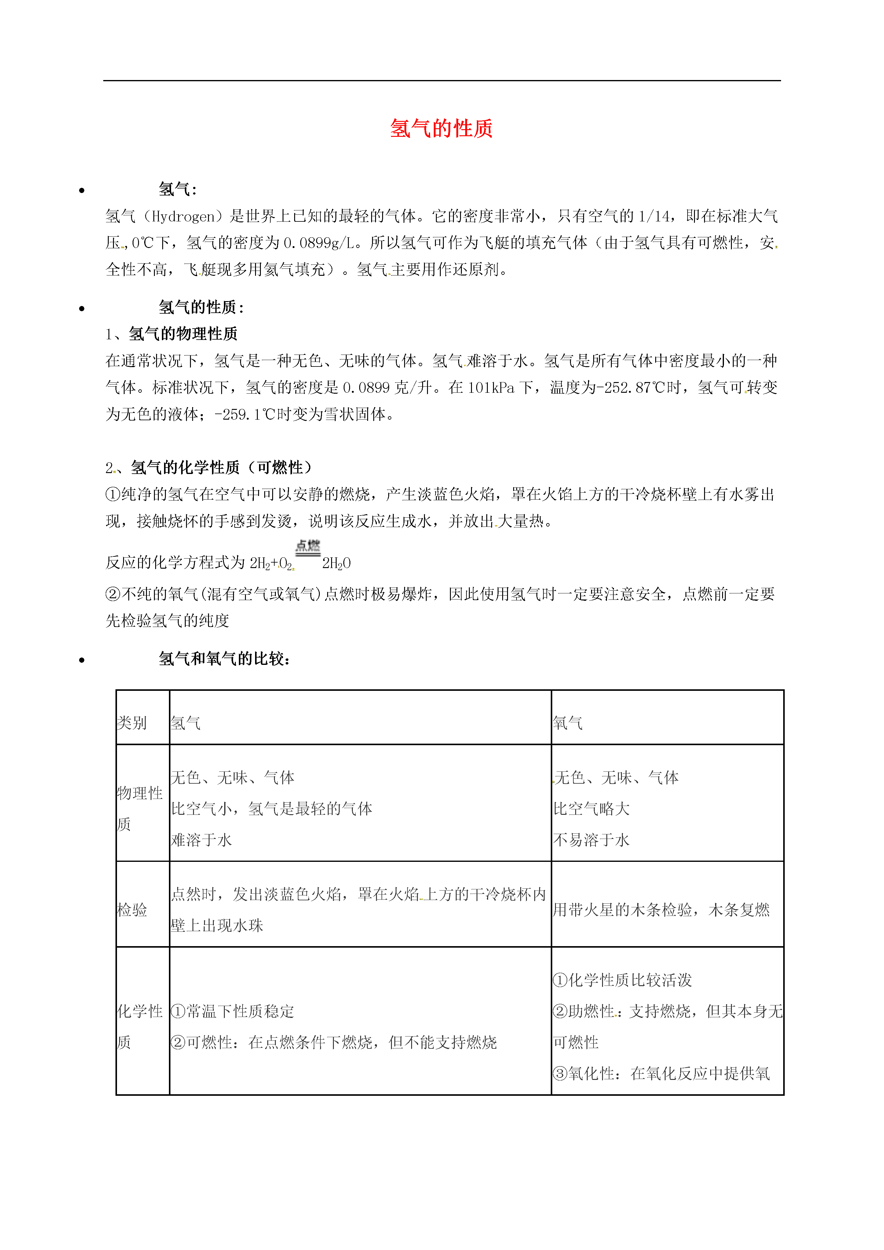 2氢气的性质氢气:氢气(Hydrogen)是世界上已知的最轻的气体。它的密度非常小,只有空气的1/14,即在标准大气压,0℃下,氢气的密度为0.0899g/L。所以氢气可作为飞艇的填充气体(由于氢气具有可燃性,安全性不高,飞艇现多用氦气填充)。氢气主要用作还原剂。氢气的性质:1、氢气的物理性质在通常状况下,氢气是一种无色、无味的气体。氢气难溶于水。氢气是所有气体中密度最小的一种气体。标准状况下,氢气的密度是0.0899克/升。在101kPa下,温度为-252.87℃时,氢气可转变为无色的液体;-259.1℃时变为雪状固体。2、氢气的化学性质(可燃性)①纯净的氢气在空气中可以安静的燃烧,产生淡蓝色火焰,罩在火馅上方的干冷烧杯壁上有水雾出现,接触烧怀的手感到发烫,说明该反应生成水,并放出大量热。反应的化学方程式为2H2+O22H2O②不纯的氧气(混有空气或氧气)点燃时极易爆炸,因此使用氢气时一定要注意安全,点燃前一定要先检验氢气的纯度氢气和氧气的比较:类别氢气氧气物理性质无色、无味、气体比空气小,氢气是最轻的气体难溶于水无色、无味、气体比空气略大不易溶于水检验点然时,发出淡蓝色火焰,罩在火焰上方的干冷烧杯内壁上出现水珠用带火星的木条检验,木条复燃化学性质①常温下性质稳定②可燃性:在点燃条件下燃烧,但不能支持燃烧①化学性质比较活泼②助燃性:支持燃烧,但其本身无可燃性③氧化性:在氧化反应中提供氧