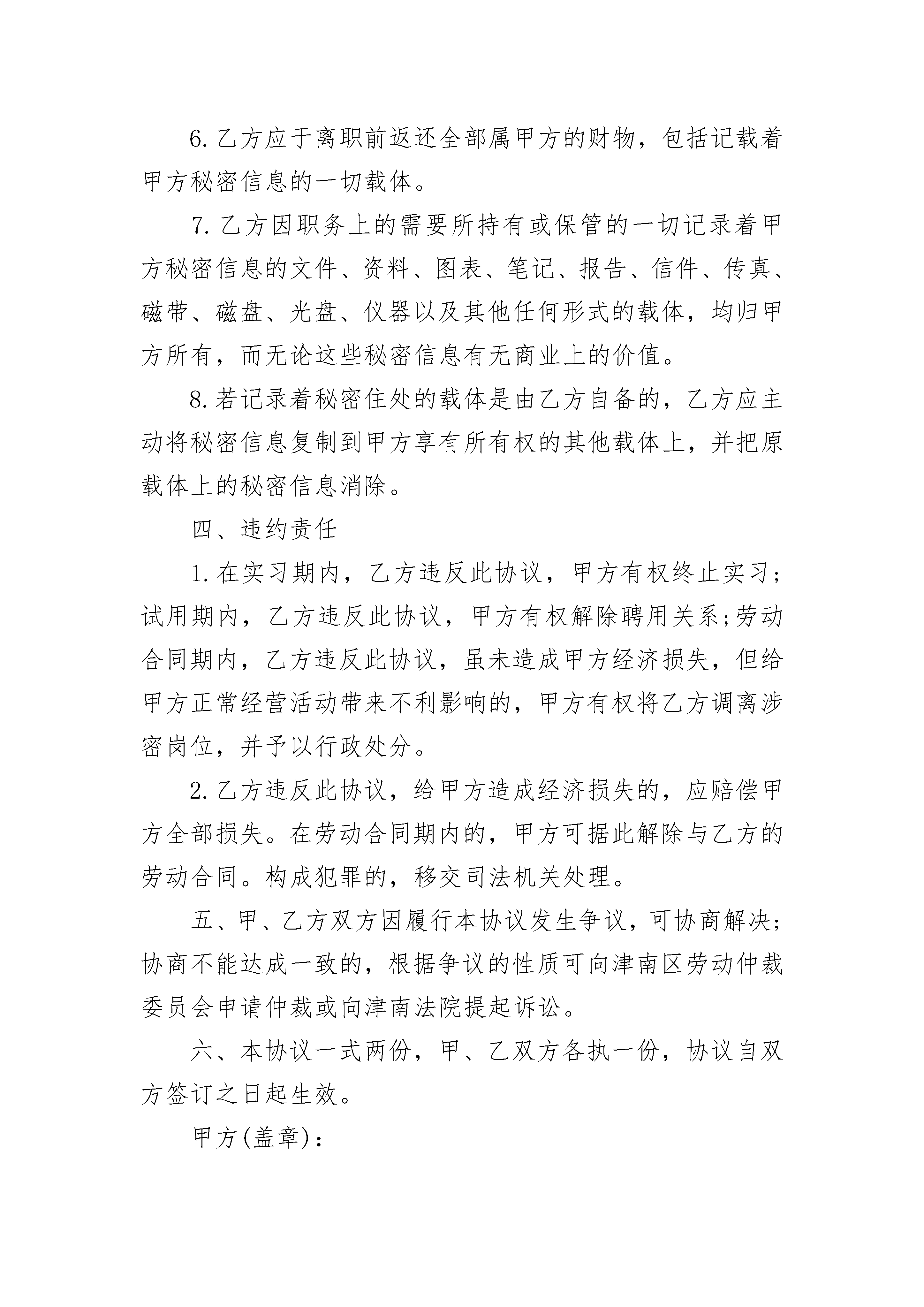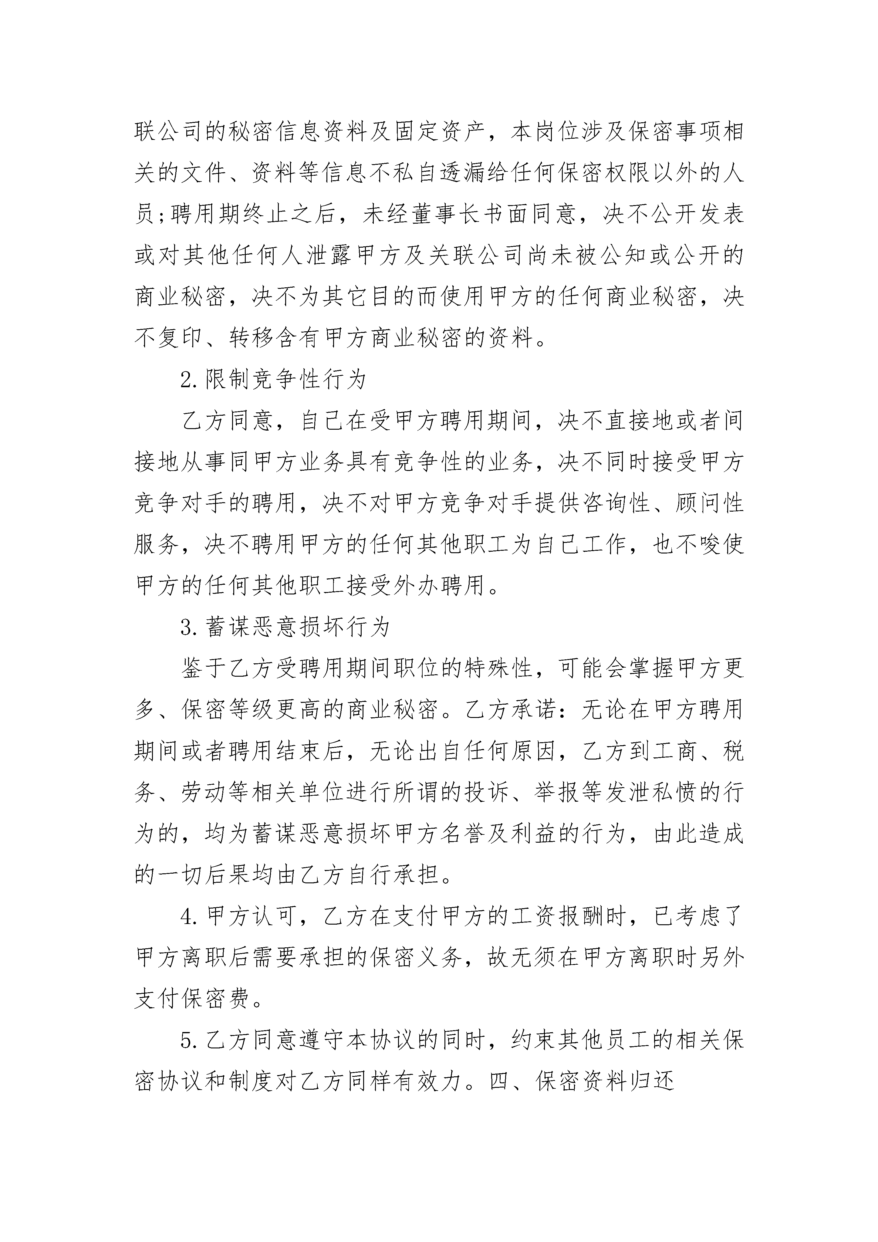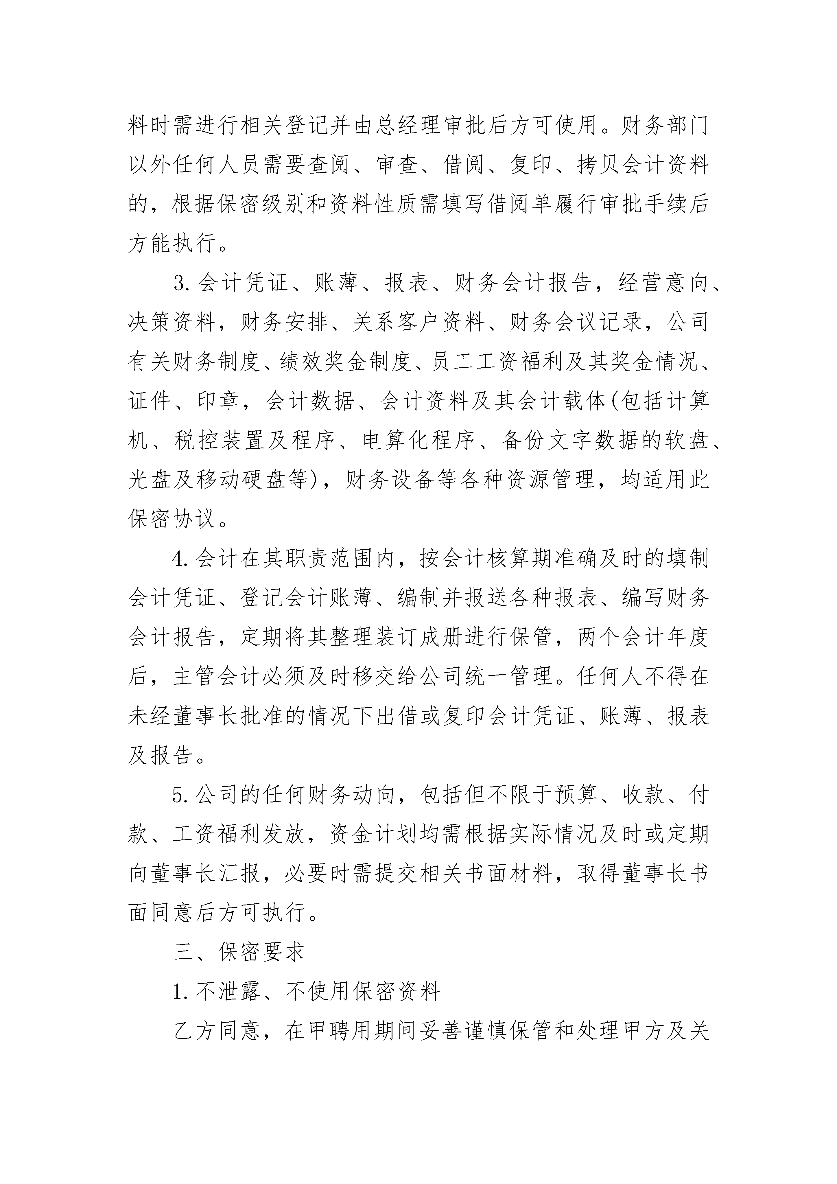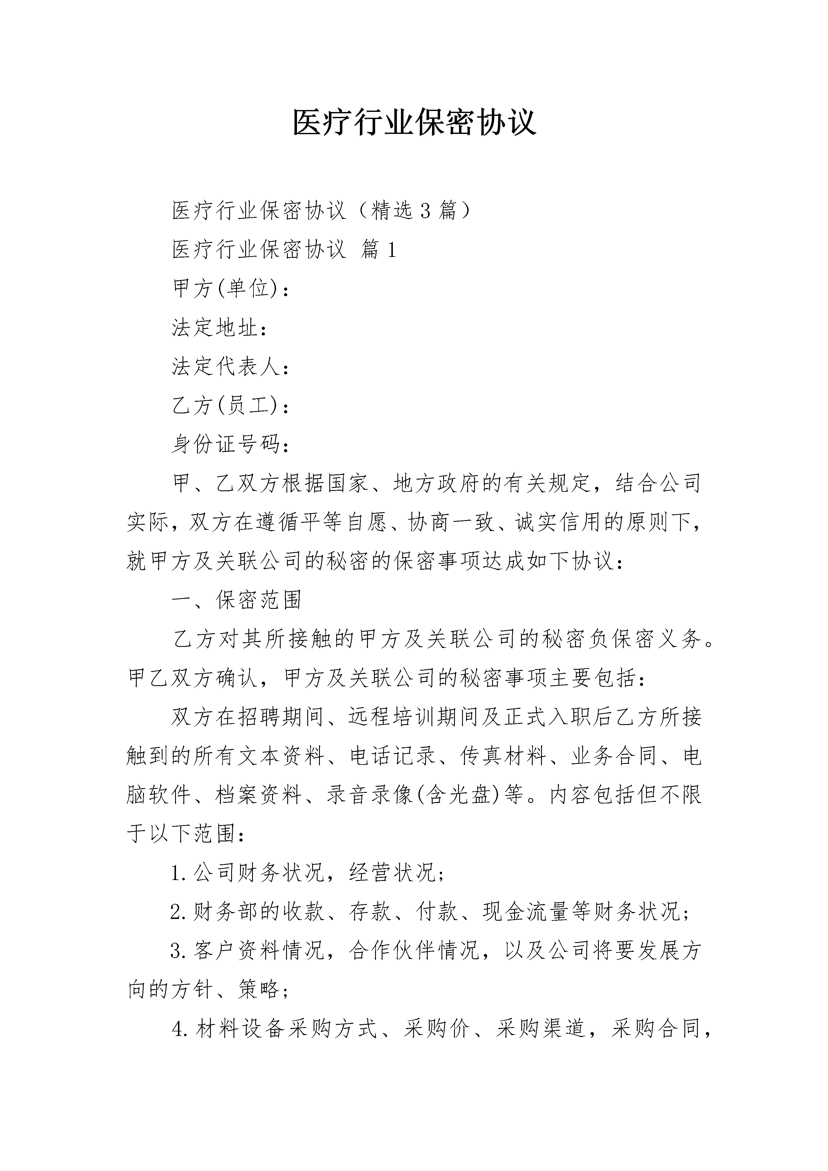医疗行业保密协议医疗行业保密协议(精选3篇)医疗行业保密协议篇1甲方(单位):法定地址:法定代表人:乙方(员工):身份证号码:甲、乙双方根据国家、地方政府的有关规定,结合公司实际,双方在遵循平等自愿、协商一致、诚实信用的原则下,就甲方及关联公司的秘密的保密事项达成如下协议:一、保密范围乙方对其所接触的甲方及关联公司的秘密负保密义务。甲乙双方确认,甲方及关联公司的秘密事项主要包括:双方在招聘期间、远程培训期间及正式入职后乙方所接触到的所有文本资料、电话记录、传真材料、业务合同、电脑软件、档案资料、录音录像(含光盘)等。内容包括但不限于以下范围:1.公司财务状况,经营状况;2.财务部的收款、存款、付款、现金流量等财务状况;3.客户资料情况,合作伙伴情况,以及公司将要发展方向的方针、策略;4.材料设备采购方式、采购价、采购渠道,采购合同,分包商资料情况;5.项目成本核算、经营成本、劳动力成本、机械成本、管理成本;6.技术、文档资料、计算机内不能公开的资料;7.合同及分包商合同、协议;8.在经营活动中的保密行为;8.招投标价格、招投标预算、招投标书;9.公司领导临时交待的保密事项;10.公司要求采取保密措施的电子文档、文本文档等材料。同时,在甲方生产和经营中,某一信息的泄露会造成下列后果之一的,也属于甲方的商业秘密范围:11.影响公司发展的事项;12.影响公司的稳定和安全的事项;13.使公司在商业竞争中处于被动或不利的事项;14.使公司经济利益受到损害的事项;15.影响公司对外交流和商业谈判顺利进行的事项;16.影响公司对外承担保密义务的事项。二、保密规范1.公司财务部门需向外部报送的会计资料必须填写报送台账(台账需明确报送日期、报送人、报送资料概况、办理事项、接收单位、接收人或部门、审批人),加盖公章后予以报出。每月5号前财务须将上月台账报董事长审阅。2.财务部门内部不符合审阅权限的人员需使用相关资料时需进行相关登记并由总经理审批后方可使用。财务部门以外任何人员需要查阅、审查、借阅、复印、拷贝会计资料的,根据保密级别和资料性质需填写借阅单履行审批手续后方能执行。3.会计凭证、账薄、报表、财务会计报告,经营意向、决策资料,财务安排、关系客户资料、财务会议记录,公司有关财务制度、绩效奖金制度、员工工资福利及其奖金情况、证件、印章,会计数据、会计资料及其会计载体(包括计算机、税控装置及程序、电算化程序、备份文字数据的软盘、光盘及移动硬盘等),财务设备等各种资源管理,均适用此保密协议。4.会计在其职责范围内,按会计核算期准确及时的填制会计凭证、登记会计账薄、编制并报送各种报表、编写财务会计报告,定期将其整理装订成册进行保管,两个会计年度后,主管会计必须及时移交给公司统一管理。任何人不得在未经董事长批准的情况下出借或复印会计凭证、账薄、报表及报告。5.公司的任何财务动向,包括但不限于预算、收款、付款、工资福利发放,资金计划均需根据实际情况及时或定期向董事长汇报,必要时需提交相关书面材料,取得董事长书面同意后方可执行。三、保密要求1.不泄露、不使用保密资料乙方同意,在甲聘用期间妥善谨慎保管和处理甲方及关联公司的秘密信息资料及固定资产,本岗位涉及保密事项相关的文件、资料等信息不私自透漏给任何保密权限以外的人员;聘用期终止之后,未经董事长书面同意,决不公开发表或对其他任何人泄露甲方及关联公司尚未被公知或公开的商业秘密,决不为其它目的而使用甲方的任何商业秘密,决不复印、转移含有甲方商业秘密的资料。2.限制竞争性行为乙方同意,自己在受甲方聘用期间,决不直接地或者间接地从事同甲方业务具有竞争性的业务,决不同时接受甲方竞争对手的聘用,决不对甲方竞争对手提供咨询性、顾问性服务,决不聘用甲方的任何其他职工为自己工作,也不唆使甲方的任何其他职工接受外办聘用。3.蓄谋恶意损坏行为鉴于乙方受聘用期间职位的特殊性,可能会掌握甲方更多、保密等级更高的商业秘密。乙方承诺:无论在甲方聘用期间或者聘用结束后,无论出自任何原因,乙方到工商、税务、劳动等相关单位进行所谓的投诉、举报等发泄私愤的行为的,均为蓄谋恶意损坏甲方名誉及利益的行为,由此造成的一切后果均由乙方自行承担。4.甲方认可,乙方在支付甲方的工资报酬时,已考虑了甲方离职后需要承担的保密义务,故无须在甲方离职时另外支付保密费。5.乙方同意遵守本协议的同时,约束其他员工的相关保密协议和制度对乙方同样有效力。四、保密资料归还6.乙方应于离职前返还全部属甲方的财物,包括记载着甲方秘密信息的一切载体。7.乙方因职务上的需要所持有或保管的一切记录着甲方秘密信息的文件、资料、图表、笔记、报告、信件、传真、磁带、磁盘、光盘、仪器以及其他任何形式的载体,均归甲方所有,而无论这些秘密信息有无商业上的价值。8.若记录着秘密住处的载体是由