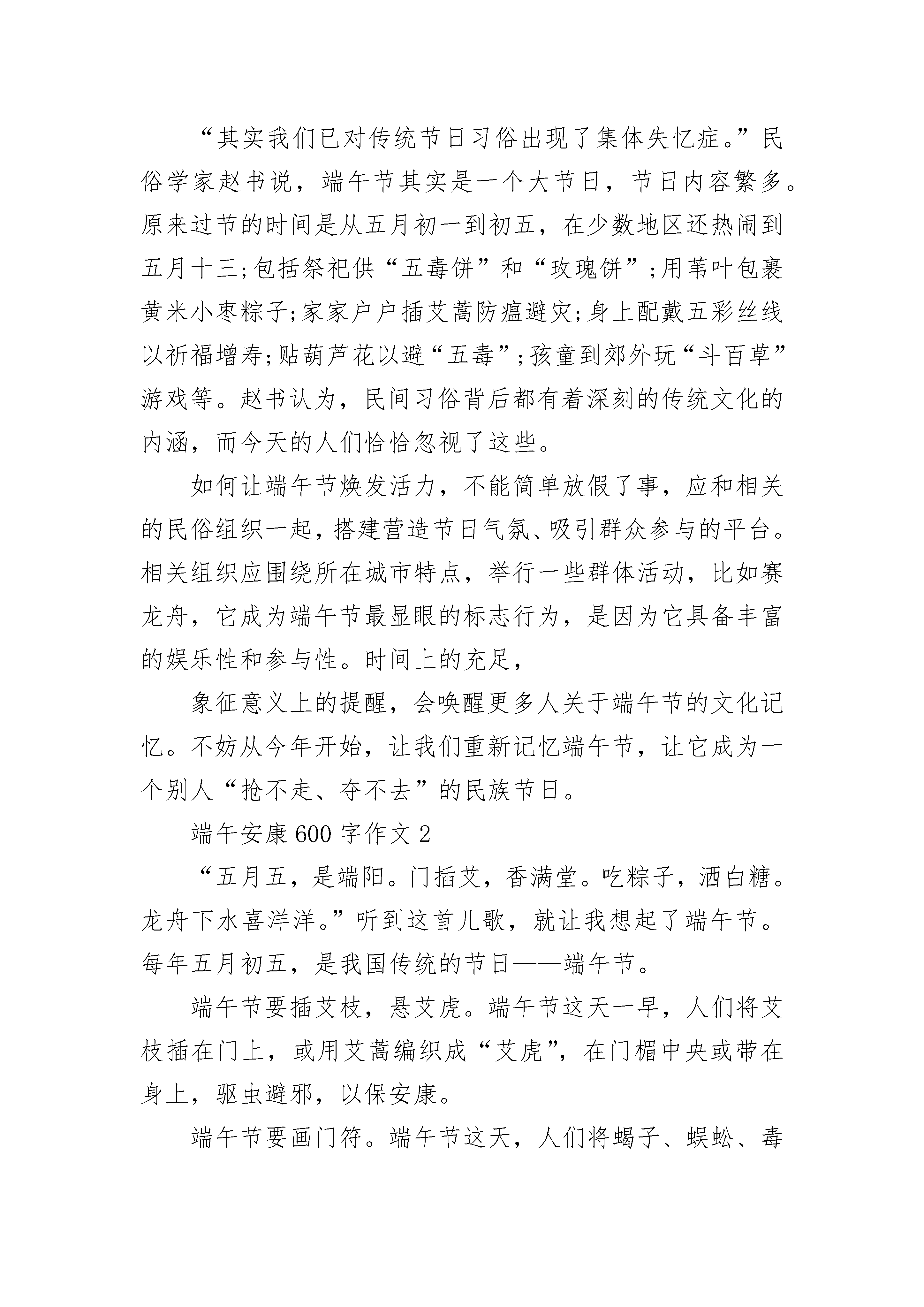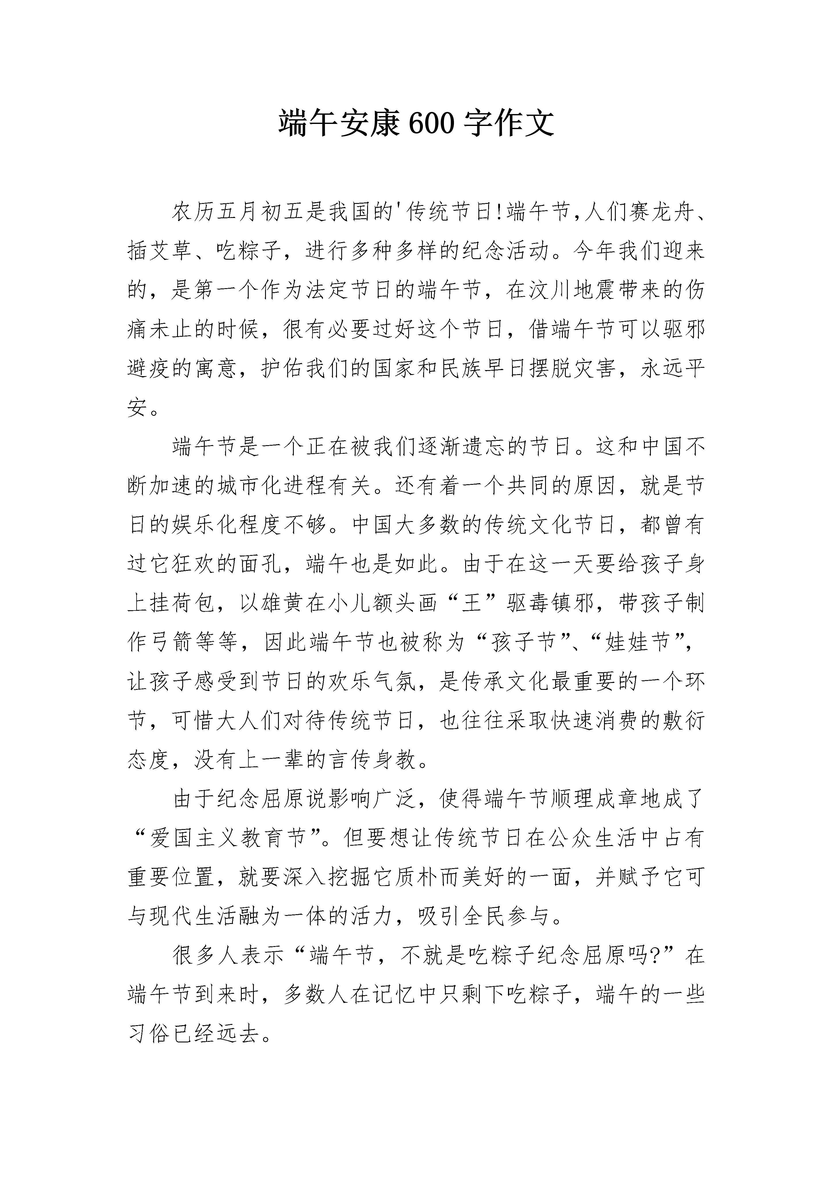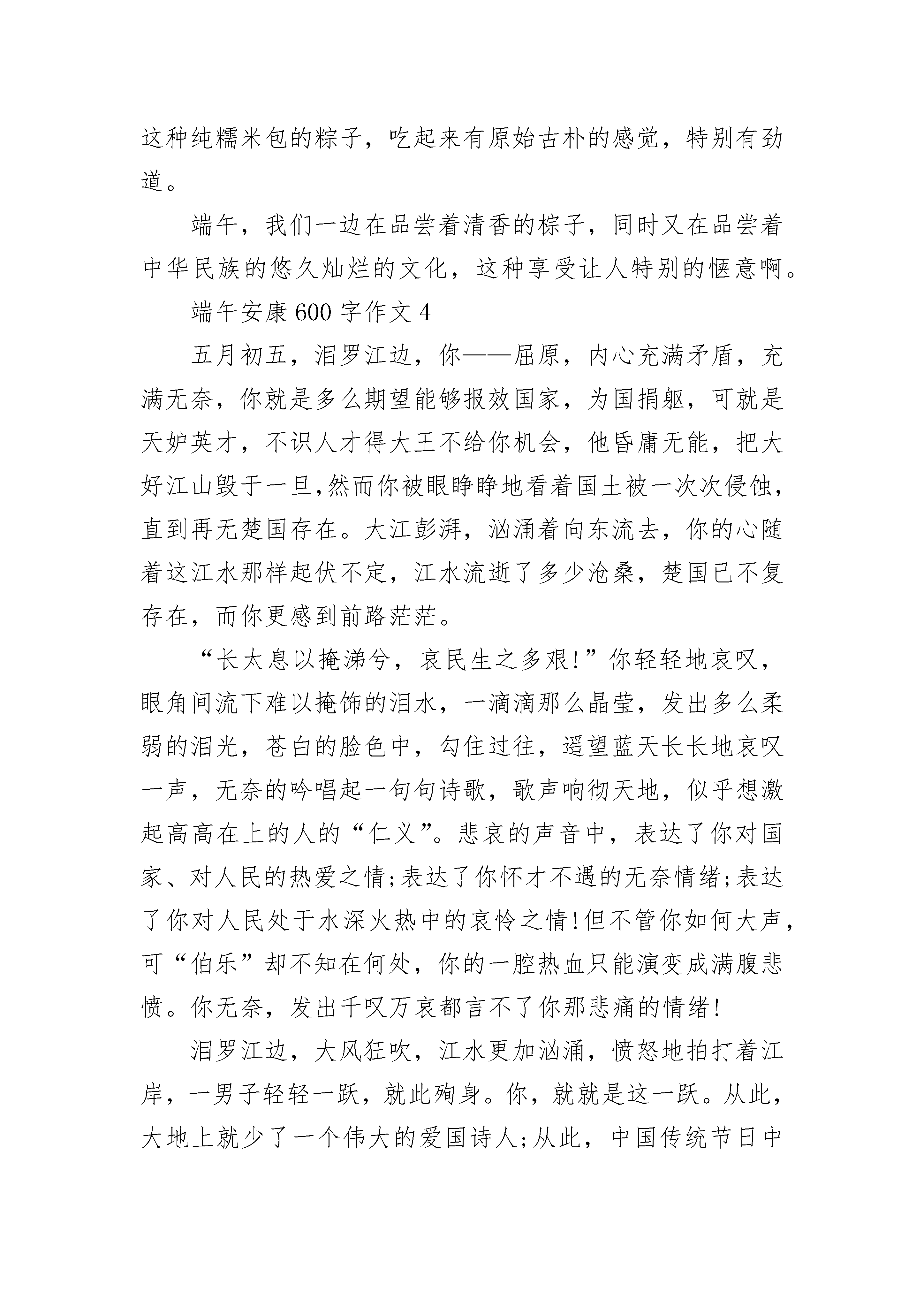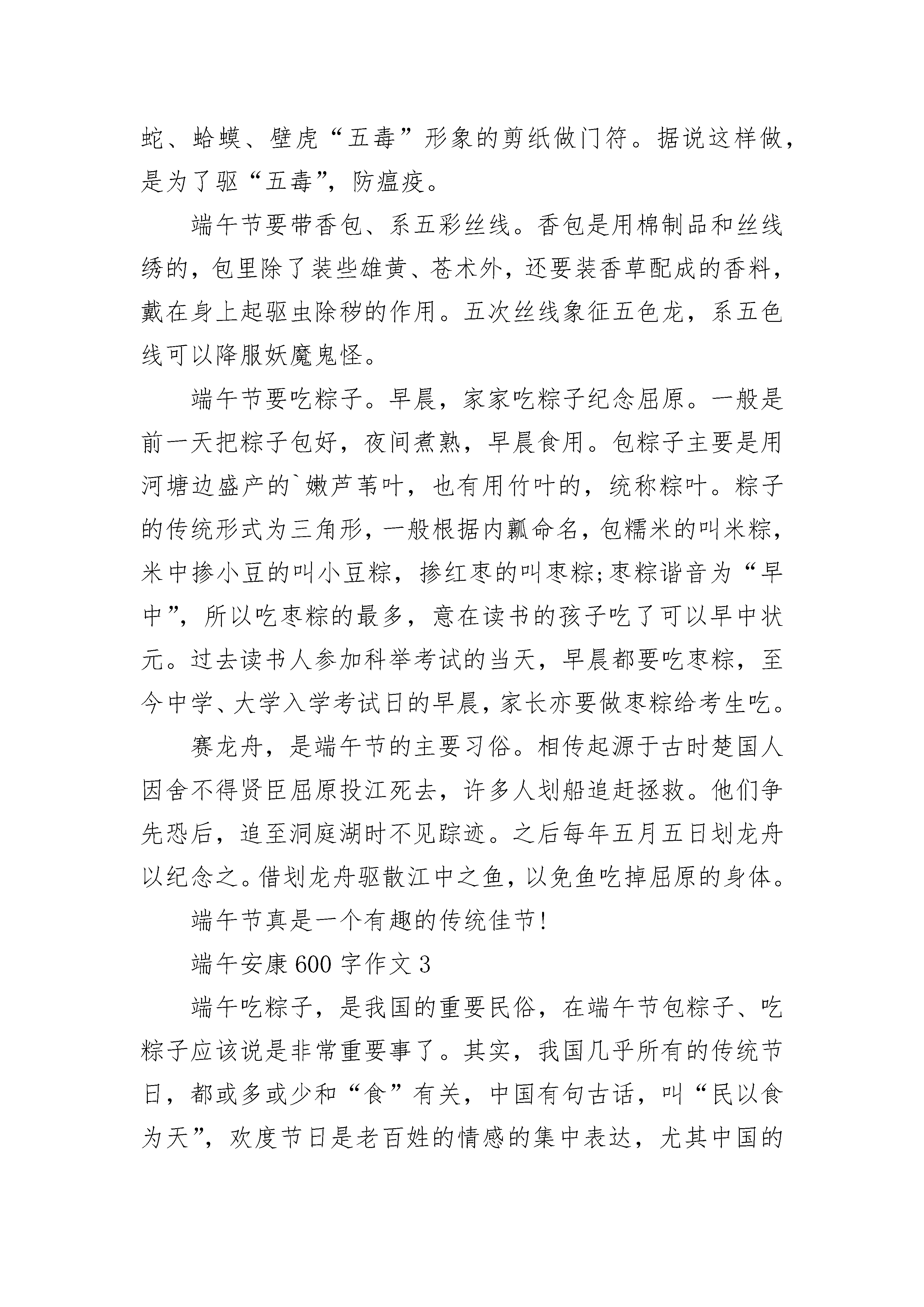 端午安康600字作文农历五月初五是我国的'传统节日!端午节,人们赛龙舟、插艾草、吃粽子,进行多种多样的纪念活动。今年我们迎来的,是第一个作为法定节日的端午节,在汶川地震带来的伤痛未止的时候,很有必要过好这个节日,借端午节可以驱邪避疫的寓意,护佑我们的国家和民族早日摆脱灾害,永远平安。端午节是一个正在被我们逐渐遗忘的节日。这和中国不断加速的城市化进程有关。还有着一个共同的原因,就是节日的娱乐化程度不够。中国大多数的传统文化节日,都曾有过它狂欢的面孔,端午也是如此。由于在这一天要给孩子身上挂荷包,以雄黄在小儿额头画“王”驱毒镇邪,带孩子制作弓箭等等,因此端午节也被称为“孩子节”、“娃娃节”,让孩子感受到节日的欢乐气氛,是传承文化最重要的一个环节,可惜大人们对待传统节日,也往往采取快速消费的敷衍态度,没有上一辈的言传身教。由于纪念屈原说影响广泛,使得端午节顺理成章地成了“爱国主义教育节”。但要想让传统节日在公众生活中占有重要位置,就要深入挖掘它质朴而美好的一面,并赋予它可与现代生活融为一体的活力,吸引全民参与。很多人表示“端午节,不就是吃粽子纪念屈原吗?”在端午节到来时,多数人在记忆中只剩下吃粽子,端午的一些习俗已经远去。“其实我们已对传统节日习俗出现了集体失忆症。”民俗学家赵书说,端午节其实是一个大节日,节日内容繁多。原来过节的时间是从五月初一到初五,在少数地区还热闹到五月十三;包括祭祀供“五毒饼”和“玫瑰饼”;用苇叶包裹黄米小枣粽子;家家户户插艾蒿防瘟避灾;身上配戴五彩丝线以祈福增寿;贴葫芦花以避“五毒”;孩童到郊外玩“斗百草”游戏等。赵书认为,民间习俗背后都有着深刻的传统文化的内涵,而今天的人们恰恰忽视了这些。如何让端午节焕发活力,不能简单放假了事,应和相关的民俗组织一起,搭建营造节日气氛、吸引群众参与的平台。相关组织应围绕所在城市特点,举行一些群体活动,比如赛龙舟,它成为端午节最显眼的标志行为,是因为它具备丰富的娱乐性和参与性。时间上的充足,象征意义上的提醒,会唤醒更多人关于端午节的文化记忆。不妨从今年开始,让我们重新记忆端午节,让它成为一个别人“抢不走、夺不去”的民族节日。端午安康600字作文2“五月五,是端阳。门插艾,香满堂。吃粽子,洒白糖。龙舟下水喜洋洋。”听到这首儿歌,就让我想起了端午节。每年五月初五,是我国传统的节日——端午节。端午节要插艾枝,悬艾虎。端午节这天一早,人们将艾枝插在门上,或用艾蒿编织成“艾虎”,在门楣中央或带在身上,驱虫避邪,以保安康。端午节要画门符。端午节这天,人们将蝎子、蜈蚣、毒蛇、蛤蟆、壁虎“五毒”形象的剪纸做门符。据说这样做,是为了驱“五毒”,防瘟疫。端午节要带香包、系五彩丝线。香包是用棉制品和丝线绣的,包里除了装些雄黄、苍术外,还要装香草配成的香料,戴在身上起驱虫除秽的作用。五次丝线象征五色龙,系五色线可以降服妖魔鬼怪。端午节要吃粽子。早晨,家家吃粽子纪念屈原。一般是前一天把粽子包好,夜间煮熟,早晨食用。包粽子主要是用河塘边盛产的`嫩芦苇叶,也有用竹叶的,统称粽叶。粽子的传统形式为三角形,一般根据内瓤命名,包糯米的叫米粽,米中掺小豆的叫小豆粽,掺红枣的叫枣粽;枣粽谐音为“早中”,所以吃枣粽的最多,意在读书的孩子吃了可以早中状元。过去读书人参加科举考试的当天,早晨都要吃枣粽,至今中学、大学入学考试日的早晨,家长亦要做枣粽给考生吃。赛龙舟,是端午节的主要习俗。相传起源于古时楚国人因舍不得贤臣屈原投江死去,许多人划船追赶拯救。他们争先恐后,追至洞庭湖时不见踪迹。之后每年五月五日划龙舟以纪念之。借划龙舟驱散江中之鱼,以免鱼吃掉屈原的身体。端午节真是一个有趣的传统佳节!端午安康600字作文3端午吃粽子,是我国的重要民俗,在端午节包粽子、吃粽子应该说是非常重要事了。其实,我国几乎所有的传统节日,都或多或少和“食”有关,中国有句古话,叫“民以食为天”,欢度节日是老百姓的情感的集中表达,尤其中国的节日,浓浓的文化中与“食文化”紧密地联系在一起。每一种传统节日都有它特定的“食物”,可以说,吃什么“食物”就能知道在过什么个节日;如中秋吃月饼,元宵节包饺子,过年做年糕等等。最普遍的最浓烈的最有人情味的,应该是包粽子、吃粽子了吧,因为粽子家家都要包的,所以每当端午节来临的`前两天,去割“胶股”妇女,可谓是浩浩荡荡。“胶股”叶割回来之后,修刺、水浸清洗,再煲熟叶子!然后就淘糯米、泡绿豆等,接着就利用休闲的时间来包粽子了;一般包粽子都是妇女的活,因为女性心灵手巧,包出来的棕子也是精巧好看,当然小孩子就不分男女了,由于好奇,也来凑热闹,不过,也因碍事,常常被大人们笑着赶走了。女性们常常把对生活的爱、对家人的爱全都包进粽子里,所以吃粽子,其实在享受浓浓的亲情和爱。现在人们的生活节奏加快了,不仅在城市,就是在农村,家家