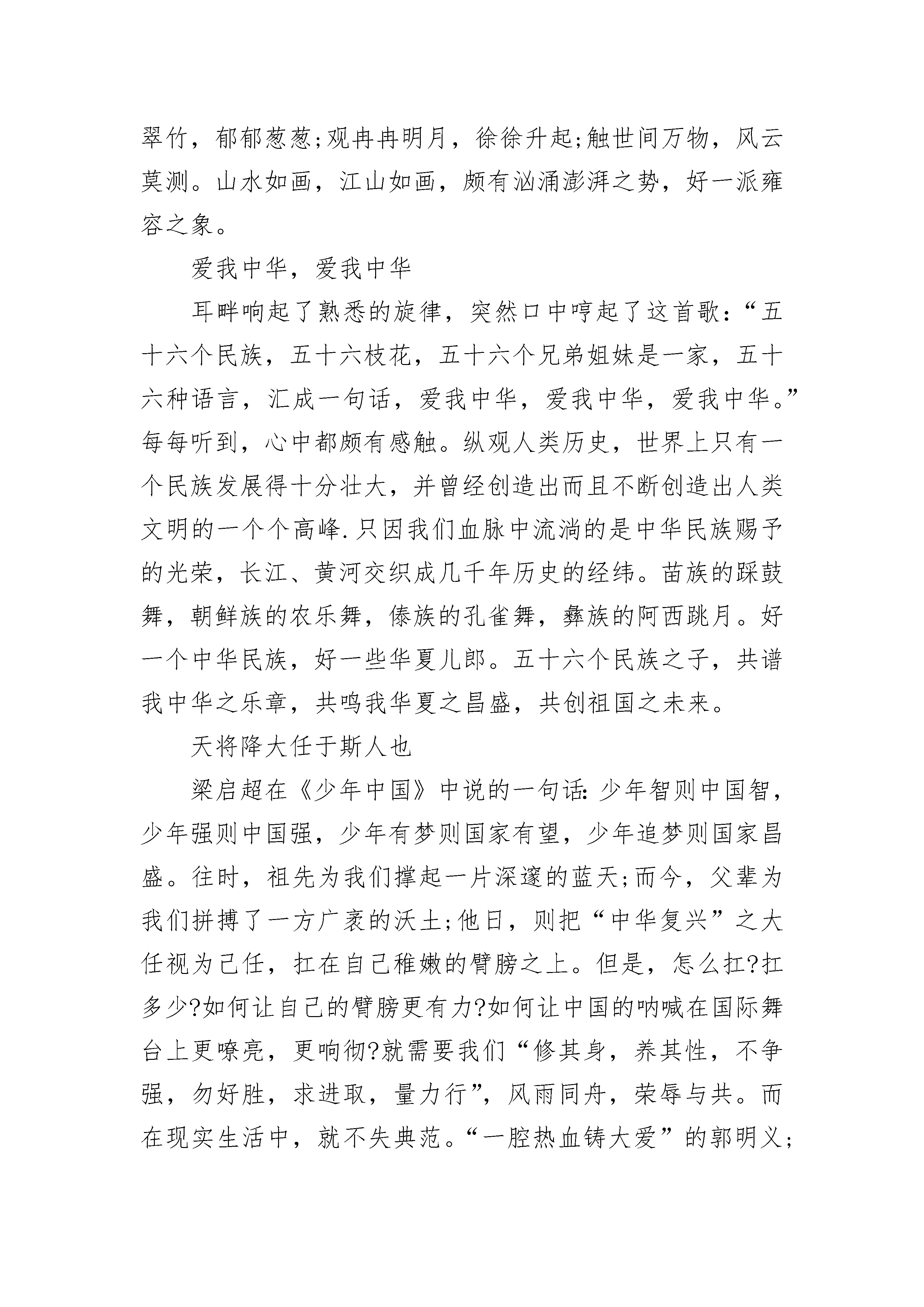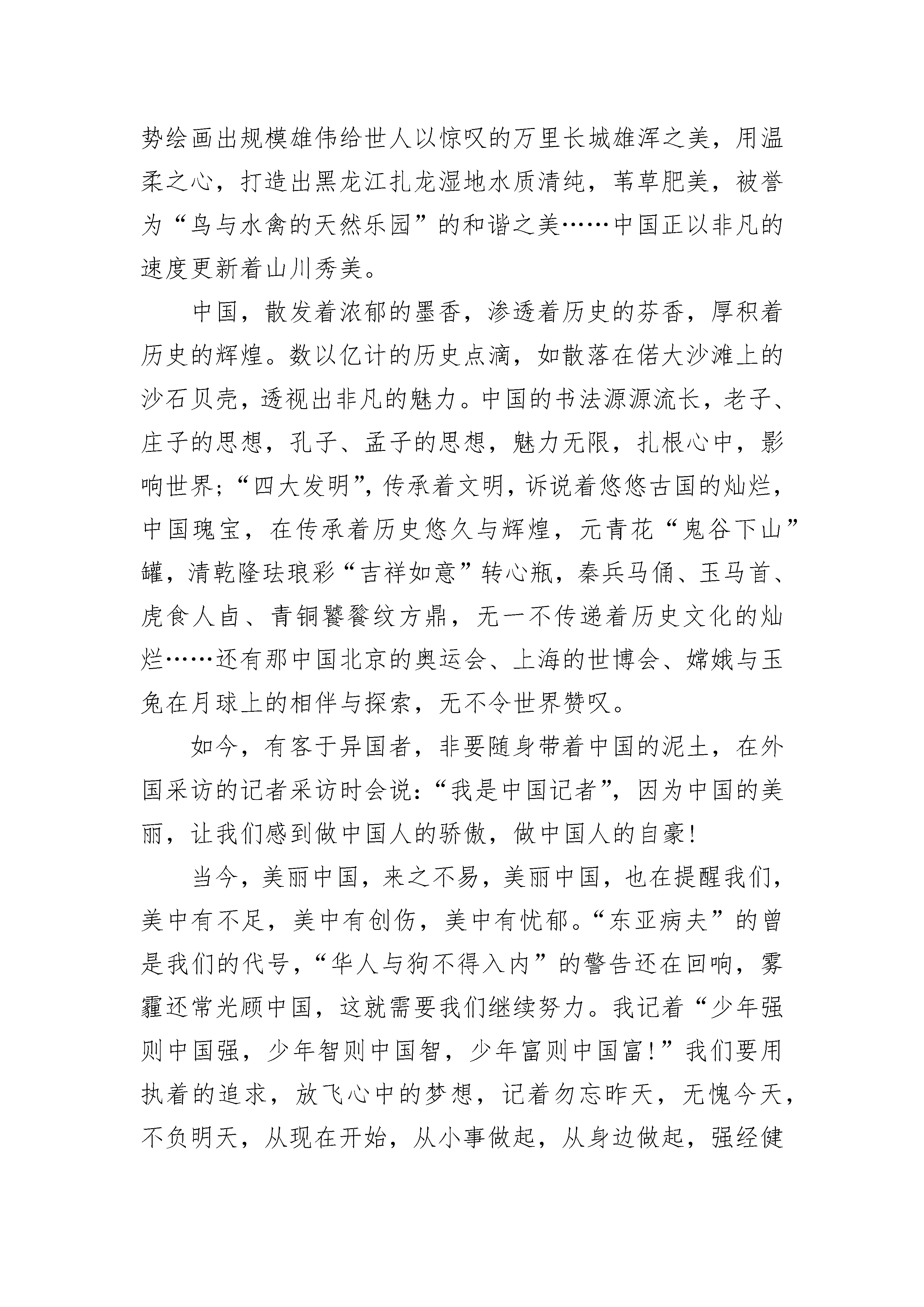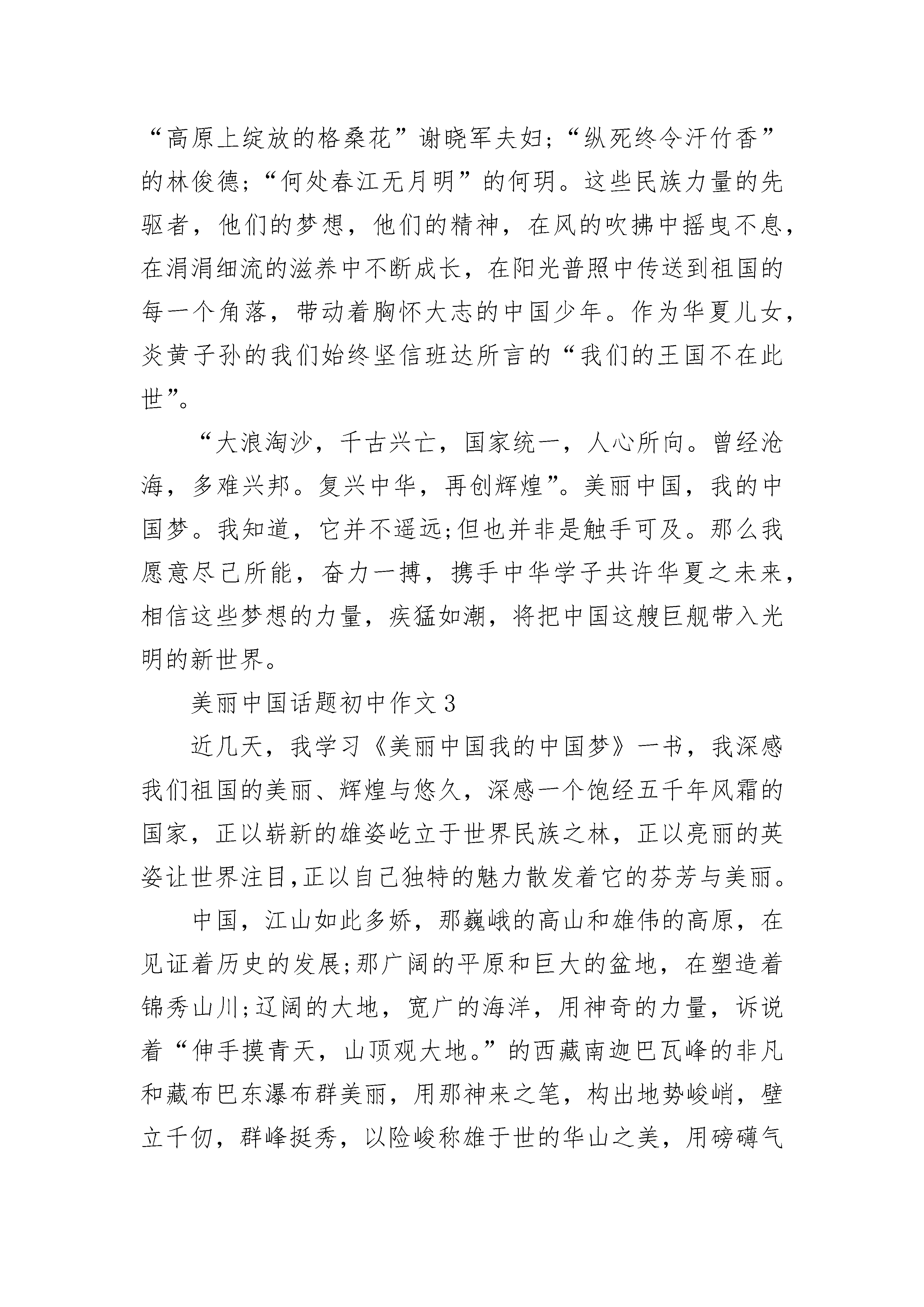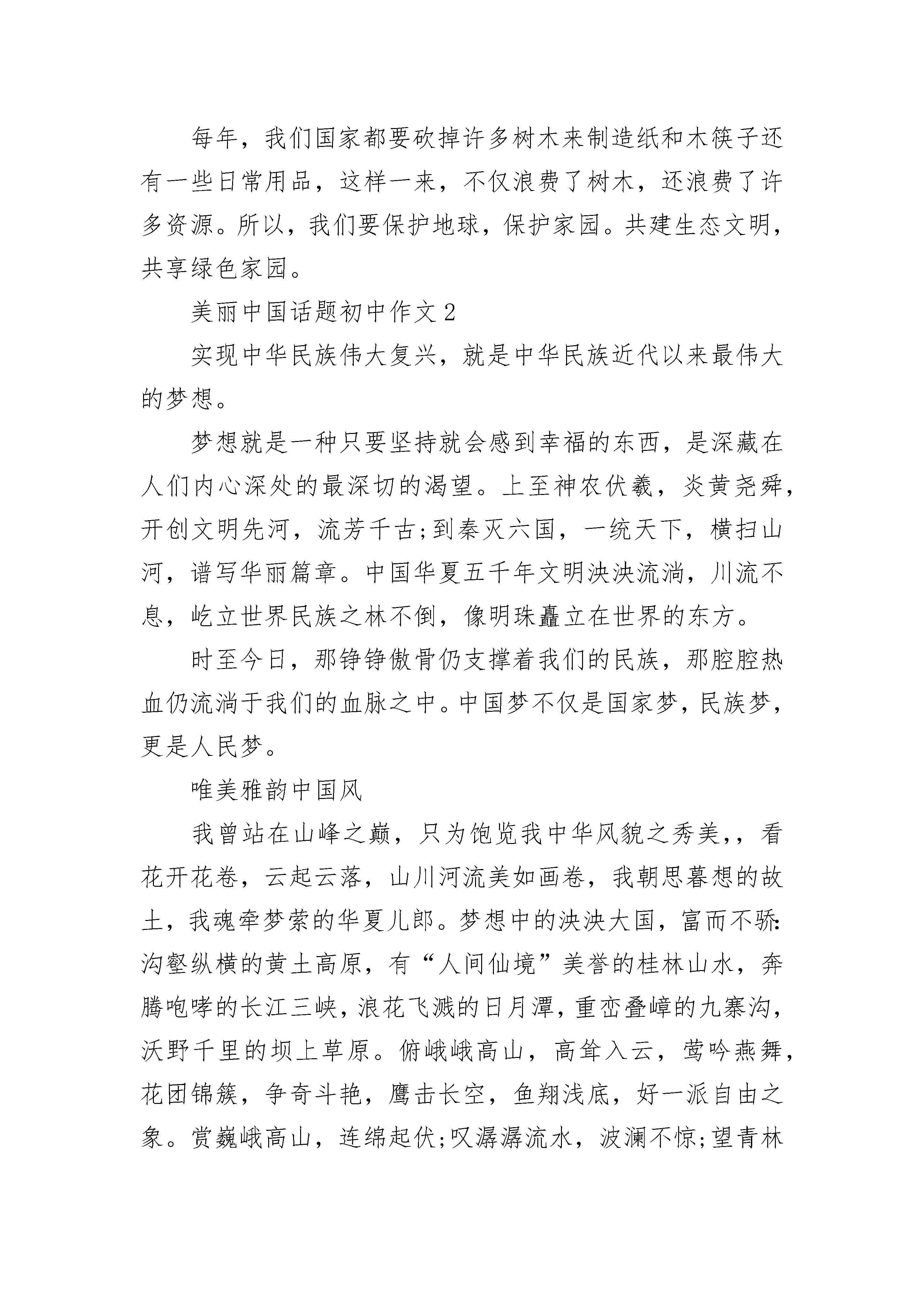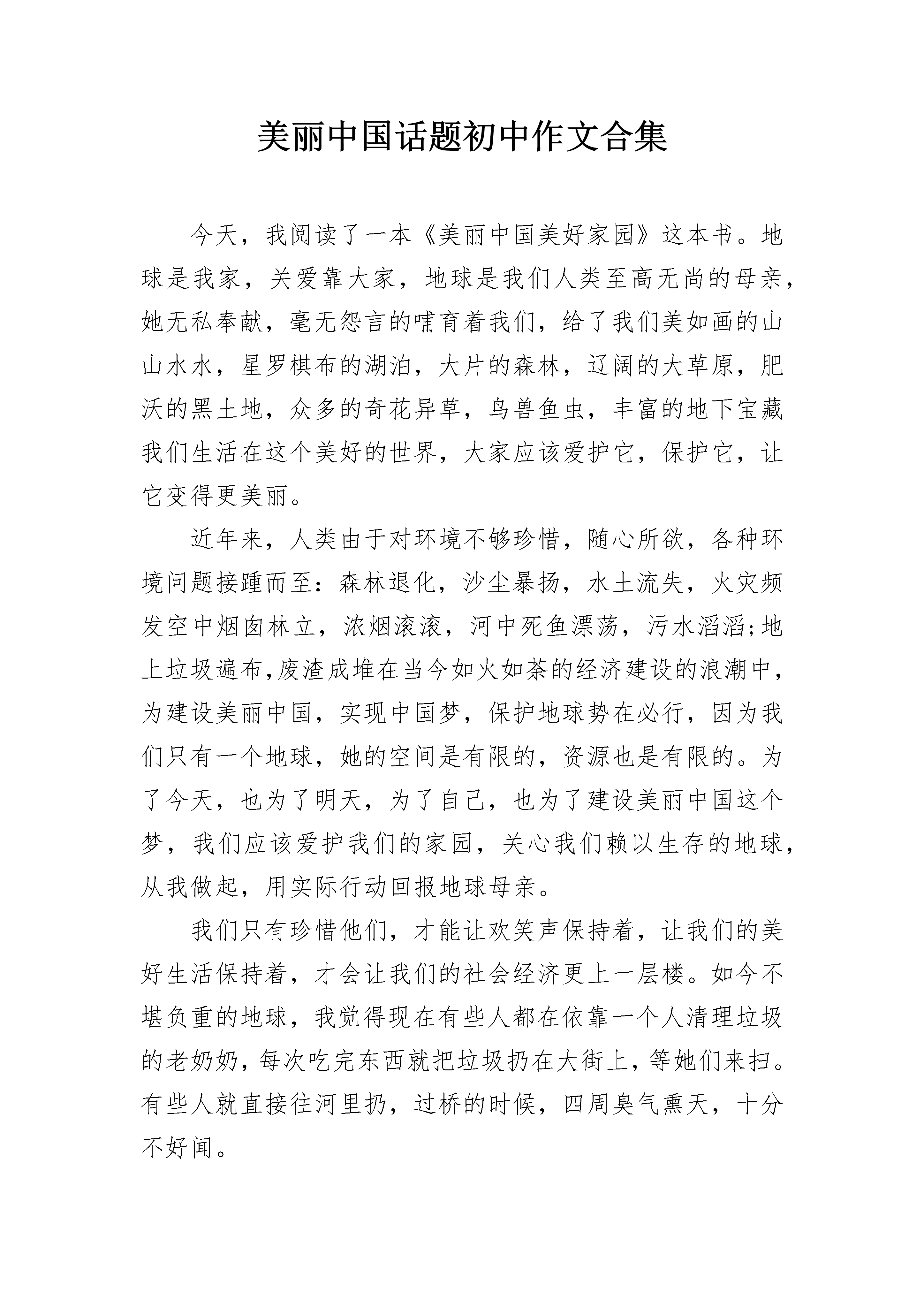 美丽中国话题初中作文合集今天,我阅读了一本《美丽中国美好家园》这本书。地球是我家,关爱靠大家,地球是我们人类至高无尚的母亲,她无私奉献,毫无怨言的哺育着我们,给了我们美如画的山山水水,星罗棋布的湖泊,大片的森林,辽阔的大草原,肥沃的黑土地,众多的奇花异草,鸟兽鱼虫,丰富的地下宝藏我们生活在这个美好的世界,大家应该爱护它,保护它,让它变得更美丽。近年来,人类由于对环境不够珍惜,随心所欲,各种环境问题接踵而至:森林退化,沙尘暴扬,水土流失,火灾频发空中烟囱林立,浓烟滚滚,河中死鱼漂荡,污水滔滔;地上垃圾遍布,废渣成堆在当今如火如荼的经济建设的浪潮中,为建设美丽中国,实现中国梦,保护地球势在必行,因为我们只有一个地球,她的空间是有限的,资源也是有限的。为了今天,也为了明天,为了自己,也为了建设美丽中国这个梦,我们应该爱护我们的家园,关心我们赖以生存的地球,从我做起,用实际行动回报地球母亲。我们只有珍惜他们,才能让欢笑声保持着,让我们的美好生活保持着,才会让我们的社会经济更上一层楼。如今不堪负重的地球,我觉得现在有些人都在依靠一个人清理垃圾的老奶奶,每次吃完东西就把垃圾扔在大街上,等她们来扫。有些人就直接往河里扔,过桥的时候,四周臭气熏天,十分不好闻。每年,我们国家都要砍掉许多树木来制造纸和木筷子还有一些日常用品,这样一来,不仅浪费了树木,还浪费了许多资源。所以,我们要保护地球,保护家园。共建生态文明,共享绿色家园。美丽中国话题初中作文2实现中华民族伟大复兴,就是中华民族近代以来最伟大的梦想。梦想就是一种只要坚持就会感到幸福的东西,是深藏在人们内心深处的最深切的渴望。上至神农伏羲,炎黄尧舜,开创文明先河,流芳千古;到秦灭六国,一统天下,横扫山河,谱写华丽篇章。中国华夏五千年文明泱泱流淌,川流不息,屹立世界民族之林不倒,像明珠矗立在世界的东方。时至今日,那铮铮傲骨仍支撑着我们的民族,那腔腔热血仍流淌于我们的血脉之中。中国梦不仅是国家梦,民族梦,更是人民梦。唯美雅韵中国风我曾站在山峰之巅,只为饱览我中华风貌之秀美,,看花开花卷,云起云落,山川河流美如画卷,我朝思暮想的故土,我魂牵梦萦的华夏儿郎。梦想中的泱泱大国,富而不骄:沟壑纵横的黄土高原,有“人间仙境”美誉的桂林山水,奔腾咆哮的长江三峡,浪花飞溅的日月潭,重峦叠嶂的九寨沟,沃野千里的坝上草原。俯峨峨高山,高耸入云,莺吟燕舞,花团锦簇,争奇斗艳,鹰击长空,鱼翔浅底,好一派自由之象。赏巍峨高山,连绵起伏;叹潺潺流水,波澜不惊;望青林翠竹,郁郁葱葱;观冉冉明月,徐徐升起;触世间万物,风云莫测。山水如画,江山如画,颇有汹涌澎湃之势,好一派雍容之象。爱我中华,爱我中华耳畔响起了熟悉的旋律,突然口中哼起了这首歌:“五十六个民族,五十六枝花,五十六个兄弟姐妹是一家,五十六种语言,汇成一句话,爱我中华,爱我中华,爱我中华。”每每听到,心中都颇有感触。纵观人类历史,世界上只有一个民族发展得十分壮大,并曾经创造出而且不断创造出人类文明的一个个高峰.只因我们血脉中流淌的是中华民族赐予的光荣,长江、黄河交织成几千年历史的经纬。苗族的踩鼓舞,朝鲜族的农乐舞,傣族的孔雀舞,彝族的阿西跳月。好一个中华民族,好一些华夏儿郎。五十六个民族之子,共谱我中华之乐章,共鸣我华夏之昌盛,共创祖国之未来。天将降大任于斯人也梁启超在《少年中国》中说的一句话:少年智则中国智,少年强则中国强,少年有梦则国家有望,少年追梦则国家昌盛。往时,祖先为我们撑起一片深邃的蓝天;而今,父辈为我们拼搏了一方广袤的沃土;他日,则把“中华复兴”之大任视为己任,扛在自己稚嫩的臂膀之上。但是,怎么扛?扛多少?如何让自己的臂膀更有力?如何让中国的呐喊在国际舞台上更嘹亮,更响彻?就需要我们“修其身,养其性,不争强,勿好胜,求进取,量力行”,风雨同舟,荣辱与共。而在现实生活中,就不失典范。“一腔热血铸大爱”的郭明义;“高原上绽放的格桑花”谢晓军夫妇;“纵死终令汗竹香”的林俊德;“何处春江无月明”的何玥。这些民族力量的先驱者,他们的梦想,他们的精神,在风的吹拂中摇曳不息,在涓涓细流的滋养中不断成长,在阳光普照中传送到祖国的每一个角落,带动着胸怀大志的中国少年。作为华夏儿女,炎黄子孙的我们始终坚信班达所言的“我们的王国不在此世”。“大浪淘沙,千古兴亡,国家统一,人心所向。曾经沧海,多难兴邦。复兴中华,再创辉煌”。美丽中国,我的中国梦。我知道,它并不遥远;但也并非是触手可及。那么我愿意尽己所能,奋力一搏,携手中华学子共许华夏之未来,相信这些梦想的力量,疾猛如潮,将把中国这艘巨舰带入光明的新世界。美丽中国话题初中作文3近几天,我学习《美丽中国我的中国梦》一书,我深感我们祖国的美丽、辉煌与悠久,深感一个饱经五千年风霜的国家,正以崭新的雄姿屹立于世界民族之林,正以亮丽的