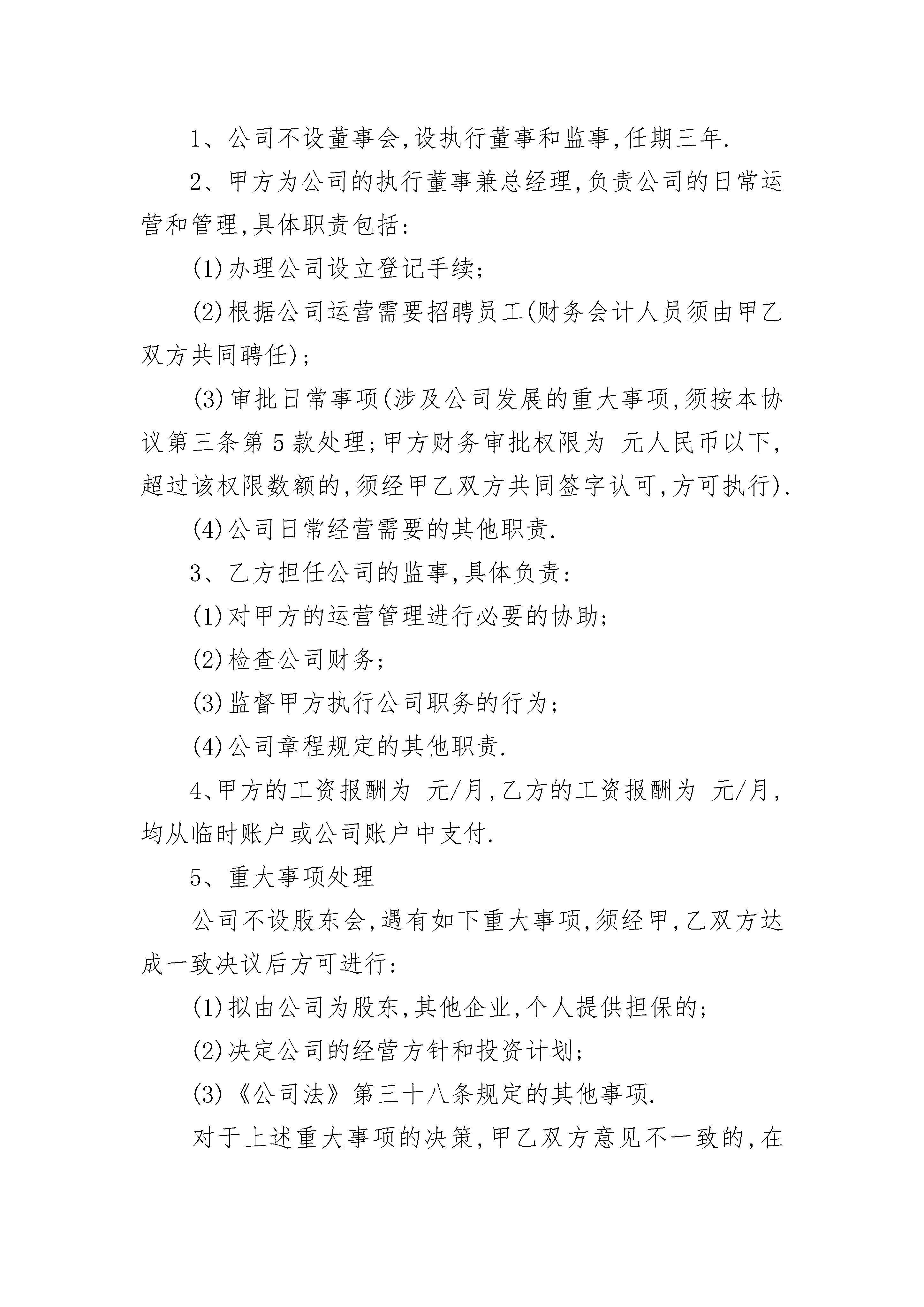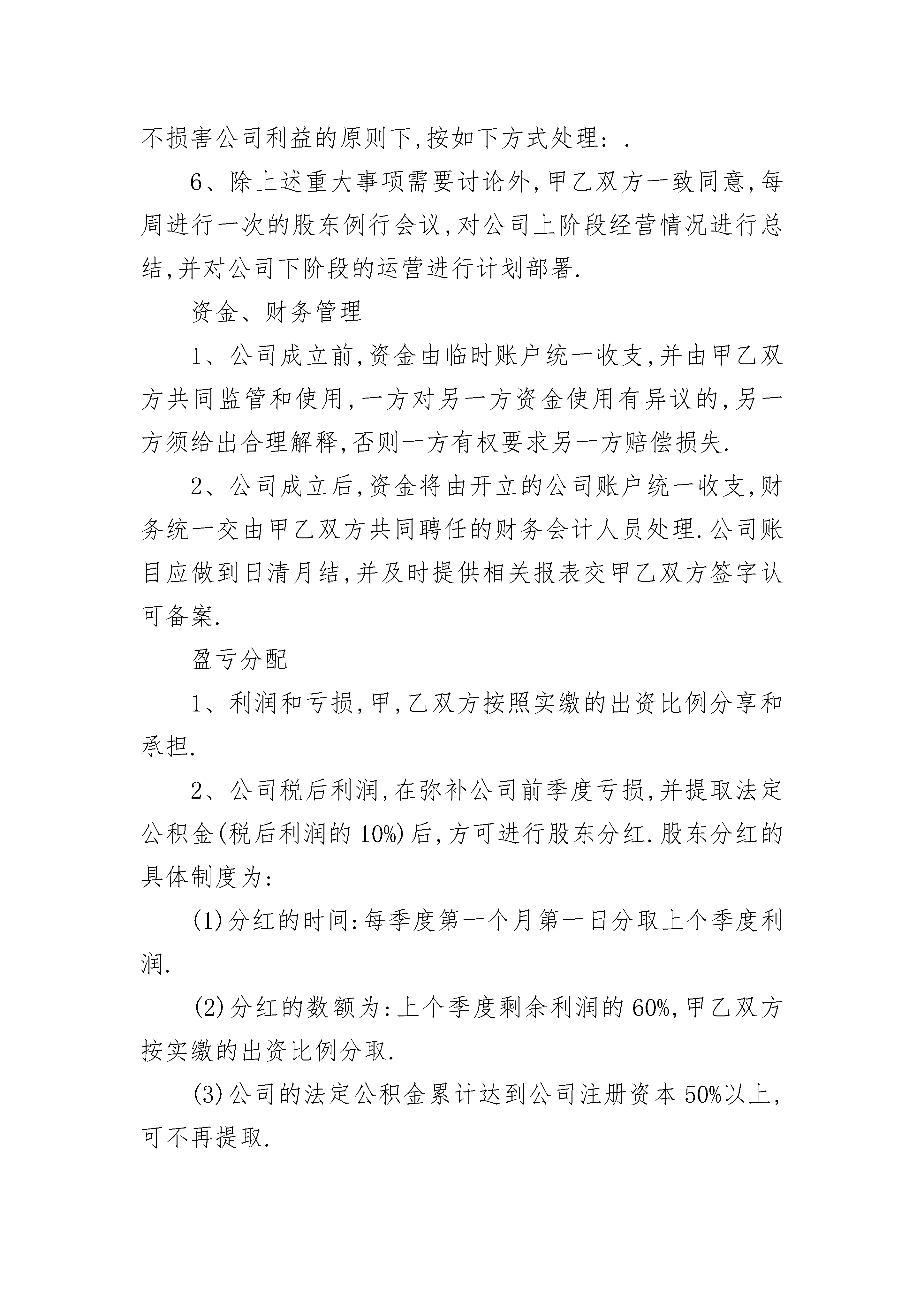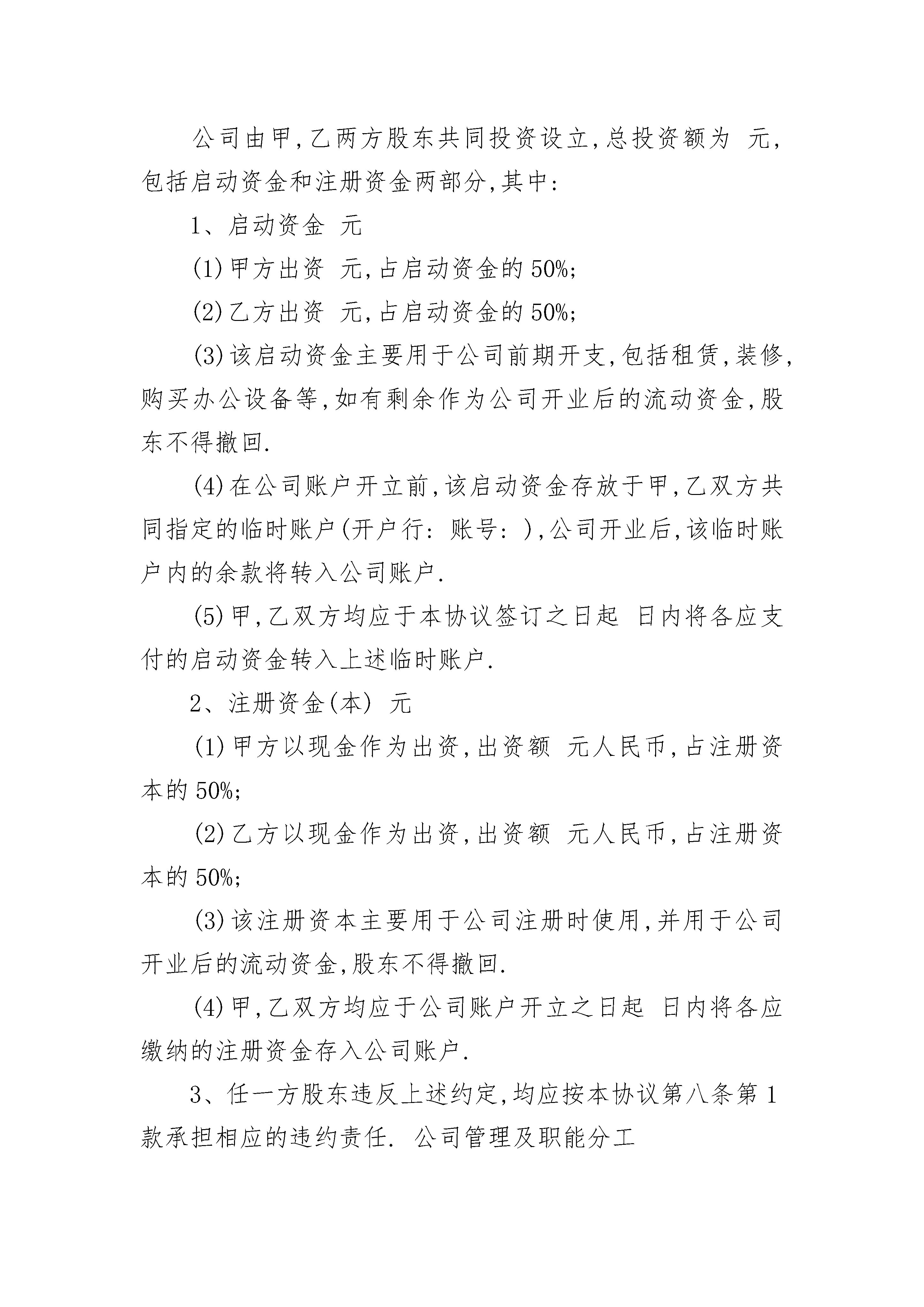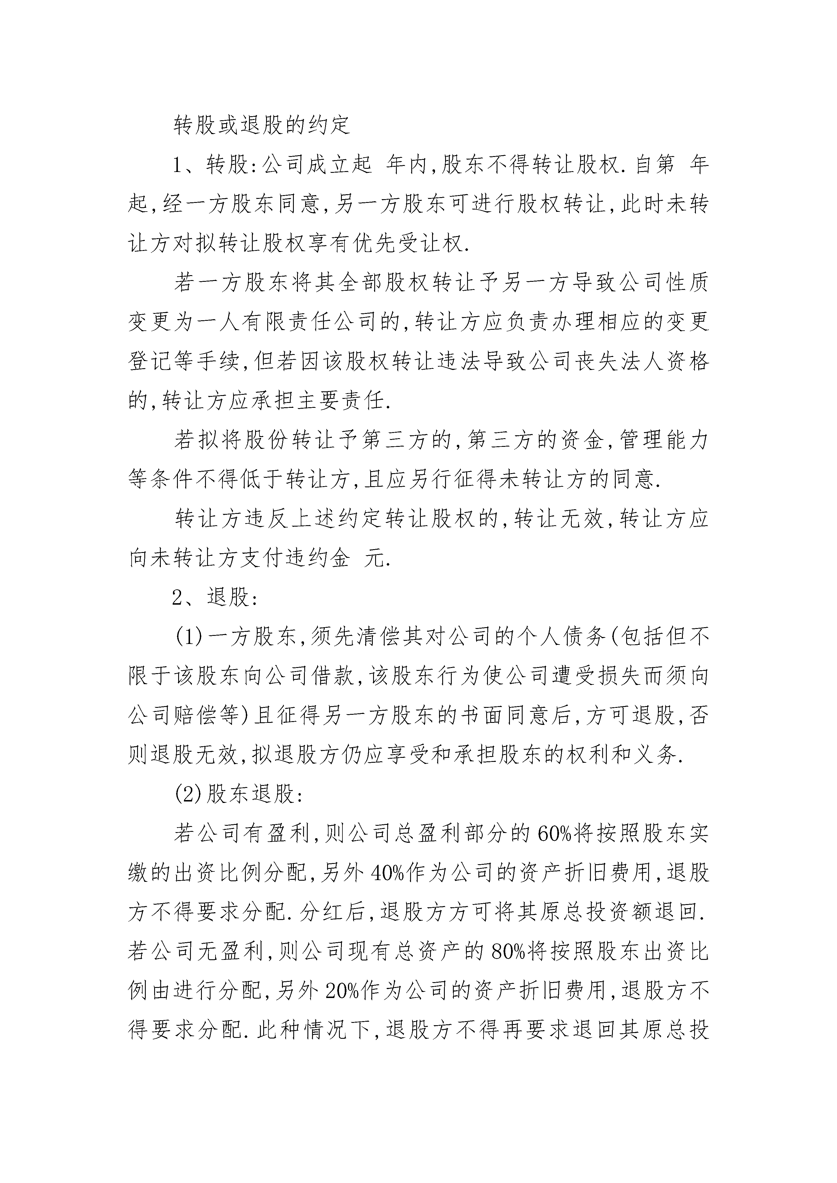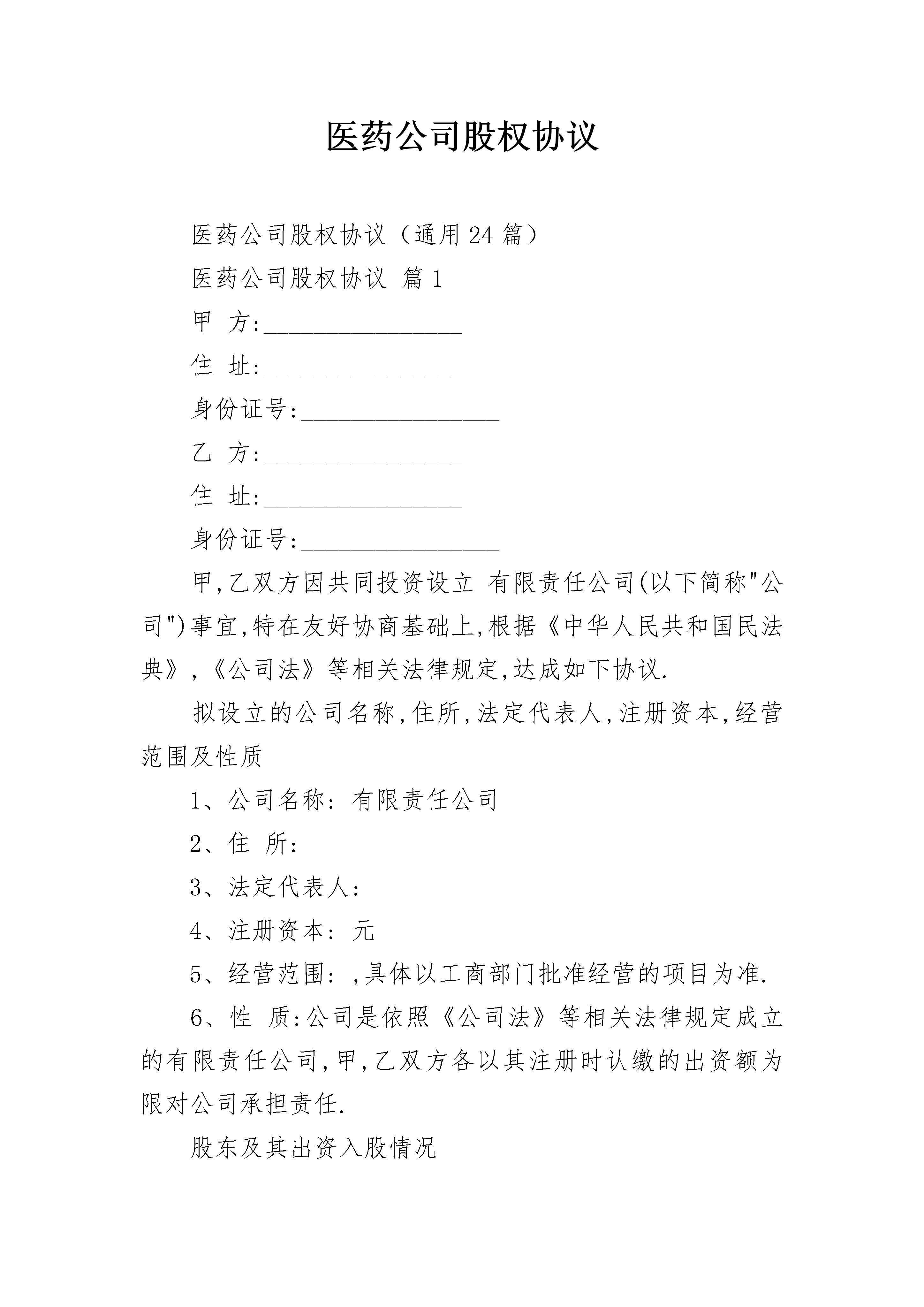 医药公司股权协议医药公司股权协议(通用24篇)医药公司股权协议篇1甲方:________________住址:________________身份证号:________________乙方:________________住址:________________身份证号:________________甲,乙双方因共同投资设立有限责任公司(以下简称"公司")事宜,特在友好协商基础上,根据《中华人民共和国民法典》,《公司法》等相关法律规定,达成如下协议.拟设立的公司名称,住所,法定代表人,注册资本,经营范围及性质1、公司名称:有限责任公司2、住所:3、法定代表人:4、注册资本:元5、经营范围:,具体以工商部门批准经营的项目为准.6、性质:公司是依照《公司法》等相关法律规定成立的有限责任公司,甲,乙双方各以其注册时认缴的出资额为限对公司承担责任.股东及其出资入股情况公司由甲,乙两方股东共同投资设立,总投资额为元,包括启动资金和注册资金两部分,其中:1、启动资金元(1)甲方出资元,占启动资金的50%;(2)乙方出资元,占启动资金的50%;(3)该启动资金主要用于公司前期开支,包括租赁,装修,购买办公设备等,如有剩余作为公司开业后的流动资金,股东不得撤回.(4)在公司账户开立前,该启动资金存放于甲,乙双方共同指定的临时账户(开户行:账号:),公司开业后,该临时账户内的余款将转入公司账户.(5)甲,乙双方均应于本协议签订之日起日内将各应支付的启动资金转入上述临时账户.2、注册资金(本)元(1)甲方以现金作为出资,出资额元人民币,占注册资本的50%;(2)乙方以现金作为出资,出资额元人民币,占注册资本的50%;(3)该注册资本主要用于公司注册时使用,并用于公司开业后的流动资金,股东不得撤回.(4)甲,乙双方均应于公司账户开立之日起日内将各应缴纳的注册资金存入公司账户.3、任一方股东违反上述约定,均应按本协议第八条第1款承担相应的违约责任.公司管理及职能分工1、公司不设董事会,设执行董事和监事,任期三年.2、甲方为公司的执行董事兼总经理,负责公司的日常运营和管理,具体职责包括:(1)办理公司设立登记手续;(2)根据公司运营需要招聘员工(财务会计人员须由甲乙双方共同聘任);(3)审批日常事项(涉及公司发展的重大事项,须按本协议第三条第5款处理;甲方财务审批权限为元人民币以下,超过该权限数额的,须经甲乙双方共同签字认可,方可执行).(4)公司日常经营需要的其他职责.3、乙方担任公司的监事,具体负责:(1)对甲方的运营管理进行必要的协助;(2)检查公司财务;(3)监督甲方执行公司职务的行为;(4)公司章程规定的其他职责.4、甲方的工资报酬为元/月,乙方的工资报酬为元/月,均从临时账户或公司账户中支付.5、重大事项处理公司不设股东会,遇有如下重大事项,须经甲,乙双方达成一致决议后方可进行:(1)拟由公司为股东,其他企业,个人提供担保的;(2)决定公司的经营方针和投资计划;(3)《公司法》第三十八条规定的其他事项.对于上述重大事项的决策,甲乙双方意见不一致的,在不损害公司利益的原则下,按如下方式处理:.6、除上述重大事项需要讨论外,甲乙双方一致同意,每周进行一次的股东例行会议,对公司上阶段经营情况进行总结,并对公司下阶段的运营进行计划部署.资金、财务管理1、公司成立前,资金由临时账户统一收支,并由甲乙双方共同监管和使用,一方对另一方资金使用有异议的,另一方须给出合理解释,否则一方有权要求另一方赔偿损失.2、公司成立后,资金将由开立的公司账户统一收支,财务统一交由甲乙双方共同聘任的财务会计人员处理.公司账目应做到日清月结,并及时提供相关报表交甲乙双方签字认可备案.盈亏分配1、利润和亏损,甲,乙双方按照实缴的出资比例分享和承担.2、公司税后利润,在弥补公司前季度亏损,并提取法定公积金(税后利润的10%)后,方可进行股东分红.股东分红的具体制度为:(1)分红的时间:每季度第一个月第一日分取上个季度利润.(2)分红的数额为:上个季度剩余利润的60%,甲乙双方按实缴的出资比例分取.(3)公司的法定公积金累计达到公司注册资本50%以上,可不再提取.转股或退股的约定1、转股:公司成立起年内,股东不得转让股权.自第年起,经一方股东同意,另一方股东可进行股权转让,此时未转让方对拟转让股权享有优先受让权.若一方股东将其全部股权转让予另一方导致公司性质变更为一人有限责任公司的,转让方应负责办理相应的变更登记等手续,但若因该股权转让违法导致公司丧失法人资格的,转让方应承担主要责任.若拟将股份转让予第三方的,第三方的资金,管理能力等条件不得低于转让方,且应另行征得未转让方的同意.转让方违反上述约定转让股权的,转让无效,转让方应向未转让方支付违约金元.2、退股:(1)一方股东