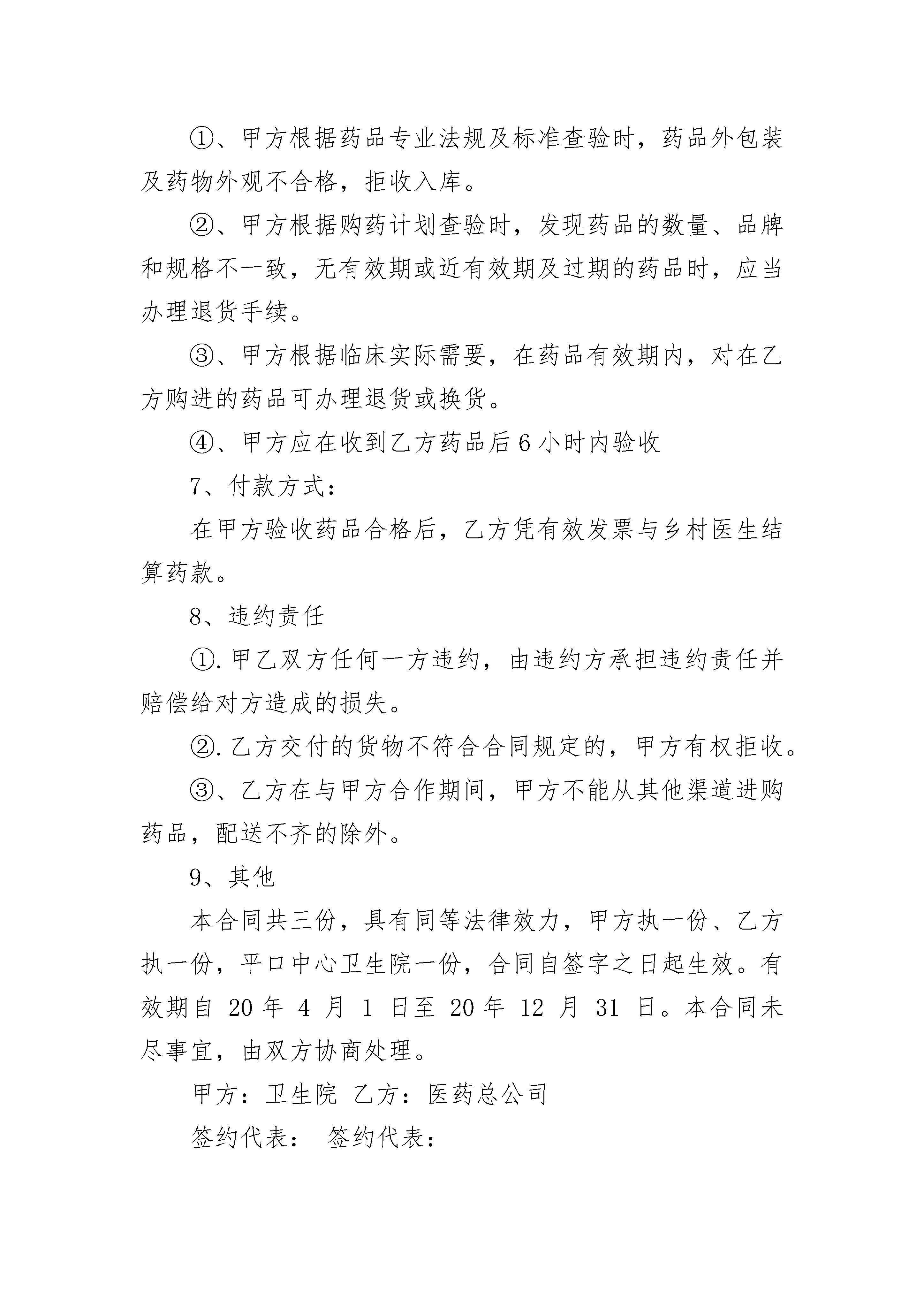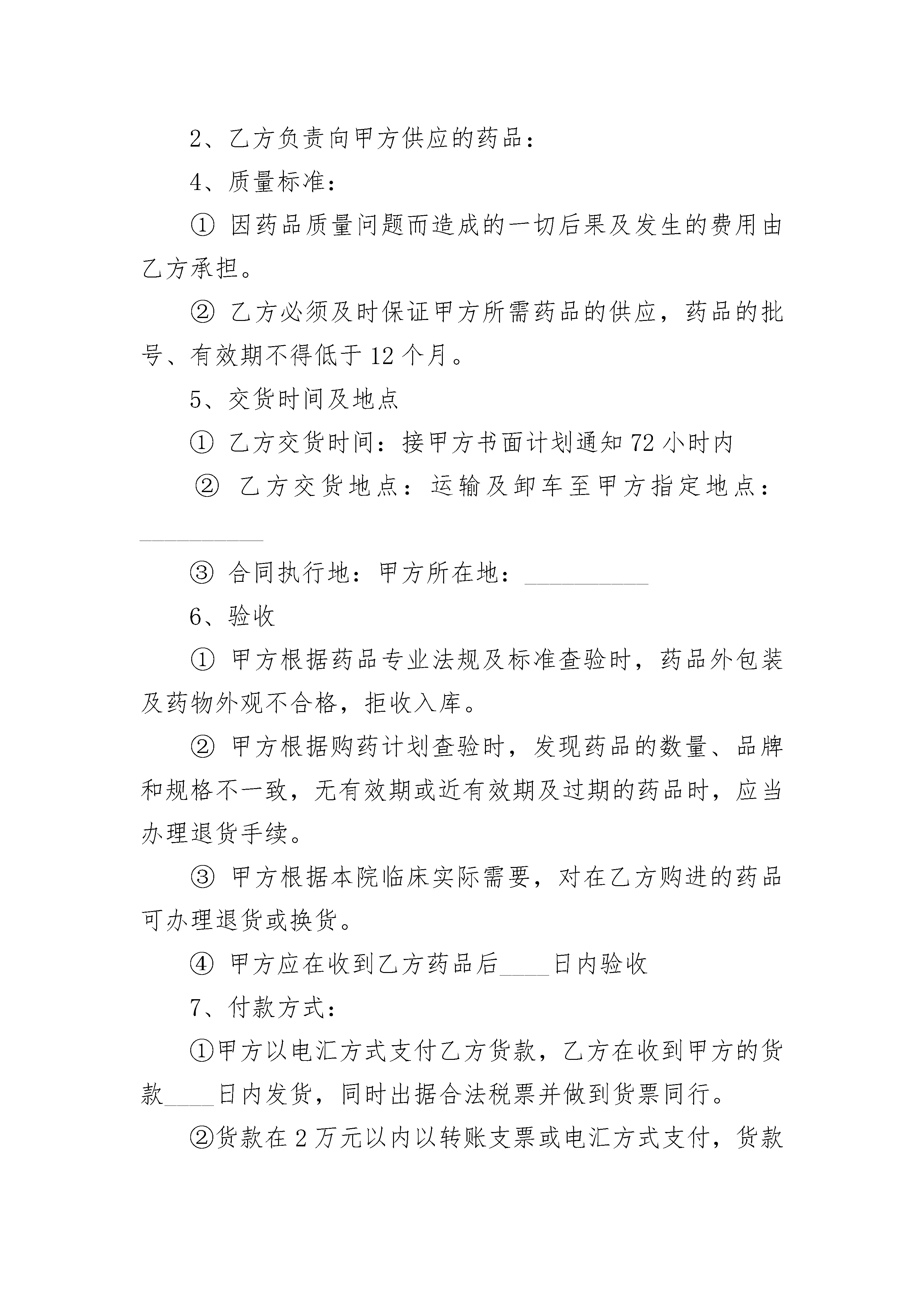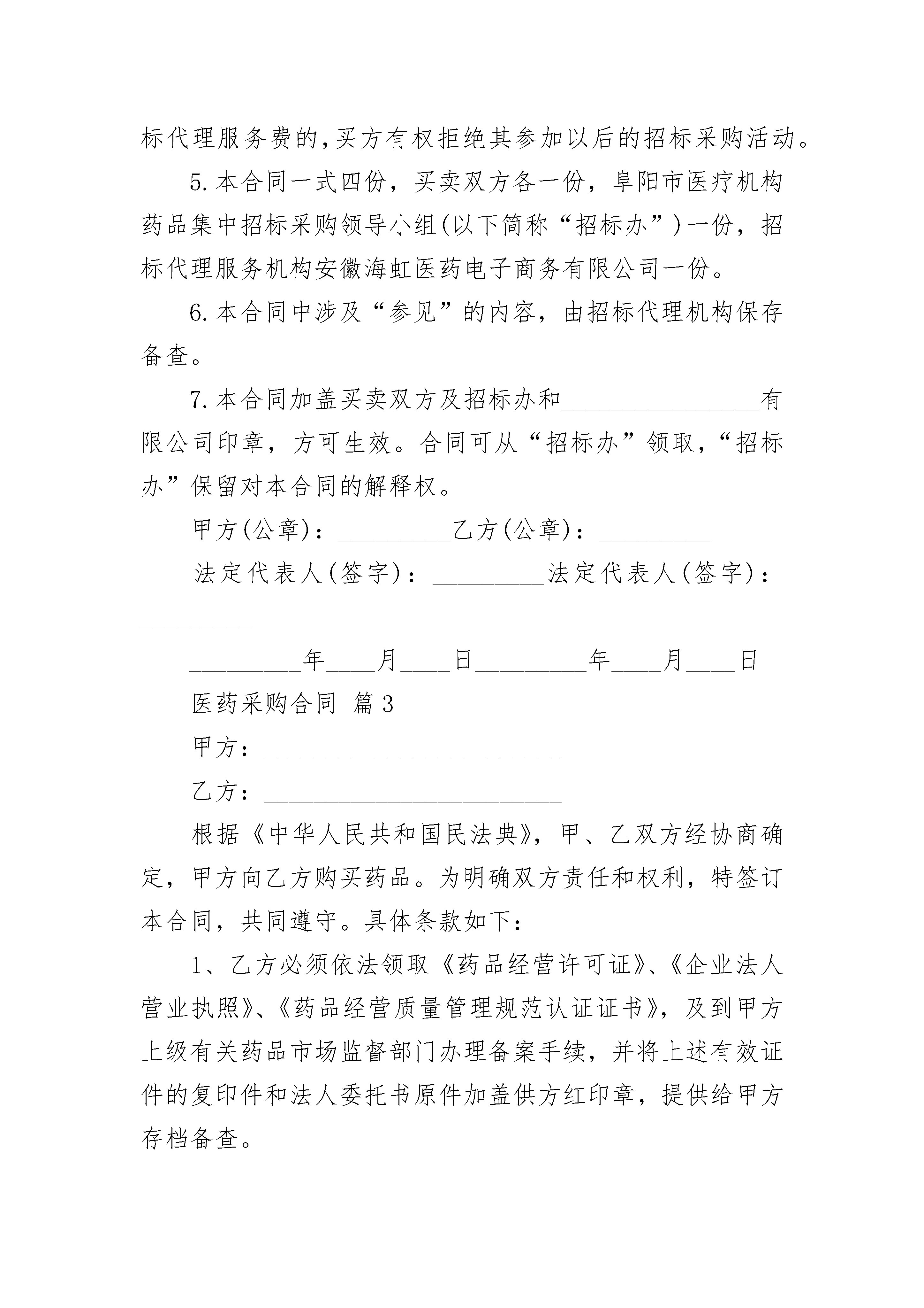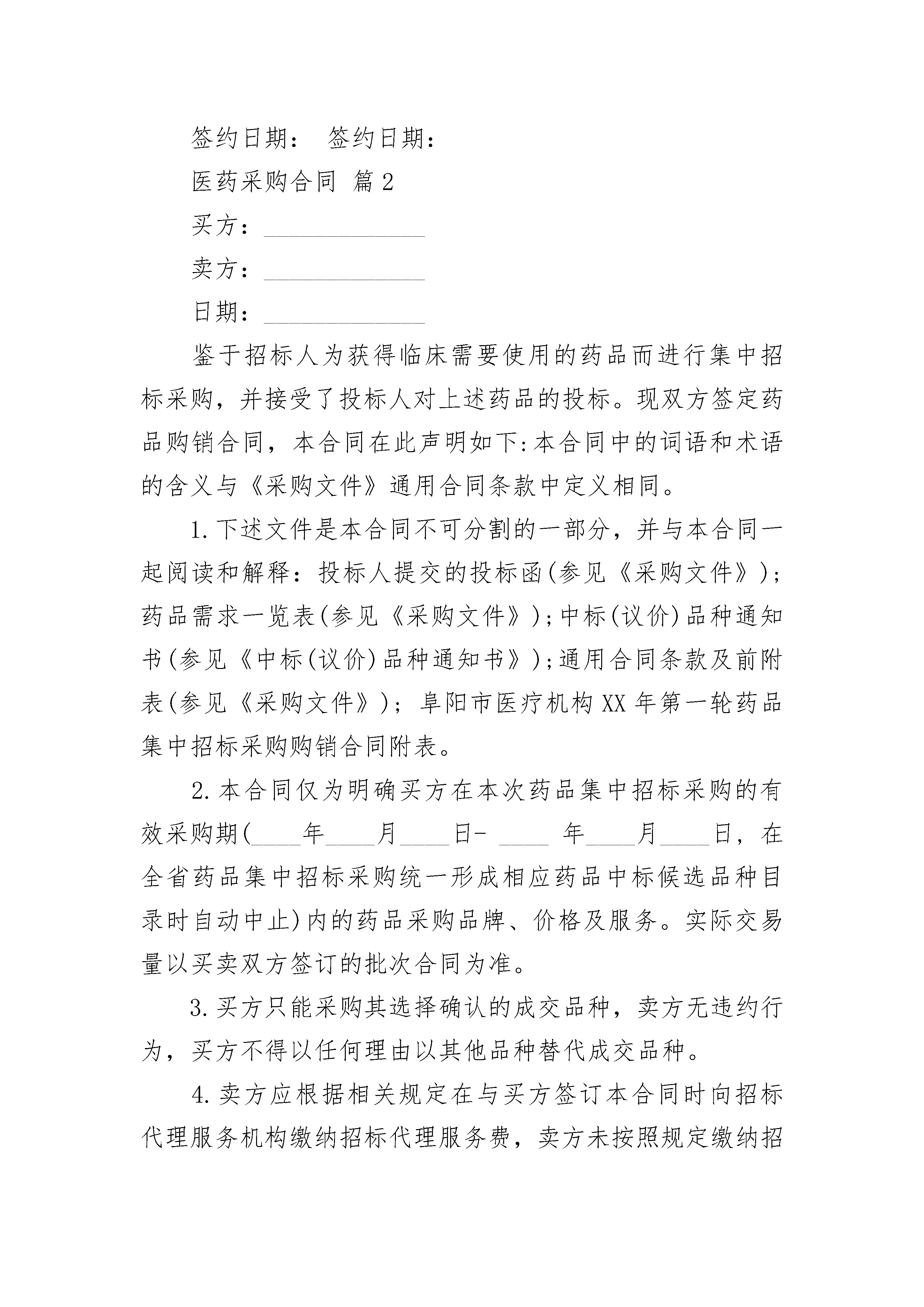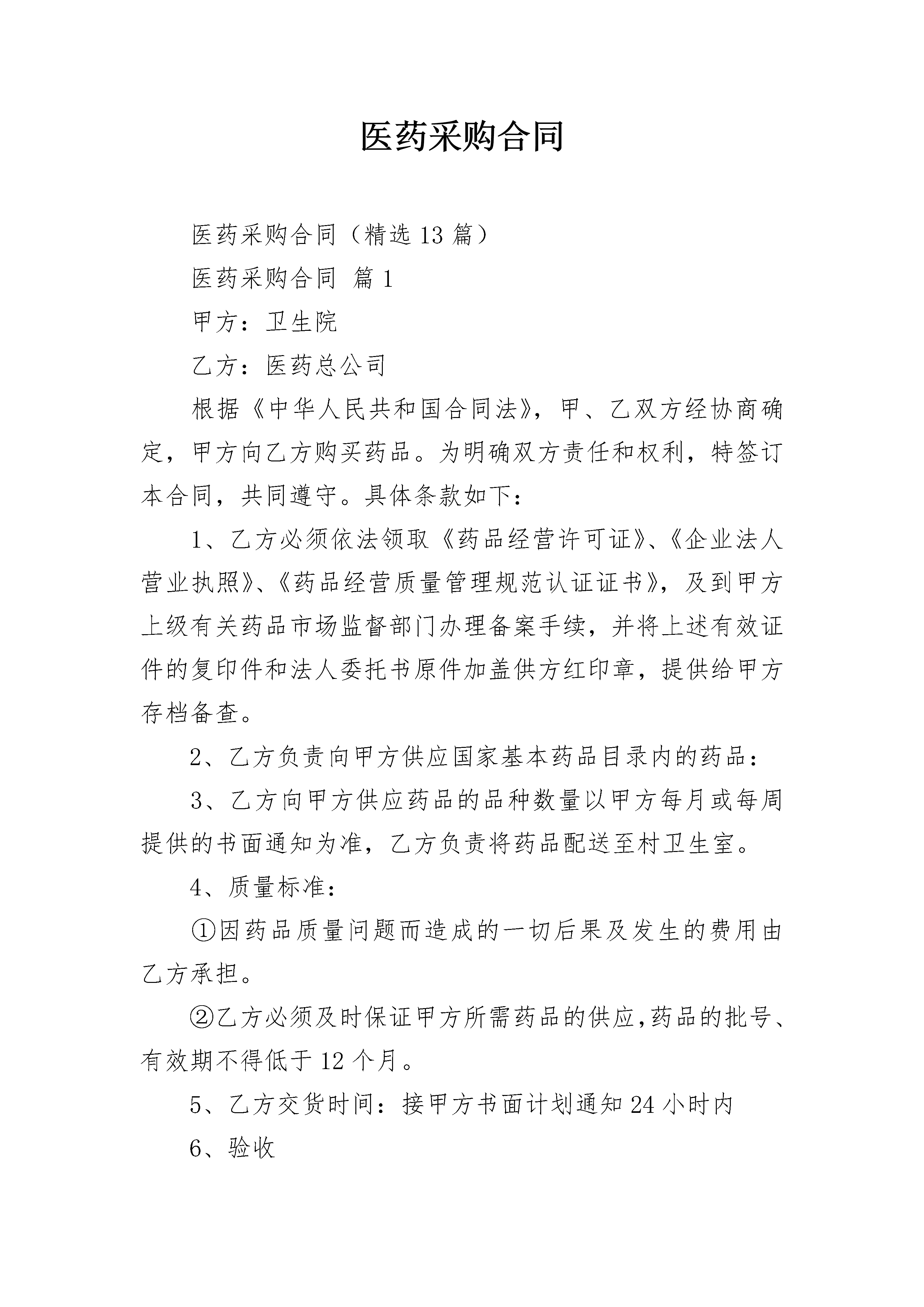 医药采购合同医药采购合同(精选13篇)医药采购合同篇1甲方:卫生院乙方:医药总公司根据《中华人民共和国合同法》,甲、乙双方经协商确定,甲方向乙方购买药品。为明确双方责任和权利,特签订本合同,共同遵守。具体条款如下:1、乙方必须依法领取《药品经营许可证》、《企业法人营业执照》、《药品经营质量管理规范认证证书》,及到甲方上级有关药品市场监督部门办理备案手续,并将上述有效证件的复印件和法人委托书原件加盖供方红印章,提供给甲方存档备查。2、乙方负责向甲方供应国家基本药品目录内的药品:3、乙方向甲方供应药品的品种数量以甲方每月或每周提供的书面通知为准,乙方负责将药品配送至村卫生室。4、质量标准:①因药品质量问题而造成的一切后果及发生的费用由乙方承担。②乙方必须及时保证甲方所需药品的供应,药品的批号、有效期不得低于12个月。5、乙方交货时间:接甲方书面计划通知24小时内6、验收①、甲方根据药品专业法规及标准查验时,药品外包装及药物外观不合格,拒收入库。②、甲方根据购药计划查验时,发现药品的数量、品牌和规格不一致,无有效期或近有效期及过期的药品时,应当办理退货手续。③、甲方根据临床实际需要,在药品有效期内,对在乙方购进的药品可办理退货或换货。④、甲方应在收到乙方药品后6小时内验收7、付款方式:在甲方验收药品合格后,乙方凭有效发票与乡村医生结算药款。8、违约责任①.甲乙双方任何一方违约,由违约方承担违约责任并赔偿给对方造成的损失。②.乙方交付的货物不符合合同规定的,甲方有权拒收。③、乙方在与甲方合作期间,甲方不能从其他渠道进购药品,配送不齐的除外。9、其他本合同共三份,具有同等法律效力,甲方执一份、乙方执一份,平口中心卫生院一份,合同自签字之日起生效。有效期自20年4月1日至20年12月31日。本合同未尽事宜,由双方协商处理。甲方:卫生院乙方:医药总公司签约代表:签约代表:签约日期:签约日期:医药采购合同篇2买方:_____________卖方:_____________日期:_____________鉴于招标人为获得临床需要使用的药品而进行集中招标采购,并接受了投标人对上述药品的投标。现双方签定药品购销合同,本合同在此声明如下:本合同中的词语和术语的含义与《采购文件》通用合同条款中定义相同。1.下述文件是本合同不可分割的一部分,并与本合同一起阅读和解释:投标人提交的投标函(参见《采购文件》);药品需求一览表(参见《采购文件》);中标(议价)品种通知书(参见《中标(议价)品种通知书》);通用合同条款及前附表(参见《采购文件》);阜阳市医疗机构XX年第一轮药品集中招标采购购销合同附表。2.本合同仅为明确买方在本次药品集中招标采购的有效采购期(____年____月____日-____年____月____日,在全省药品集中招标采购统一形成相应药品中标候选品种目录时自动中止)内的药品采购品牌、价格及服务。实际交易量以买卖双方签订的批次合同为准。3.买方只能采购其选择确认的成交品种,卖方无违约行为,买方不得以任何理由以其他品种替代成交品种。4.卖方应根据相关规定在与买方签订本合同时向招标代理服务机构缴纳招标代理服务费,卖方未按照规定缴纳招标代理服务费的,买方有权拒绝其参加以后的招标采购活动。5.本合同一式四份,买卖双方各一份,阜阳市医疗机构药品集中招标采购领导小组(以下简称“招标办”)一份,招标代理服务机构安徽海虹医药电子商务有限公司一份。6.本合同中涉及“参见”的内容,由招标代理机构保存备查。7.本合同加盖买卖双方及招标办和________________有限公司印章,方可生效。合同可从“招标办”领取,“招标办”保留对本合同的解释权。甲方(公章):_________乙方(公章):_________法定代表人(签字):_________法定代表人(签字):__________________年____月____日_________年____月____日医药采购合同篇3甲方:________________________乙方:________________________根据《中华人民共和国民法典》,甲、乙双方经协商确定,甲方向乙方购买药品。为明确双方责任和权利,特签订本合同,共同遵守。具体条款如下:1、乙方必须依法领取《药品经营许可证》、《企业法人营业执照》、《药品经营质量管理规范认证证书》,及到甲方上级有关药品市场监督部门办理备案手续,并将上述有效证件的复印件和法人委托书原件加盖供方红印章,提供给甲方存档备查。2、乙方负责向甲方供应的药品:4、质量标准:①因药品质量问题而造成的一切后果及发生的费用由乙方承担。②乙方必须及时保证甲方所需药品的供应,药品的批号、有效期不得低于12个月。5、交货时间及地点①乙方交货时间:接甲方书面计划通知72小时内