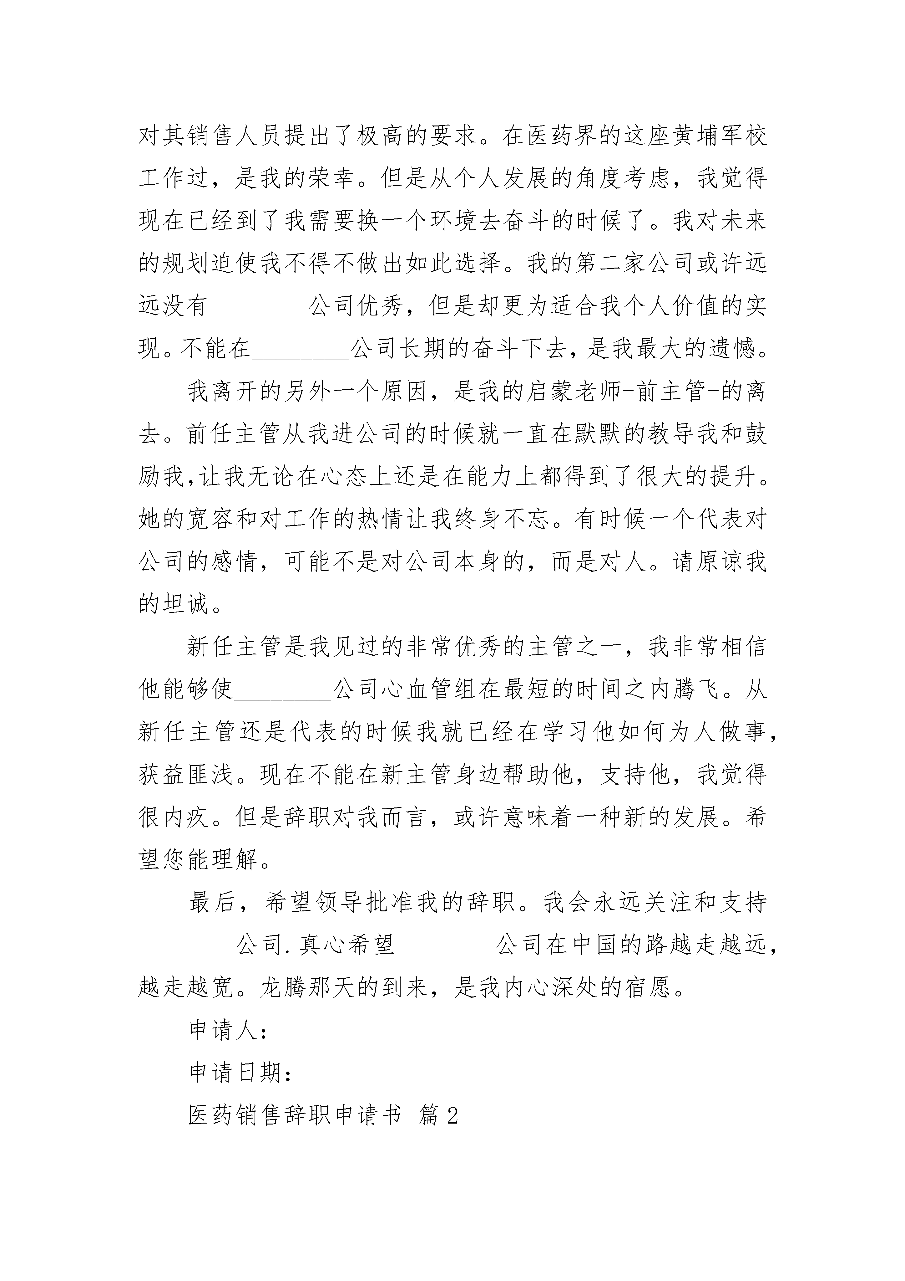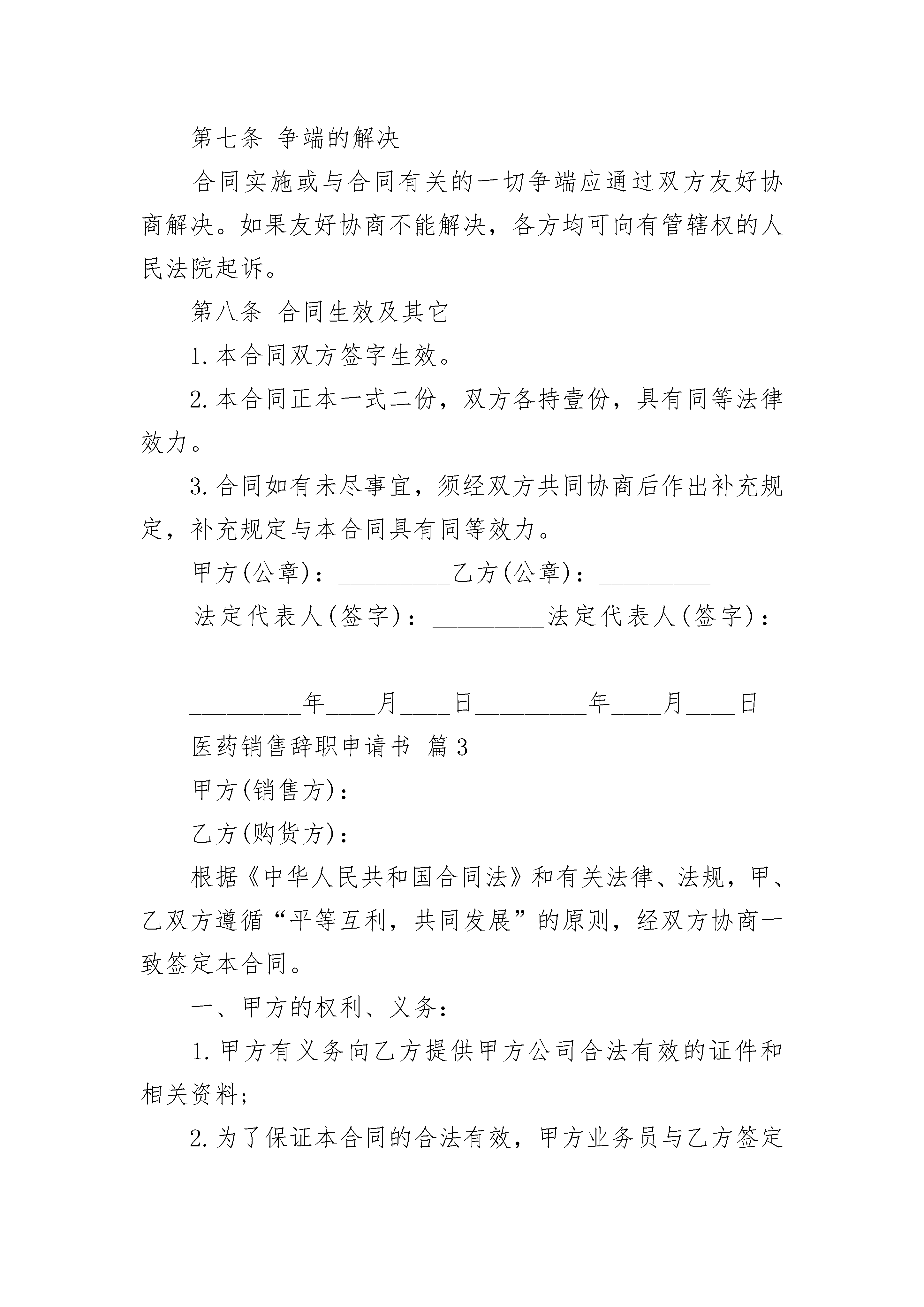 医药销售辞职申请书医药销售辞职申请书(精选3篇)医药销售辞职申请书篇1尊敬的领导:感谢您抽空阅读我的辞职申请书,本人决定辞于目前这份工作。________年____月,我加入了________公司这个幸福的大家庭。在________公司独特价值文化的熏陶下,在公司领导和同事的帮助中,我逐渐的融入到医药销售的大行业,并且慢慢开始喜欢上医药销售的工作和生活。学习着________公司特有的销售模式,感受着主管和同事们对我的关怀和鼓励,潜移默化中,我逐渐开始转变角色,成为了一个勤奋而认真的医药代表,同时能力也得到了很大的锻炼和提升,所以,我非常感谢________公司给我的一切。在________公司近________年的时间,辛苦中感受着温暖,泪水中享受着快乐。同事A的细心宽容,同事B的乐观笑声,同事C的做事为人,同事D的聪敏执着,同事5的优秀大气,同事6的机灵厚道,还有同事7面对压力时表现出的从容和忍耐,都历历在目。可以说,虽然时间不长,我却对________的人和事积累了深厚的感情。即将的离去,很伤感。________公司是一个盛名远扬的跨国性制药企业。无论是销售,管理,财务,人力资源,都有着复杂系统的管理措施。其独特的专业推广不仅象征着未来医药行业的走向,也对其销售人员提出了极高的要求。在医药界的这座黄埔军校工作过,是我的荣幸。但是从个人发展的角度考虑,我觉得现在已经到了我需要换一个环境去奋斗的时候了。我对未来的规划迫使我不得不做出如此选择。我的第二家公司或许远远没有________公司优秀,但是却更为适合我个人价值的实现。不能在________公司长期的奋斗下去,是我最大的遗憾。我离开的另外一个原因,是我的启蒙老师-前主管-的离去。前任主管从我进公司的时候就一直在默默的教导我和鼓励我,让我无论在心态上还是在能力上都得到了很大的提升。她的宽容和对工作的热情让我终身不忘。有时候一个代表对公司的感情,可能不是对公司本身的,而是对人。请原谅我的坦诚。新任主管是我见过的非常优秀的主管之一,我非常相信他能够使________公司心血管组在最短的时间之内腾飞。从新任主管还是代表的时候我就已经在学习他如何为人做事,获益匪浅。现在不能在新主管身边帮助他,支持他,我觉得很内疚。但是辞职对我而言,或许意味着一种新的发展。希望您能理解。最后,希望领导批准我的辞职。我会永远关注和支持________公司.真心希望________公司在中国的路越走越远,越走越宽。龙腾那天的到来,是我内心深处的宿愿。申请人:申请日期:医药销售辞职申请书篇2本合同于20xx年7月4日,由魏军(以下简称甲方)和吴松(以下简称乙方),在松滋市医药公司经过友好协商签订,双方共同遵守执行。第一条乙方所提供的药品及费用清单总金额(大写)壹拾柒万捌仟玖佰贰拾元整第二条包装:由乙方按国家标准进行包装。任何因包装不善所致之损失均由乙方负责。第三条交货地点和方式1.交货地点:松滋市刘家场镇。2.交货方式:乙方将货物运至甲方指定的目的地。第四条付款方式1.本合同生效后,甲方在10个工作日内向乙方支付本合同总价的10%作为预付款;2.甲方对乙方所提供的产品验收合格后,乙方出具合同总价的全额销售发票,甲方在7个工作日内支付本合同全部余款。第五条质量保证1.乙方承诺所提供甲方的产品必须符合国家标准。2.在产品质量保证期内,如出现产品质量问题,甲方有权退货或要求乙方更换。第六条违约责任在合同履行期间,乙方延期交货、甲方延期付款,除双方协商同意免责外,均按未交付/未支付本合同价款日的50%承担违约责任第七条争端的解决合同实施或与合同有关的一切争端应通过双方友好协商解决。如果友好协商不能解决,各方均可向有管辖权的人民法院起诉。第八条合同生效及其它1.本合同双方签字生效。2.本合同正本一式二份,双方各持壹份,具有同等法律效力。3.合同如有未尽事宜,须经双方共同协商后作出补充规定,补充规定与本合同具有同等效力。甲方(公章):_________乙方(公章):_________法定代表人(签字):_________法定代表人(签字):__________________年____月____日_________年____月____日医药销售辞职申请书篇3甲方(销售方):乙方(购货方):根据《中华人民共和国合同法》和有关法律、法规,甲、乙双方遵循“平等互利,共同发展”的原则,经双方协商一致签定本合同。一、甲方的权利、义务:1.甲方有义务向乙方提供甲方公司合法有效的证件和相关资料;2.为了保证本合同的合法有效,甲方业务员与乙方签定本合同时,应出具由甲方法定代表人签署的委托书原件及业务员身份证复印件交乙方存档备查,并严格按委托书授权的范围开展业务活动:3.甲方对所销售商品的质量在其有效期内负责(不包括因乙方责任如