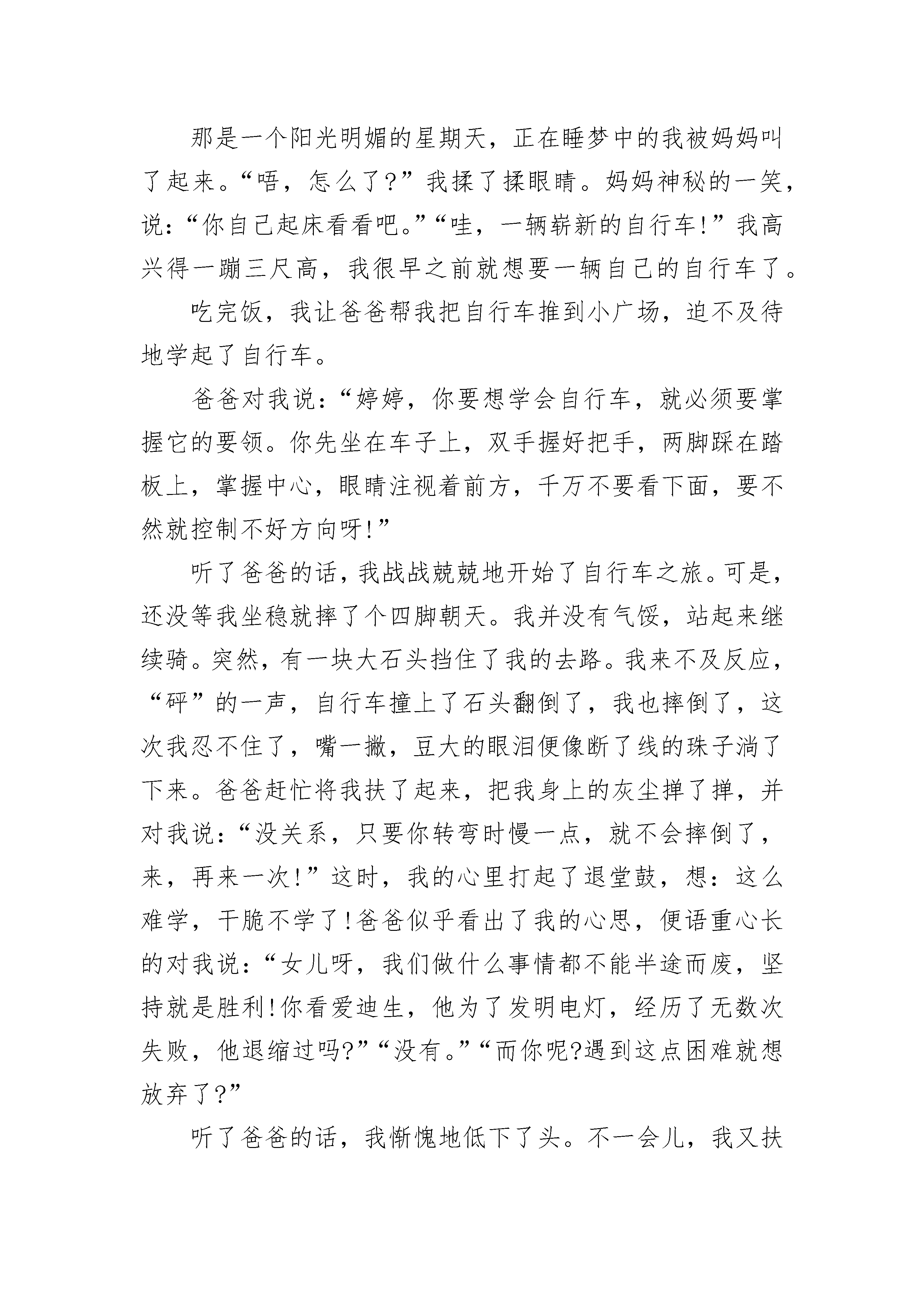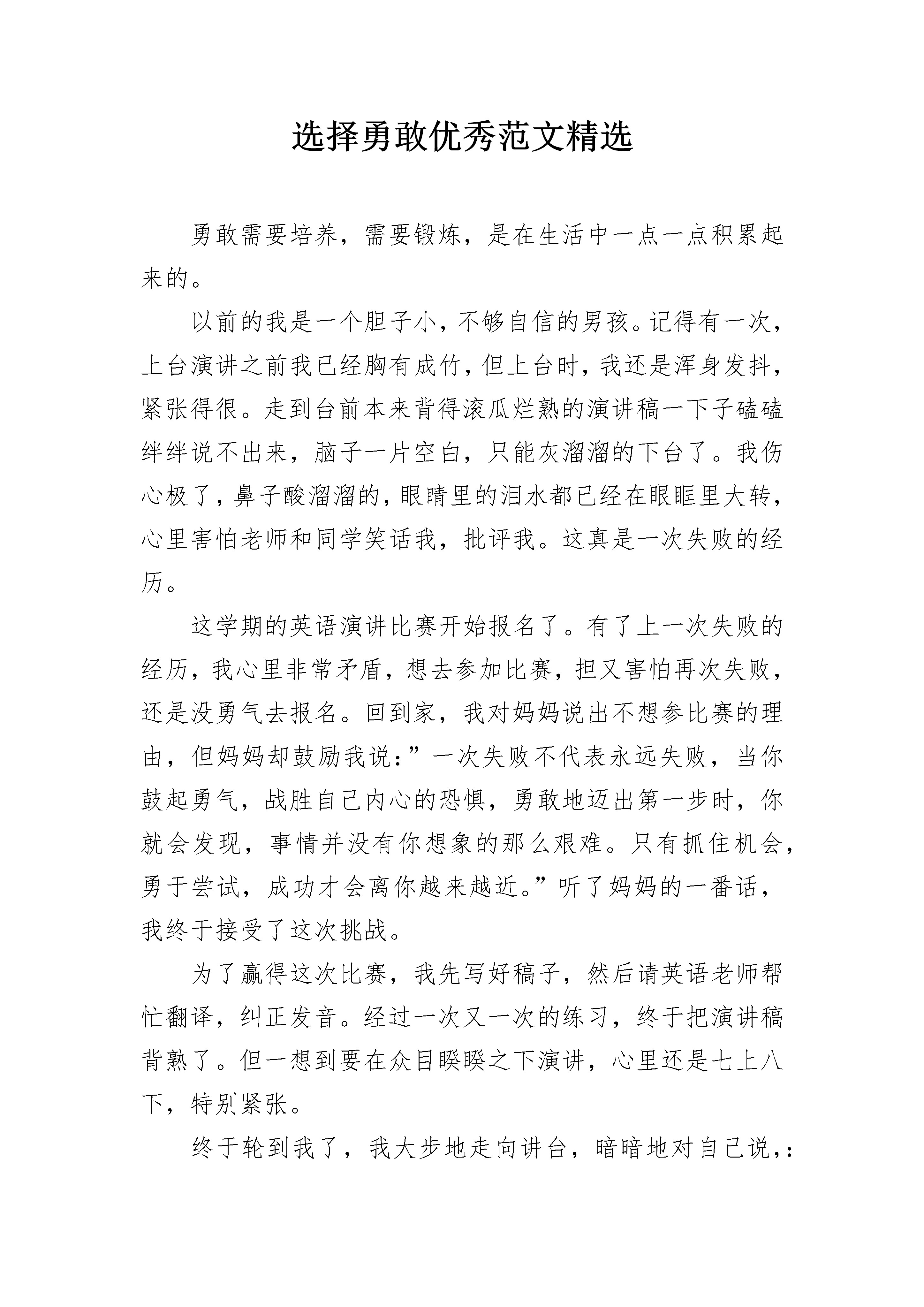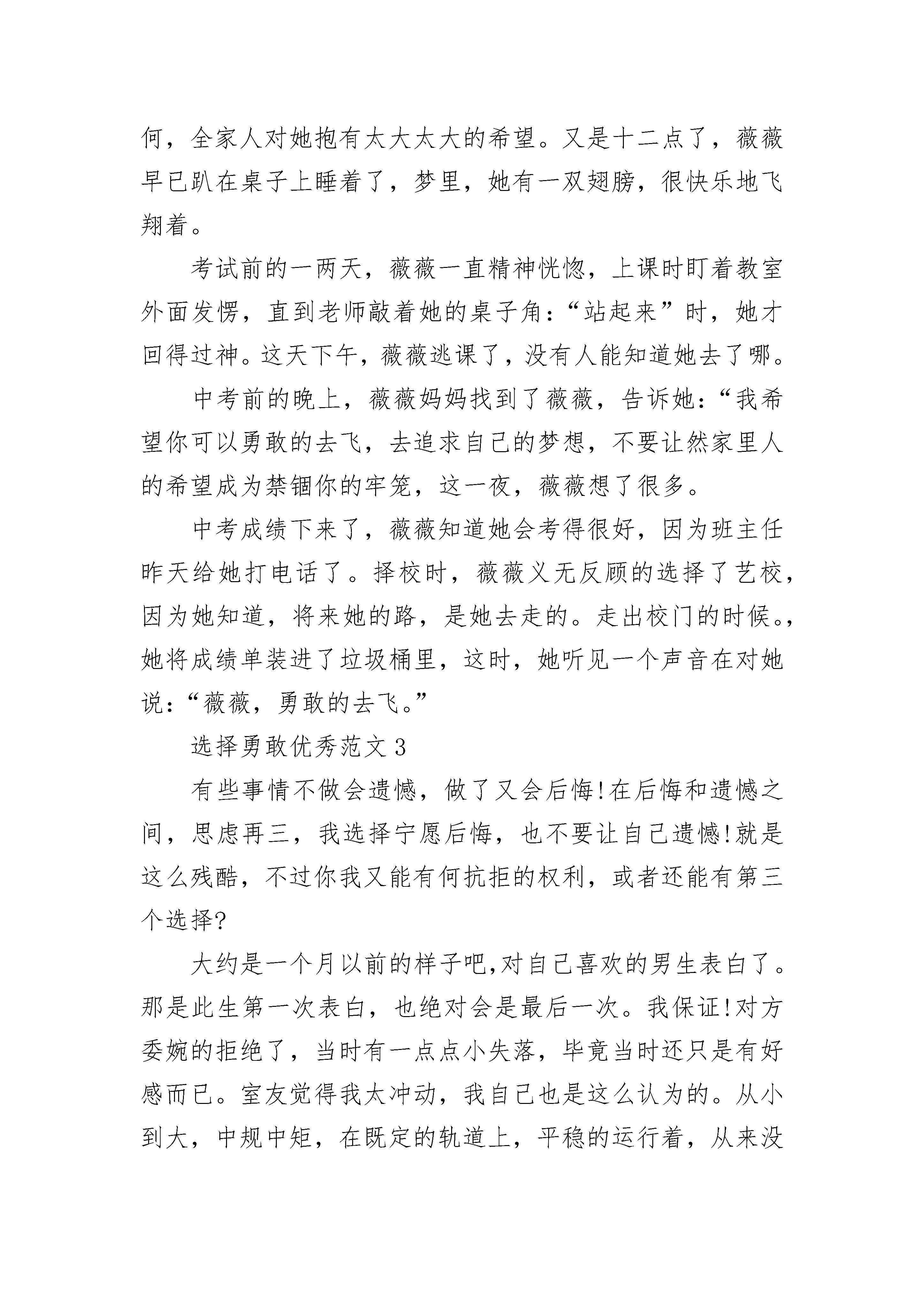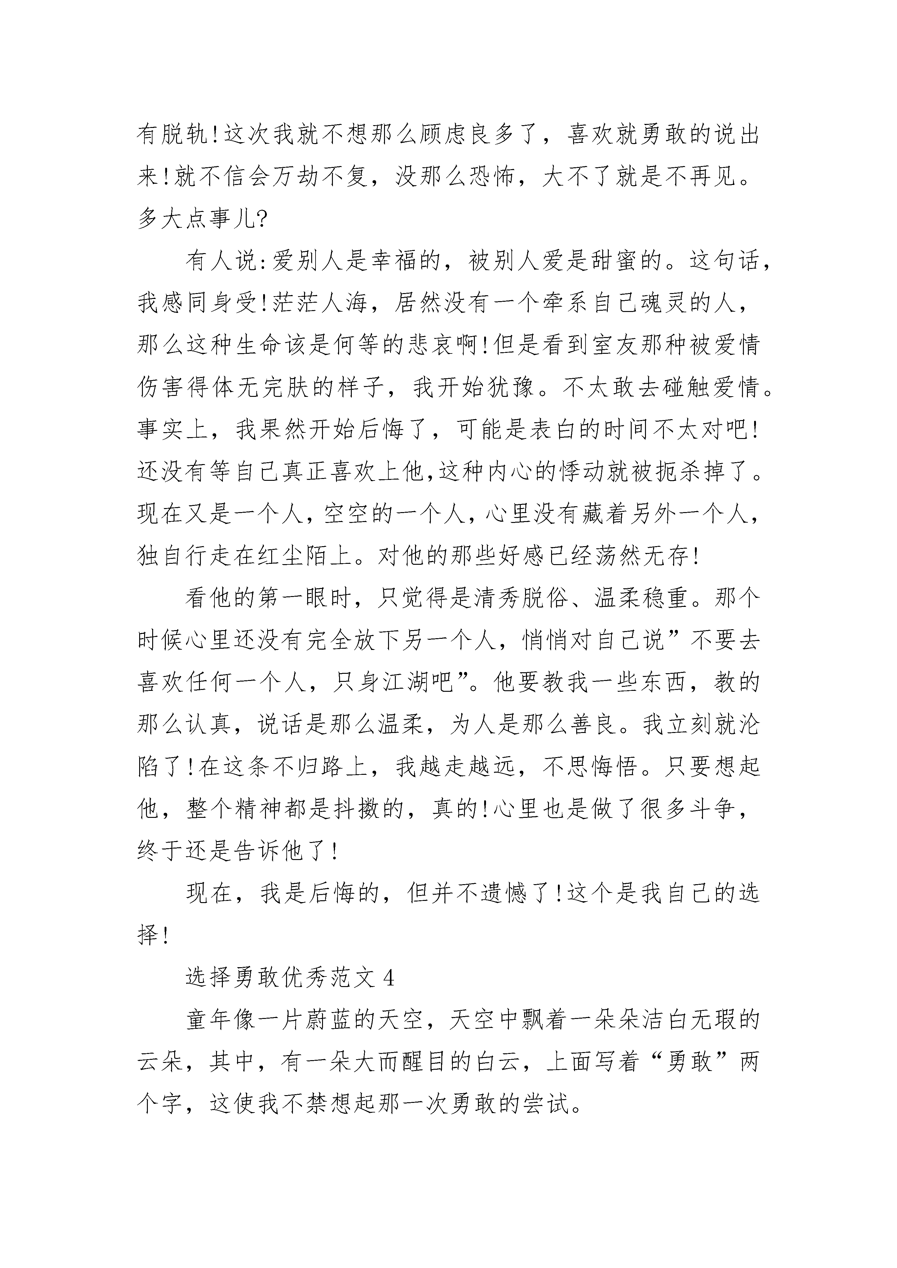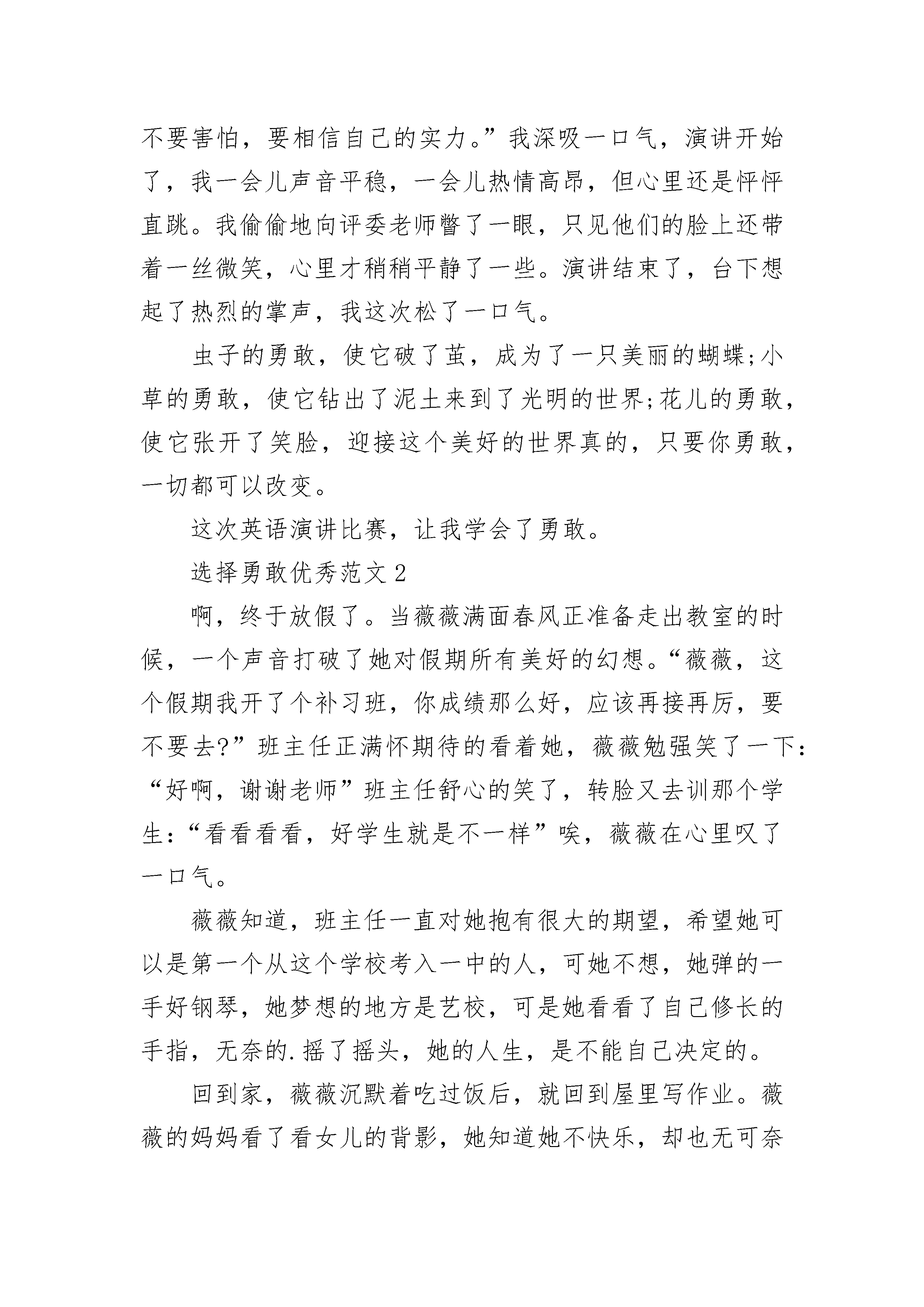 选择勇敢优秀范文精选勇敢需要培养,需要锻炼,是在生活中一点一点积累起来的。以前的我是一个胆子小,不够自信的男孩。记得有一次,上台演讲之前我已经胸有成竹,但上台时,我还是浑身发抖,紧张得很。走到台前本来背得滚瓜烂熟的演讲稿一下子磕磕绊绊说不出来,脑子一片空白,只能灰溜溜的下台了。我伤心极了,鼻子酸溜溜的,眼睛里的泪水都已经在眼眶里大转,心里害怕老师和同学笑话我,批评我。这真是一次失败的经历。这学期的英语演讲比赛开始报名了。有了上一次失败的经历,我心里非常矛盾,想去参加比赛,担又害怕再次失败,还是没勇气去报名。回到家,我对妈妈说出不想参比赛的理由,但妈妈却鼓励我说:”一次失败不代表永远失败,当你鼓起勇气,战胜自己内心的恐惧,勇敢地迈出第一步时,你就会发现,事情并没有你想象的那么艰难。只有抓住机会,勇于尝试,成功才会离你越来越近。”听了妈妈的一番话,我终于接受了这次挑战。为了赢得这次比赛,我先写好稿子,然后请英语老师帮忙翻译,纠正发音。经过一次又一次的练习,终于把演讲稿背熟了。但一想到要在众目睽睽之下演讲,心里还是七上八下,特别紧张。终于轮到我了,我大步地走向讲台,暗暗地对自己说,:不要害怕,要相信自己的实力。”我深吸一口气,演讲开始了,我一会儿声音平稳,一会儿热情高昂,但心里还是怦怦直跳。我偷偷地向评委老师瞥了一眼,只见他们的脸上还带着一丝微笑,心里才稍稍平静了一些。演讲结束了,台下想起了热烈的掌声,我这次松了一口气。虫子的勇敢,使它破了茧,成为了一只美丽的蝴蝶;小草的勇敢,使它钻出了泥土来到了光明的世界;花儿的勇敢,使它张开了笑脸,迎接这个美好的世界真的,只要你勇敢,一切都可以改变。这次英语演讲比赛,让我学会了勇敢。选择勇敢优秀范文2啊,终于放假了。当薇薇满面春风正准备走出教室的时候,一个声音打破了她对假期所有美好的幻想。“薇薇,这个假期我开了个补习班,你成绩那么好,应该再接再厉,要不要去?”班主任正满怀期待的看着她,薇薇勉强笑了一下:“好啊,谢谢老师”班主任舒心的笑了,转脸又去训那个学生:“看看看看,好学生就是不一样”唉,薇薇在心里叹了一口气。薇薇知道,班主任一直对她抱有很大的期望,希望她可以是第一个从这个学校考入一中的人,可她不想,她弹的一手好钢琴,她梦想的地方是艺校,可是她看看了自己修长的手指,无奈的.摇了摇头,她的人生,是不能自己决定的。回到家,薇薇沉默着吃过饭后,就回到屋里写作业。薇薇的妈妈看了看女儿的背影,她知道她不快乐,却也无可奈何,全家人对她抱有太大太大的希望。又是十二点了,薇薇早已趴在桌子上睡着了,梦里,她有一双翅膀,很快乐地飞翔着。考试前的一两天,薇薇一直精神恍惚,上课时盯着教室外面发愣,直到老师敲着她的桌子角:“站起来”时,她才回得过神。这天下午,薇薇逃课了,没有人能知道她去了哪。中考前的晚上,薇薇妈妈找到了薇薇,告诉她:“我希望你可以勇敢的去飞,去追求自己的梦想,不要让然家里人的希望成为禁锢你的牢笼,这一夜,薇薇想了很多。中考成绩下来了,薇薇知道她会考得很好,因为班主任昨天给她打电话了。择校时,薇薇义无反顾的选择了艺校,因为她知道,将来她的路,是她去走的。走出校门的时候。,她将成绩单装进了垃圾桶里,这时,她听见一个声音在对她说:“薇薇,勇敢的去飞。”选择勇敢优秀范文3有些事情不做会遗憾,做了又会后悔!在后悔和遗憾之间,思虑再三,我选择宁愿后悔,也不要让自己遗憾!就是这么残酷,不过你我又能有何抗拒的权利,或者还能有第三个选择?大约是一个月以前的样子吧,对自己喜欢的男生表白了。那是此生第一次表白,也绝对会是最后一次。我保证!对方委婉的拒绝了,当时有一点点小失落,毕竟当时还只是有好感而已。室友觉得我太冲动,我自己也是这么认为的。从小到大,中规中矩,在既定的轨道上,平稳的运行着,从来没有脱轨!这次我就不想那么顾虑良多了,喜欢就勇敢的说出来!就不信会万劫不复,没那么恐怖,大不了就是不再见。多大点事儿?有人说:爱别人是幸福的,被别人爱是甜蜜的。这句话,我感同身受!茫茫人海,居然没有一个牵系自己魂灵的人,那么这种生命该是何等的悲哀啊!但是看到室友那种被爱情伤害得体无完肤的样子,我开始犹豫。不太敢去碰触爱情。事实上,我果然开始后悔了,可能是表白的时间不太对吧!还没有等自己真正喜欢上他,这种内心的悸动就被扼杀掉了。现在又是一个人,空空的一个人,心里没有藏着另外一个人,独自行走在红尘陌上。对他的那些好感已经荡然无存!看他的第一眼时,只觉得是清秀脱俗、温柔稳重。那个时候心里还没有完全放下另一个人,悄悄对自己说”不要去喜欢任何一个人,只身江湖吧”。他要教我一些东西,教的那么认真,说话是那么温柔,为人是那么善良。我立刻就沦陷了!在这条不归路上,我越走越远,不思悔悟。只要想起他,整个精神都是抖擞的,真的!心里也是做了很多斗争,终