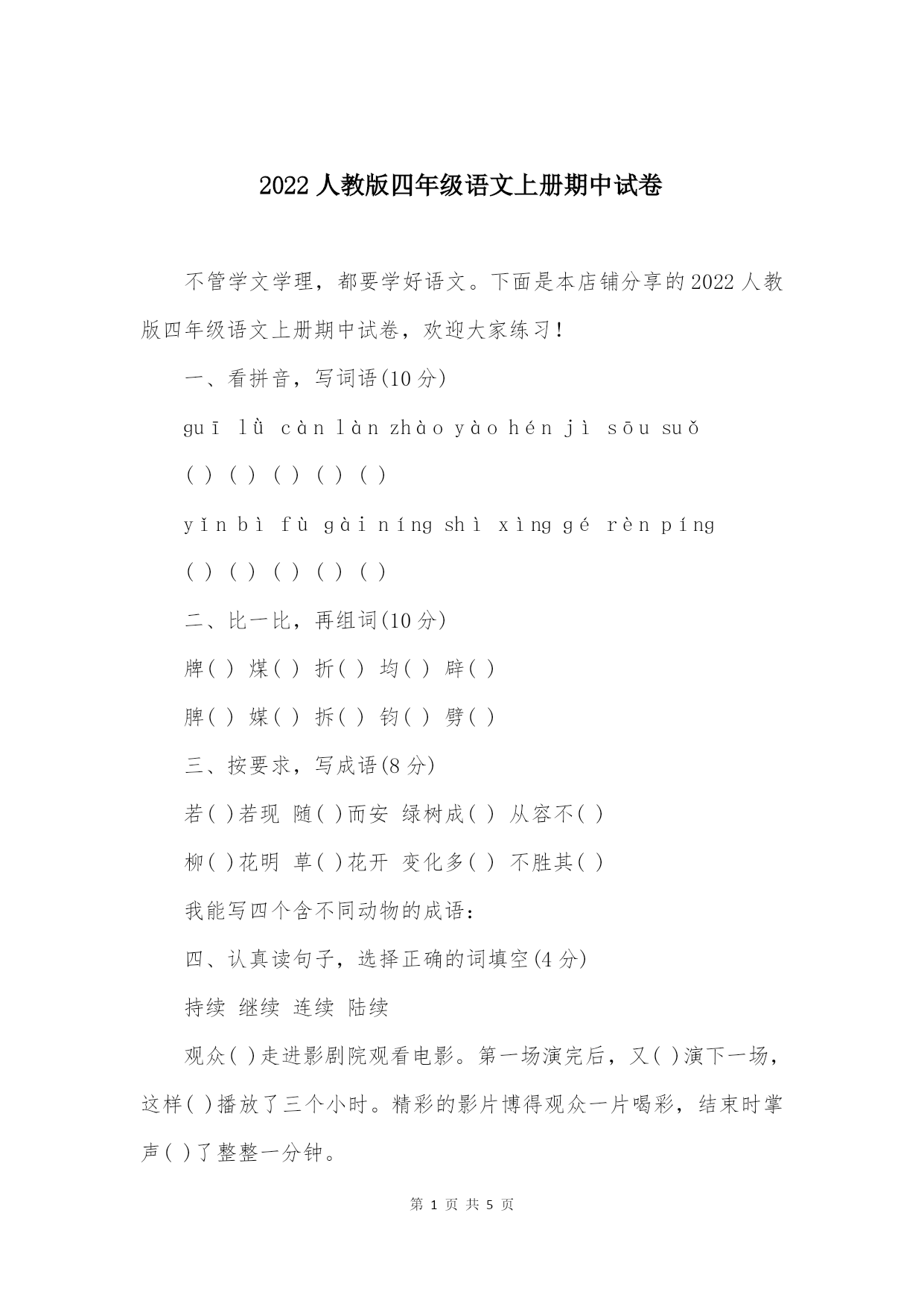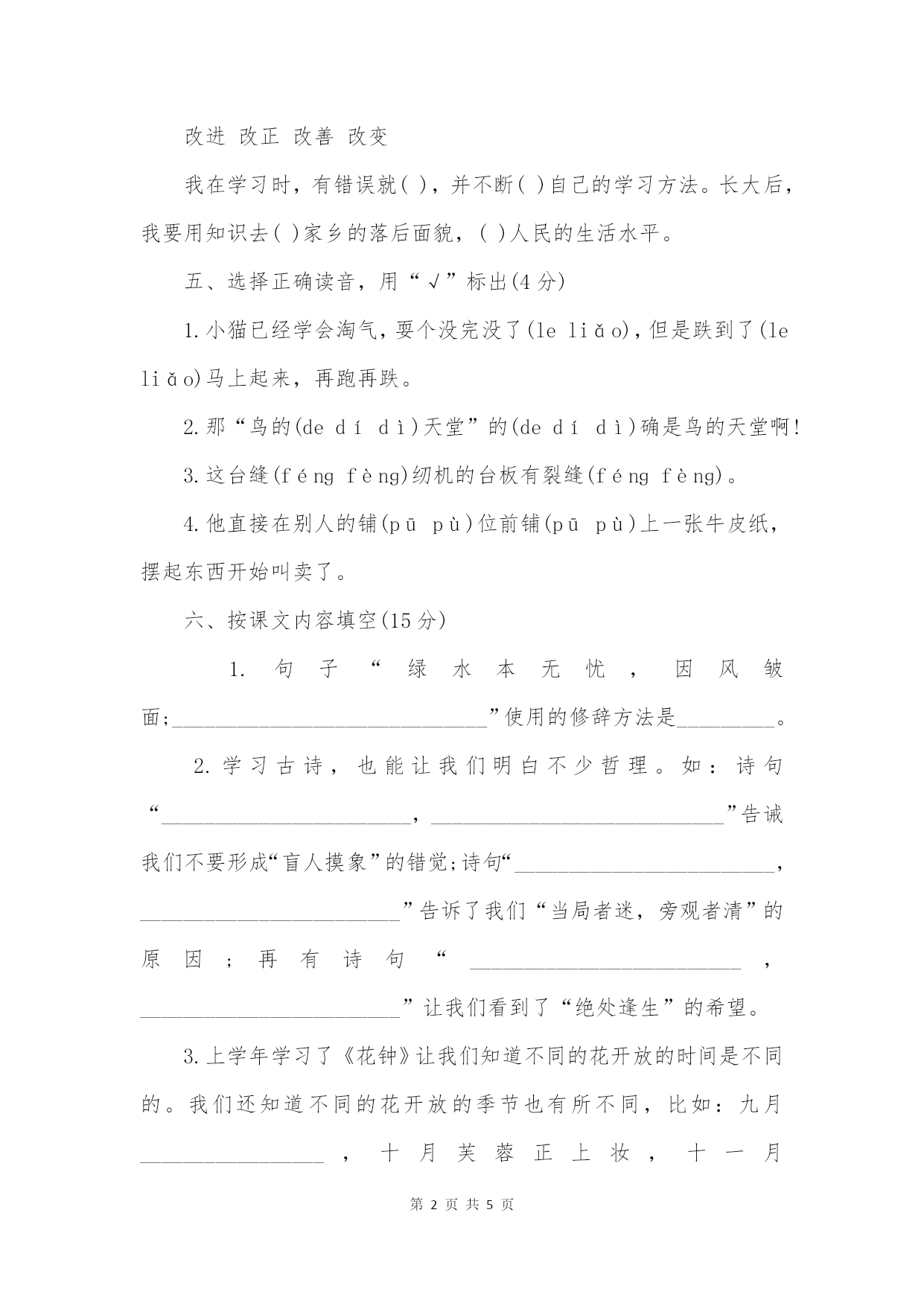 第PAGE\*MERGEFORMAT5页共NUMPAGES\*MERGEFORMAT5页2022人教版四年级语文上册期中试卷不管学文学理,都要学好语文。下面是本店铺分享的2022人教版四年级语文上册期中试卷,欢迎大家练习!一、看拼音,写词语(10分)ɡuīlǜcànlànzhàoyàohénjìsōusuǒ()()()()()yǐnbìfùɡàinínɡshìxìnɡɡérènpínɡ()()()()()二、比一比,再组词(10分)牌()煤()折()均()辟()脾()媒()拆()钧()劈()三、按要求,写成语(8分)若()若现随()而安绿树成()从容不()柳()花明草()花开变化多()不胜其()我能写四个含不同动物的成语:四、认真读句子,选择正确的词填空(4分)持续继续连续陆续观众()走进影剧院观看电影。第一场演完后,又()演下一场,这样()播放了三个小时。精彩的影片博得观众一片喝彩,结束时掌声()了整整一分钟。改进改正改善改变我在学习时,有错误就(),并不断()自己的学习方法。长大后,我要用知识去()家乡的落后面貌,()人民的生活水平。五、选择正确读音,用“√”标出(4分)1.小猫已经学会淘气,耍个没完没了(leliǎo),但是跌到了(leliǎo)马上起来,再跑再跌。2.那“鸟的(dedídì)天堂”的(dedídì)确是鸟的天堂啊!3.这台缝(fénɡfènɡ)纫机的台板有裂缝(fénɡfènɡ)。4.他直接在别人的铺(pūpù)位前铺(pūpù)上一张牛皮纸,摆起东西开始叫卖了。六、按课文内容填空(15分)1.句子“绿水本无忧,因风皱面;_____________________________”使用的修辞方法是_________。2.学习古诗,也能让我们明白不少哲理。如:诗句“_______________________,___________________________”告诫我们不要形成“盲人摸象”的错觉;诗句“________________________,________________________”告诉了我们“当局者迷,旁观者清”的原因;再有诗句“_________________________,________________________”让我们看到了“绝处逢生”的希望。3.上学年学习了《花钟》让我们知道不同的花开放的时间是不同的。我们还知道不同的花开放的季节也有所不同,比如:九月_________________,十月芙蓉正上妆,十一月_____________________,十二月_______________________。4.本学期我们学习了几篇童话故事,其中我对《______________》印象最深,因为________________。课外,我还阅读过的童话有《____________》《________________》等。七、阅读理解(19分)(一)鸟的天堂(节选)起初周围是静寂的。后来忽然起了一声鸟叫。我们把手一拍,便看见一只大鸟飞了起来。接着又看见第二只,第三只。我们继续拍掌,树上就变得热闹了,到处都是鸟声,到处都是鸟影。大的,水的,花的,黑的,有的站在树枝上叫,有的飞起来,有的在扑翅膀。我注意地看着,眼睛应接不暇,看清楚了这只,又错过了那只,看见了那只,另一只又起来了。一只画眉鸟飞了出来,被我们的掌声一吓,又飞进了叶丛,站在一根小枝上兴奋地叫着,那歌声真好听。当小船向着高塔下面的乡村划去的时候,我回头看那被抛在后面的茂盛的榕树。我感到一点儿留恋。昨天是我的眼睛骗了我,那“鸟的天堂”的确是鸟的天堂啊!1.《鸟的天堂》的作者是_________________(1分)2.“应接不暇”的意思是__________________________。用“――”在文中划出表示“应接不暇”的句子,然后用“应接不暇”写一句话。(3分)______________________________________3.文中“大的,小的,花的,黑的”是写鸟的_______________。“有的……有的……有的……”是写鸟的_________________。(2分)4.文中最后一句“鸟的天堂”加了引号是指______________________________;第二个没加引号是指________________,是作者由衷的赞叹。(2分)(二)________________________当我还是个小女孩的时候,母亲给我讲过一个故事。有几只鸟在争论,谁能飞得更高,最后它们决定做一个实验。鹰觉得自己肯定能飞得最高,它就越飞越高,直到不能再往上飞了。这时候其他的鸟都已经回到地上,只有鹰高高地飞在天上没有回来。但是它没有想到,在它背上趴着一只很小的小鸟。当鹰已经飞不动的时