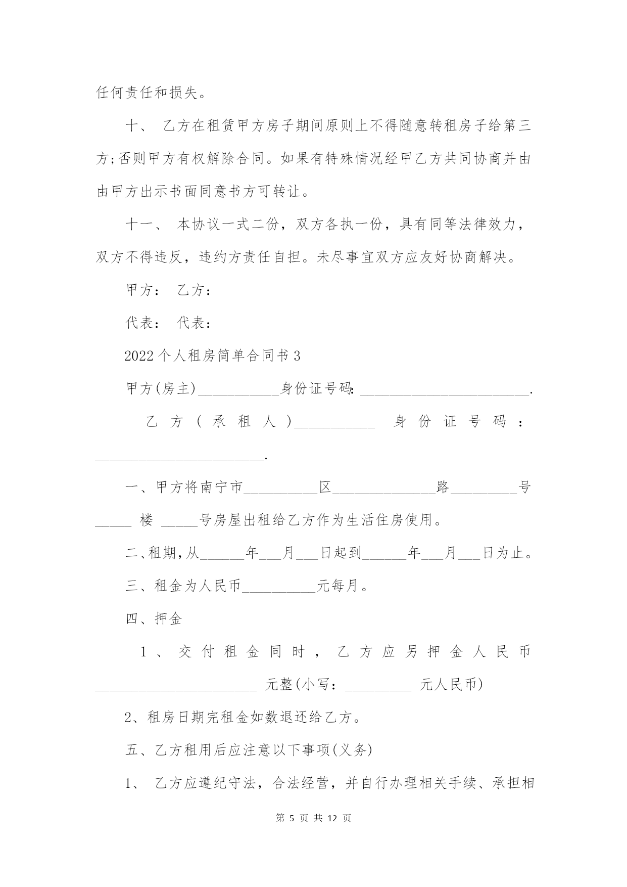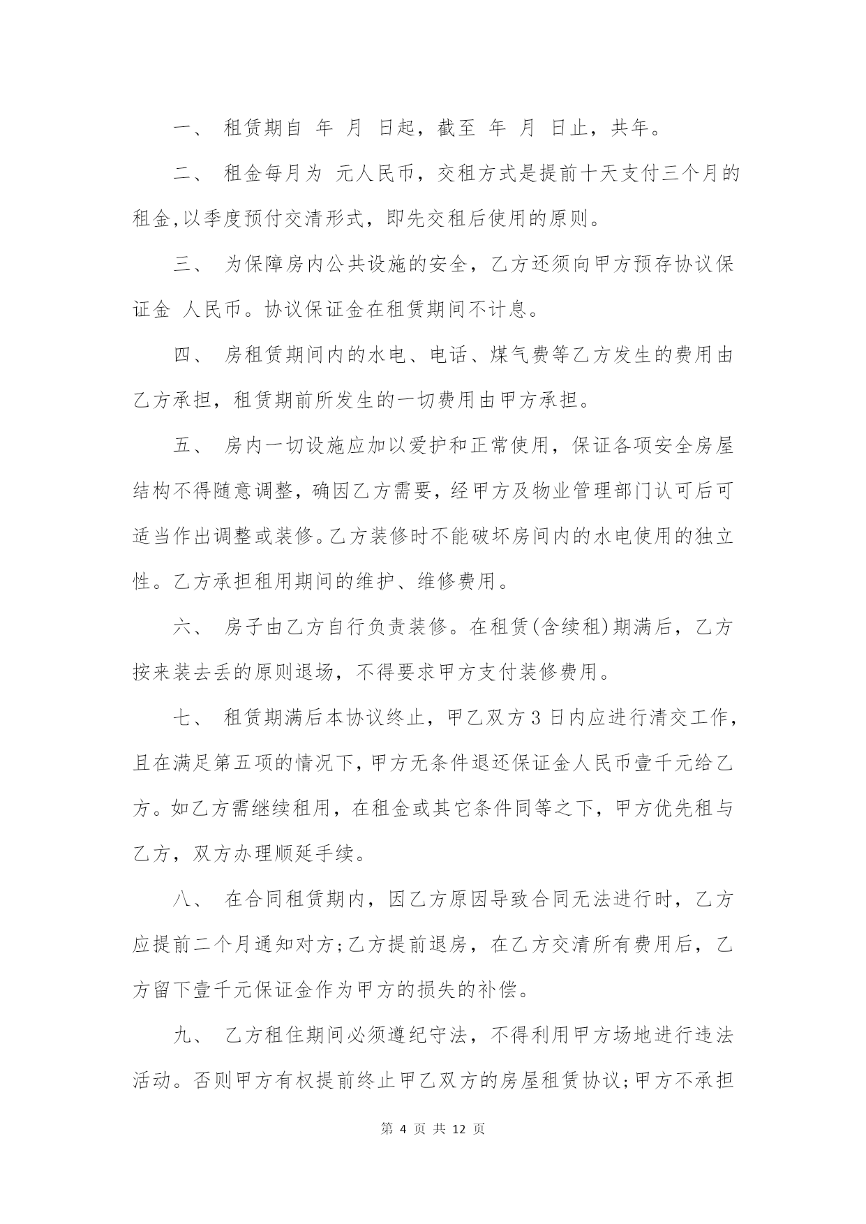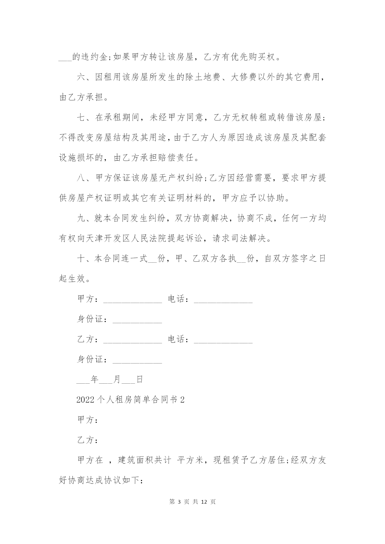 第PAGE\*MERGEFORMAT12页共NUMPAGES\*MERGEFORMAT12页2022个人租房简单合同书(实用版)编制人:__________________审核人:__________________审批人:__________________编制单位:__________________编制时间:____年____月____日序言下载提示:该文档是本店铺精心编制而成的,希望大家下载后,能够帮助大家解决实际问题。文档下载后可定制修改,请根据实际需要进行调整和使用,谢谢!并且,本店铺为大家提供各种类型的实用范文,如学习资料、英语资料、学生作文、教学资源、求职资料、创业资料、工作范文、条据文书、合同协议、其他范文等等,想了解不同范文格式和写法,敬请关注!Downloadtips:Thisdocumentiscarefullycompiledbythiseditor.Ihopethatafteryoudownloadit,itcanhelpyousolvepracticalproblems.Thedocumentcanbecustomizedandmodifiedafterdownloading,pleaseadjustanduseitaccordingtoactualneeds,thankyou!Inaddition,thisshopprovidesvarioustypesofpracticalsampleessays,suchaslearningmaterials,Englishmaterials,studentessays,teachingresources,jobsearchmaterials,entrepreneurialmaterials,workexamples,documents,contracts,agreements,otheressays,etc.Pleasepayattentiontothedifferentformatsandwritingmethodsofthemodelessay!2022个人租房简单合同书随着人们法律意识的建立,人们运用到合同的场合不断增多,签订合同也是避免争端的最好方式之一。那么合同要怎么拟定?下面是本店铺为大家整理的2022个人租房简单合同书,希望能帮助到大家!2022个人租房简单合同书1出租方:(以下简称甲方)____________承租方:(以下简称乙方)____________甲、乙双方就房屋租赁事宜,达成如下协议:一、甲方将位于____市____街道____小区__号楼________号的房屋出租给乙方居住使用,租赁期限自____年____月____日至____年____月____日,计__个月。二、本房屋月租金为人民币____元,按月/季度/年结算。每月___月初/每季___季初/每年___年初__日内,乙方向甲方支付___全月/季/年租金。三、乙方租赁期间,水费、电费、取暖费、燃气费、电话费、物业费以及其它由乙方居住而产生的费用由乙方负担。租赁结束时,乙方须交清欠费。四、乙方同意预交元作为保证金,合同终止时,当作房租冲抵。五、房屋租赁期为,从__年__月__日至__年__月__日。在此期间,任何一方要求终止合同,须提前三个月通知对方,并偿付对方总租金___的违约金;如果甲方转让该房屋,乙方有优先购买权。六、因租用该房屋所发生的除土地费、大修费以外的其它费用,由乙方承担。七、在承租期间,未经甲方同意,乙方无权转租或转借该房屋;不得改变房屋结构及其用途,由于乙方人为原因造成该房屋及其配套设施损坏的,由乙方承担赔偿责任。八、甲方保证该房屋无产权纠纷;乙方因经营需要,要求甲方提供房屋产权证明或其它有关证明材料的,甲方应予以协助。九、就本合同发生纠纷,双方协商解决,协商不成,任何一方均有权向天津开发区人民法院提起诉讼,请求司法解决。十、本合同连一式__份,甲、乙双方各执__份,自双方签字之日起生效。甲方:_____________电话:_____________身份证:___________乙方:_____________电话:_____________身份证:______________年___月___日2022个人租房简单合同书2甲方:乙方:甲方在,建筑面积共计平方米,现租赁予乙方居住;经双方友好协商达成协议如下:一、租赁期自年月日起,截至年月日止,共年。二、租金每月为元人民币,交租方式是提前十天支付三个月的租金,以季度预付交清形式,即先交租后使用的原则。三、为保障房内公共设施的安全,乙方还须向甲方预存协议保证金人民币。协议保证金在租赁期间不计息。四、房租赁期间内的水电、电话、煤气费等乙方发生的费用由乙方承担,租赁期前所发生的一切费用由甲方承担。五