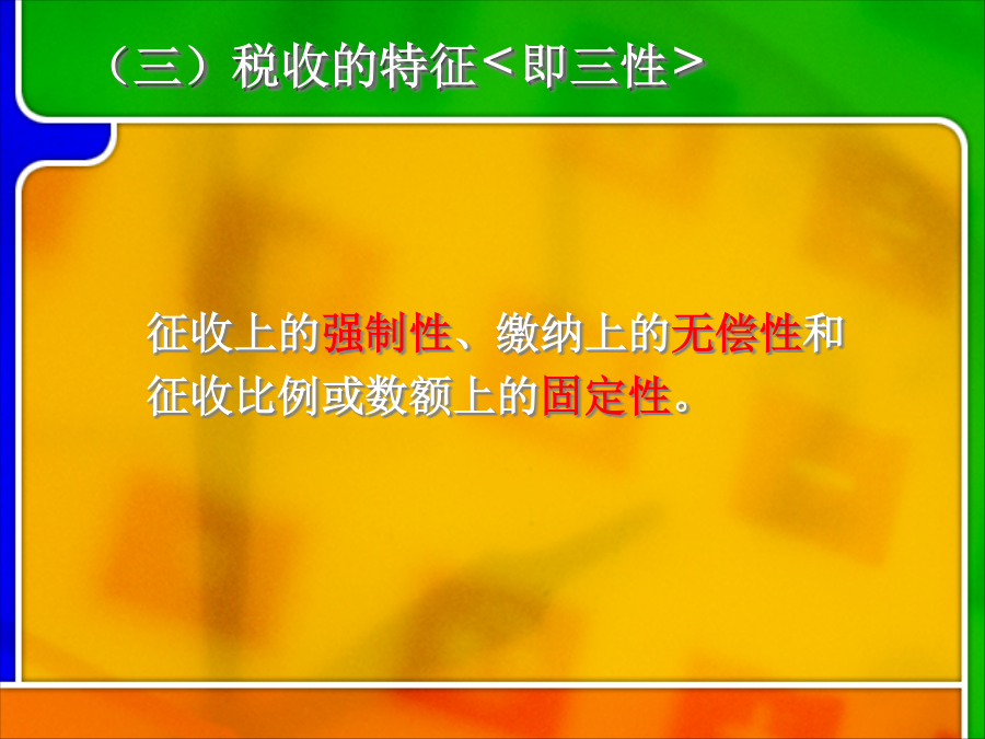 2007年4月法律自考科目税法考前冲刺资料第一章导论(三)税收的特征<即三性>第二节税法概述第三节税法原则第四节税法的分类和构成要素税法详细分类(一)税法详细分类(二)(二)根据各级政府对税收的管理权限为标准划分2.地方税法3.中央和地方共享税法二、税法的构成要素(一)征税主体与纳税主体(三)税率第五节税收法律关系二、税收法律关系的特征四、税收法律关系的产生、变更和终止第二章税收立法第三章增值税法二、增值税的特点第二节增值税的主要法律规定一般纳税人和小规模纳税人划分标准(一)一般纳税人和小规模纳税人划分标准(二)二、增值税的征税范围1.销售货物。销售货物指有偿转让货物所有权。货物指有形动产,包括电力、热力、气体在内。但不包括无形资产和不动产、农业生产者销售的自产农产品。2.进口货物。进口货物应列为增值税的征收范围。3.提供加工、修理修配劳务。但是,单位或个体经营者聘用的员工为本单位或雇主提供加工、修理修配劳务,不包括在内。4.混合销售行为。5.兼营非应税劳务。1.销售货物4.混合销售行为增值税税率应纳增值税额的计算准予从销项税额中抵扣的进项税额,除本条第三款规定情形外,限于下列增值税扣税凭证上注明的增值税额:(一)从销售方取得的增值税专用发票上注明的增值税额;(二)从海关取得的完税凭证上注明的增值税额。(三)购进免税农业产品准予抵扣的进项税额,按照买价和百分之十的扣除率计算。进项税额计算公式:进项税额=买价×扣除率小规模纳税人应纳税额的计算免征增值税