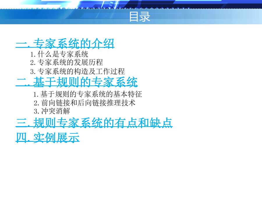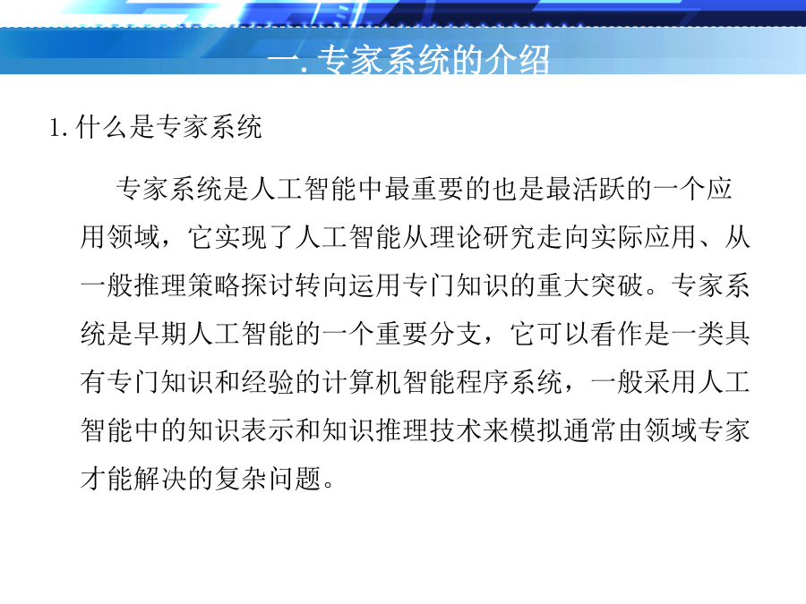 人工智能原理及应用目录一.专家系统的介绍2.专家系统的发展历程专家系统的发展阶段专家系统的发展阶段3.专家系统的构造及工作过程3.专家系统的构造及工作过程3.专家系统的构造及工作过程3.专家系统的构造及工作过程3.专家系统的构造及工作过程3.专家系统的构造及工作过程二.基于规则的专家系统二.基于规则的专家系统二.基于规则的专家系统二.基于规则的专家系统二.基于规则的专家系统二.基于规则的专家系统2.前向链接和后向链接推理技术2.前向链接和后向链接推理技术2.前向链接和后向链接推理技术2.前向链接和后向链接推理技术2.前向链接和后向链接推理技术2.前向链接和后向链接推理技术2.前向链接和后向链接推理技术2.前向链接和后向链接推理技术2.前向链接和后向链接推理技术3.冲突消解3.冲突消解3.冲突消解三.基于规则的专家系统三.基于规则的专家系统三.基于规则的专家系统四.实例展示四.实例展示四.实例展示四.实例展示四.实例展示四.实例展示