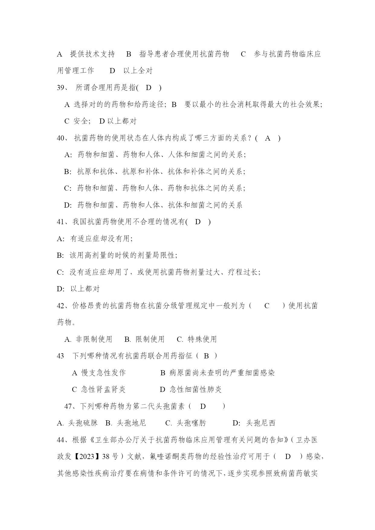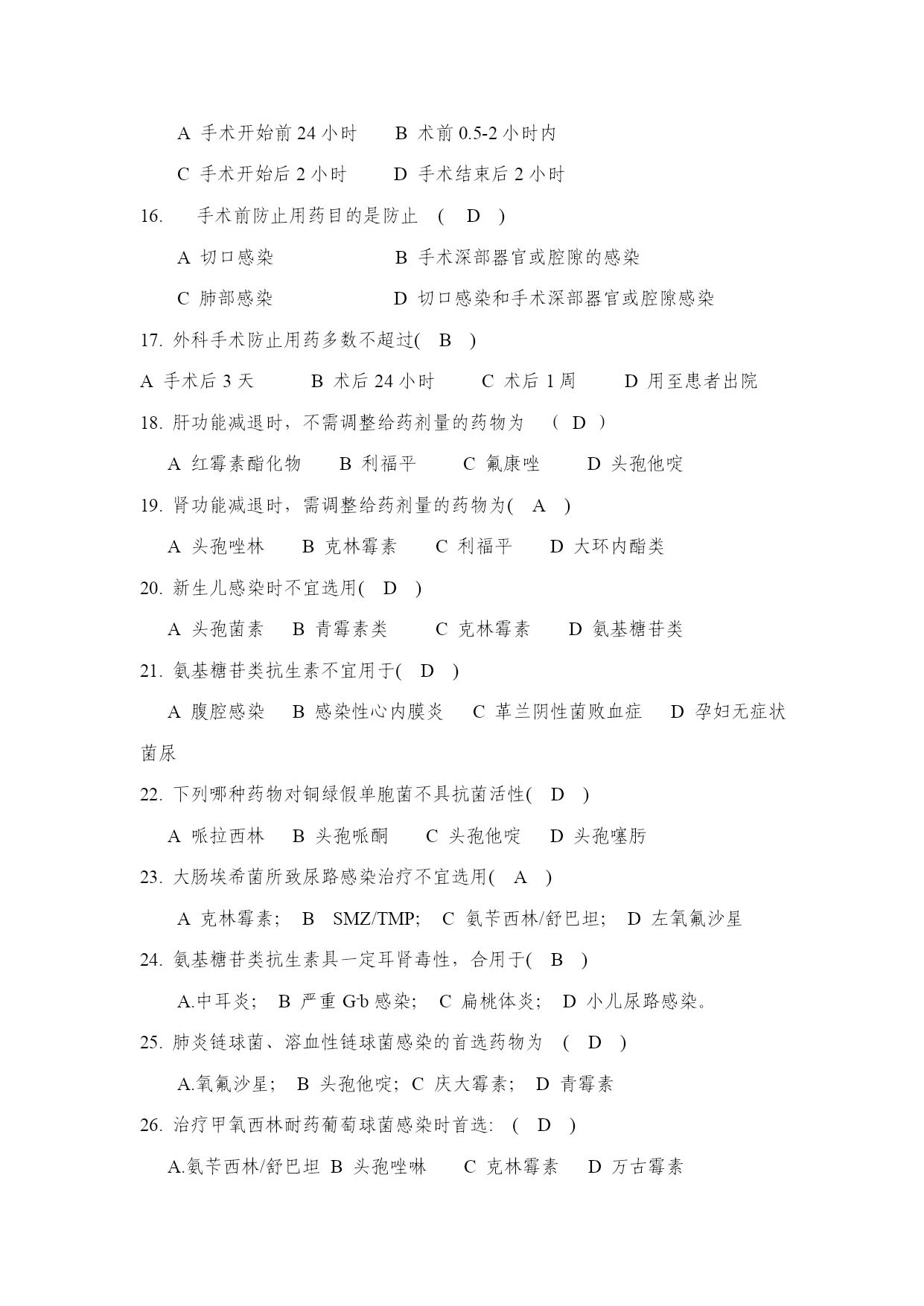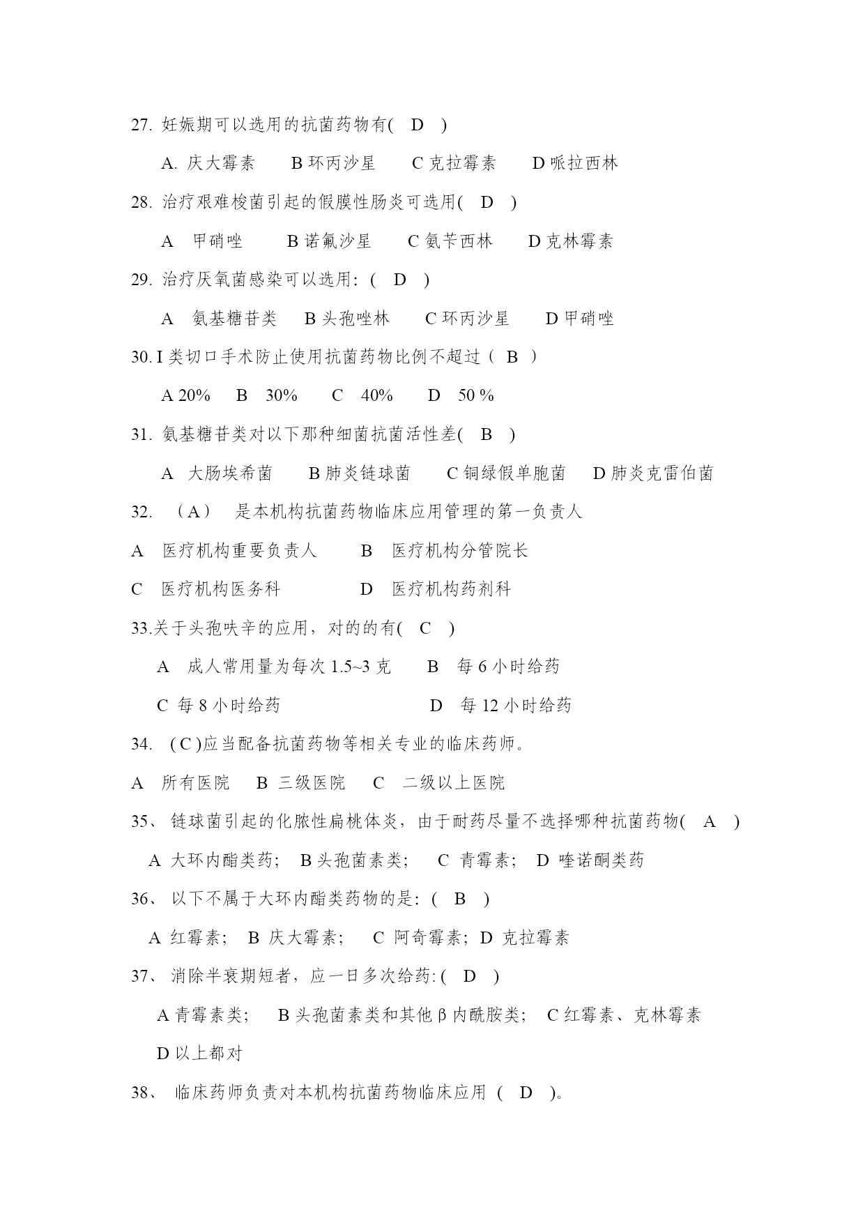 一、单项选择题1《抗菌药物临床应用管理办法》已于2023年2月13日经卫生部部务会审议通过,现予以发布,自(A)起施行。A2023年8月1日B2023年9月1日C2023年5月1日D2023年6月1日2(B)负责本行政区域内医疗机构抗菌药物临床应用的监督管理。A市级以上地方卫生行政部门B县级以上地方卫生行政部门C市级以上地方医疗机构D县级以上地方医疗机构3.关于亚胺培南-西司他丁钠(泰能),下列说法不对的的是(C)A.是一种广谱的β-内酰胺类抗菌药物B.推荐的天天最高总剂量不超过天天50毫克/公斤体重或天天4克C.亚胺培南与西司他丁钠的重量比为2:1D.嗜麦芽窄食单胞菌感染时不宜选用4.关于注射用头孢哌酮钠舒巴坦钠,下列说法不对的的是(B)A.对青霉素或头孢菌素类抗生素过敏者禁用B.成人每平常用量为4-6克C.应用本品时应避免饮用品有酒精的饮料D.部分病人用本品可引起维生素K缺少和低凝血酶原血症5.抗菌药物分级管理目录由各(B)制定,报()备案。A市级卫生行政部门制定省级卫生行政部门B省级卫生行政部门卫生部C本地医疗机构本地卫生行政部门D本地医疗机构上级卫生行政部门6.关于头孢菌素类药物,下列说法不对的的是(D)。A.一代头孢对革兰阳性菌作用强,对革兰阴性菌作用弱B.三代头孢对革兰阴性菌作用强,对革兰阳性菌作用弱C.一、二代头孢对铜绿假单胞菌几乎无作用,而三代头孢中头孢哌酮,头孢他啶等有作用D.头孢吡肟、头孢米诺属于第四代头孢菌素7、氟康唑和伊曲康唑不推荐用于几个月以下婴儿?(C)A.2B.4C.6D.8E.108对的的抗菌治疗方案需考虑:(D)。A患者感染病情B.感染的病原菌种类C.抗菌药作用特点D.以上都对9.可辅以抗菌药局部应用的情况有:(C)A化脓性胸膜炎大量胸腔积液B反复发作性尿路感染C包裹性厚壁脓肿D化脓性腹膜炎10.下列哪种情况有抗菌药联合用药指征:(B)A慢支急性发作B病原菌尚未查明的严重细菌感染C急性肾盂肾炎D急性细菌性肺炎11.抗菌药物分级管理是为了(C)A规范抗菌药物按一、二、三线使用B按感染病情轻重分别用药C抗菌药物临床合理使用的管理12.限制使用类抗菌药是限制:(A)A抗菌药应用适应证和合用人群B限制抗菌药作二线使用C限制抗菌药用于重症感染患者13.下列情况何种是防止用药的适应证(D)A昏迷B中毒C上呼吸道感染D人工关节移植手术14.防止用药用于何种情况也许有效(D)A用于防止任何细菌感染B长期用药防止C晚期肿瘤患者D风湿热复发15.外科手术前防止用药应在何时使用(B)A手术开始前24小时B术前0.5-2小时内C手术开始后2小时D手术结束后2小时16.手术前防止用药目的是防止(D)A切口感染B手术深部器官或腔隙的感染C肺部感染D切口感染和手术深部器官或腔隙感染17.外科手术防止用药多数不超过(B)A手术后3天B术后24小时C术后1周D用至患者出院18.肝功能减退时,不需调整给药剂量的药物为(D)A红霉素酯化物B利福平C氟康唑D头孢他啶19.肾功能减退时,需调整给药剂量的药物为(A)A头孢唑林B克林霉素C利福平D大环内酯类20.新生儿感染时不宜选用(D)A头孢菌素B青霉素类C克林霉素D氨基糖苷类21.氨基糖苷类抗生素不宜用于(D)A腹腔感染B感染性心内膜炎C革兰阴性菌败血症D孕妇无症状菌尿22.下列哪种药物对铜绿假单胞菌不具抗菌活性(D)A哌拉西林B头孢哌酮C头孢他啶D头孢噻肟23.大肠埃希菌所致尿路感染治疗不宜选用(A)A克林霉素;BSMZ/TMP;C氨苄西林/舒巴坦;D左氧氟沙星24.氨基糖苷类抗生素具一定耳肾毒性,合用于(B)A.中耳炎;B严重G-b感染;C扁桃体炎;D小儿尿路感染。25.肺炎链球菌、溶血性链球菌感染的首选药物为(D)A.氧氟沙星;B头孢他啶;C庆大霉素;D青霉素26.治疗甲氧西林耐药葡萄球菌感染时首选:(D)A.氨苄西林/舒巴坦B头孢唑啉C克林霉素D万古霉素27.妊娠期可以选用的抗菌药物有(D)A.庆大霉素B环丙沙星C克拉霉素D哌拉西林28.治疗艰难梭菌引起的假膜性肠炎可选用(D)A甲硝唑B诺氟沙星C氨苄西林D克林霉素29.治疗厌氧菌感染可以选用:(D)A氨基糖苷类B头孢唑林C环丙沙星D甲硝唑30.I类切口手术防止使用抗菌药物比例不超过(B)A20%B30%C40%D50%31.氨基糖苷类对以下那种细菌抗菌活性差(B)A大肠埃希菌B肺炎链球菌C铜绿假单胞菌D肺炎克雷伯菌32.(A)是本机构抗菌药物临床应用管理的第一负责人A医疗机构重要负责人B医疗机构分管院长C医疗机构医务科D医疗机构药剂科33.关于头孢呋辛的应用,对的的有(C)A成人常用量为每次1.5~3克B每6小时给药C每8小时给药D每12小时给药34.(C)应当配备抗菌药物等相关专业的临床药师。A所有医院B三级医院C二级以上