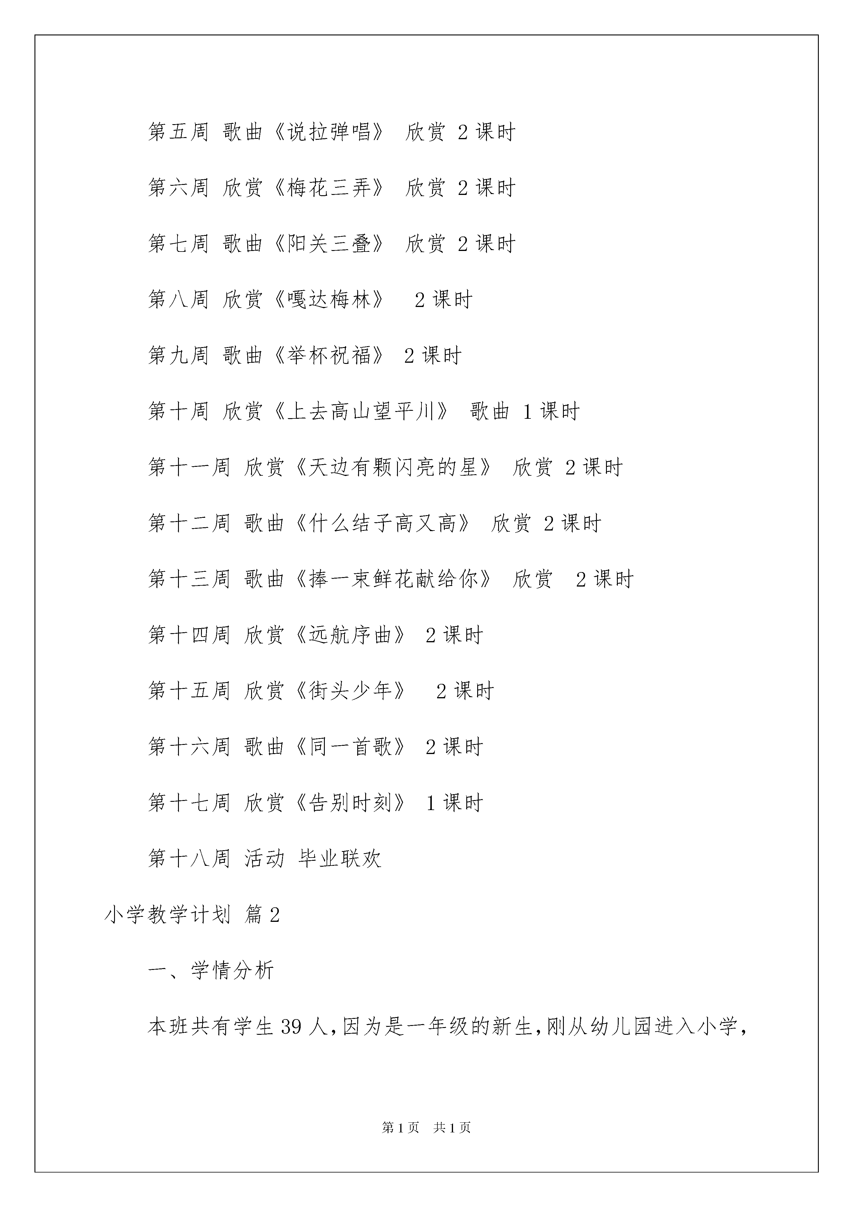 2022小学教学计划范文合集8篇小学教学计划范文合集8篇时光在流逝,从不停歇,我们又将迎来新的喜悦、新的收获,写好计划才不会让我们努力的时候迷失方向哦。相信许多人会觉得计划很难写?以下是我收集整理的小学教学计划8篇,仅供参考,希望能够帮助到大家。小学教学计划篇1一、教材分析:从教育理念上,强调“以学生发展为本”以往的教材,往往从教师的“教”考虑较多,无论从教材内容的构件、教学方法的思路等等都强调以教师为主,很少考虑学生的学。它的理念是建立在“教学中心论”上,强调教师作为教育的主体,学生通过教师的教、传授去获取知识,因此学生往往处于被动的状态中学习。现代教育的理念,强调学生的学,以学生为本,教材组成员们通过学习,认识到要从持续发展、终身教育的视角去考虑问题,所以不仅是以学生为本,还要强调其发展,所以定为“以学生发展为本”的理念。二、学生知识能力分析:音乐教育要面对全体学生,也应当注意学生的个性发展音乐教育的目标之一就是要完善学生的个性。众所周知,学生的音乐能力都会因为先天的遗传因素和后天的教育条件不同而形成巨大的差异。我们六年级学生基础不是很好,因而其音乐兴趣、音乐潜能、音乐生活的方式也会有所不同。音乐本身的非语义性及音乐艺术的自由性和多样性,给接受者对音乐的多解性和个性化的演绎提供了广阔的舞台。三、教学目标1、演唱学习自然呼吸,不耸肩,养成良好习惯,注意咬字、吐字清晰准确,做到有表情唱歌。2、聆听欣赏优秀儿童歌曲,初步感受活泼、雄壮、优美抒情等不同歌曲和乐器。3、合唱学习多声部歌曲,做到音准、和协、动听。4、识谱认识反复记号等以及练习多种节奏类型。四、教学要求:1、突出音乐学科特点,把德育教育与音乐教育相结合。2、启迪智慧,陶冶情操,培养审美情趣,使身心得到健康发展。3、使学生掌握浅显音乐知识和简单音乐技能,培养对音乐的兴趣和爱好。4、了解中外优秀音乐作品,使学生具有初步感受音乐和表现音乐的能力。五、教学重点:学唱歌曲聆听音乐六、教学方法:兴趣是最好的老师.兴趣是最好的老师,把激发学生学习音乐的兴趣贯穿于始终。在组织音乐教学活动时,都应充分挖掘音乐作品的艺术内容和情感内涵,发挥音乐作品的艺术魅力,创造性地设计生动活泼的教学形式,以激发、培养、发展学生的音乐兴趣及爱好。七、教学进度第一周预习课本第二周歌曲《爱的奉献》欣赏《欢乐颂》2课时第三周歌曲《歌声与微笑》欣赏《爱星满天>2课时第四周欣赏《重整河山待后生》欣赏2课时第五周歌曲《说拉弹唱》欣赏2课时第六周欣赏《梅花三弄》欣赏2课时第七周歌曲《阳关三叠》欣赏2课时第八周欣赏《嘎达梅林》2课时第九周歌曲《举杯祝福》2课时第十周欣赏《上去高山望平川》歌曲1课时第十一周欣赏《天边有颗闪亮的星》欣赏2课时第十二周歌曲《什么结子高又高》欣赏2课时第十三周歌曲《捧一束鲜花献给你》欣赏2课时第十四周欣赏《远航序曲》2课时第十五周欣赏《街头少年》2课时第十六周歌曲《同一首歌》2课时第十七周欣赏《告别时刻》1课时第十八周活动毕业联欢小学教学计划篇2一、学情分析本班共有学生39人,因为是一年级的新生,刚从幼儿园进入小学,年龄较小,活泼好动,自律性差,注意力难以集中,行为习惯尚在养成阶段。对于学校班级的各项纪律、常规都不了解,心中集体主义观念还未形成,根本不知晓学习知识的重要性,学习目的还未明确,学习只是出自一时的爱好,课堂上专心听讲难以坚持。但天性使然,学生的好奇心很重,可塑性很强,内心很渴望教师真诚的赞扬,这一切都需要老师在平时的教学中不断提醒、纠正、督促,使其尽快适应学校生活,形成良好的学习习惯,受益终身。二、学期教材内容及教学目标教材内容分析:本册教科书按照主题单元编排学习内容,在“我上学了”之后,安排了2个识字单元、2个汉语拼音单元和4个课文单元,每个单元的学习内容各有侧重。教科书的开篇,从学生视角出发,以“我上学了”为主题,采用参与式和体验式学习相结合的方式,安排“我是中国人”“我是小学生”和“我爱学语文”3个活动板块,引导学生顺利进行角色转换和身份认同,同时体验语文学习的快乐,激发语文学习的兴趣,初步培养良好的学习习惯。汉语拼音共2个单元13课,拼音与识字学词整合设计、同步进行。综合考虑各方面因素,精选学习内容,避免增加学习负担。集中学习拼音之前,先安排1个识字单元,学习最简单的常用汉字,然后再系统学习拼音,由熟悉的语言带出拼音的学习,使拼音与识字相辅相成、相互促进。识字的编排遵循识写分流、多识少写的原则,全册要求认识300个常用字(在课后以双横线标示),要求会写其中的100个字(在课后以田字格标示)。重视打好识字写字基础,结合识字