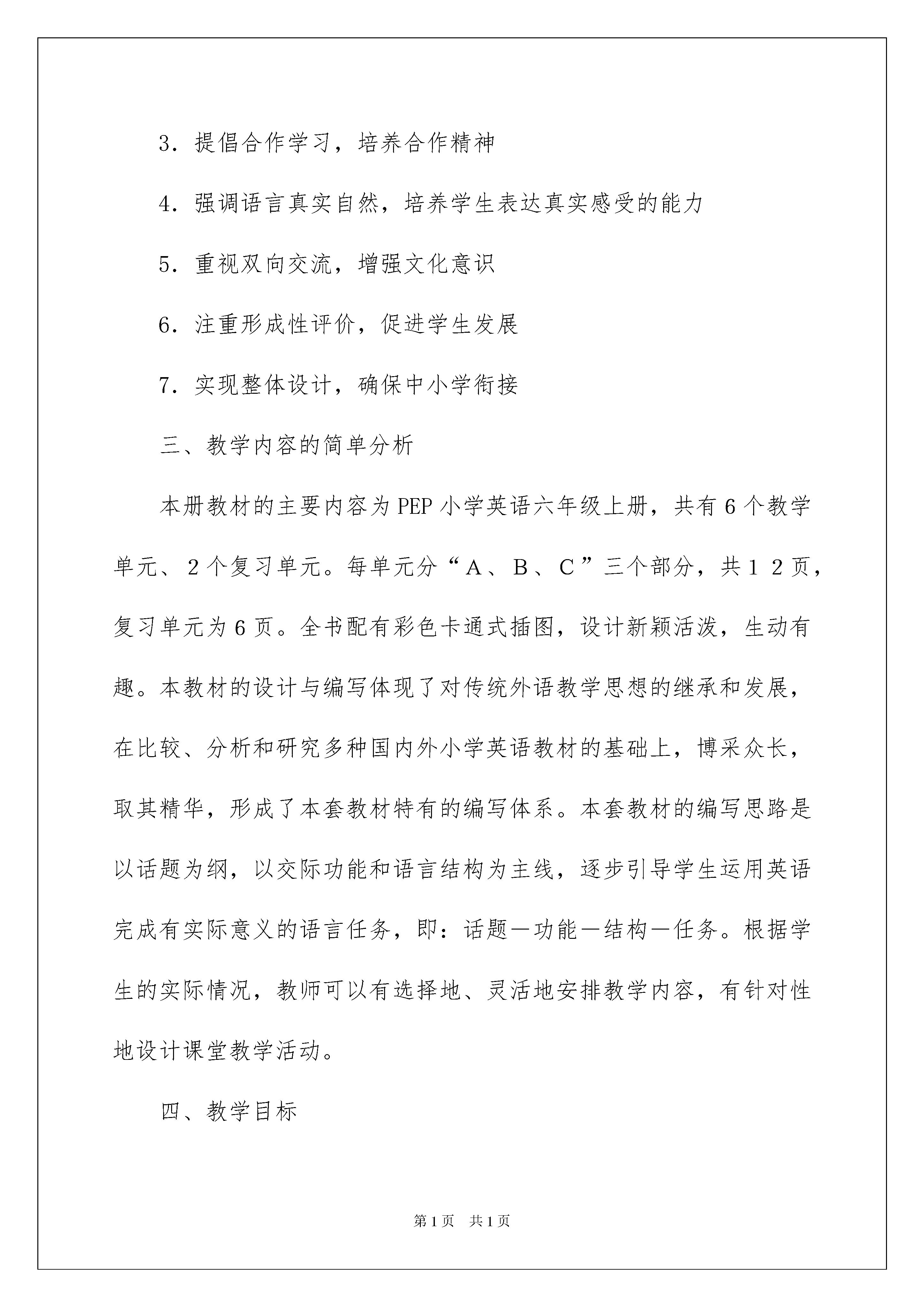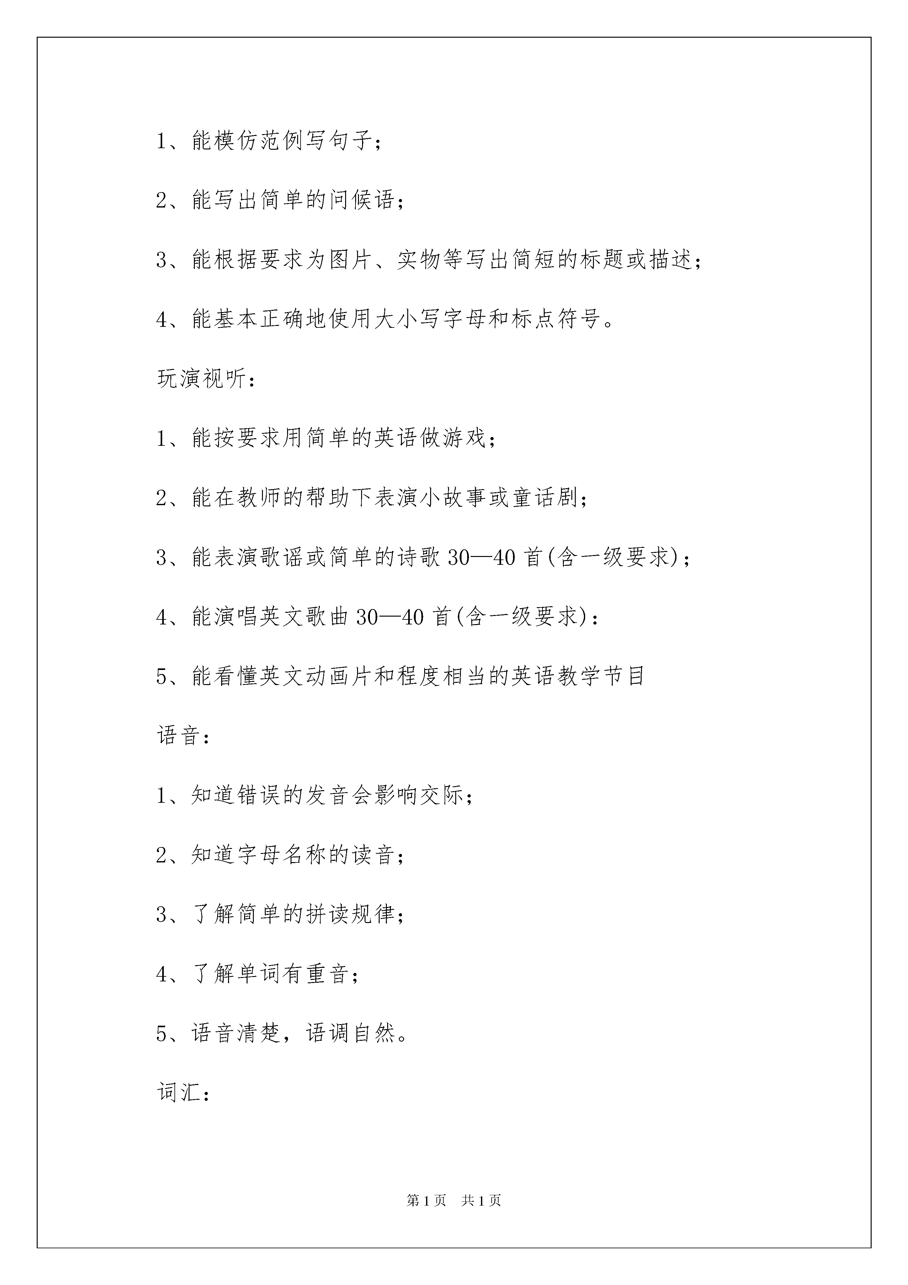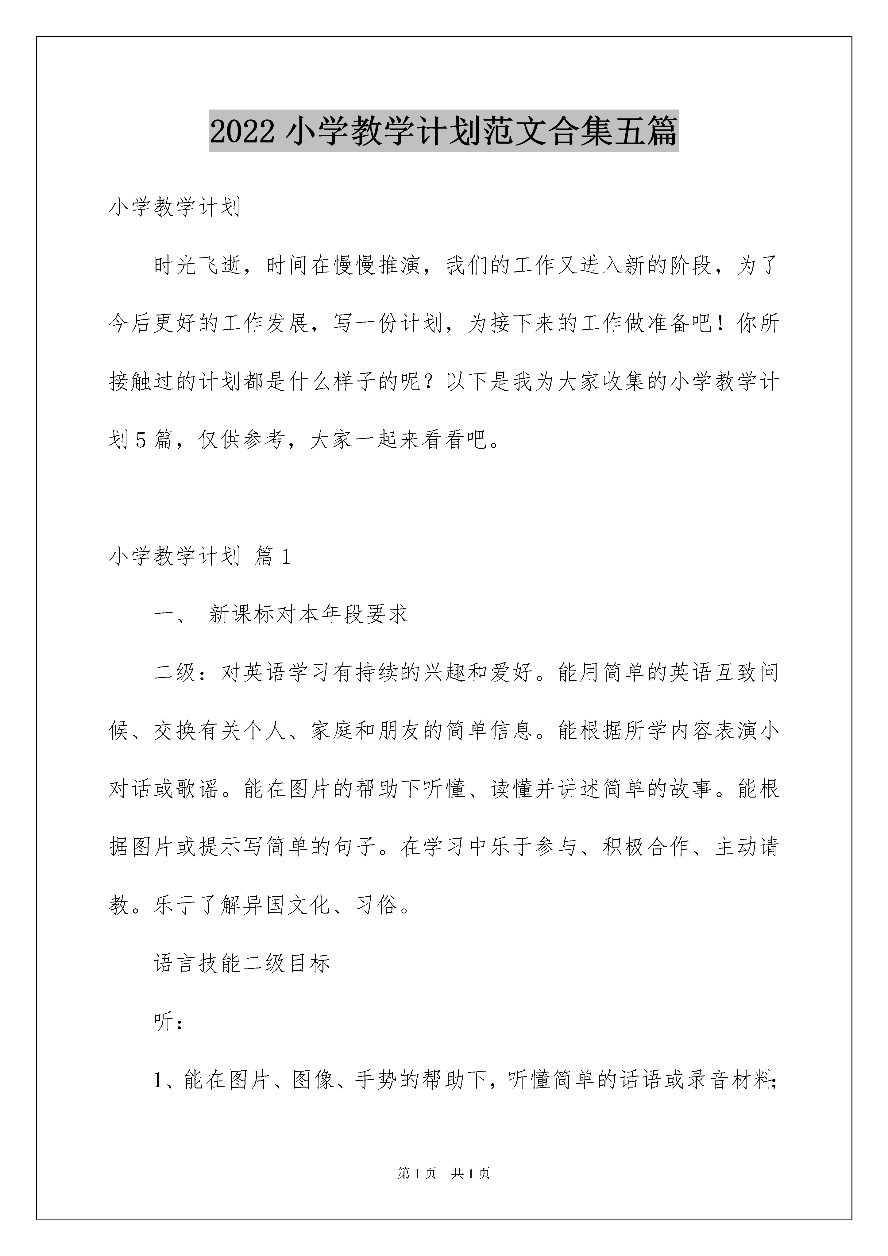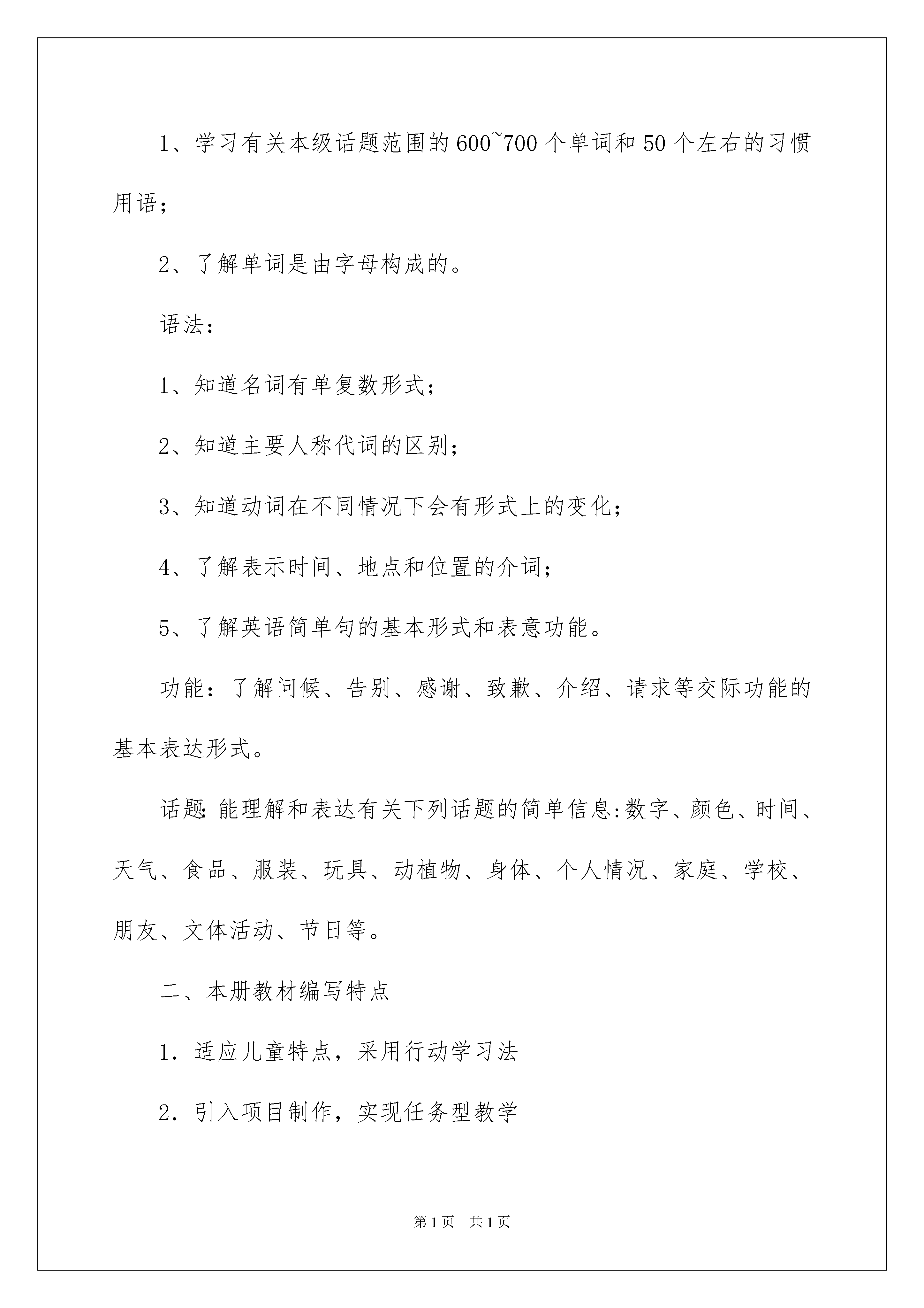2022小学教学计划范文合集五篇小学教学计划时光飞逝,时间在慢慢推演,我们的工作又进入新的阶段,为了今后更好的工作发展,写一份计划,为接下来的工作做准备吧!你所接触过的计划都是什么样子的呢?以下是我为大家收集的小学教学计划5篇,仅供参考,大家一起来看看吧。小学教学计划篇1一、新课标对本年段要求二级:对英语学习有持续的兴趣和爱好。能用简单的英语互致问候、交换有关个人、家庭和朋友的简单信息。能根据所学内容表演小对话或歌谣。能在图片的帮助下听懂、读懂并讲述简单的故事。能根据图片或提示写简单的句子。在学习中乐于参与、积极合作、主动请教。乐于了解异国文化、习俗。语言技能二级目标听:1、能在图片、图像、手势的帮助下,听懂简单的话语或录音材料;2、能听懂简单的配图小故事;3、能听懂课堂活动中简单的提问;4、能听懂常用指令和要求并做出适当反应。说:1、能在口头表达中做到发音清楚、语调达意;2、能就所熟悉的个人和家庭情况进行简短对话;3、能运用一些最常用的日常套语(如问候、告别、致谢、致歉等);4、能在教师的帮助下讲述简单的小故事。读:1、能认读所学词语;2、能根据拼读的规律,读出简单的单词;3、能读懂教材中简短的要求或指令;4、能看懂贺卡等所表达的简单信息;5、能借助图片读懂简单的故事或小短文,并养成按意群阅读的习惯;6、能正确朗读所学故事或短文。写:1、能模仿范例写句子;2、能写出简单的问候语;3、能根据要求为图片、实物等写出简短的标题或描述;4、能基本正确地使用大小写字母和标点符号。玩演视听:1、能按要求用简单的英语做游戏;2、能在教师的帮助下表演小故事或童话剧;3、能表演歌谣或简单的诗歌30—40首(含一级要求);4、能演唱英文歌曲30—40首(含一级要求):5、能看懂英文动画片和程度相当的英语教学节目语音:1、知道错误的发音会影响交际;2、知道字母名称的读音;3、了解简单的拼读规律;4、了解单词有重音;5、语音清楚,语调自然。词汇:1、学习有关本级话题范围的600~700个单词和50个左右的习惯用语;2、了解单词是由字母构成的。语法:1、知道名词有单复数形式;2、知道主要人称代词的区别;3、知道动词在不同情况下会有形式上的变化;4、了解表示时间、地点和位置的介词;5、了解英语简单句的基本形式和表意功能。功能:了解问候、告别、感谢、致歉、介绍、请求等交际功能的基本表达形式。话题:能理解和表达有关下列话题的简单信息:数字、颜色、时间、天气、食品、服装、玩具、动植物、身体、个人情况、家庭、学校、朋友、文体活动、节日等。二、本册教材编写特点1.适应儿童特点,采用行动学习法2.引入项目制作,实现任务型教学3.提倡合作学习,培养合作精神4.强调语言真实自然,培养学生表达真实感受的能力5.重视双向交流,增强文化意识6.注重形成性评价,促进学生发展7.实现整体设计,确保中小学衔接三、教学内容的简单分析本册教材的主要内容为PEP小学英语六年级上册,共有6个教学单元、2个复习单元。每单元分“A、B、C”三个部分,共12页,复习单元为6页。全书配有彩色卡通式插图,设计新颖活泼,生动有趣。本教材的设计与编写体现了对传统外语教学思想的继承和发展,在比较、分析和研究多种国内外小学英语教材的基础上,博采众长,取其精华,形成了本套教材特有的编写体系。本套教材的编写思路是以话题为纲,以交际功能和语言结构为主线,逐步引导学生运用英语完成有实际意义的语言任务,即:话题-功能-结构-任务。根据学生的实际情况,教师可以有选择地、灵活地安排教学内容,有针对性地设计课堂教学活动。四、教学目标本套教材的教学目的是激发学生学习英语的兴趣,培养他们学习英语的积极态度,使他们初步建立学习英语的自信心;培养学生具有一定的语感和良好的语音、语调、书写基础,以及良好的学习习惯;使他们初步具备用英语进行简单日常交流的能力。同时培养学生的观察、记忆、思维、想象和创造能力。适当介绍中西方文化,培养学生的爱国主义精神,增强世界意识,为学生的进一步学习奠定良好的基础。文化的同时,也学会用英语向外国人介绍中华民族的优秀文化传统,真正实现跨文化交际。1.能听、说、读、写71个单词和短语以及10组句子和7个单句。要求能在真实语境中正确运用并能读懂简短语篇。2.能听、说、认读16个单词。3.能完成1个手工制作。4.能听懂、会唱8首歌曲。5.能听懂、会吟唱8首歌谣。6.能完成6个自我评价活动。7.能理解6个幽默小故事。8.能了解6项简单的中西方文化知识。五、教学重难点教学重点:能听、说、读、写71个单词和短语以及10组句子和7个单句。要求能在真实语境中正确运