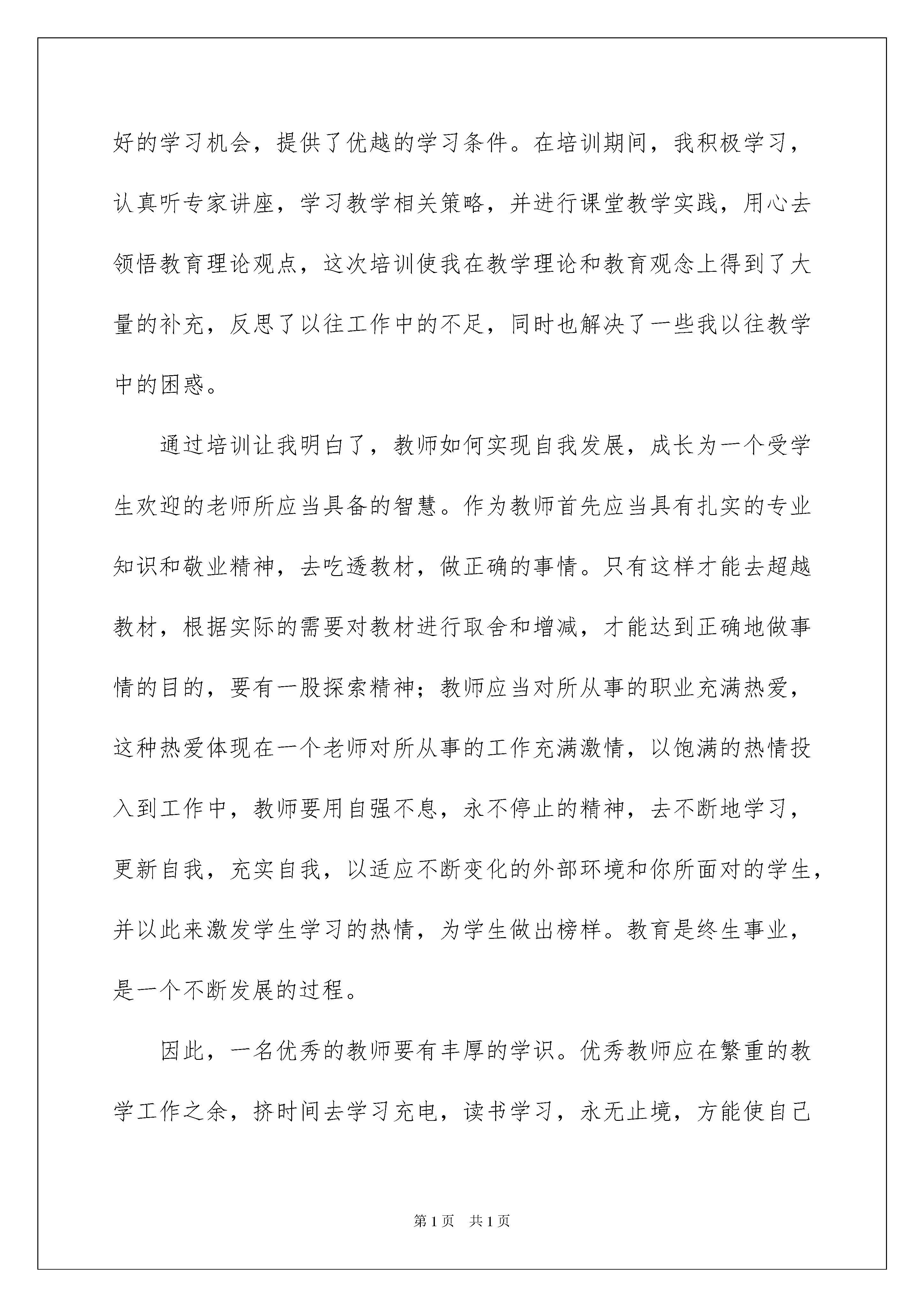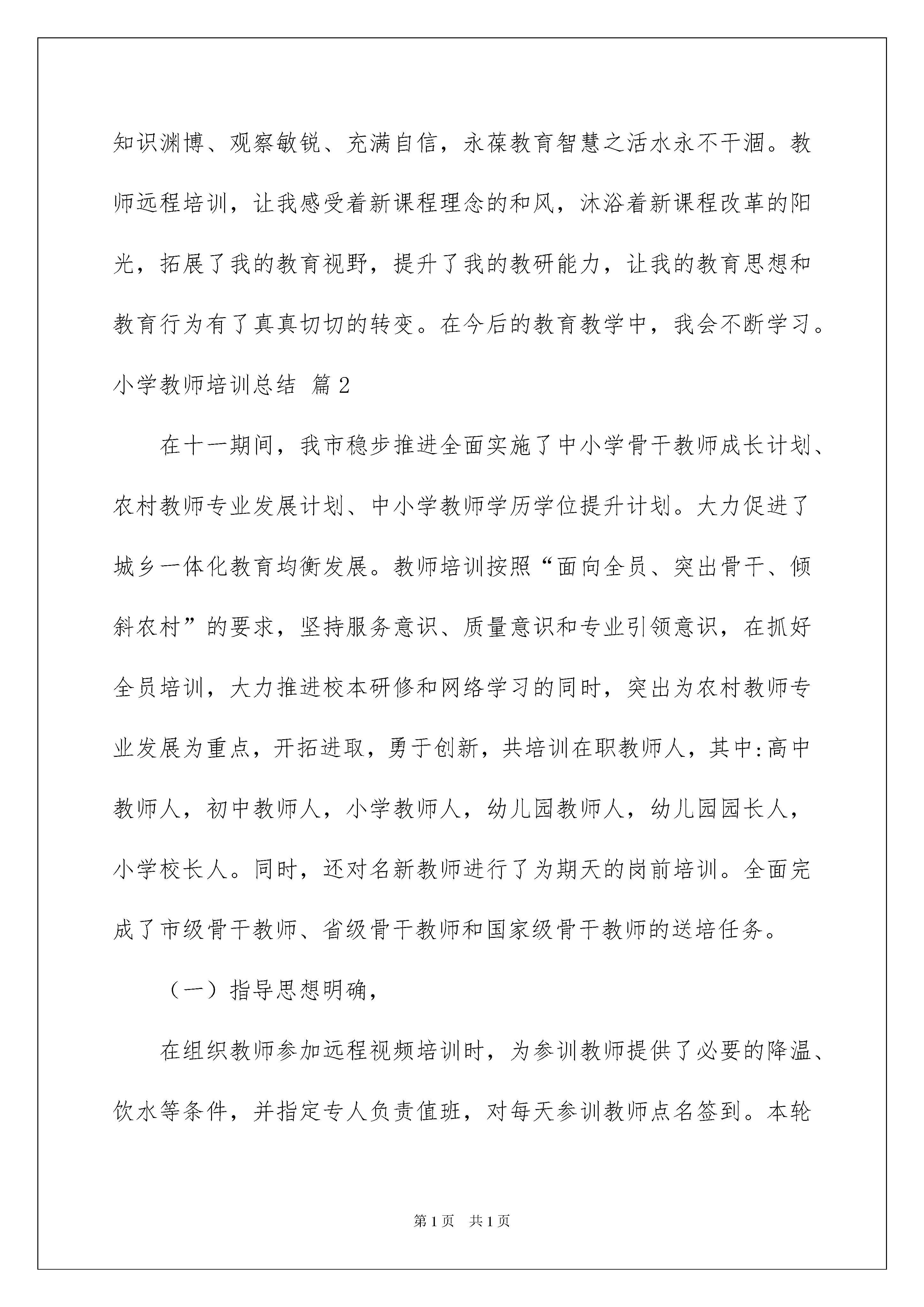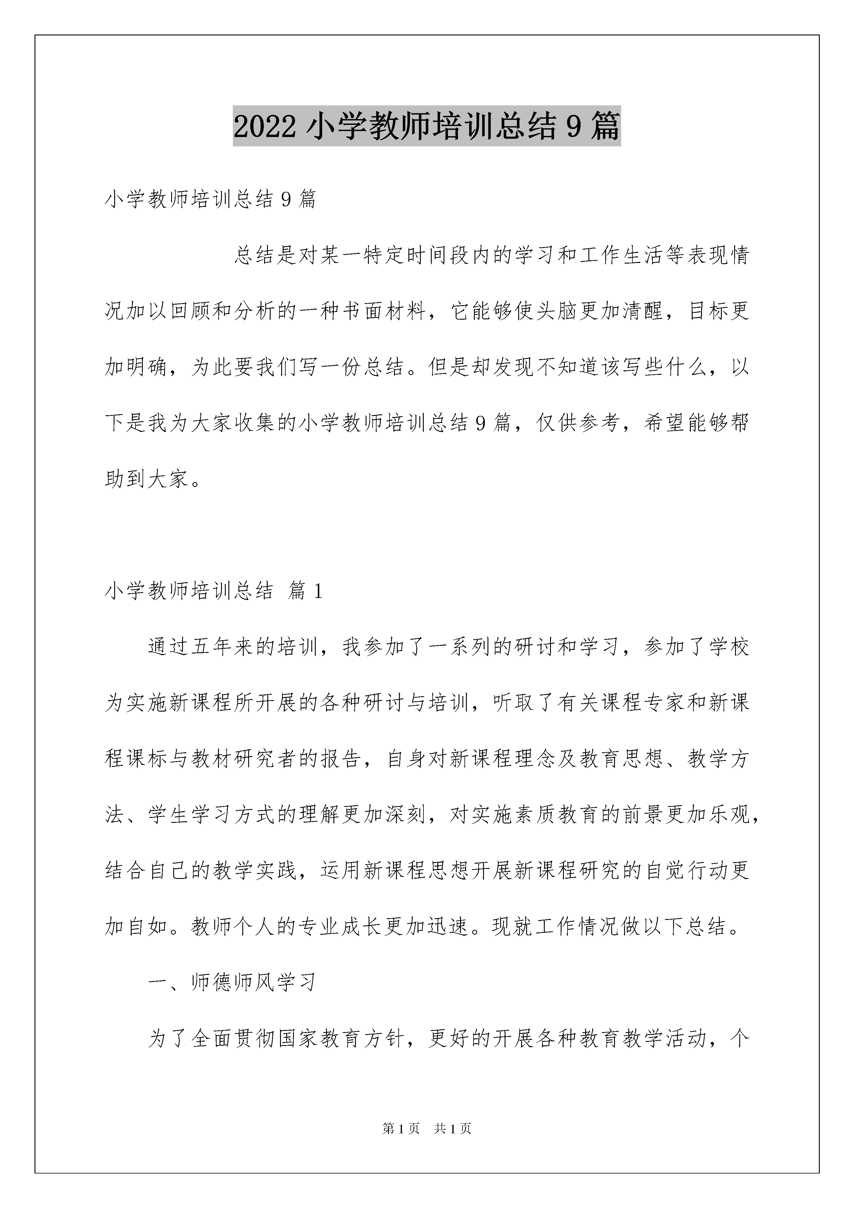 2022小学教师培训总结9篇小学教师培训总结9篇总结是对某一特定时间段内的学习和工作生活等表现情况加以回顾和分析的一种书面材料,它能够使头脑更加清醒,目标更加明确,为此要我们写一份总结。但是却发现不知道该写些什么,以下是我为大家收集的小学教师培训总结9篇,仅供参考,希望能够帮助到大家。小学教师培训总结篇1通过五年来的培训,我参加了一系列的研讨和学习,参加了学校为实施新课程所开展的各种研讨与培训,听取了有关课程专家和新课程课标与教材研究者的报告,自身对新课程理念及教育思想、教学方法、学生学习方式的理解更加深刻,对实施素质教育的前景更加乐观,结合自己的教学实践,运用新课程思想开展新课程研究的自觉行动更加自如。教师个人的专业成长更加迅速。现就工作情况做以下总结。一、师德师风学习为了全面贯彻国家教育方针,更好的开展各种教育教学活动,个人师德的修行是一个很重要的环节,有关教师职业道德素质的理论书籍,有关教育方面的各项法律法规,自身的理论和道德素质有了一定的提高,形成了热爱教育,爱岗敬业,脚踏实际的工作作风,严谨治学、钻研业务、尊重学生,一切为了学生的终身发展,相互协作,维护集体荣誉,为人师表,严于律己,树立教师新形象,期间,撰写有关学习心得。个人师德修养与自我约束、自我完善的机制逐步形成。责任感是师德师风的基础对教育工作的强烈责任感是一种高尚的职业道德情感,也是爱岗敬业,热爱教育的师德师风原则的具体体现。职业感是师德师风的前提,其中教师职业最神圣最受人敬重。一个热爱教育、献身教育的教师必然对教师这一职业的重要性有深刻的认识。教师强烈的事业心是师德师风的条件事业心来源于职业感,责任感,是一种坚定的职业信念,是把自己所从事的工作上升到伟大事业的高度来看待追求,不论遇到什么困难都坚信自己的选择。强烈的责任感,职业感和事业心是爱岗敬业得重要表现,而爱岗敬业是师德师风的重要基础,我们应该首先在强化净化师德师风。二、小学教师远程培训小学教师远程培训,这次小学远程培训活动,为我们教师创造良好的学习机会,提供了优越的学习条件。在培训期间,我积极学习,认真听专家讲座,学习教学相关策略,并进行课堂教学实践,用心去领悟教育理论观点,这次培训使我在教学理论和教育观念上得到了大量的补充,反思了以往工作中的不足,同时也解决了一些我以往教学中的困惑。通过培训让我明白了,教师如何实现自我发展,成长为一个受学生欢迎的老师所应当具备的智慧。作为教师首先应当具有扎实的专业知识和敬业精神,去吃透教材,做正确的事情。只有这样才能去超越教材,根据实际的需要对教材进行取舍和增减,才能达到正确地做事情的目的,要有一股探索精神;教师应当对所从事的职业充满热爱,这种热爱体现在一个老师对所从事的工作充满激情,以饱满的热情投入到工作中,教师要用自强不息,永不停止的精神,去不断地学习,更新自我,充实自我,以适应不断变化的外部环境和你所面对的学生,并以此来激发学生学习的热情,为学生做出榜样。教育是终生事业,是一个不断发展的过程。因此,一名优秀的教师要有丰厚的学识。优秀教师应在繁重的教学工作之余,挤时间去学习充电,读书学习,永无止境,方能使自己知识渊博、观察敏锐、充满自信,永葆教育智慧之活水永不干涸。教师远程培训,让我感受着新课程理念的和风,沐浴着新课程改革的阳光,拓展了我的教育视野,提升了我的教研能力,让我的教育思想和教育行为有了真真切切的转变。在今后的教育教学中,我会不断学习。小学教师培训总结篇2在十一期间,我市稳步推进全面实施了中小学骨干教师成长计划、农村教师专业发展计划、中小学教师学历学位提升计划。大力促进了城乡一体化教育均衡发展。教师培训按照“面向全员、突出骨干、倾斜农村”的要求,坚持服务意识、质量意识和专业引领意识,在抓好全员培训,大力推进校本研修和网络学习的同时,突出为农村教师专业发展为重点,开拓进取,勇于创新,共培训在职教师人,其中:高中教师人,初中教师人,小学教师人,幼儿园教师人,幼儿园园长人,小学校长人。同时,还对名新教师进行了为期天的岗前培训。全面完成了市级骨干教师、省级骨干教师和国家级骨干教师的送培任务。(一)指导思想明确,在组织教师参加远程视频培训时,为参训教师提供了必要的降温、饮水等条件,并指定专人负责值班,对每天参训教师点名签到。本轮高中课程改革教师远程视频培训省培、国培共281人,培训合格率100%。(二)加强常规培训1.全员培训我市有6千多名教师,每名教师每年接受不少于50学时的规范化培训。培训内容以人为本,贴近教师、贴近教学、讲求实效,注重培训的针对性和实效性;培训形式上突出教师选择性,加强过程监控和结果管