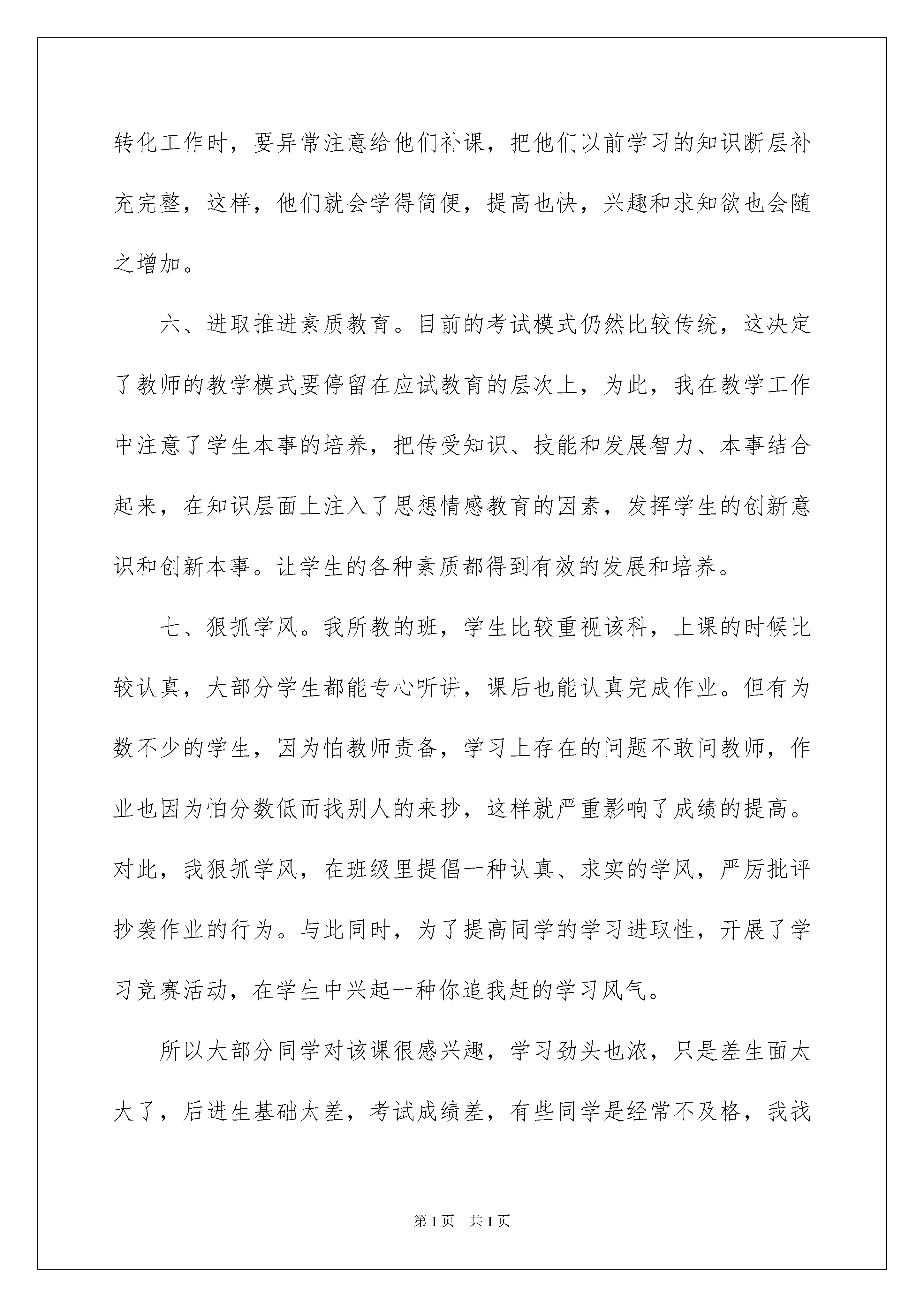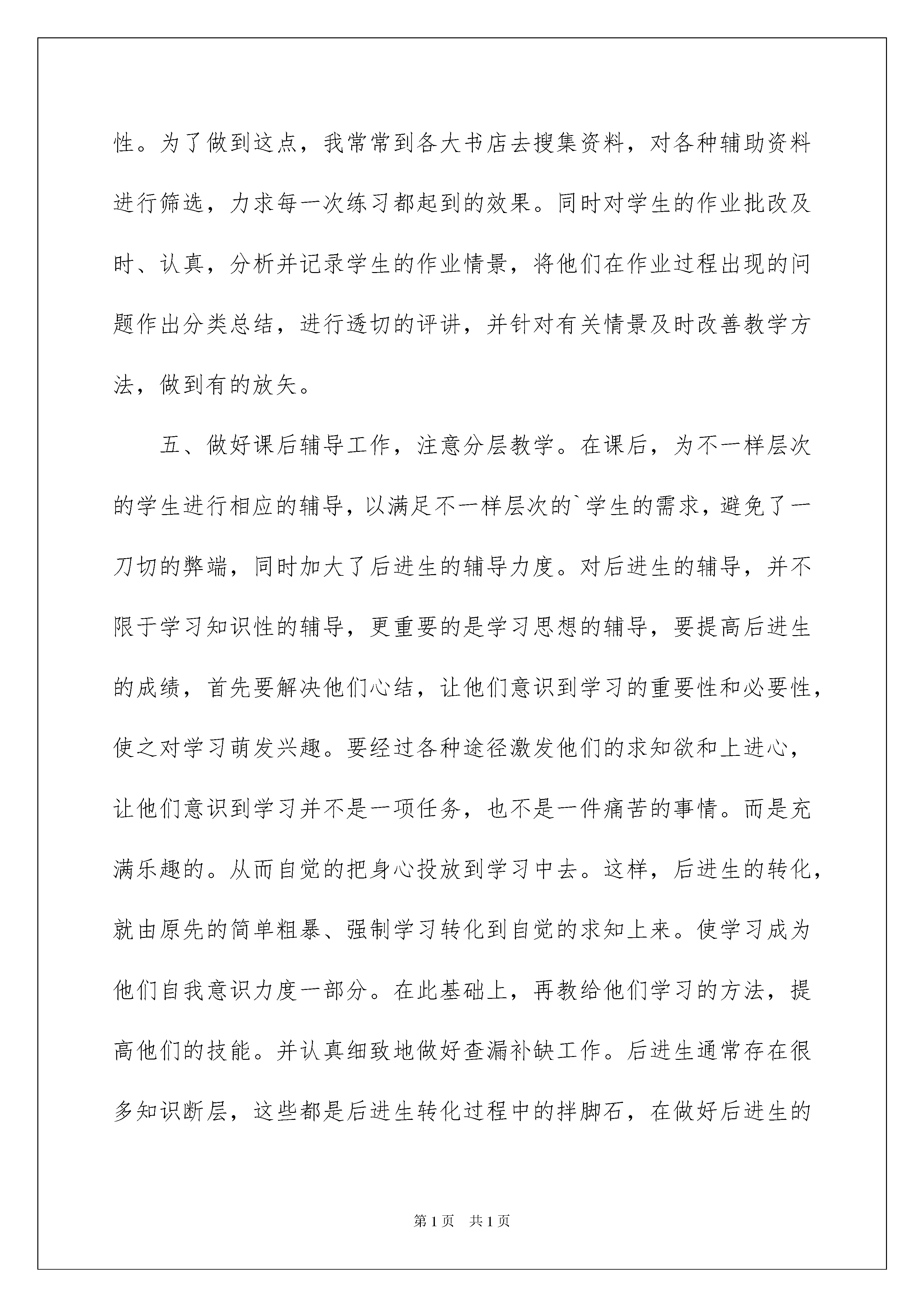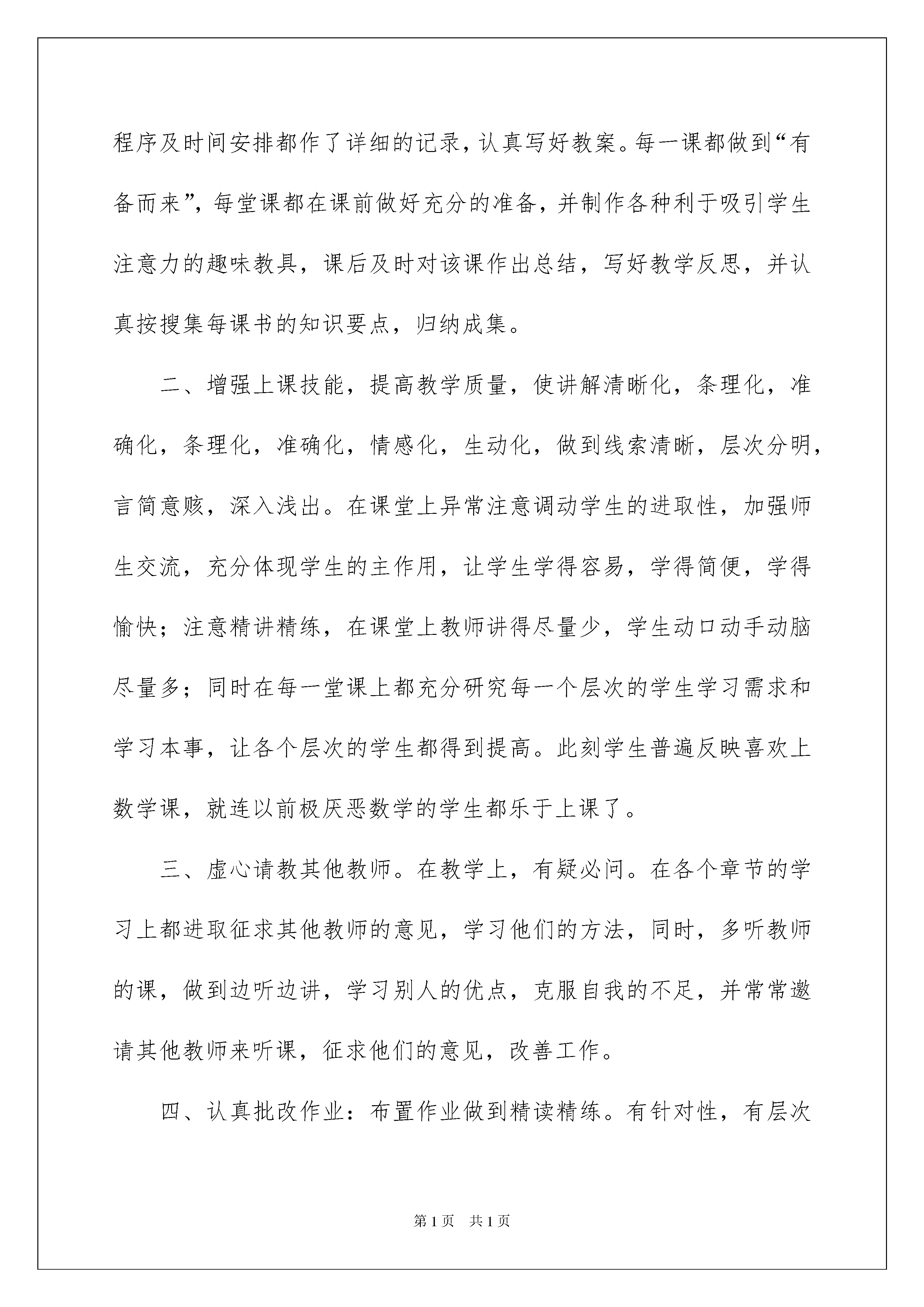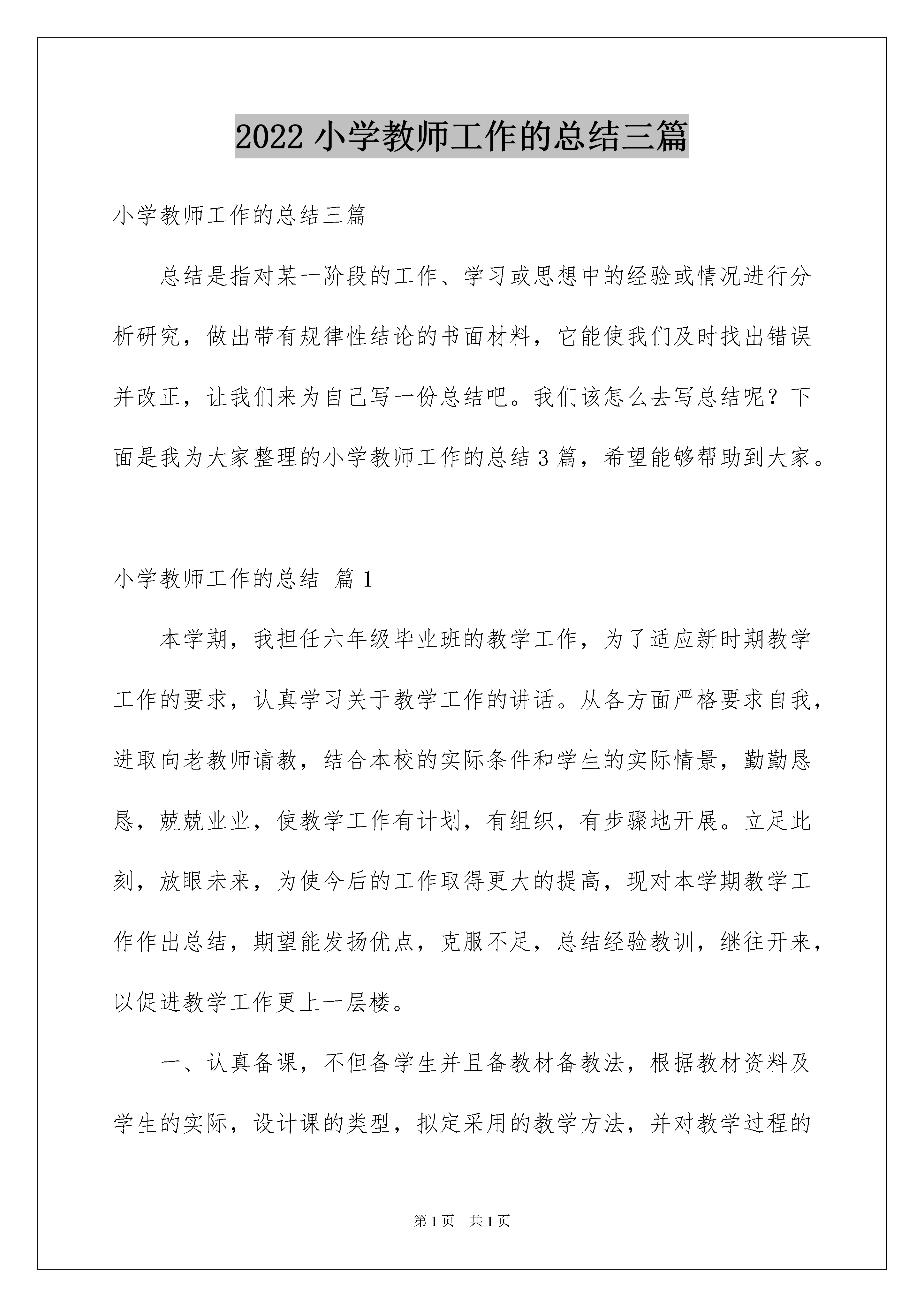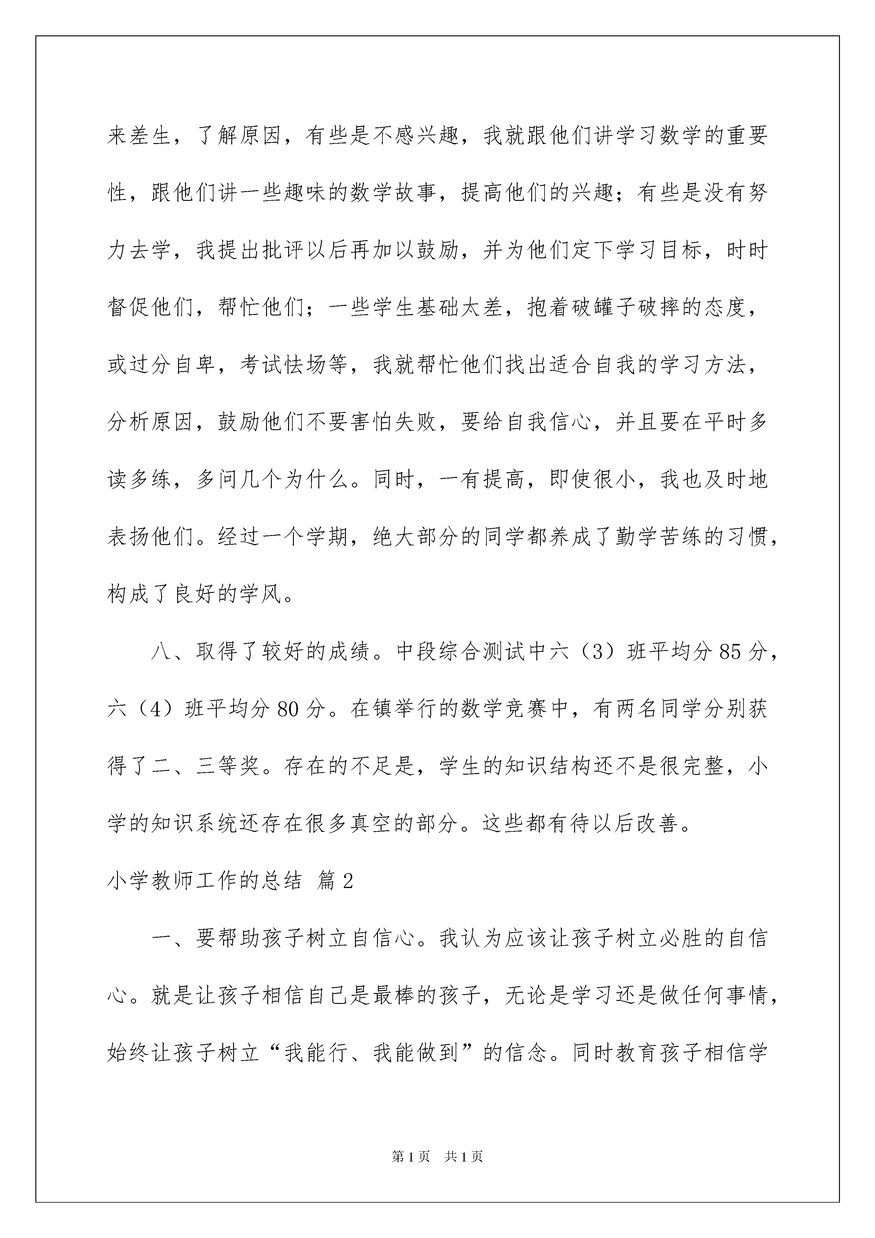 2022小学教师工作的总结三篇小学教师工作的总结三篇总结是指对某一阶段的工作、学习或思想中的经验或情况进行分析研究,做出带有规律性结论的书面材料,它能使我们及时找出错误并改正,让我们来为自己写一份总结吧。我们该怎么去写总结呢?下面是我为大家整理的小学教师工作的总结3篇,希望能够帮助到大家。小学教师工作的总结篇1本学期,我担任六年级毕业班的教学工作,为了适应新时期教学工作的要求,认真学习关于教学工作的讲话。从各方面严格要求自我,进取向老教师请教,结合本校的实际条件和学生的实际情景,勤勤恳恳,兢兢业业,使教学工作有计划,有组织,有步骤地开展。立足此刻,放眼未来,为使今后的工作取得更大的提高,现对本学期教学工作作出总结,期望能发扬优点,克服不足,总结经验教训,继往开来,以促进教学工作更上一层楼。一、认真备课,不但备学生并且备教材备教法,根据教材资料及学生的实际,设计课的类型,拟定采用的教学方法,并对教学过程的程序及时间安排都作了详细的记录,认真写好教案。每一课都做到“有备而来”,每堂课都在课前做好充分的准备,并制作各种利于吸引学生注意力的趣味教具,课后及时对该课作出总结,写好教学反思,并认真按搜集每课书的知识要点,归纳成集。二、增强上课技能,提高教学质量,使讲解清晰化,条理化,准确化,条理化,准确化,情感化,生动化,做到线索清晰,层次分明,言简意赅,深入浅出。在课堂上异常注意调动学生的进取性,加强师生交流,充分体现学生的主作用,让学生学得容易,学得简便,学得愉快;注意精讲精练,在课堂上教师讲得尽量少,学生动口动手动脑尽量多;同时在每一堂课上都充分研究每一个层次的学生学习需求和学习本事,让各个层次的学生都得到提高。此刻学生普遍反映喜欢上数学课,就连以前极厌恶数学的学生都乐于上课了。三、虚心请教其他教师。在教学上,有疑必问。在各个章节的学习上都进取征求其他教师的意见,学习他们的方法,同时,多听教师的课,做到边听边讲,学习别人的优点,克服自我的不足,并常常邀请其他教师来听课,征求他们的意见,改善工作。四、认真批改作业:布置作业做到精读精练。有针对性,有层次性。为了做到这点,我常常到各大书店去搜集资料,对各种辅助资料进行筛选,力求每一次练习都起到的效果。同时对学生的作业批改及时、认真,分析并记录学生的作业情景,将他们在作业过程出现的问题作出分类总结,进行透切的评讲,并针对有关情景及时改善教学方法,做到有的放矢。五、做好课后辅导工作,注意分层教学。在课后,为不一样层次的学生进行相应的辅导,以满足不一样层次的`学生的需求,避免了一刀切的弊端,同时加大了后进生的辅导力度。对后进生的辅导,并不限于学习知识性的辅导,更重要的是学习思想的辅导,要提高后进生的成绩,首先要解决他们心结,让他们意识到学习的重要性和必要性,使之对学习萌发兴趣。要经过各种途径激发他们的求知欲和上进心,让他们意识到学习并不是一项任务,也不是一件痛苦的事情。而是充满乐趣的。从而自觉的把身心投放到学习中去。这样,后进生的转化,就由原先的简单粗暴、强制学习转化到自觉的求知上来。使学习成为他们自我意识力度一部分。在此基础上,再教给他们学习的方法,提高他们的技能。并认真细致地做好查漏补缺工作。后进生通常存在很多知识断层,这些都是后进生转化过程中的拌脚石,在做好后进生的转化工作时,要异常注意给他们补课,把他们以前学习的知识断层补充完整,这样,他们就会学得简便,提高也快,兴趣和求知欲也会随之增加。六、进取推进素质教育。目前的考试模式仍然比较传统,这决定了教师的教学模式要停留在应试教育的层次上,为此,我在教学工作中注意了学生本事的培养,把传受知识、技能和发展智力、本事结合起来,在知识层面上注入了思想情感教育的因素,发挥学生的创新意识和创新本事。让学生的各种素质都得到有效的发展和培养。七、狠抓学风。我所教的班,学生比较重视该科,上课的时候比较认真,大部分学生都能专心听讲,课后也能认真完成作业。但有为数不少的学生,因为怕教师责备,学习上存在的问题不敢问教师,作业也因为怕分数低而找别人的来抄,这样就严重影响了成绩的提高。对此,我狠抓学风,在班级里提倡一种认真、求实的学风,严厉批评抄袭作业的行为。与此同时,为了提高同学的学习进取性,开展了学习竞赛活动,在学生中兴起一种你追我赶的学习风气。所以大部分同学对该课很感兴趣,学习劲头也浓,只是差生面太大了,后进生基础太差,考试成绩差,有些同学是经常不及格,我找来差生,了解原因,有些是不感兴趣,我就跟他们讲学习数学的重要性,跟他们讲一些趣味的数学故事,提高他们的兴趣;有些是没有努力去学,我提出批评以后再加以鼓