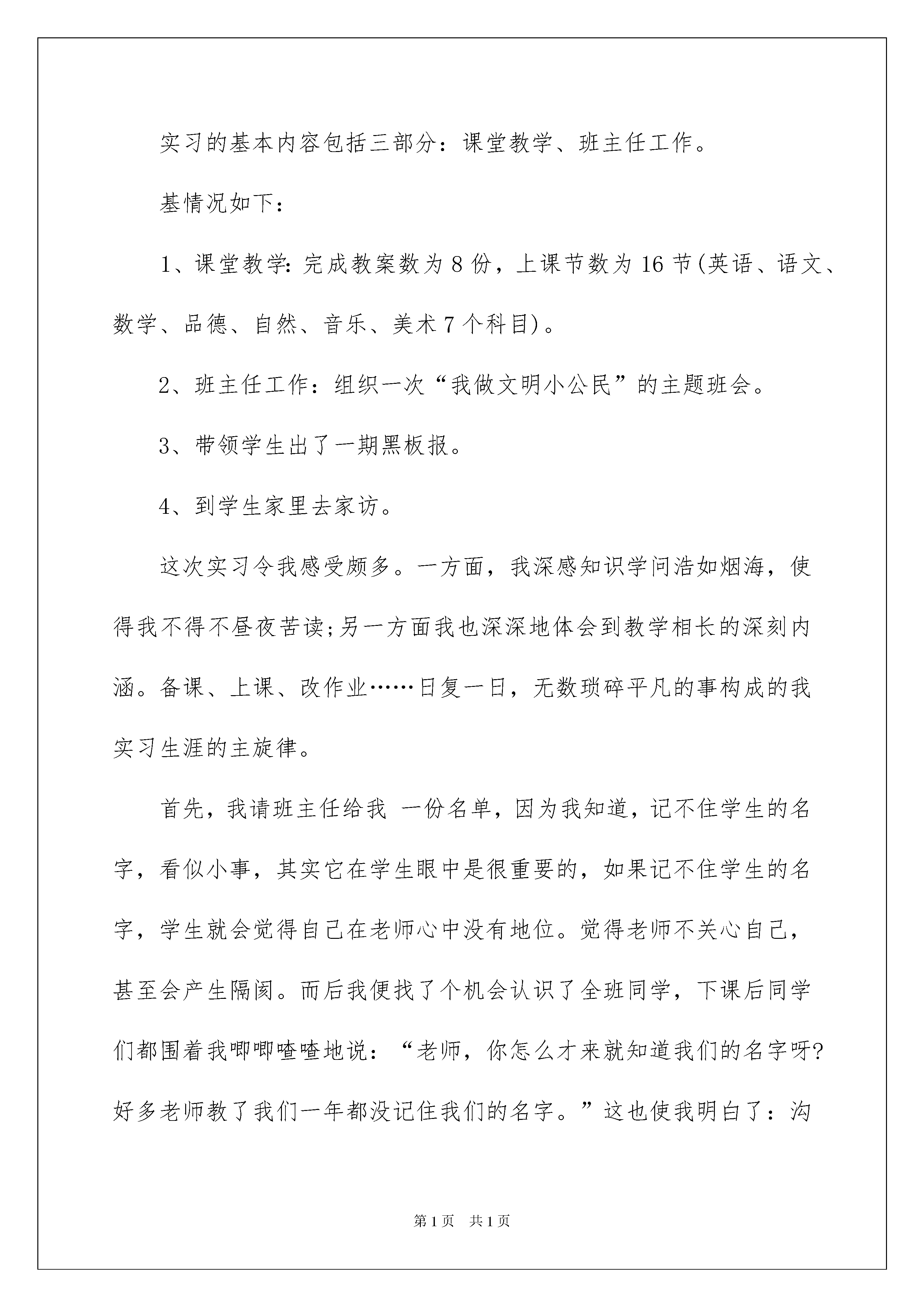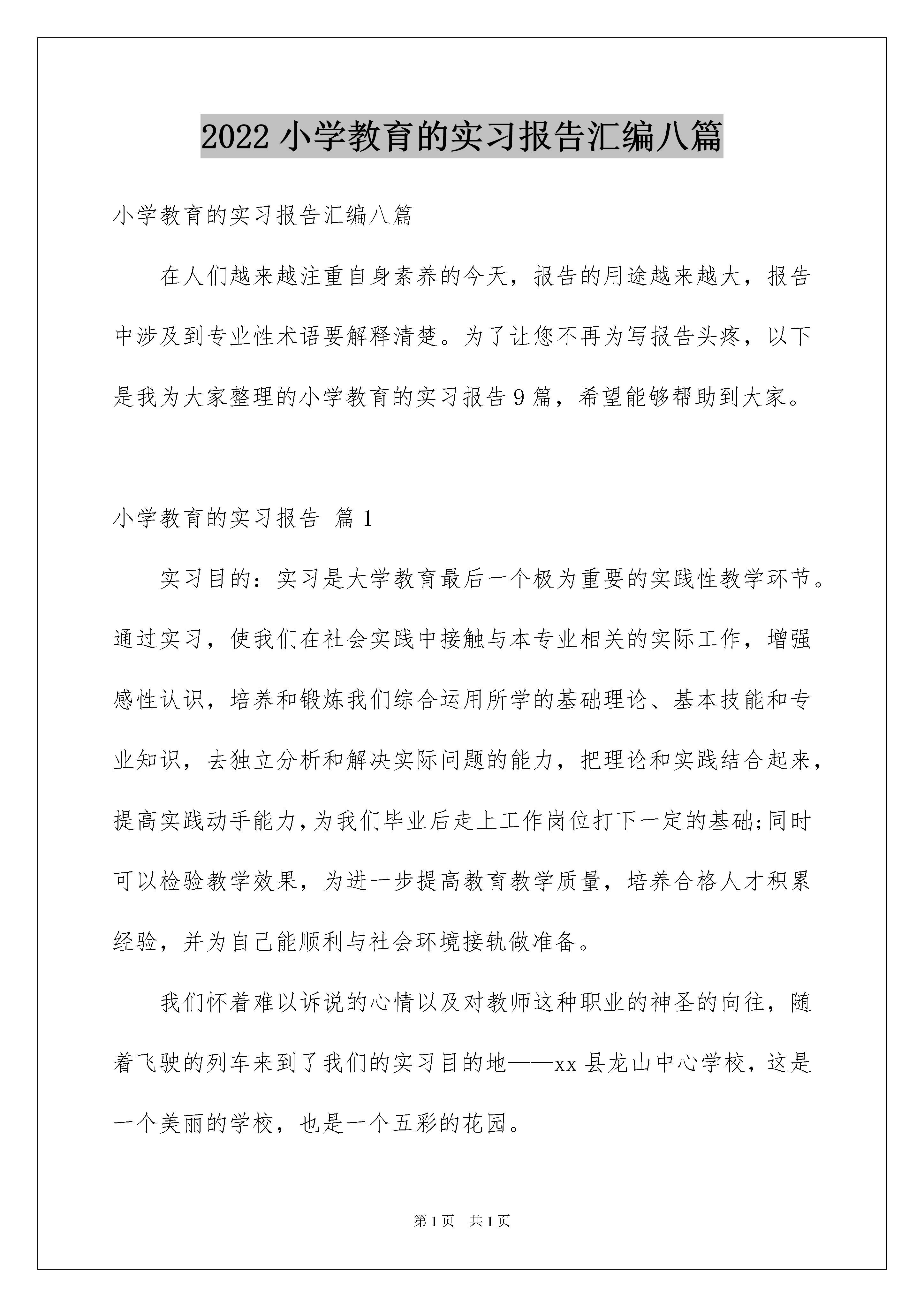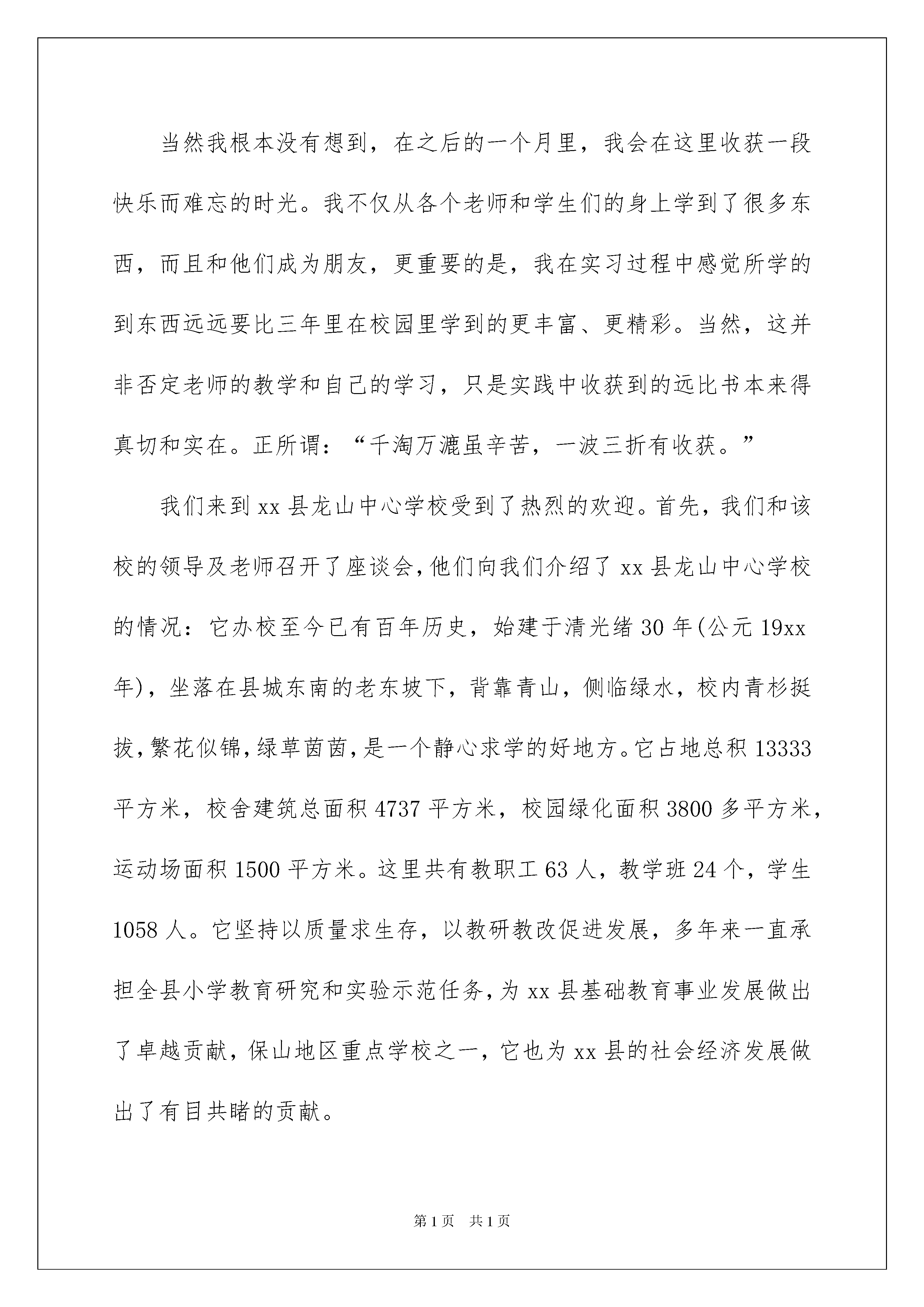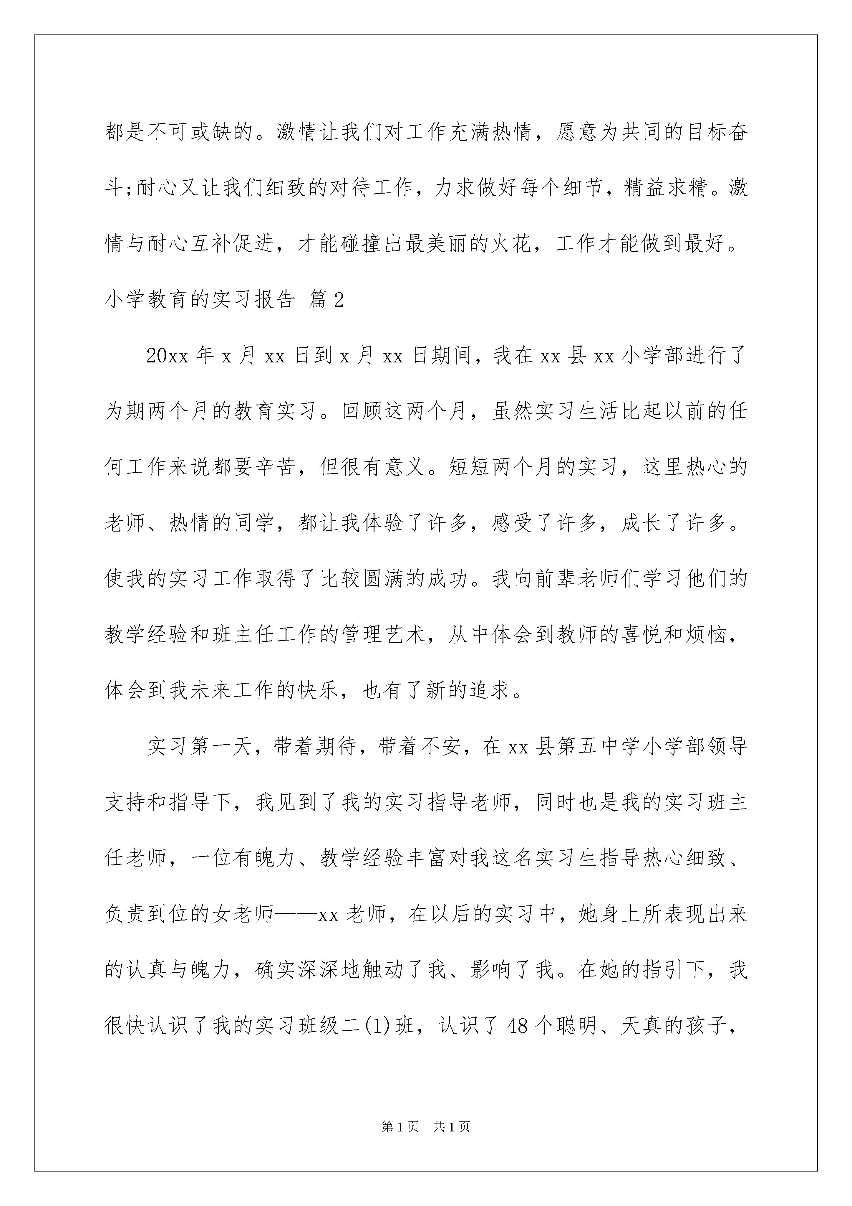 2022小学教育的实习报告汇编八篇小学教育的实习报告汇编八篇在人们越来越注重自身素养的今天,报告的用途越来越大,报告中涉及到专业性术语要解释清楚。为了让您不再为写报告头疼,以下是我为大家整理的小学教育的实习报告9篇,希望能够帮助到大家。小学教育的实习报告篇1实习目的:实习是大学教育最后一个极为重要的实践性教学环节。通过实习,使我们在社会实践中接触与本专业相关的实际工作,增强感性认识,培养和锻炼我们综合运用所学的基础理论、基本技能和专业知识,去独立分析和解决实际问题的能力,把理论和实践结合起来,提高实践动手能力,为我们毕业后走上工作岗位打下一定的基础;同时可以检验教学效果,为进一步提高教育教学质量,培养合格人才积累经验,并为自己能顺利与社会环境接轨做准备。我们怀着难以诉说的心情以及对教师这种职业的神圣的向往,随着飞驶的列车来到了我们的实习目的地——xx县龙山中心学校,这是一个美丽的学校,也是一个五彩的花园。当然我根本没有想到,在之后的一个月里,我会在这里收获一段快乐而难忘的时光。我不仅从各个老师和学生们的身上学到了很多东西,而且和他们成为朋友,更重要的是,我在实习过程中感觉所学的到东西远远要比三年里在校园里学到的更丰富、更精彩。当然,这并非否定老师的教学和自己的学习,只是实践中收获到的远比书本来得真切和实在。正所谓:“千淘万漉虽辛苦,一波三折有收获。”我们来到xx县龙山中心学校受到了热烈的欢迎。首先,我们和该校的领导及老师召开了座谈会,他们向我们介绍了xx县龙山中心学校的情况:它办校至今已有百年历史,始建于清光绪30年(公元19xx年),坐落在县城东南的老东坡下,背靠青山,侧临绿水,校内青杉挺拔,繁花似锦,绿草茵茵,是一个静心求学的好地方。它占地总积13333平方米,校舍建筑总面积4737平方米,校园绿化面积3800多平方米,运动场面积1500平方米。这里共有教职工63人,教学班24个,学生1058人。它坚持以质量求生存,以教研教改促进发展,多年来一直承担全县小学教育研究和实验示范任务,为xx县基础教育事业发展做出了卓越贡献,保山地区重点学校之一,它也为xx县的社会经济发展做出了有目共睹的贡献。实习的基本内容包括三部分:课堂教学、班主任工作。基情况如下:1、课堂教学:完成教案数为8份,上课节数为16节(英语、语文、数学、品德、自然、音乐、美术7个科目)。2、班主任工作:组织一次“我做文明小公民”的主题班会。3、带领学生出了一期黑板报。4、到学生家里去家访。这次实习令我感受颇多。一方面,我深感知识学问浩如烟海,使得我不得不昼夜苦读;另一方面我也深深地体会到教学相长的深刻内涵。备课、上课、改作业……日复一日,无数琐碎平凡的事构成的我实习生涯的主旋律。首先,我请班主任给我一份名单,因为我知道,记不住学生的名字,看似小事,其实它在学生眼中是很重要的,如果记不住学生的名字,学生就会觉得自己在老师心中没有地位。觉得老师不关心自己,甚至会产生隔阂。而后我便找了个机会认识了全班同学,下课后同学们都围着我唧唧喳喳地说:“老师,你怎么才来就知道我们的名字呀?好多老师教了我们一年都没记住我们的名字。”这也使我明白了:沟通是一种重要的技巧和能力,时时都要巧妙运用。认识一个人,首先要记住对方的名字。了解一个人,则需要深入的交流。而这些,都要自己主动去做。下课后,孩子们经过我时,都亲切地喊一声:“范老师好!”,我也带着按捺不住的羞涩和欢喜应着,同时我也发现了快乐竟如此简单,只因被一群天真的孩子们认可并充满亲切地问候一句。在我从事教育教学活动时,我第一次深入课堂时,我就遇到了许多学校里没学过、没想过的难题,即自认才出众的我绘声绘色地讲完一节课后,我问学生:“你们听完课,印象最深的是什么?”学生面面相觑,茫然无语。学生何以如此呢?在我看来主要是由于学生没有学习的兴趣。古人云:“知之者不如好知者,好知者不如乐知者。”兴趣对于一个学生的学习来说是一个至关重要的条件。兴趣是学习入门的阶梯兴趣孕育着愿望,兴趣溢生动力。那么如何才能激发学生的学习兴趣呢?其实这不只是学生的问题,老师也要有激情与耐心,这是做位一名老师应该具备的。激情与耐心,就像火与冰,看似两种完全不同的东西,却能碰撞出最美丽的火花。其实,不管在哪个行业,激情和耐心都是不可或缺的。激情让我们对工作充满热情,愿意为共同的目标奋斗;耐心又让我们细致的对待工作,力求做好每个细节,精益求精。激情与耐心互补促进,才能碰撞出最美丽的火花,工作才能做到最好。小学教育的实习报告篇220xx年x月xx日到x月xx日期间,我在xx县xx小学部进行了为期两个月的教育实习。回