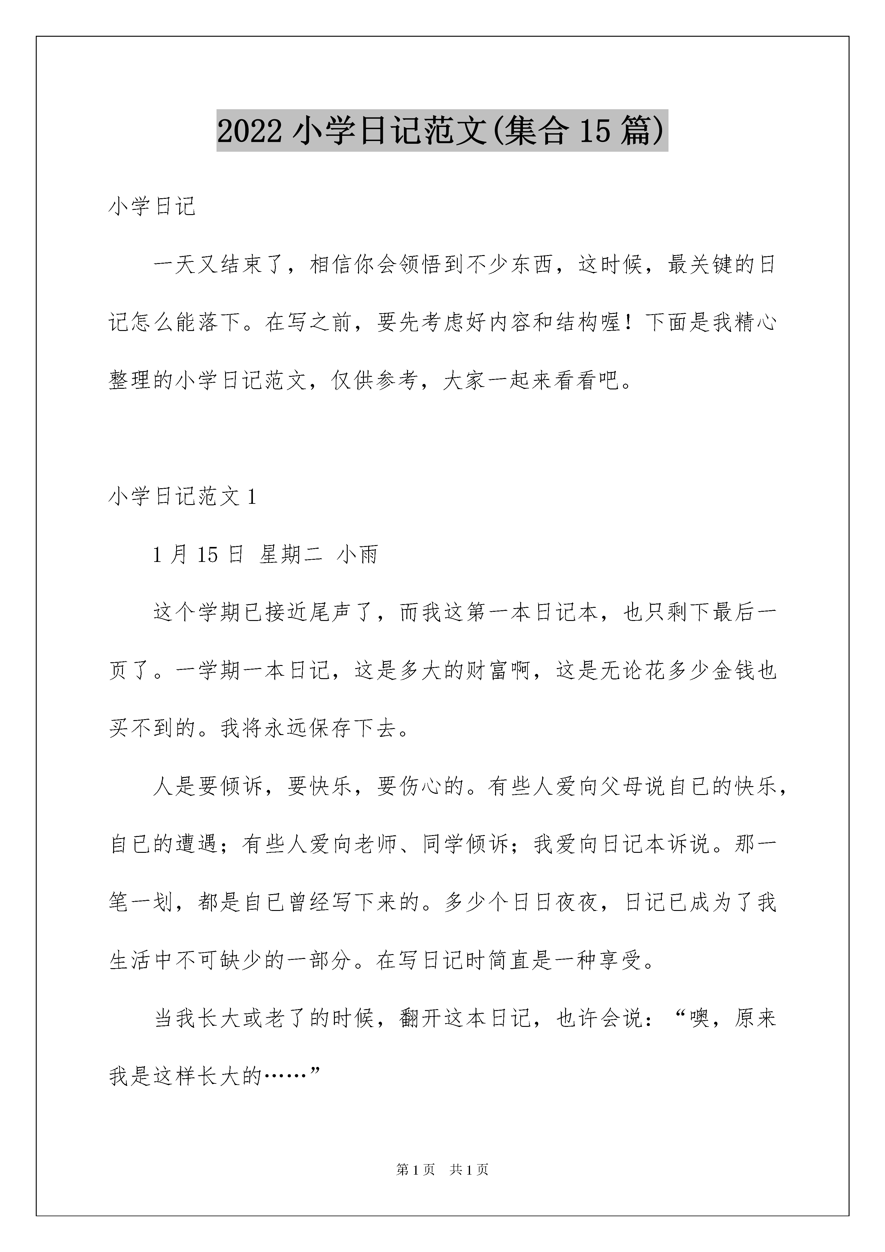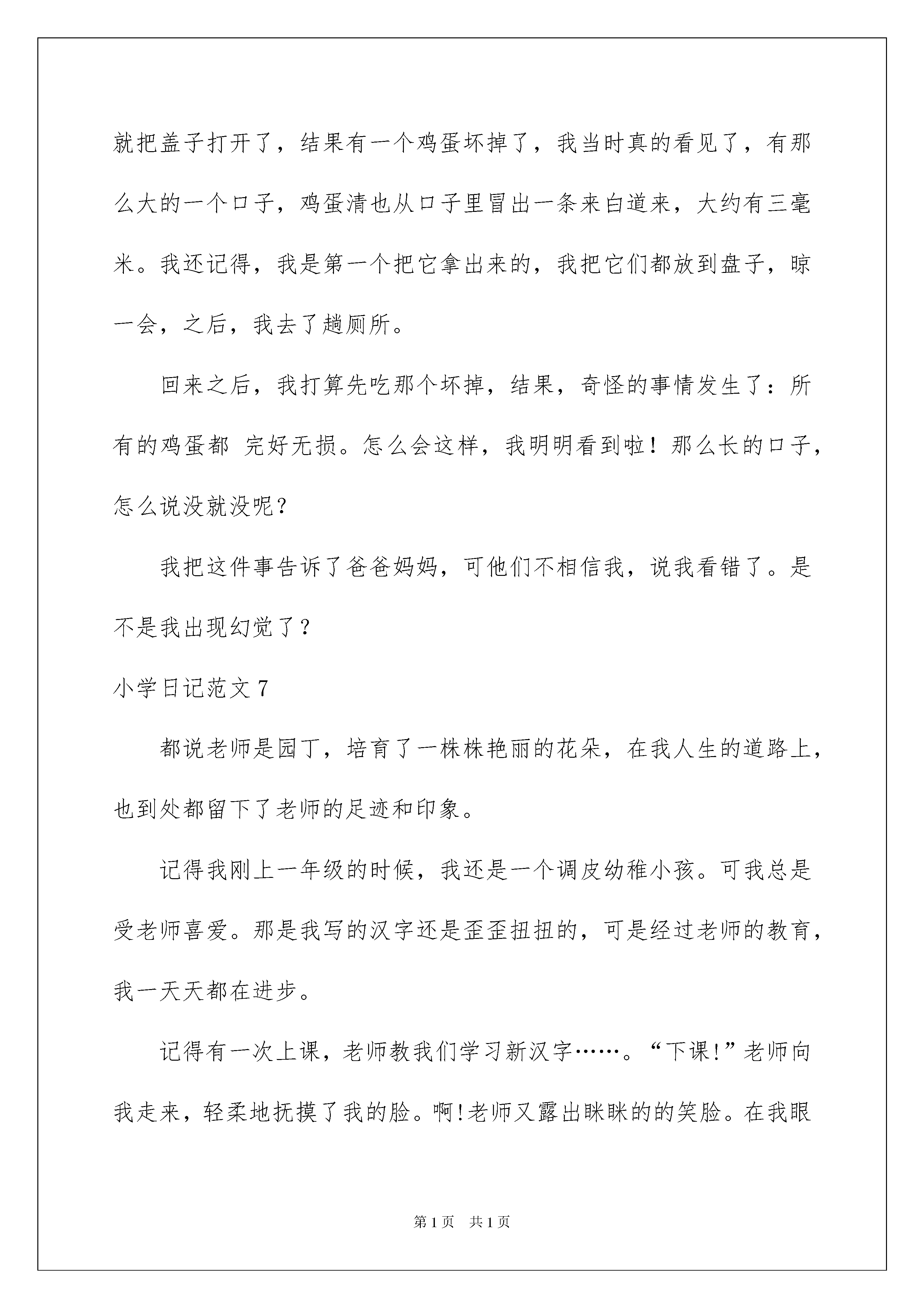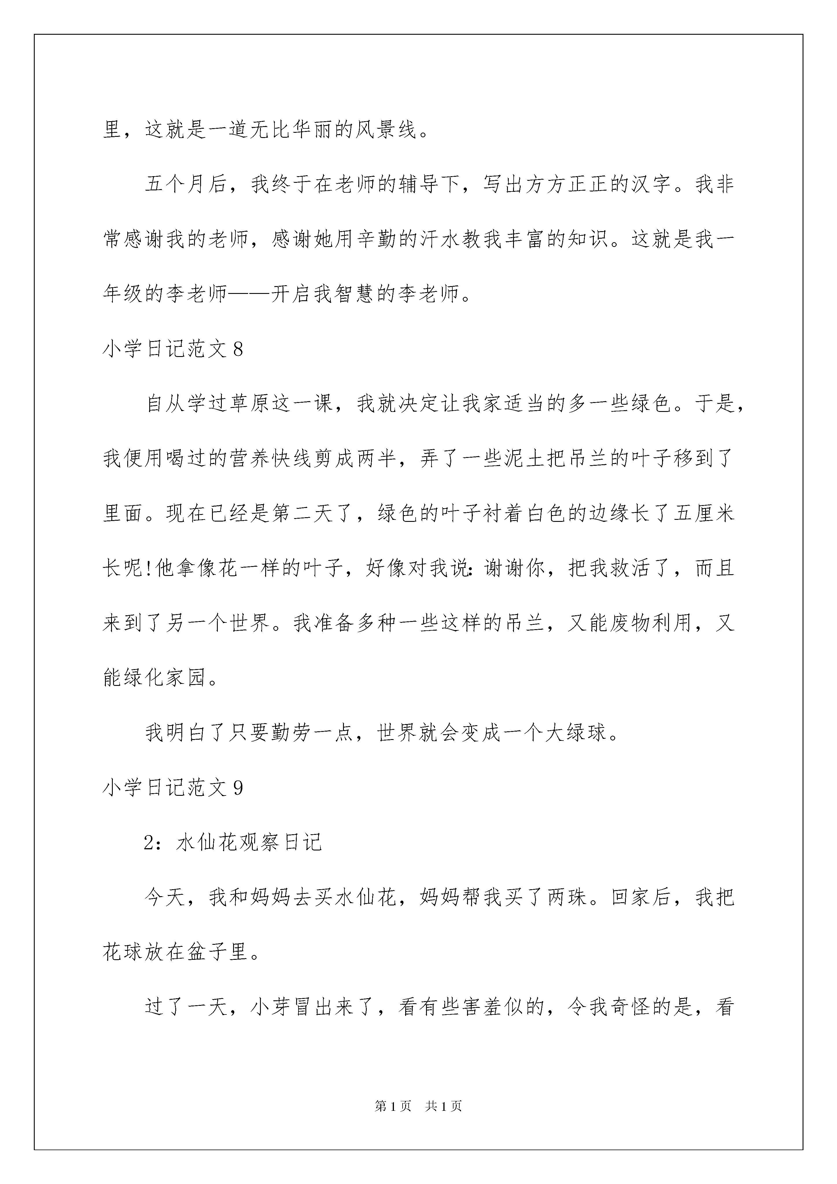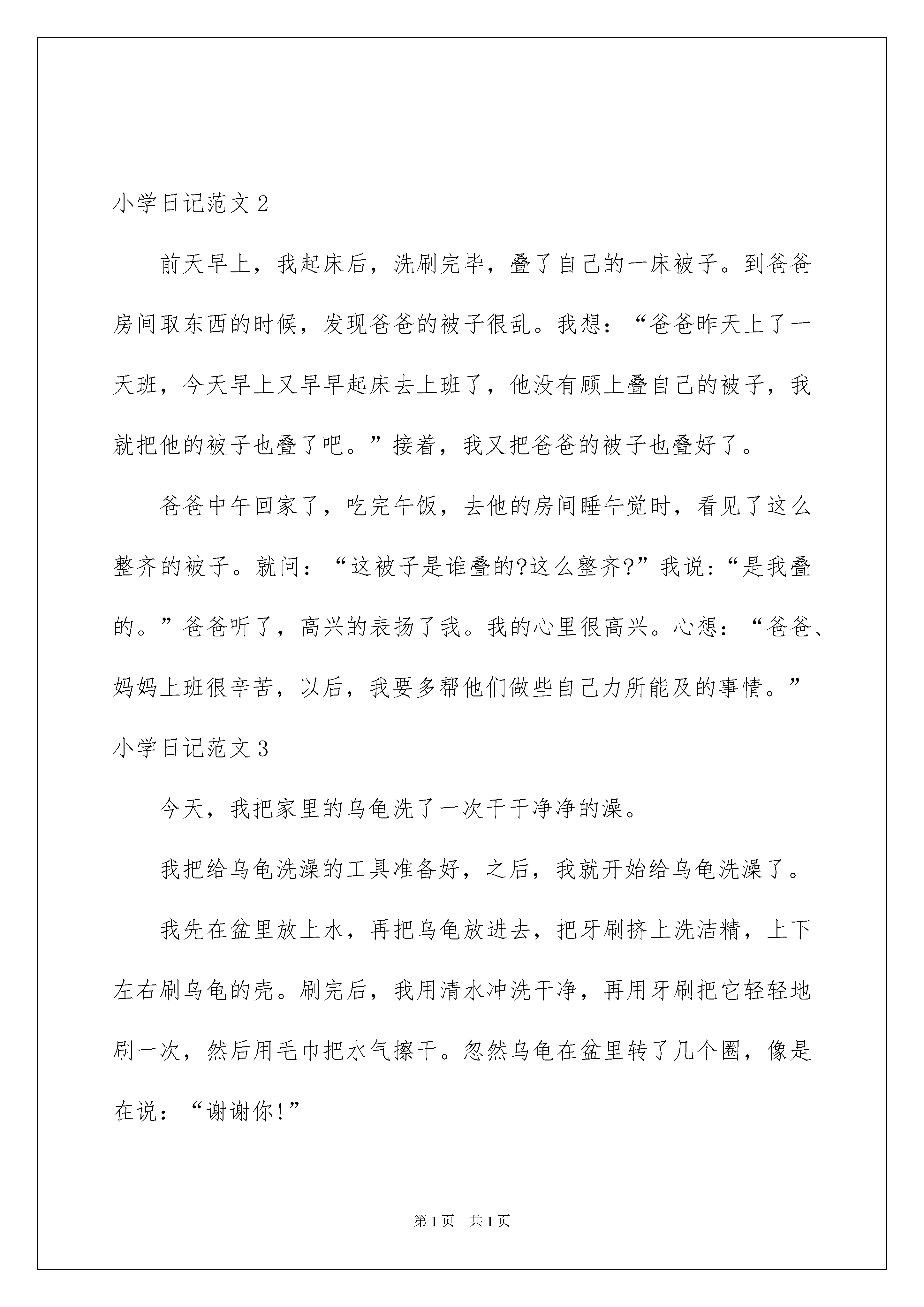 2022小学日记范文(集合15篇)小学日记一天又结束了,相信你会领悟到不少东西,这时候,最关键的日记怎么能落下。在写之前,要先考虑好内容和结构喔!下面是我精心整理的小学日记范文,仅供参考,大家一起来看看吧。小学日记范文11月15日星期二小雨这个学期已接近尾声了,而我这第一本日记本,也只剩下最后一页了。一学期一本日记,这是多大的财富啊,这是无论花多少金钱也买不到的。我将永远保存下去。人是要倾诉,要快乐,要伤心的。有些人爱向父母说自已的快乐,自已的遭遇;有些人爱向老师、同学倾诉;我爱向日记本诉说。那一笔一划,都是自已曾经写下来的。多少个日日夜夜,日记已成为了我生活中不可缺少的一部分。在写日记时简直是一种享受。当我长大或老了的时候,翻开这本日记,也许会说:“噢,原来我是这样长大的……”小学日记范文2前天早上,我起床后,洗刷完毕,叠了自己的一床被子。到爸爸房间取东西的时候,发现爸爸的被子很乱。我想:“爸爸昨天上了一天班,今天早上又早早起床去上班了,他没有顾上叠自己的被子,我就把他的被子也叠了吧。”接着,我又把爸爸的被子也叠好了。爸爸中午回家了,吃完午饭,去他的房间睡午觉时,看见了这么整齐的被子。就问:“这被子是谁叠的?这么整齐?”我说:“是我叠的。”爸爸听了,高兴的表扬了我。我的心里很高兴。心想:“爸爸、妈妈上班很辛苦,以后,我要多帮他们做些自己力所能及的事情。”小学日记范文3今天,我把家里的乌龟洗了一次干干净净的澡。我把给乌龟洗澡的工具准备好,之后,我就开始给乌龟洗澡了。我先在盆里放上水,再把乌龟放进去,把牙刷挤上洗洁精,上下左右刷乌龟的壳。刷完后,我用清水冲洗干净,再用牙刷把它轻轻地刷一次,然后用毛巾把水气擦干。忽然乌龟在盆里转了几个圈,像是在说:“谢谢你!”小学日记范文4今天我一个人在家。本来想要出去遛遛,谁知天公不作美,湛蓝的天空顿时阴了下来,先是“轰隆轰隆”的'打起了雷,紧接着又“哗啦啦”的下起了大雨。我正在家里看着电视,听到这雷雨交加的声音顿时害怕了,可是又转念一想,打雷下雨又怎么样,这是自然现象。于是我把客厅的灯开开了,一边哼着歌一边看笑话,不知不觉,天气又晴了小学日记范文5包混沌今天中午,我们包馄饨吃。一大早,爸爸就买好了馄饨皮和馅料。我们共包了50个馄饨,一起下锅,不一会就烧好了。我说:“三个人吃,应该平均分。”接着我算了起来:50÷3=16......2。爸爸笑了起来,说:“傻孩子,这样没法分,再想想。”我说:“那我先吃10个,剩下的你们分。”我又算了起来:(50-10)÷2=20。这下对了,爸爸妈妈各吃20个,我吃10个,正正好!小学日记范文6今天我把五个鸡蛋放进锅里去煮,过了一会,我觉得鸡蛋熟了,就把盖子打开了,结果有一个鸡蛋坏掉了,我当时真的看见了,有那么大的一个口子,鸡蛋清也从口子里冒出一条来白道来,大约有三毫米。我还记得,我是第一个把它拿出来的,我把它们都放到盘子,晾一会,之后,我去了趟厕所。回来之后,我打算先吃那个坏掉,结果,奇怪的事情发生了:所有的鸡蛋都完好无损。怎么会这样,我明明看到啦!那么长的口子,怎么说没就没呢?我把这件事告诉了爸爸妈妈,可他们不相信我,说我看错了。是不是我出现幻觉了?小学日记范文7都说老师是园丁,培育了一株株艳丽的花朵,在我人生的道路上,也到处都留下了老师的足迹和印象。记得我刚上一年级的时候,我还是一个调皮幼稚小孩。可我总是受老师喜爱。那是我写的汉字还是歪歪扭扭的,可是经过老师的教育,我一天天都在进步。记得有一次上课,老师教我们学习新汉字……。“下课!”老师向我走来,轻柔地抚摸了我的脸。啊!老师又露出眯眯的的笑脸。在我眼里,这就是一道无比华丽的风景线。五个月后,我终于在老师的辅导下,写出方方正正的汉字。我非常感谢我的老师,感谢她用辛勤的汗水教我丰富的知识。这就是我一年级的李老师——开启我智慧的李老师。小学日记范文8自从学过草原这一课,我就决定让我家适当的多一些绿色。于是,我便用喝过的营养快线剪成两半,弄了一些泥土把吊兰的叶子移到了里面。现在已经是第二天了,绿色的叶子衬着白色的边缘长了五厘米长呢!他拿像花一样的叶子,好像对我说:谢谢你,把我救活了,而且来到了另一个世界。我准备多种一些这样的吊兰,又能废物利用,又能绿化家园。我明白了只要勤劳一点,世界就会变成一个大绿球。小学日记范文92:水仙花观察日记今天,我和妈妈去买水仙花,妈妈帮我买了两珠。回家后,我把花球放在盆子里。过了一天,小芽冒出来了,看有些害羞似的,令我奇怪的是,看起来有点像。。。大蒜啊?算了!大概长大了就会漂亮了吧。可爱的‘小蒜’快点长大哦!小学日记范文10今天我