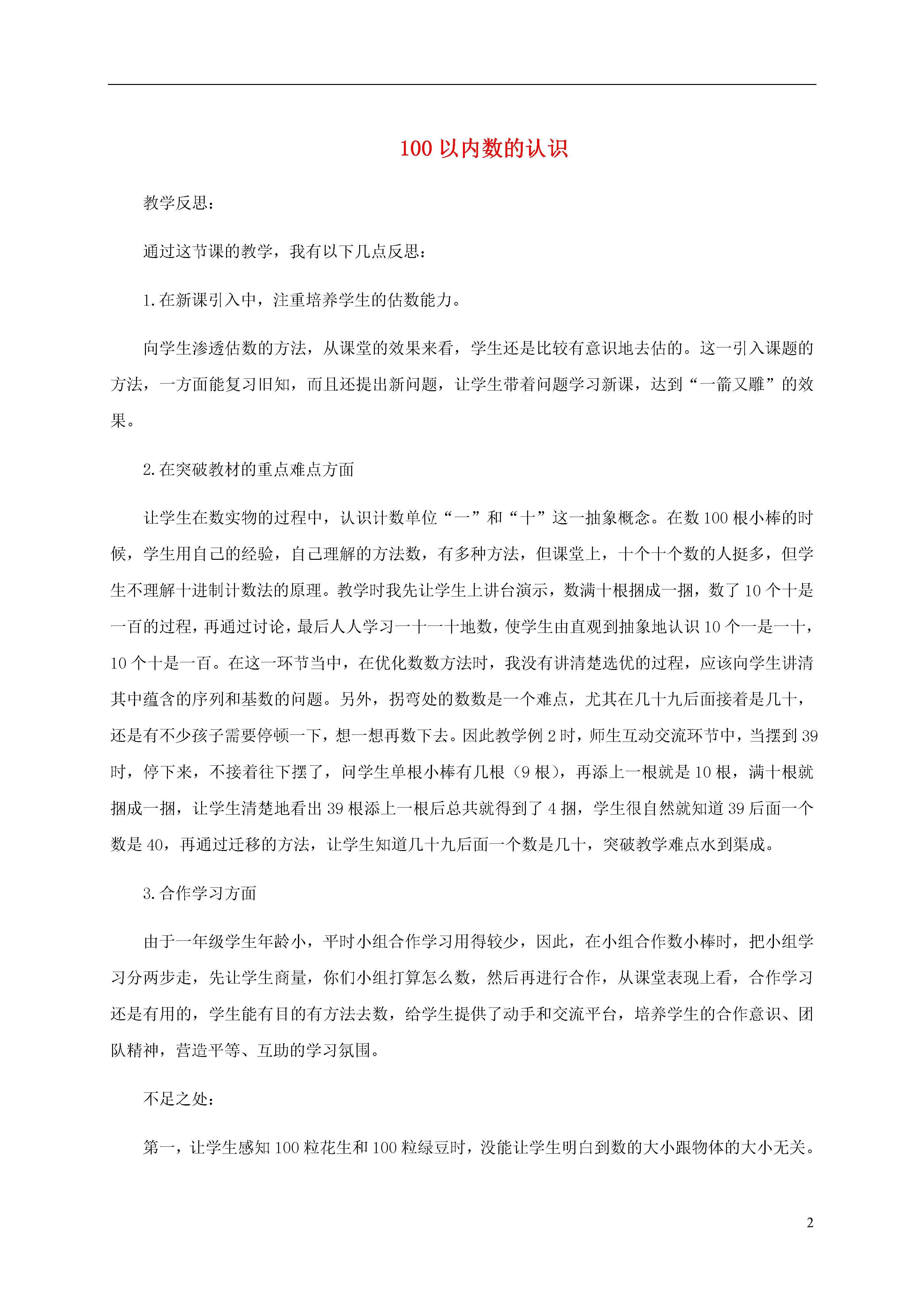 2100以内数的认识教学反思:通过这节课的教学,我有以下几点反思:1.在新课引入中,注重培养学生的估数能力。向学生渗透估数的方法,从课堂的效果来看,学生还是比较有意识地去估的。这一引入课题的方法,一方面能复习旧知,而且还提出新问题,让学生带着问题学习新课,达到“一箭又雕”的效果。2.在突破教材的重点难点方面让学生在数实物的过程中,认识计数单位“一”和“十”这一抽象概念。在数100根小棒的时候,学生用自己的经验,自己理解的方法数,有多种方法,但课堂上,十个十个数的人挺多,但学生不理解十进制计数法的原理。教学时我先让学生上讲台演示,数满十根捆成一捆,数了10个十是一百的过程,再通过讨论,最后人人学习一十一十地数,使学生由直观到抽象地认识10个一是一十,10个十是一百。在这一环节当中,在优化数数方法时,我没有讲清楚选优的过程,应该向学生讲清其中蕴含的序列和基数的问题。另外,拐弯处的数数是一个难点,尤其在几十九后面接着是几十,还是有不少孩子需要停顿一下,想一想再数下去。因此教学例2时,师生互动交流环节中,当摆到39时,停下来,不接着往下摆了,问学生单根小棒有几根(9根),再添上一根就是10根,满十根就捆成一捆,让学生清楚地看出39根添上一根后总共就得到了4捆,学生很自然就知道39后面一个数是40,再通过迁移的方法,让学生知道几十九后面一个数是几十,突破教学难点水到渠成。3.合作学习方面由于一年级学生年龄小,平时小组合作学习用得较少,因此,在小组合作数小棒时,把小组学习分两步走,先让学生商量,你们小组打算怎么数,然后再进行合作,从课堂表现上看,合作学习还是有用的,学生能有目的有方法去数,给学生提供了动手和交流平台,培养学生的合作意识、团队精神,营造平等、互助的学习氛围。不足之处:第一,让学生感知100粒花生和100粒绿豆时,没能让学生明白到数的大小跟物体的大小无关。第二,如果让学生说说生活中什么地方用到这些数,能让学生把学到的数用到生活中去,这样能更好地让学生感知数学来源于生活,服务于生活。第三,教学数的组成时,应该向学生讲清,以“个”为单位时,35表示35个一,以“十”为单位时就是3个十和5个一。