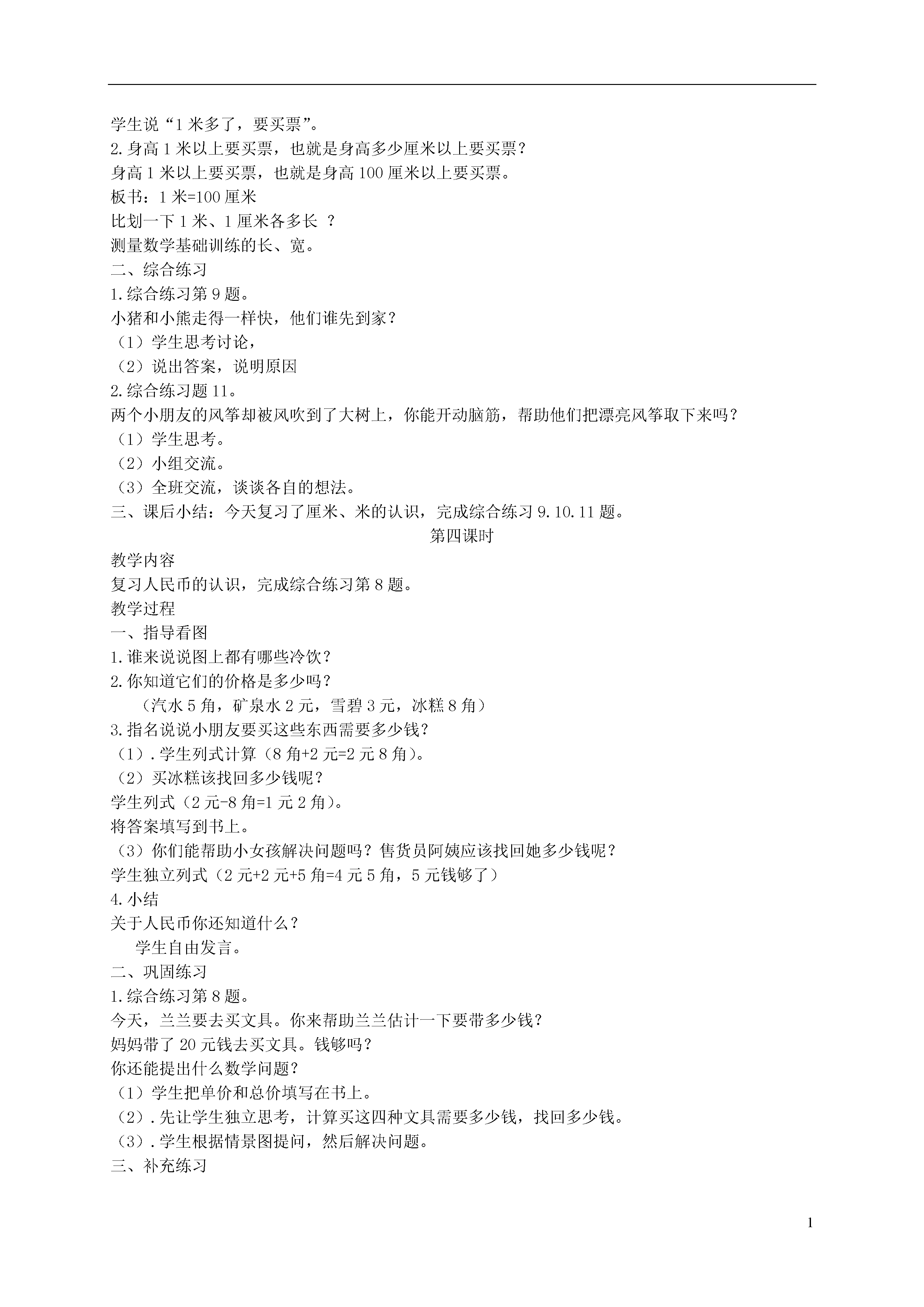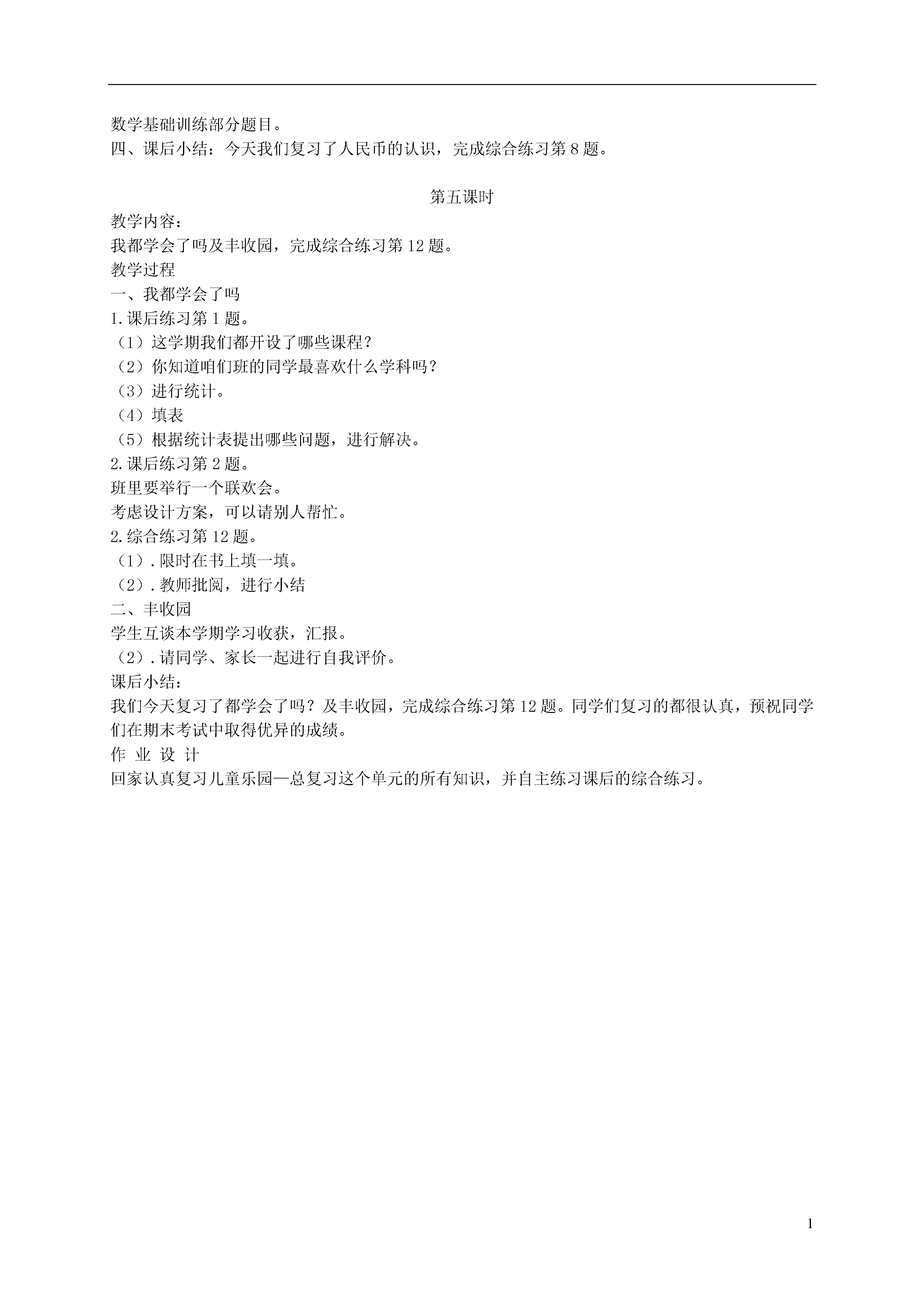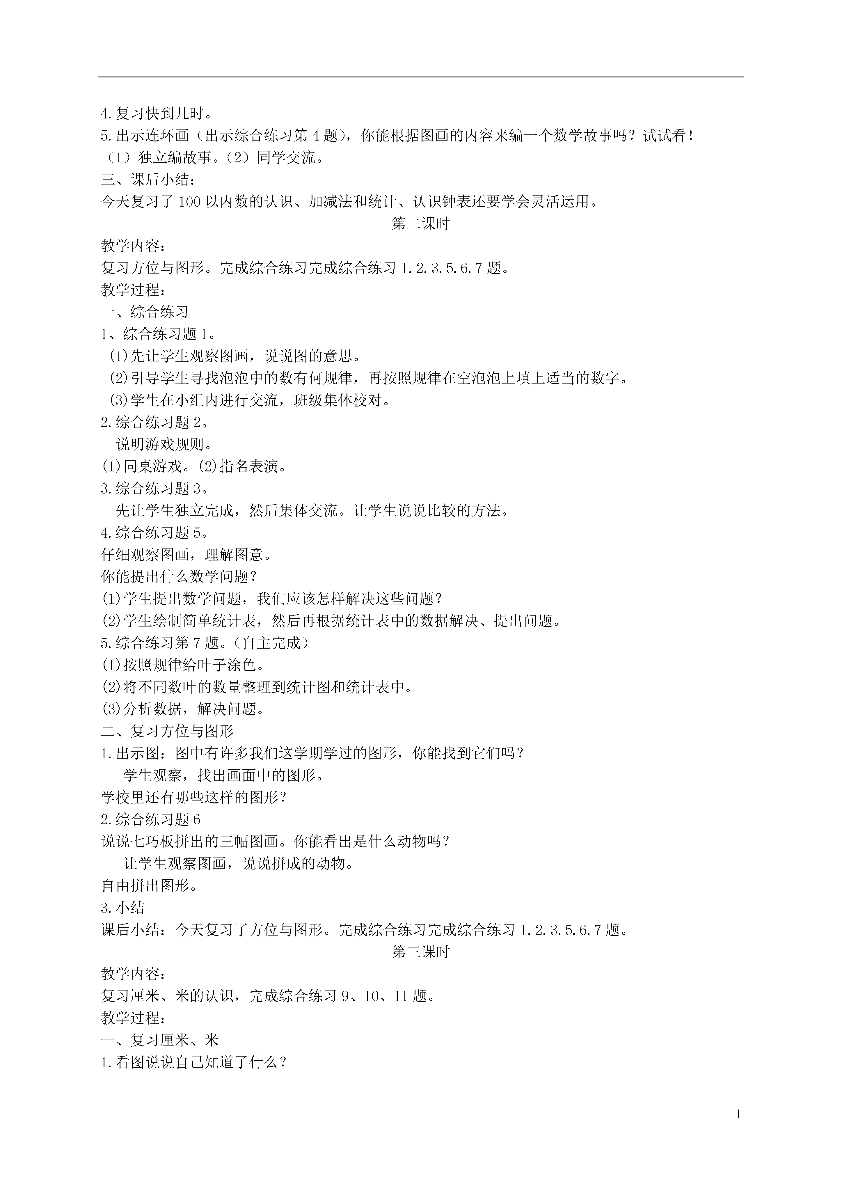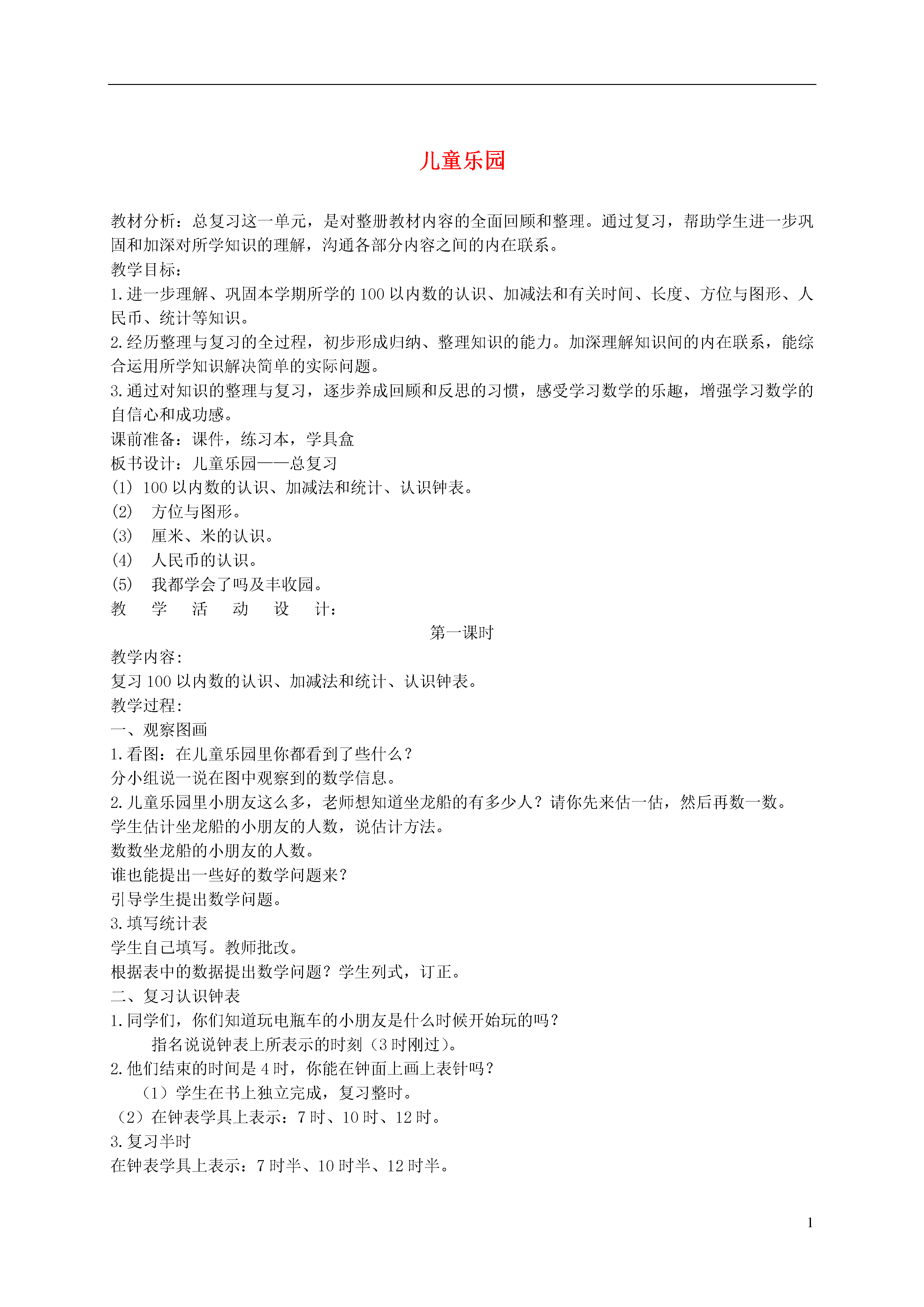 1儿童乐园教材分析:总复习这一单元,是对整册教材内容的全面回顾和整理。通过复习,帮助学生进一步巩固和加深对所学知识的理解,沟通各部分内容之间的内在联系。教学目标:1.进一步理解、巩固本学期所学的100以内数的认识、加减法和有关时间、长度、方位与图形、人民币、统计等知识。2.经历整理与复习的全过程,初步形成归纳、整理知识的能力。加深理解知识间的内在联系,能综合运用所学知识解决简单的实际问题。3.通过对知识的整理与复习,逐步养成回顾和反思的习惯,感受学习数学的乐趣,增强学习数学的自信心和成功感。课前准备:课件,练习本,学具盒板书设计:儿童乐园——总复习(1)100以内数的认识、加减法和统计、认识钟表。(2)方位与图形。(3)厘米、米的认识。(4)人民币的认识。(5)我都学会了吗及丰收园。教学活动设计:第一课时教学内容:复习100以内数的认识、加减法和统计、认识钟表。教学过程:一、观察图画1.看图:在儿童乐园里你都看到了些什么?分小组说一说在图中观察到的数学信息。2.儿童乐园里小朋友这么多,老师想知道坐龙船的有多少人?请你先来估一估,然后再数一数。学生估计坐龙船的小朋友的人数,说估计方法。数数坐龙船的小朋友的人数。谁也能提出一些好的数学问题来?引导学生提出数学问题。3.填写统计表学生自己填写。教师批改。根据表中的数据提出数学问题?学生列式,订正。二、复习认识钟表1.同学们,你们知道玩电瓶车的小朋友是什么时候开始玩的吗?指名说说钟表上所表示的时刻(3时刚过)。2.他们结束的时间是4时,你能在钟面上画上表针吗?(1)学生在书上独立完成,复习整时。(2)在钟表学具上表示:7时、10时、12时。3.复习半时在钟表学具上表示:7时半、10时半、12时半。4.复习快到几时。5.出示连环画(出示综合练习第4题),你能根据图画的内容来编一个数学故事吗?试试看!(1)独立编故事。(2)同学交流。三、课后小结:今天复习了100以内数的认识、加减法和统计、认识钟表还要学会灵活运用。第二课时教学内容:复习方位与图形。完成综合练习完成综合练习1.2.3.5.6.7题。教学过程:一、综合练习1、综合练习题1。(1)先让学生观察图画,说说图的意思。(2)引导学生寻找泡泡中的数有何规律,再按照规律在空泡泡上填上适当的数字。(3)学生在小组内进行交流,班级集体校对。2.综合练习题2。说明游戏规则。(1)同桌游戏。(2)指名表演。3.综合练习题3。先让学生独立完成,然后集体交流。让学生说说比较的方法。4.综合练习题5。仔细观察图画,理解图意。你能提出什么数学问题?(1)学生提出数学问题,我们应该怎样解决这些问题?(2)学生绘制简单统计表,然后再根据统计表中的数据解决、提出问题。5.综合练习第7题。(自主完成)(1)按照规律给叶子涂色。(2)将不同数叶的数量整理到统计图和统计表中。(3)分析数据,解决问题。二、复习方位与图形1.出示图:图中有许多我们这学期学过的图形,你能找到它们吗?学生观察,找出画面中的图形。学校里还有哪些这样的图形?2.综合练习题6说说七巧板拼出的三幅图画。你能看出是什么动物吗?让学生观察图画,说说拼成的动物。自由拼出图形。3.小结课后小结:今天复习了方位与图形。完成综合练习完成综合练习1.2.3.5.6.7题。第三课时教学内容:复习厘米、米的认识,完成综合练习9、10、11题。教学过程:一、复习厘米、米1.看图说说自己知道了什么?学生说“1米多了,要买票”。2.身高1米以上要买票,也就是身高多少厘米以上要买票?身高1米以上要买票,也就是身高100厘米以上要买票。板书:1米=100厘米比划一下1米、1厘米各多长?测量数学基础训练的长、宽。二、综合练习1.综合练习第9题。小猪和小熊走得一样快,他们谁先到家?(1)学生思考讨论,(2)说出答案,说明原因2.综合练习题11。两个小朋友的风筝却被风吹到了大树上,你能开动脑筋,帮助他们把漂亮风筝取下来吗?(1)学生思考。(2)小组交流。(3)全班交流,谈谈各自的想法。三、课后小结:今天复习了厘米、米的认识,完成综合练习9.10.11题。第四课时教学内容复习人民币的认识,完成综合练习第8题。教学过程一、指导看图1.谁来说说图上都有哪些冷饮?2.你知道它们的价格是多少吗?(汽水5角,矿泉水2元,雪碧3元,冰糕8角)3.指名说说小朋友要买这些东西需要多少钱?(1).学生列式计算(8角+2元=2元8角)。(2)买冰糕该找回多少钱呢?学生列式(2元-8角