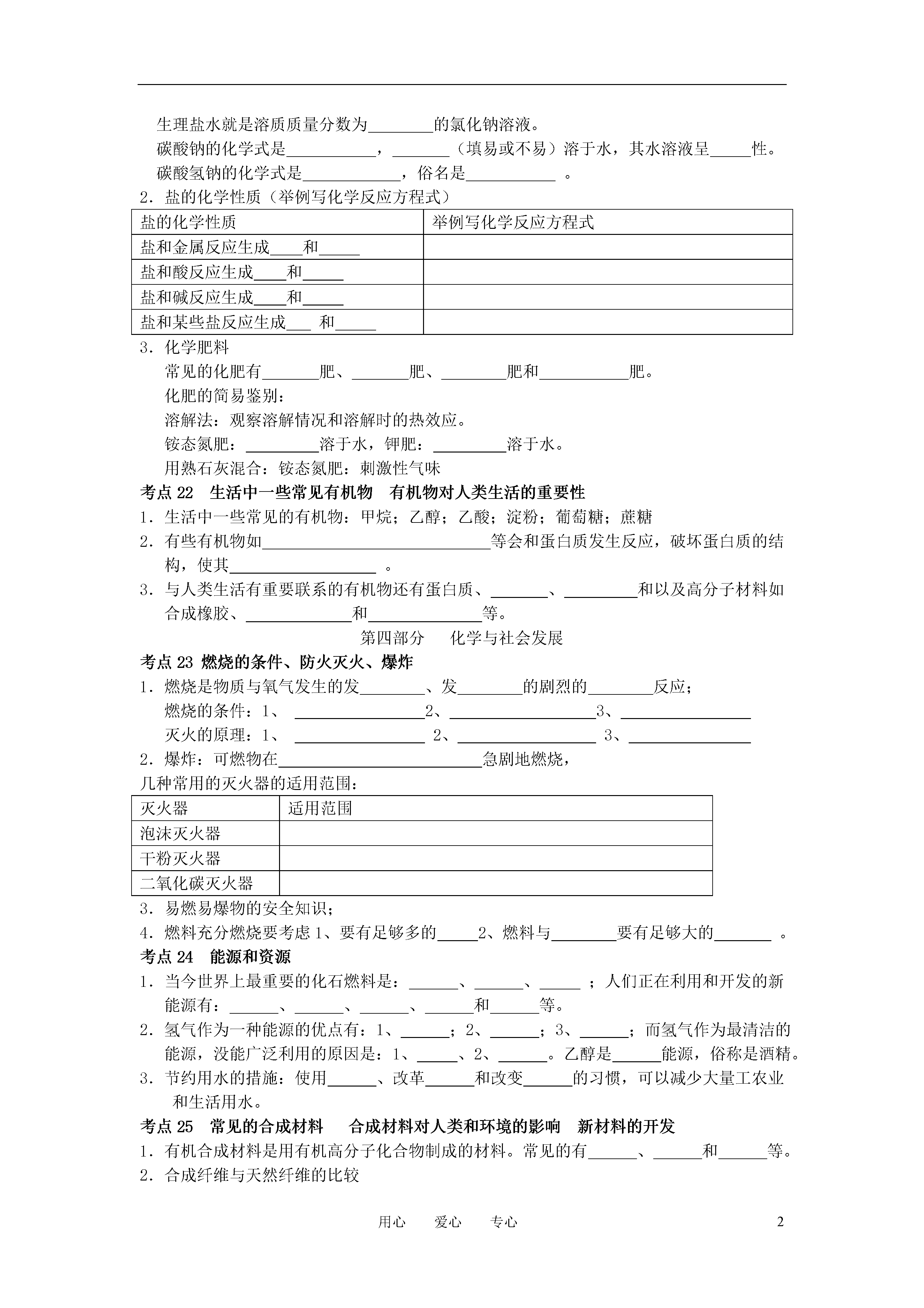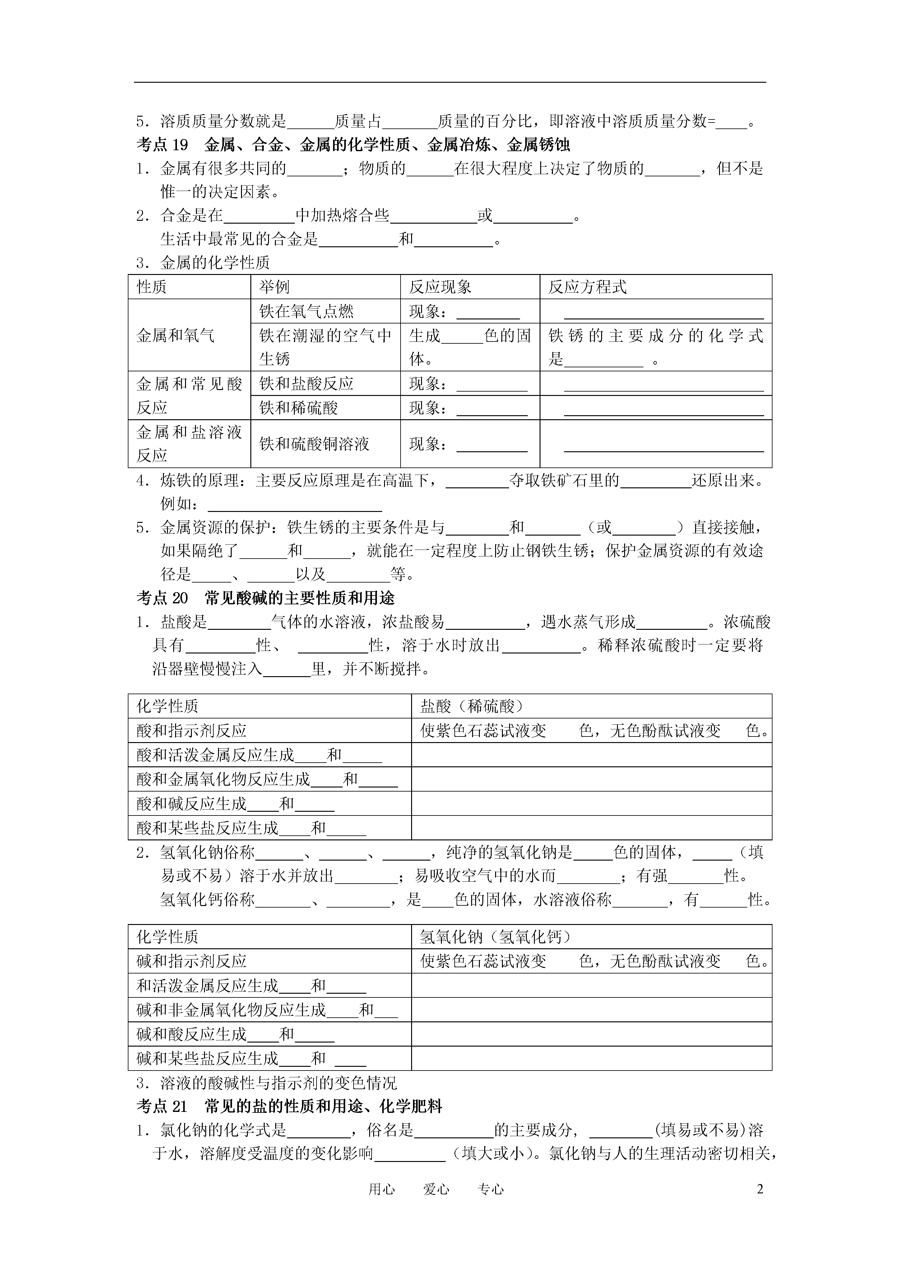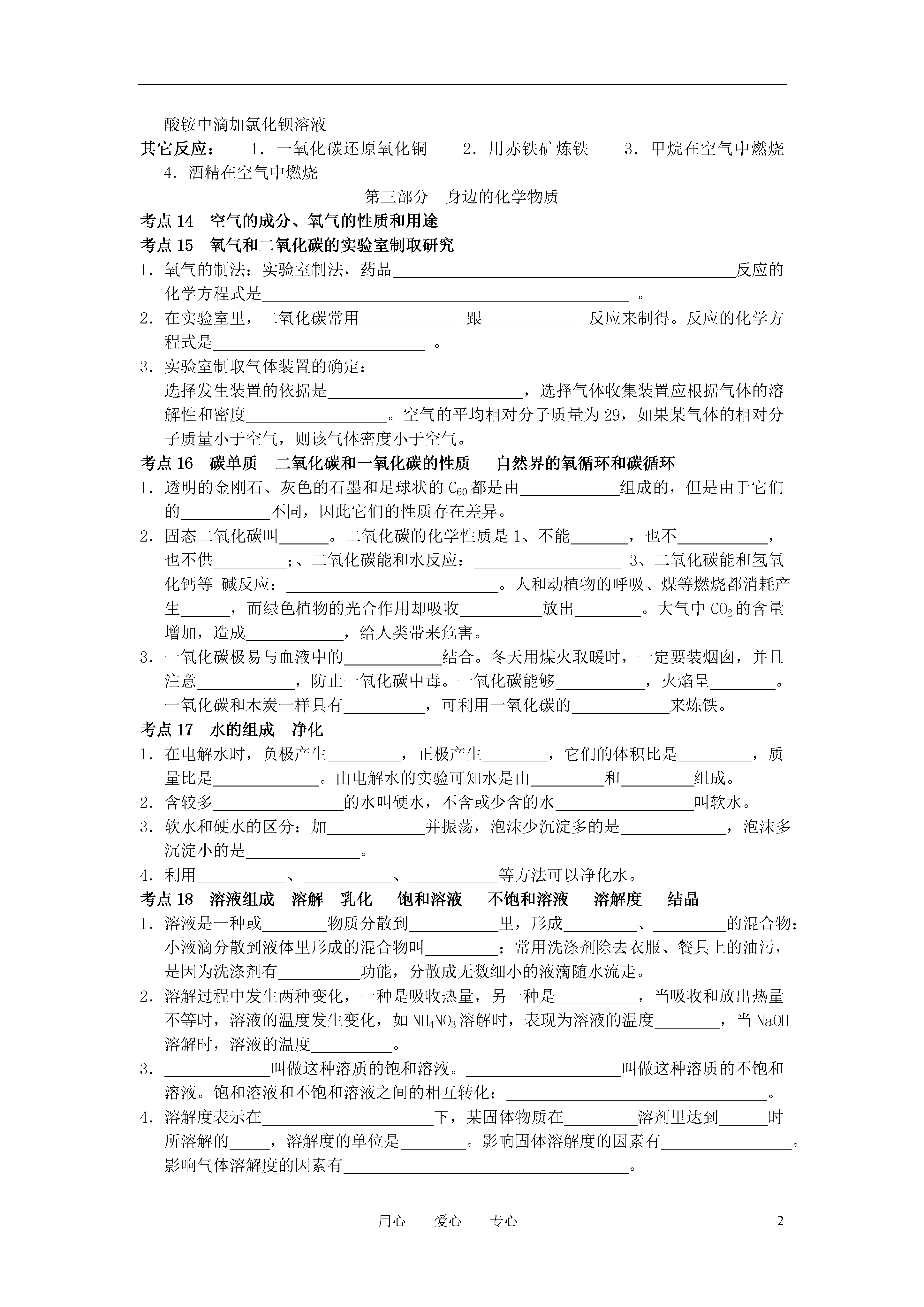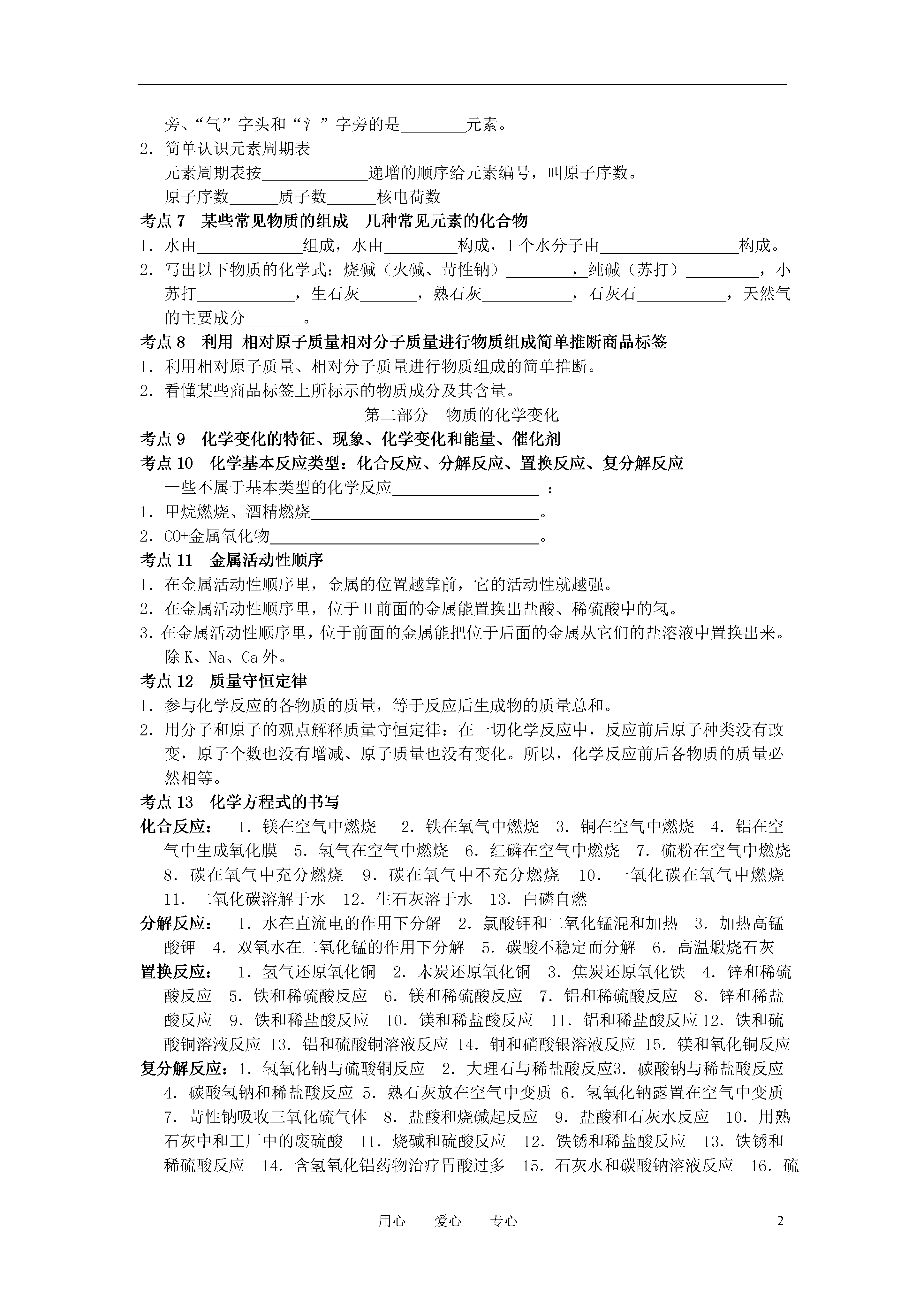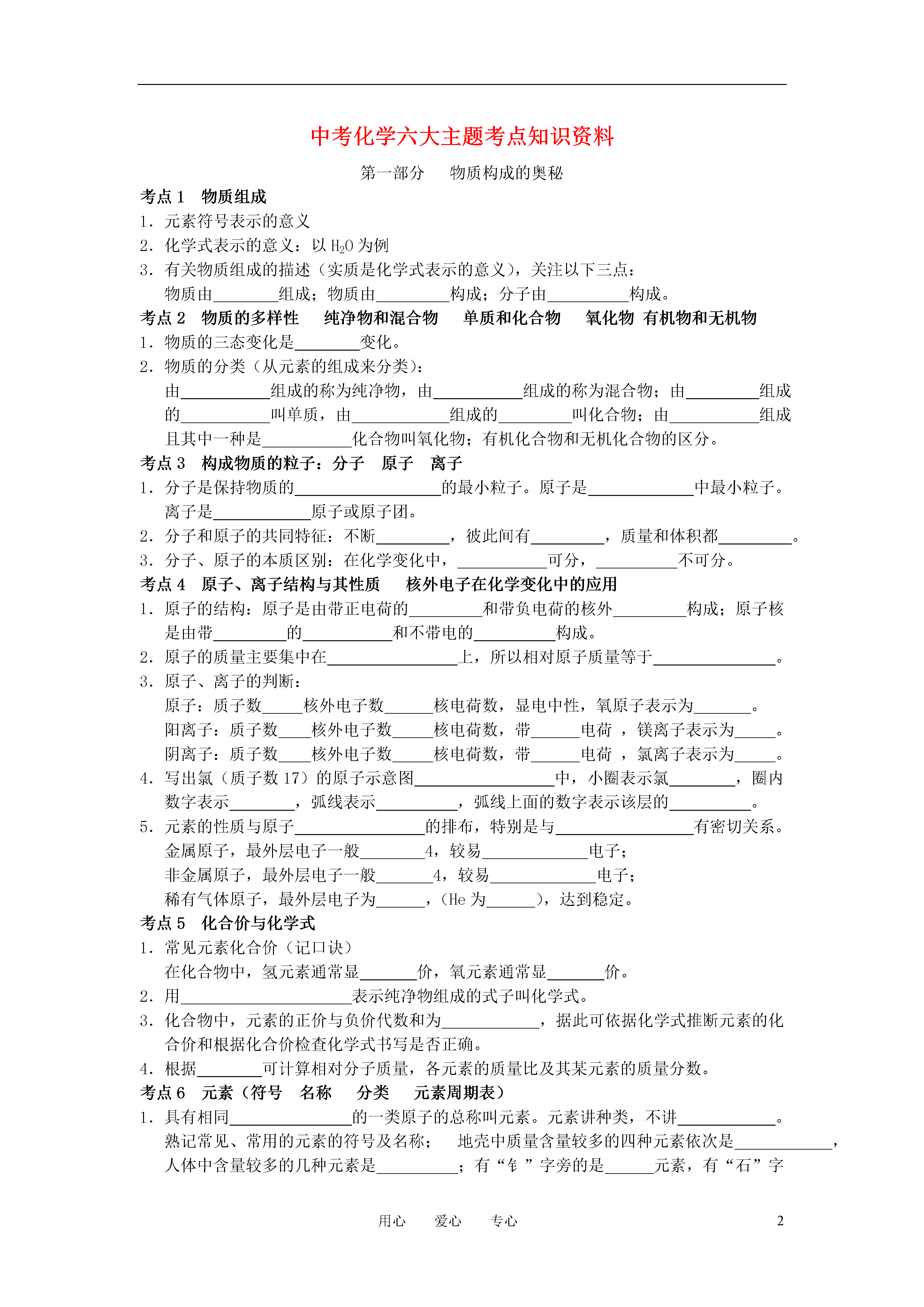 2用心爱心专心中考化学六大主题考点知识资料第一部分物质构成的奥秘考点1物质组成1.元素符号表示的意义2.化学式表示的意义:以H2O为例3.有关物质组成的描述(实质是化学式表示的意义),关注以下三点:物质由组成;物质由构成;分子由构成。考点2物质的多样性纯净物和混合物单质和化合物氧化物有机物和无机物1.物质的三态变化是变化。2.物质的分类(从元素的组成来分类):由组成的称为纯净物,由组成的称为混合物;由组成的叫单质,由组成的叫化合物;由组成且其中一种是化合物叫氧化物;有机化合物和无机化合物的区分。考点3构成物质的粒子:分子原子离子1.分子是保持物质的的最小粒子。原子是中最小粒子。离子是原子或原子团。2.分子和原子的共同特征:不断,彼此间有,质量和体积都。3.分子、原子的本质区别:在化学变化中,可分,不可分。考点4原子、离子结构与其性质核外电子在化学变化中的应用1.原子的结构:原子是由带正电荷的和带负电荷的核外构成;原子核是由带的和不带电的构成。2.原子的质量主要集中在上,所以相对原子质量等于。3.原子、离子的判断:原子:质子数核外电子数核电荷数,显电中性,氧原子表示为。阳离子:质子数核外电子数核电荷数,带电荷,镁离子表示为。阴离子:质子数核外电子数核电荷数,带电荷,氯离子表示为。4.写出氯(质子数17)的原子示意图中,小圈表示氯,圈内数字表示,弧线表示,弧线上面的数字表示该层的。5.元素的性质与原子的排布,特别是与有密切关系。金属原子,最外层电子一般4,较易电子;非金属原子,最外层电子一般4,较易电子;稀有气体原子,最外层电子为,(He为),达到稳定。考点5化合价与化学式1.常见元素化合价(记口诀)在化合物中,氢元素通常显价,氧元素通常显价。2.用表示纯净物组成的式子叫化学式。3.化合物中,元素的正价与负价代数和为,据此可依据化学式推断元素的化合价和根据化合价检查化学式书写是否正确。4.根据可计算相对分子质量,各元素的质量比及其某元素的质量分数。考点6元素(符号名称分类元素周期表)1.具有相同的一类原子的总称叫元素。元素讲种类,不讲。熟记常见、常用的元素的符号及名称;地壳中质量含量较多的四种元素依次是,人体中含量较多的几种元素是;有“钅”字旁的是元素,有“石”字旁、“气”字头和“氵”字旁的是元素。2.简单认识元素周期表元素周期表按递增的顺序给元素编号,叫原子序数。原子序数质子数核电荷数考点7某些常见物质的组成几种常见元素的化合物1.水由组成,水由构成,1个水分子由构成。2.写出以下物质的化学式:烧碱(火碱、苛性钠),纯碱(苏打),小苏打,生石灰,熟石灰,石灰石,天然气的主要成分。考点8利用相对原子质量相对分子质量进行物质组成简单推断商品标签1.利用相对原子质量、相对分子质量进行物质组成的简单推断。2.看懂某些商品标签上所标示的物质成分及其含量。第二部分物质的化学变化考点9化学变化的特征、现象、化学变化和能量、催化剂考点10化学基本反应类型:化合反应、分解反应、置换反应、复分解反应一些不属于基本类型的化学反应:1.甲烷燃烧、酒精燃烧。2.CO+金属氧化物。考点11金属活动性顺序1.在金属活动性顺序里,金属的位置越靠前,它的活动性就越强。2.在金属活动性顺序里,位于H前面的金属能置换出盐酸、稀硫酸中的氢。3.在金属活动性顺序里,位于前面的金属能把位于后面的金属从它们的盐溶液中置换出来。除K、Na、Ca外。考点12质量守恒定律1.参与化学反应的各物质的质量,等于反应后生成物的质量总和。2.用分子和原子的观点解释质量守恒定律:在一切化学反应中,反应前后原子种类没有改变,原子个数也没有增减、原子质量也没有变化。所以,化学反应前后各物质的质量必然相等。考点13化学方程式的书写化合反应:1.镁在空气中燃烧2.铁在氧气中燃烧3.铜在空气中燃烧4.铝在空气中生成氧化膜5.氢气在空气中燃烧6.红磷在空气中燃烧7.硫粉在空气中燃烧8.碳在氧气中充分燃烧9.碳在氧气中不充分燃烧10.一氧化碳在氧气中燃烧11.二氧化碳溶解于水12.生石灰溶于水13.白磷自燃分解反应:1.水在直流电的作用下分解2.氯酸钾和二氧化锰混和加热3.加热高锰酸钾4.双氧水在二氧化锰的作用下分解5.碳酸不稳定而分解6.高温煅烧石灰置换反应:1.氢气还原氧化铜2.木炭还原氧化铜3.焦炭还原氧化铁4.锌和稀硫酸反应5.铁和稀硫酸反应6.镁和稀硫酸反应7.铝和稀硫酸反应8.锌和稀盐酸反应9.铁和稀盐酸反应10.镁和稀盐酸反应11.铝和稀盐酸反应12.铁和硫酸铜溶液反应13.铝和硫酸铜溶液反应14.铜和硝酸银溶液反应15.镁和氧化铜反应复分解反应:1.
