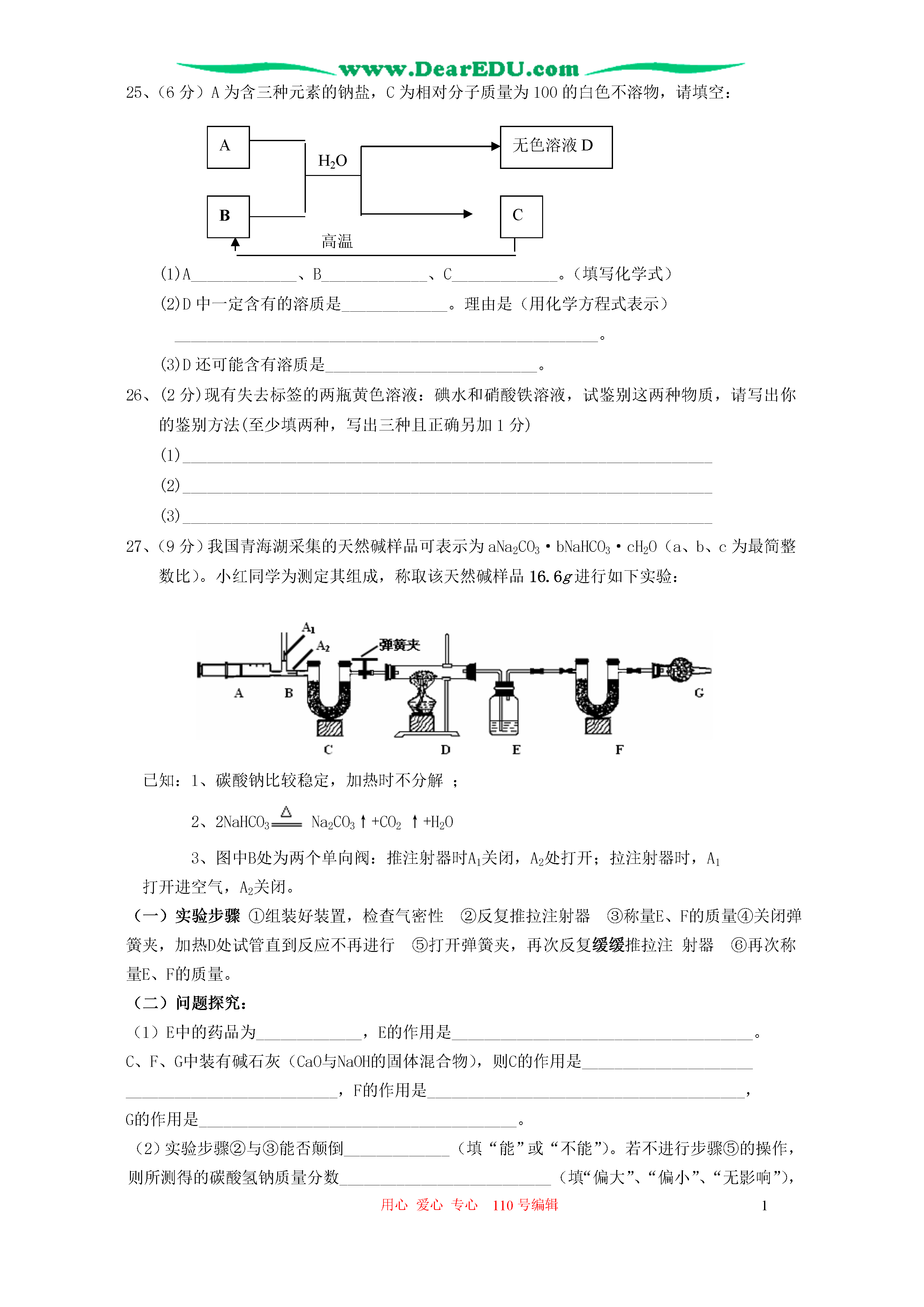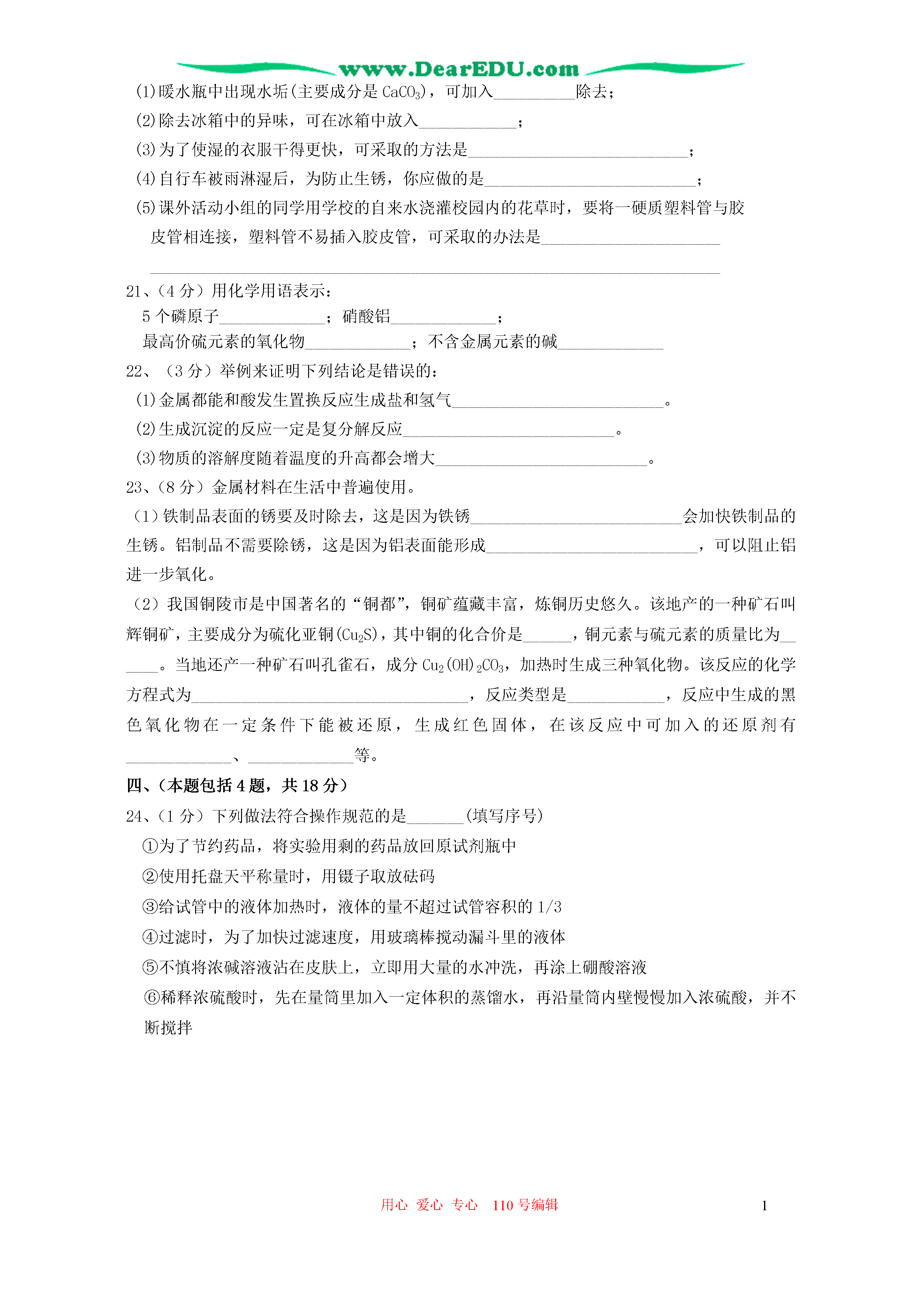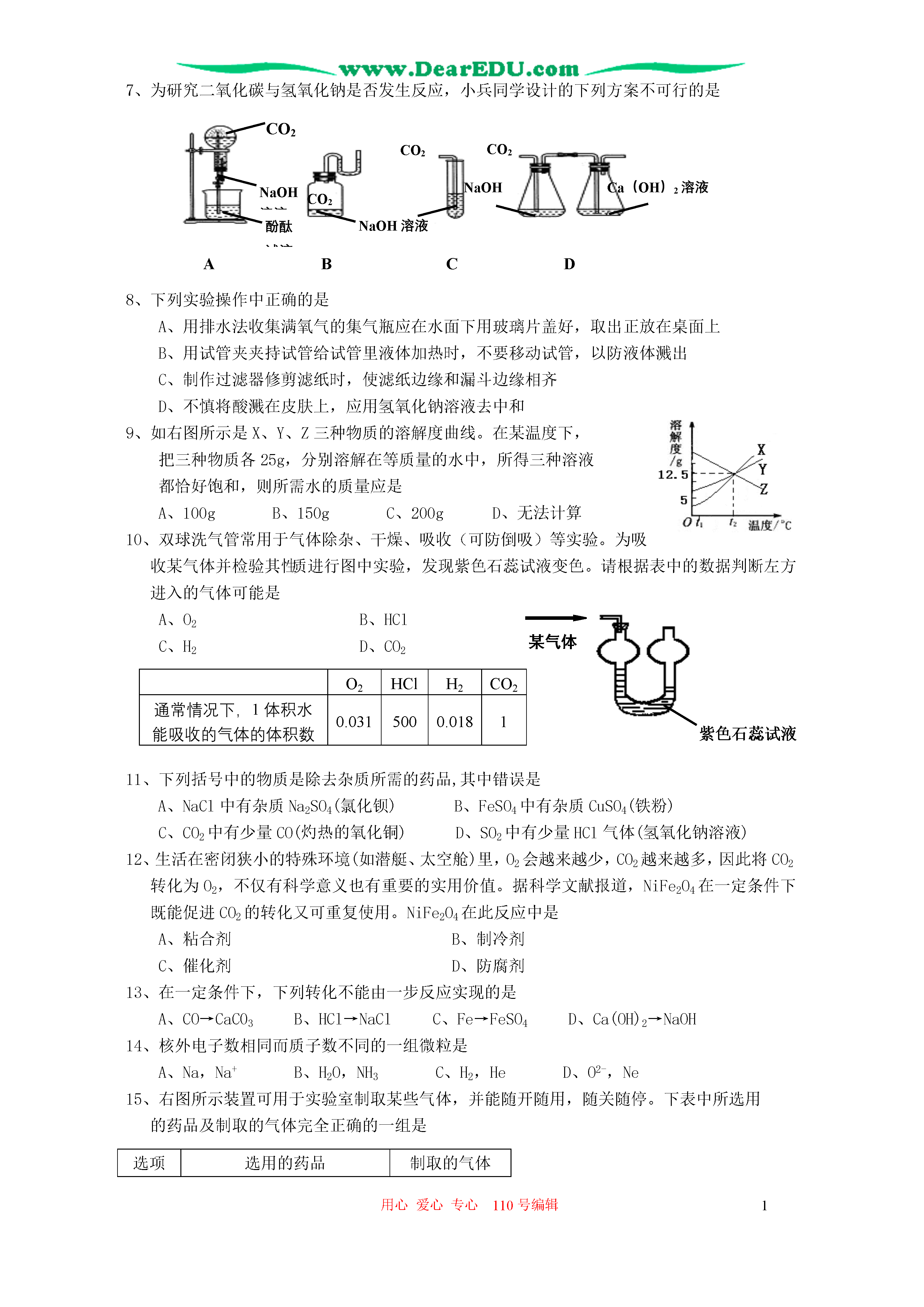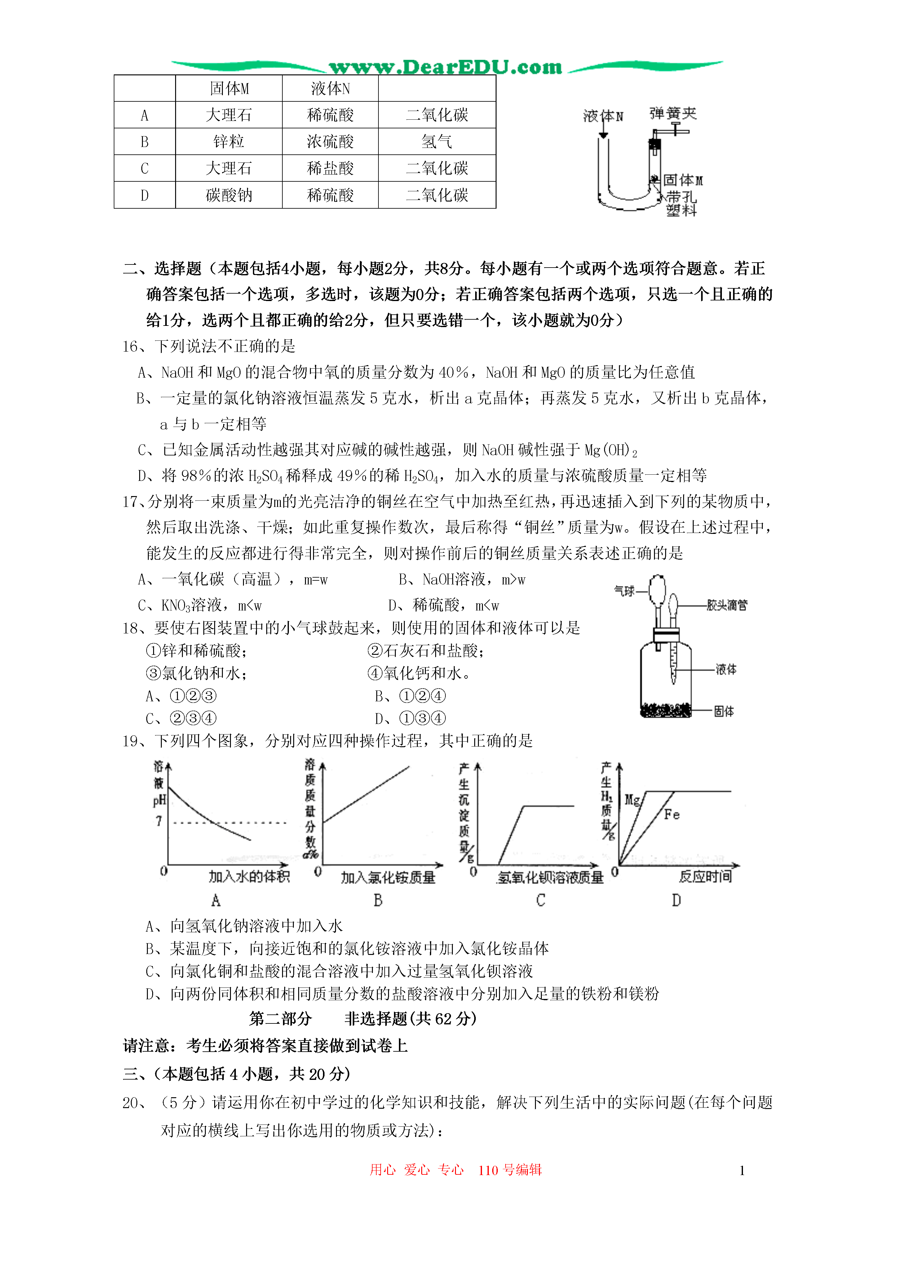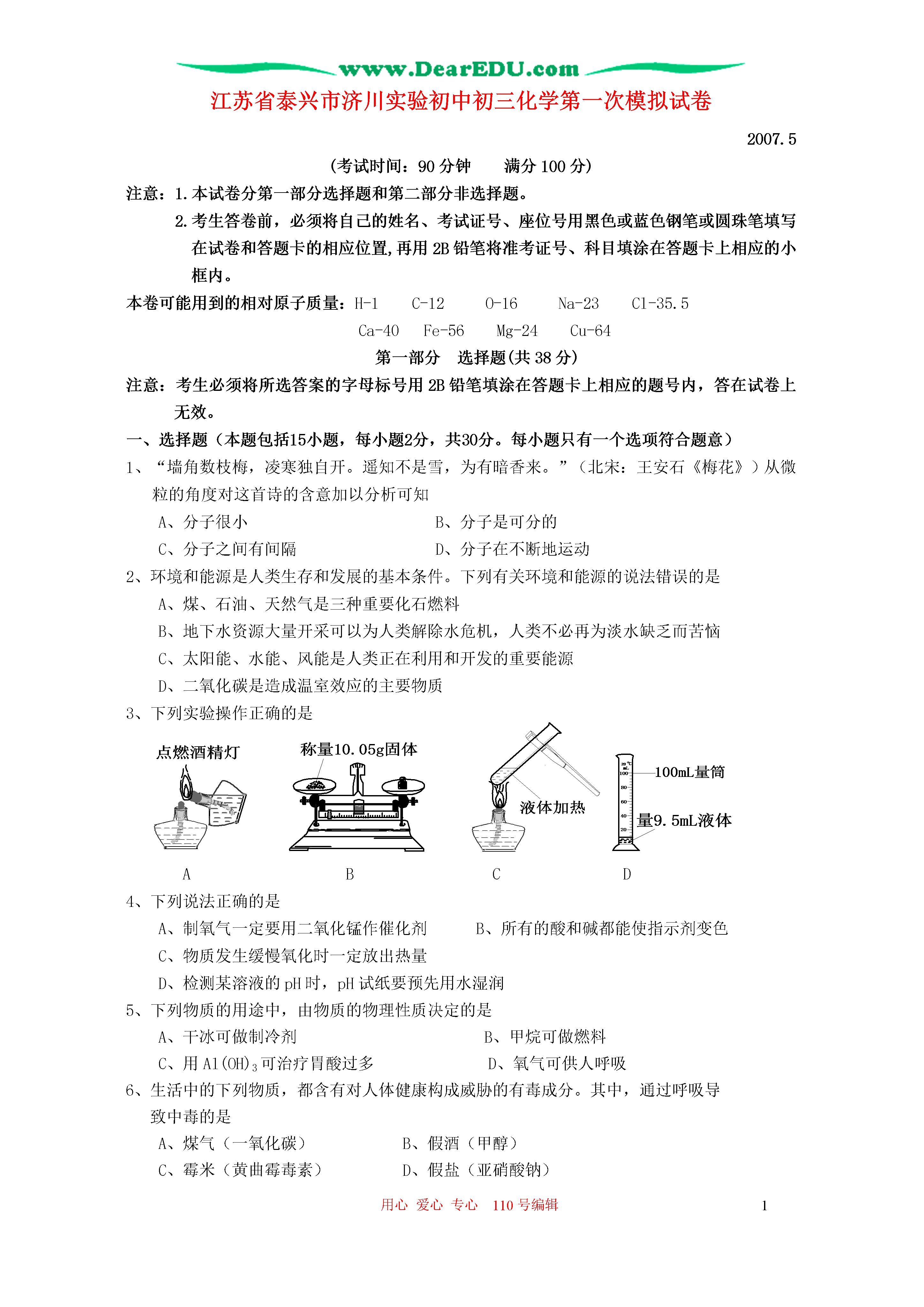 用心爱心专心110号编辑1江苏省泰兴市济川实验初中初三化学第一次模拟试卷2007.5(考试时间:90分钟满分100分)注意:1.本试卷分第一部分选择题和第二部分非选择题。2.考生答卷前,必须将自己的姓名、考试证号、座位号用黑色或蓝色钢笔或圆珠笔填写在试卷和答题卡的相应位置,再用2B铅笔将准考证号、科目填涂在答题卡上相应的小框内。本卷可能用到的相对原子质量:H-1C-12O-16Na-23Cl-35.5Ca-40Fe-56Mg-24Cu-64第一部分选择题(共38分)注意:考生必须将所选答案的字母标号用2B铅笔填涂在答题卡上相应的题号内,答在试卷上无效。一、选择题(本题包括15小题,每小题2分,共30分。每小题只有一个选项符合题意)1、“墙角数枝梅,凌寒独自开。遥知不是雪,为有暗香来。”(北宋:王安石《梅花》)从微粒的角度对这首诗的含意加以分析可知A、分子很小B、分子是可分的C、分子之间有间隔D、分子在不断地运动2、环境和能源是人类生存和发展的基本条件。下列有关环境和能源的说法错误的是A、煤、石油、天然气是三种重要化石燃料B、地下水资源大量开采可以为人类解除水危机,人类不必再为淡水缺乏而苦恼C、太阳能、水能、风能是人类正在利用和开发的重要能源D、二氧化碳是造成温室效应的主要物质3、下列实验操作正确的是ABCD4、下列说法正确的是A、制氧气一定要用二氧化锰作催化剂B、所有的酸和碱都能使指示剂变色C、物质发生缓慢氧化时一定放出热量D、检测某溶液的pH时,pH试纸要预先用水湿润5、下列物质的用途中,由物质的物理性质决定的是A、干冰可做制冷剂B、甲烷可做燃料C、用Al(OH)3可治疗胃酸过多D、氧气可供人呼吸6、生活中的下列物质,都含有对人体健康构成威胁的有毒成分。其中,通过呼吸导致中毒的是A、煤气(一氧化碳)B、假酒(甲醇)C、霉米(黄曲霉毒素)D、假盐(亚硝酸钠)酚酞试液NaOH溶液NaOHCa(OH)2溶液CO2CO2CO2→CO2→NaOH溶液ABCD7、为研究二氧化碳与氢氧化钠是否发生反应,小兵同学设计的下列方案不可行的是8、下列实验操作中正确的是A、用排水法收集满氧气的集气瓶应在水面下用玻璃片盖好,取出正放在桌面上B、用试管夹夹持试管给试管里液体加热时,不要移动试管,以防液体溅出C、制作过滤器修剪滤纸时,使滤纸边缘和漏斗边缘相齐D、不慎将酸溅在皮肤上,应用氢氧化钠溶液去中和9、如右图所示是X、Y、Z三种物质的溶解度曲线。在某温度下,把三种物质各25g,分别溶解在等质量的水中,所得三种溶液都恰好饱和,则所需水的质量应是A、100gB、150gC、200gD、无法计算某气体紫色石蕊试液10、双球洗气管常用于气体除杂、干燥、吸收(可防倒吸)等实验。为吸收某气体并检验其性质进行图中实验,发现紫色石蕊试液变色。请根据表中的数据判断左方进入的气体可能是A、O2B、HClC、H2D、CO2O2HClH2CO2通常情况下,1体积水能吸收的气体的体积数0.0315000.018111、下列括号中的物质是除去杂质所需的药品,其中错误是A、NaCl中有杂质Na2SO4(氯化钡)B、FeSO4中有杂质CuSO4(铁粉)C、CO2中有少量CO(灼热的氧化铜)D、SO2中有少量HCl气体(氢氧化钠溶液)12、生活在密闭狭小的特殊环境(如潜艇、太空舱)里,O2会越来越少,CO2越来越多,因此将CO2转化为O2,不仅有科学意义也有重要的实用价值。据科学文献报道,NiFe2O4在一定条件下既能促进CO2的转化又可重复使用。NiFe2O4在此反应中是A、粘合剂B、制冷剂C、催化剂D、防腐剂13、在一定条件下,下列转化不能由一步反应实现的是A、CO→CaC03B、HCl→NaClC、Fe→FeSO4D、Ca(OH)2→NaOH14、核外电子数相同而质子数不同的一组微粒是A、Na,Na+B、H2O,NH3C、H2,HeD、O2-,Ne15、右图所示装置可用于实验室制取某些气体,并能随开随用,随关随停。下表中所选用的药品及制取的气体完全正确的一组是选项选用的药品制取的气体固体M液体NA大理石稀硫酸二氧化碳B锌粒浓硫酸氢气C大理石稀盐酸二氧化碳D碳酸钠稀硫酸二氧化碳二、选择题(本题包括4小题,每小题2分,共8分。每小题有一个或两个选项符合题意。若正确答案包括一个选项,多选时,该题为0分;若正确答案包括两个选项,只选一个且正确的给1分,选两个且都正确的给2分,但只要选错一个,该小题就为0分)16、下列说法不正确的是A、NaOH和MgO的混合物中氧的质量分数为40%,NaOH和MgO的
