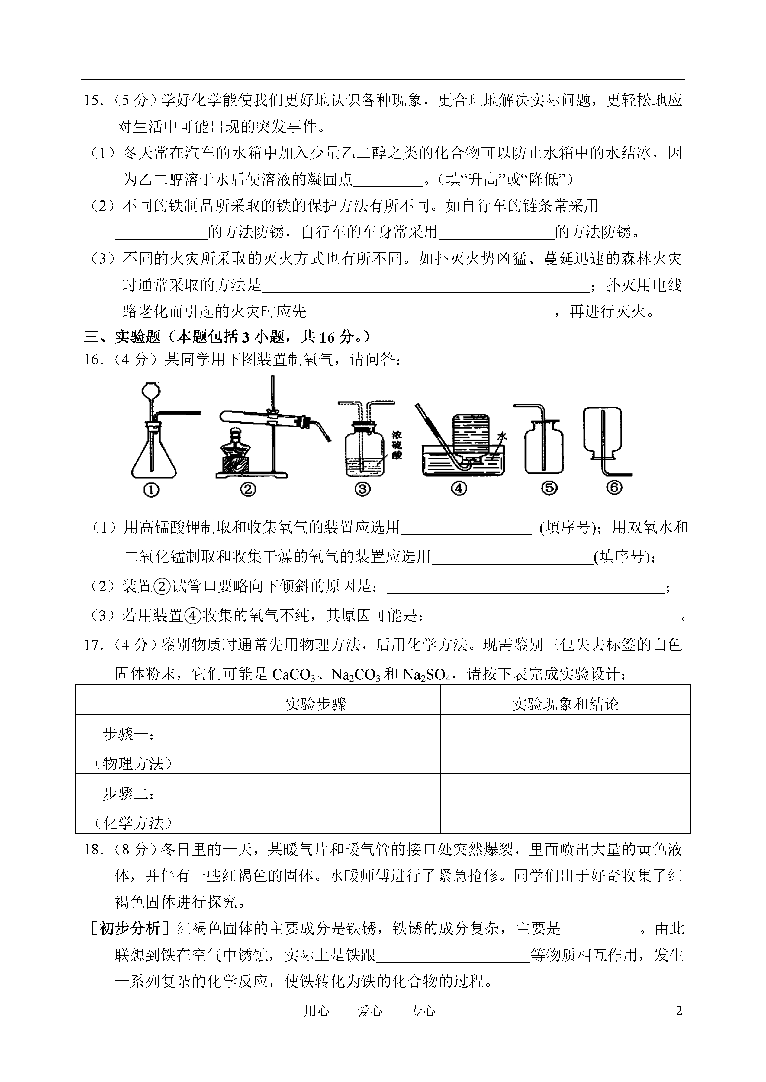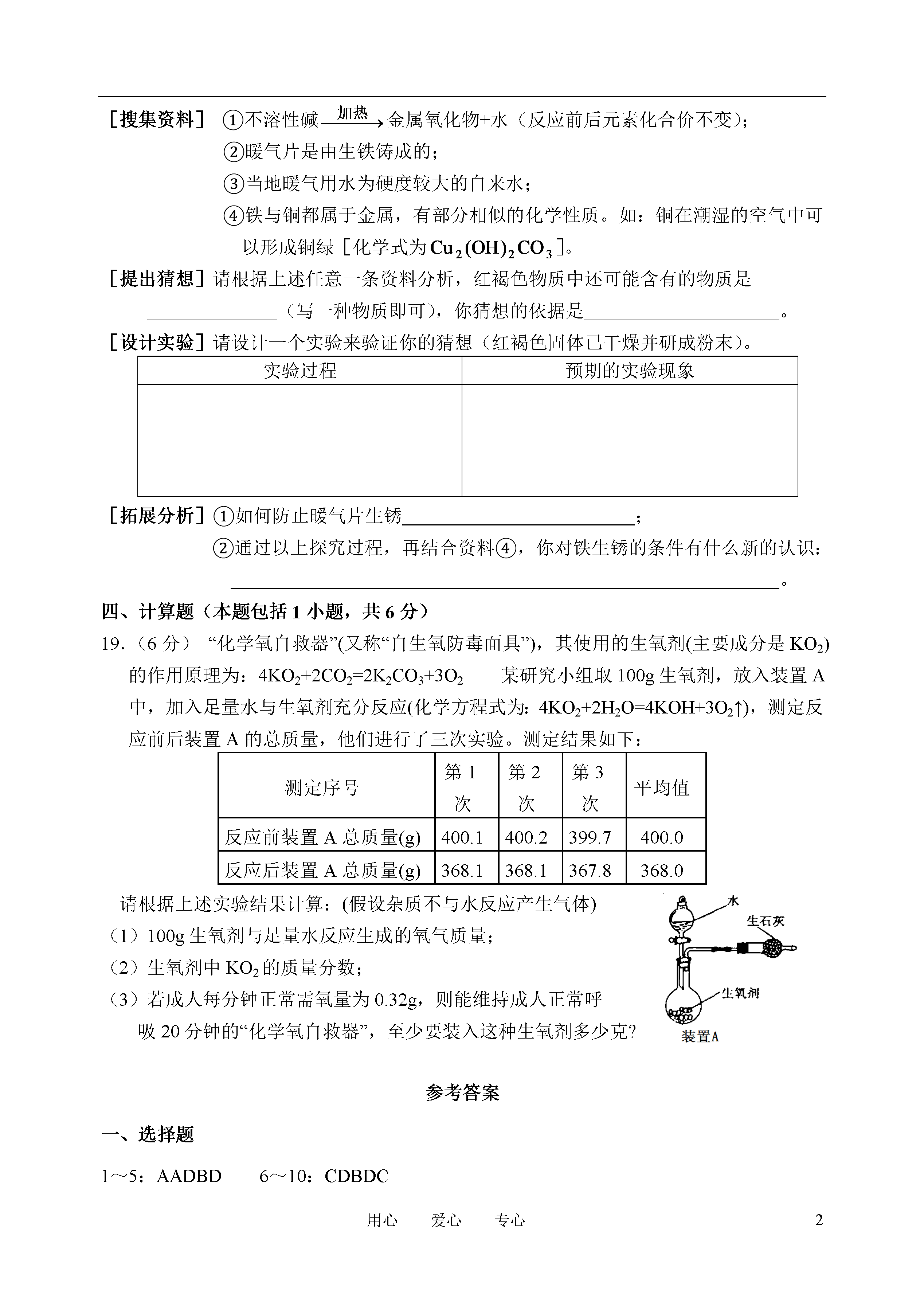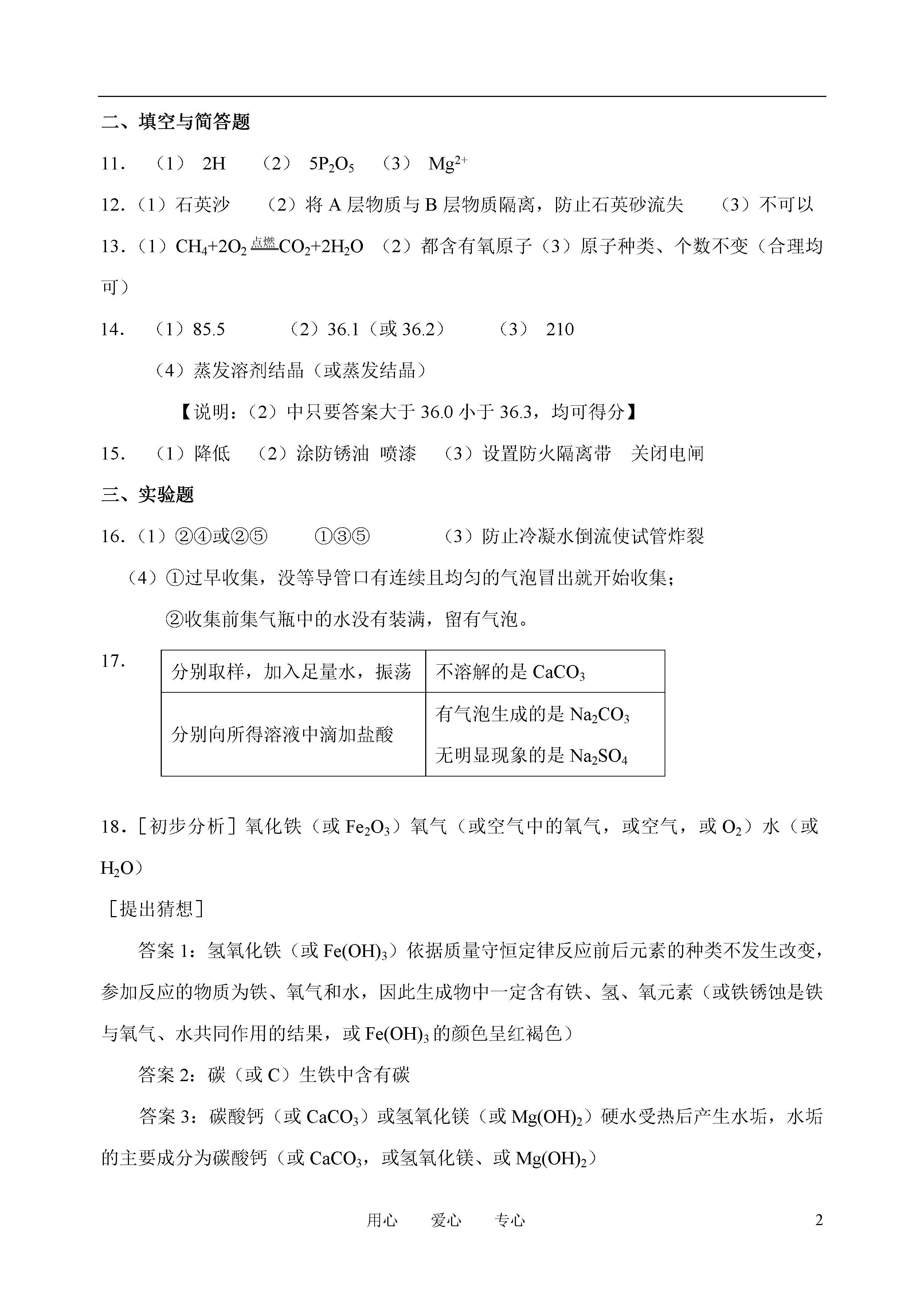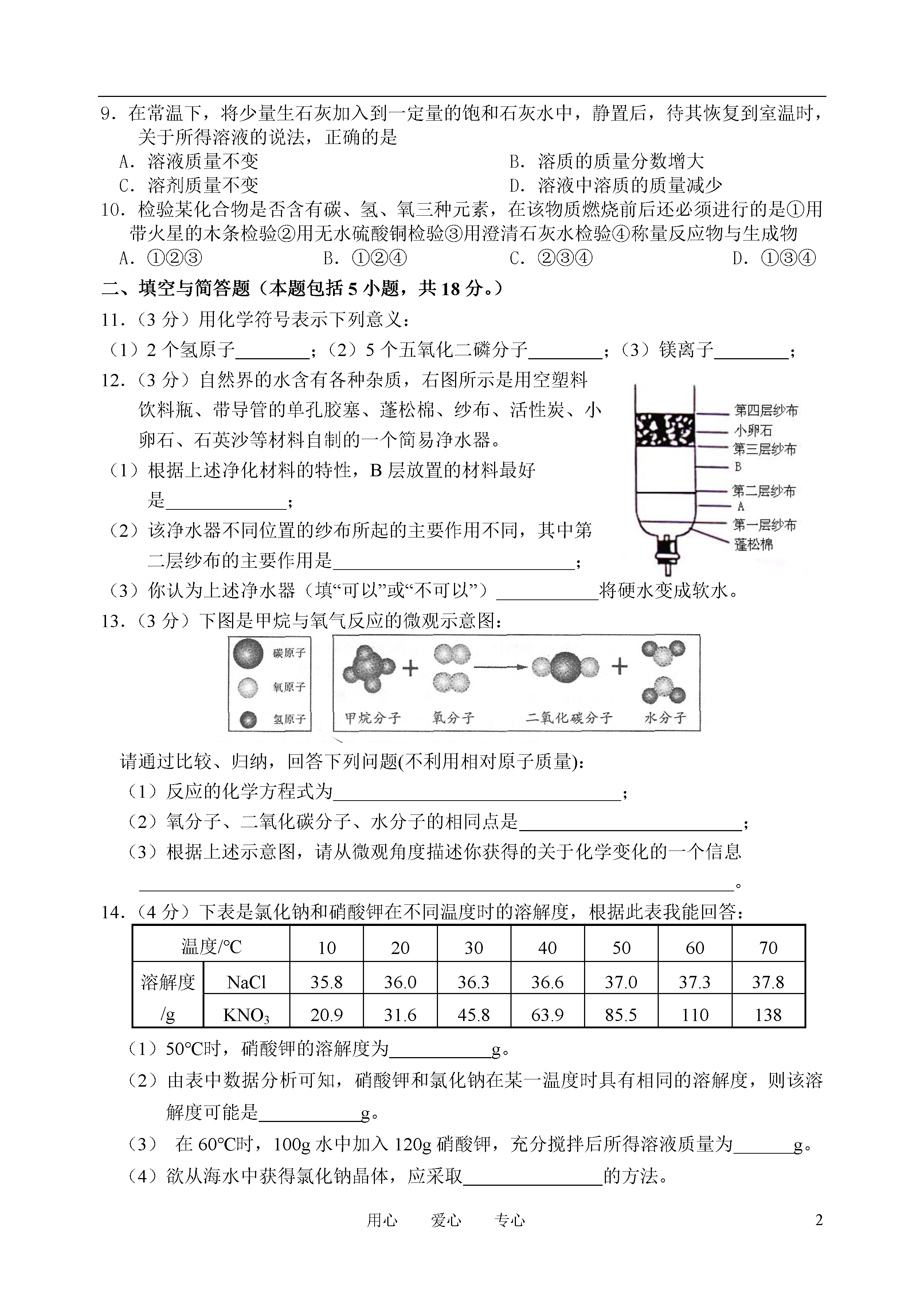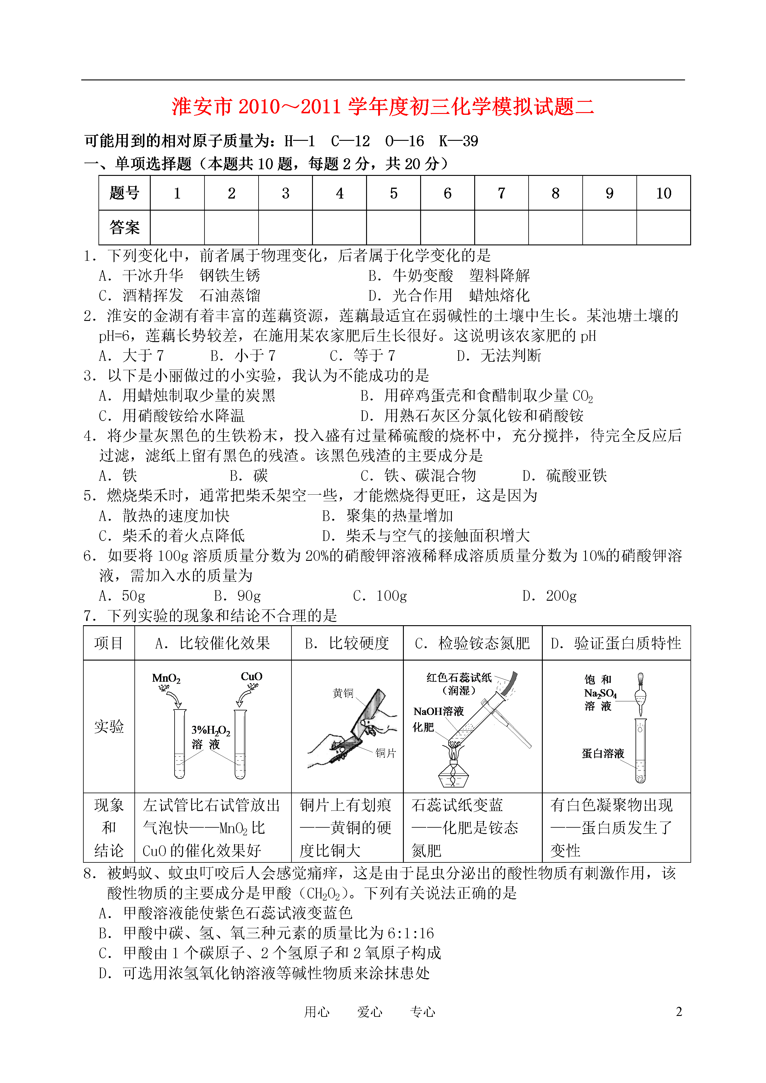 2用心爱心专心淮安市2010~2011学年度初三化学模拟试题二可能用到的相对原子质量为:H—1C—12O—16K—39一、单项选择题(本题共10题,每题2分,共20分)题号12345678910答案1.下列变化中,前者属于物理变化,后者属于化学变化的是A.干冰升华钢铁生锈B.牛奶变酸塑料降解C.酒精挥发石油蒸馏D.光合作用蜡烛熔化2.淮安的金湖有着丰富的莲藕资源,莲藕最适宜在弱碱性的土壤中生长。某池塘土壤的pH=6,莲藕长势较差,在施用某农家肥后生长很好。这说明该农家肥的pHA.大于7B.小于7C.等于7D.无法判断3.以下是小丽做过的小实验,我认为不能成功的是A.用蜡烛制取少量的炭黑B.用碎鸡蛋壳和食醋制取少量CO2C.用硝酸铵给水降温D.用熟石灰区分氯化铵和硝酸铵4.将少量灰黑色的生铁粉末,投入盛有过量稀硫酸的烧杯中,充分搅拌,待完全反应后过滤,滤纸上留有黑色的残渣。该黑色残渣的主要成分是A.铁B.碳C.铁、碳混合物D.硫酸亚铁5.燃烧柴禾时,通常把柴禾架空一些,才能燃烧得更旺,这是因为A.散热的速度加快B.聚集的热量增加C.柴禾的着火点降低D.柴禾与空气的接触面积增大6.如要将100g溶质质量分数为20%的硝酸钾溶液稀释成溶质质量分数为10%的硝酸钾溶液,需加入水的质量为A.50gB.90gC.100gD.200g7.下列实验的现象和结论不合理的是项目A.比较催化效果B.比较硬度C.检验铵态氮肥D.验证蛋白质特性实验铜片黄铜现象和结论左试管比右试管放出气泡快——MnO2比CuO的催化效果好铜片上有划痕——黄铜的硬度比铜大石蕊试纸变蓝——化肥是铵态氮肥有白色凝聚物出现——蛋白质发生了变性8.被蚂蚁、蚊虫叮咬后人会感觉痛痒,这是由于昆虫分泌出的酸性物质有刺激作用,该酸性物质的主要成分是甲酸(CH2O2)。下列有关说法正确的是A.甲酸溶液能使紫色石蕊试液变蓝色B.甲酸中碳、氢、氧三种元素的质量比为6:1:16C.甲酸由1个碳原子、2个氢原子和2氧原子构成D.可选用浓氢氧化钠溶液等碱性物质来涂抹患处9.在常温下,将少量生石灰加入到一定量的饱和石灰水中,静置后,待其恢复到室温时,关于所得溶液的说法,正确的是A.溶液质量不变B.溶质的质量分数增大C.溶剂质量不变D.溶液中溶质的质量减少10.检验某化合物是否含有碳、氢、氧三种元素,在该物质燃烧前后还必须进行的是①用带火星的木条检验②用无水硫酸铜检验③用澄清石灰水检验④称量反应物与生成物A.①②③B.①②④C.②③④D.①③④二、填空与简答题(本题包括5小题,共18分。)11.(3分)用化学符号表示下列意义:(1)2个氢原子;(2)5个五氧化二磷分子;(3)镁离子;12.(3分)自然界的水含有各种杂质,右图所示是用空塑料饮料瓶、带导管的单孔胶塞、蓬松棉、纱布、活性炭、小卵石、石英沙等材料自制的一个简易净水器。(1)根据上述净化材料的特性,B层放置的材料最好是;(2)该净水器不同位置的纱布所起的主要作用不同,其中第二层纱布的主要作用是;(3)你认为上述净水器(填“可以”或“不可以”)将硬水变成软水。13.(3分)下图是甲烷与氧气反应的微观示意图:请通过比较、归纳,回答下列问题(不利用相对原子质量):(1)反应的化学方程式为;(2)氧分子、二氧化碳分子、水分子的相同点是;(3)根据上述示意图,请从微观角度描述你获得的关于化学变化的一个信息。14.(4分)下表是氯化钠和硝酸钾在不同温度时的溶解度,根据此表我能回答:温度/℃10203040506070溶解度/gNaCl35.836.036.336.637.037.337.8KNO320.931.645.863.985.5110138(1)50℃时,硝酸钾的溶解度为g。(2)由表中数据分析可知,硝酸钾和氯化钠在某一温度时具有相同的溶解度,则该溶解度可能是g。(3)在60℃时,100g水中加入120g硝酸钾,充分搅拌后所得溶液质量为g。(4)欲从海水中获得氯化钠晶体,应采取的方法。15.(5分)学好化学能使我们更好地认识各种现象,更合理地解决实际问题,更轻松地应对生活中可能出现的突发事件。(1)冬天常在汽车的水箱中加入少量乙二醇之类的化合物可以防止水箱中的水结冰,因为乙二醇溶于水后使溶液的凝固点。(填“升高”或“降低”)(2)不同的铁制品所采取的铁的保护方法有所不同。如自行车的链条常采用的方法防锈,自行车的车身常采用的方法防锈。(3)不同的火灾所采取的灭火方式也有所不同。如扑灭火势凶猛、蔓延迅速的森林火灾时通常采取的方法是;扑灭用电线路老化而引起的火灾时应先,再进行灭火。三、实验题(本题包括3小题,共16分