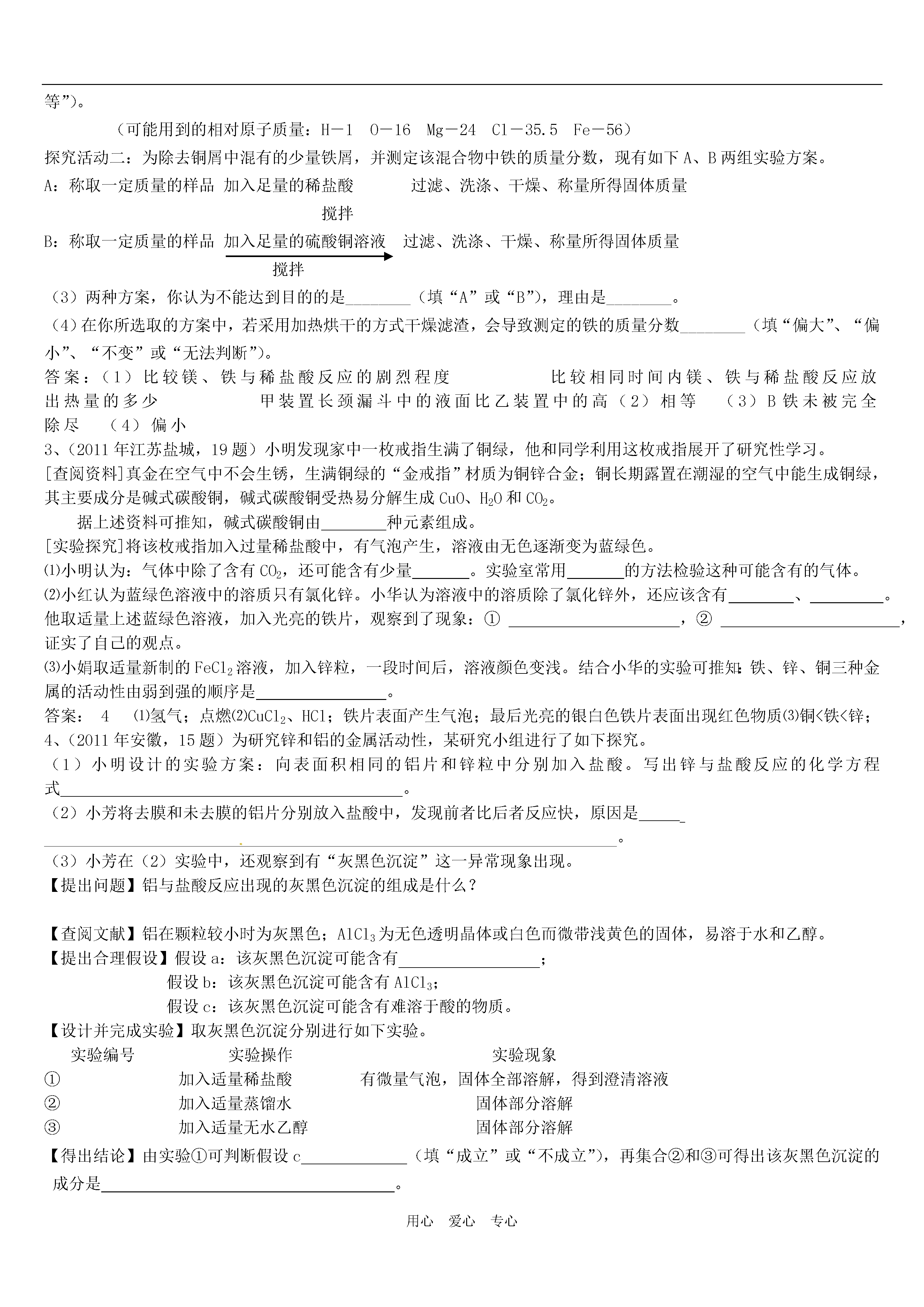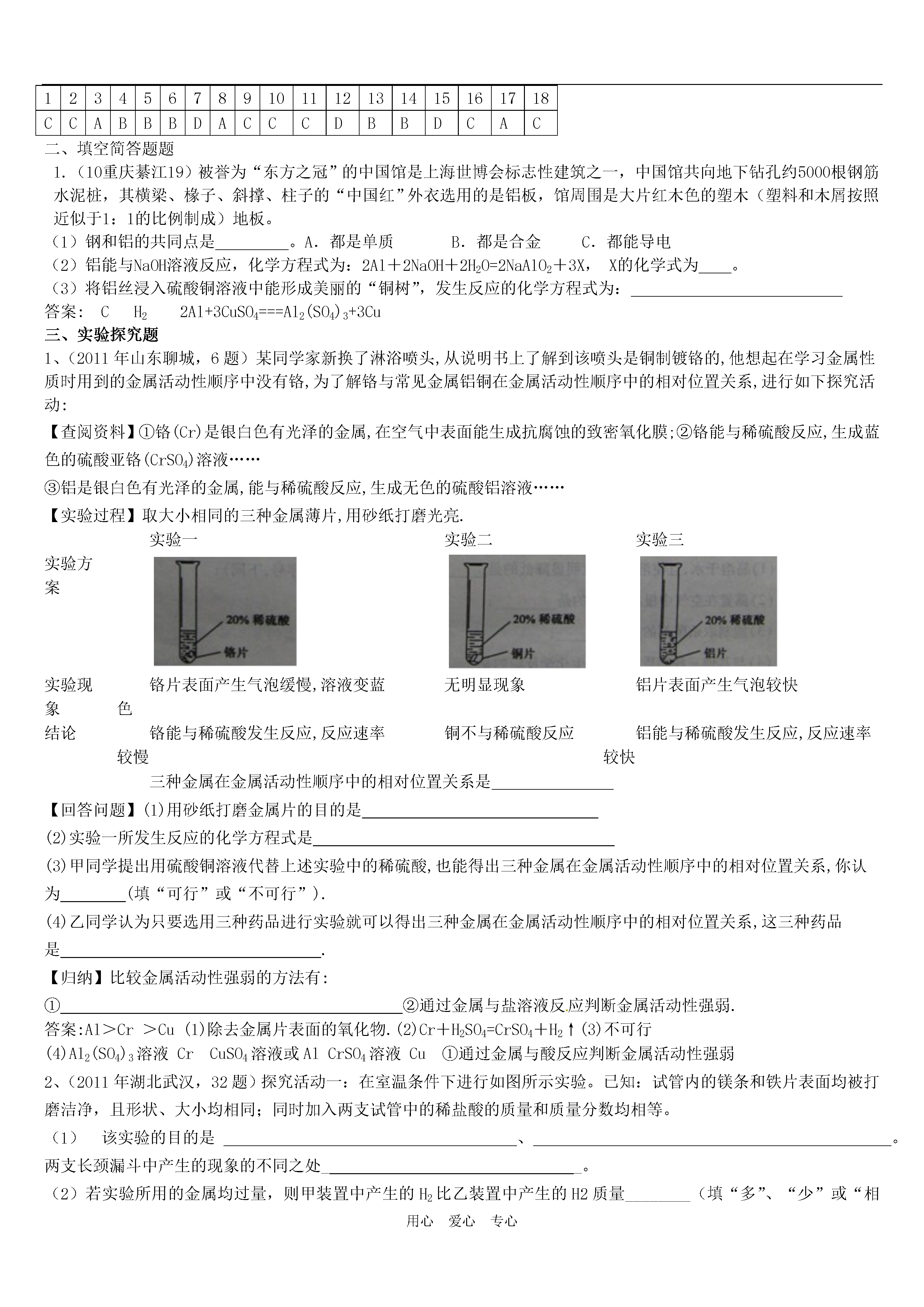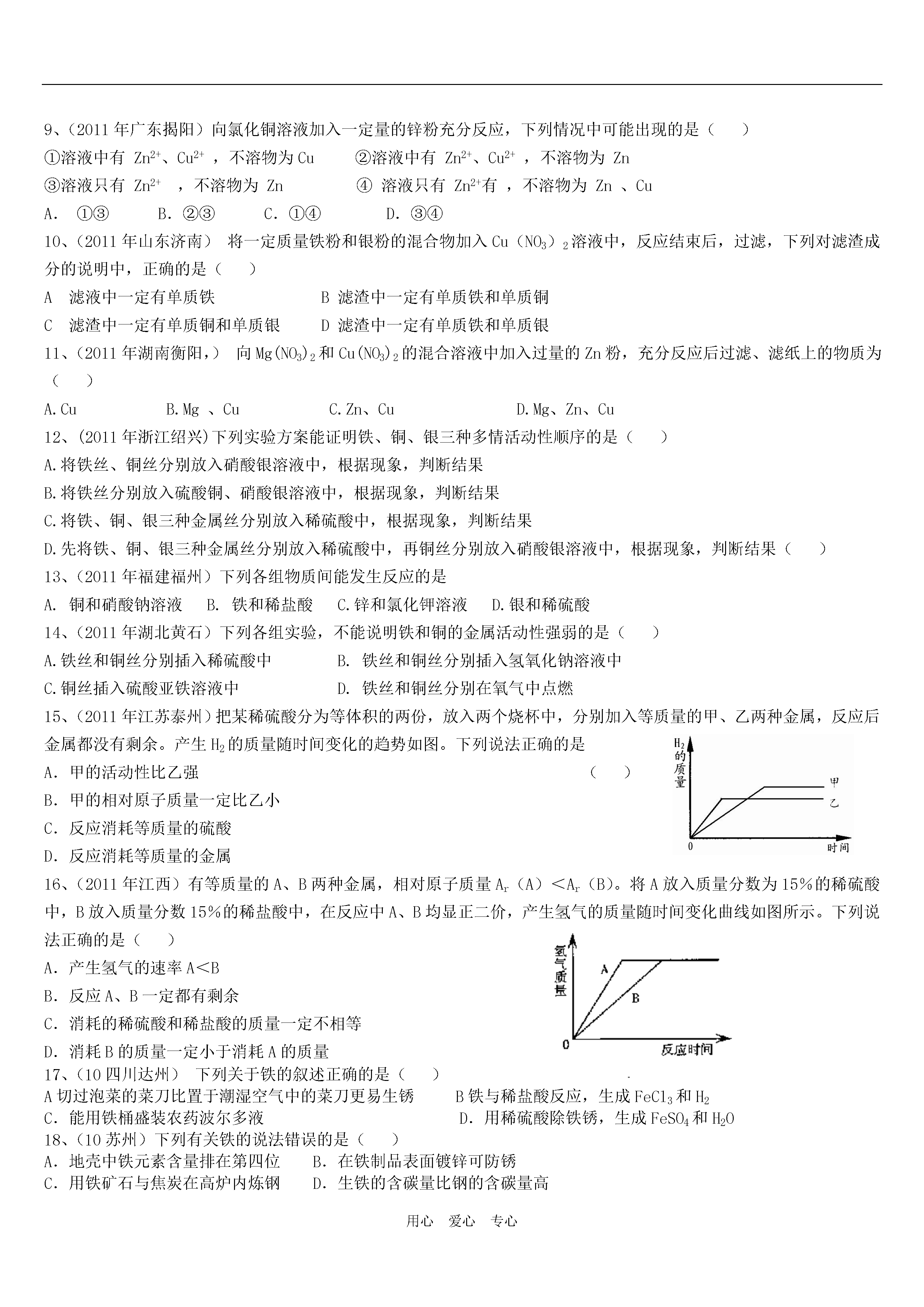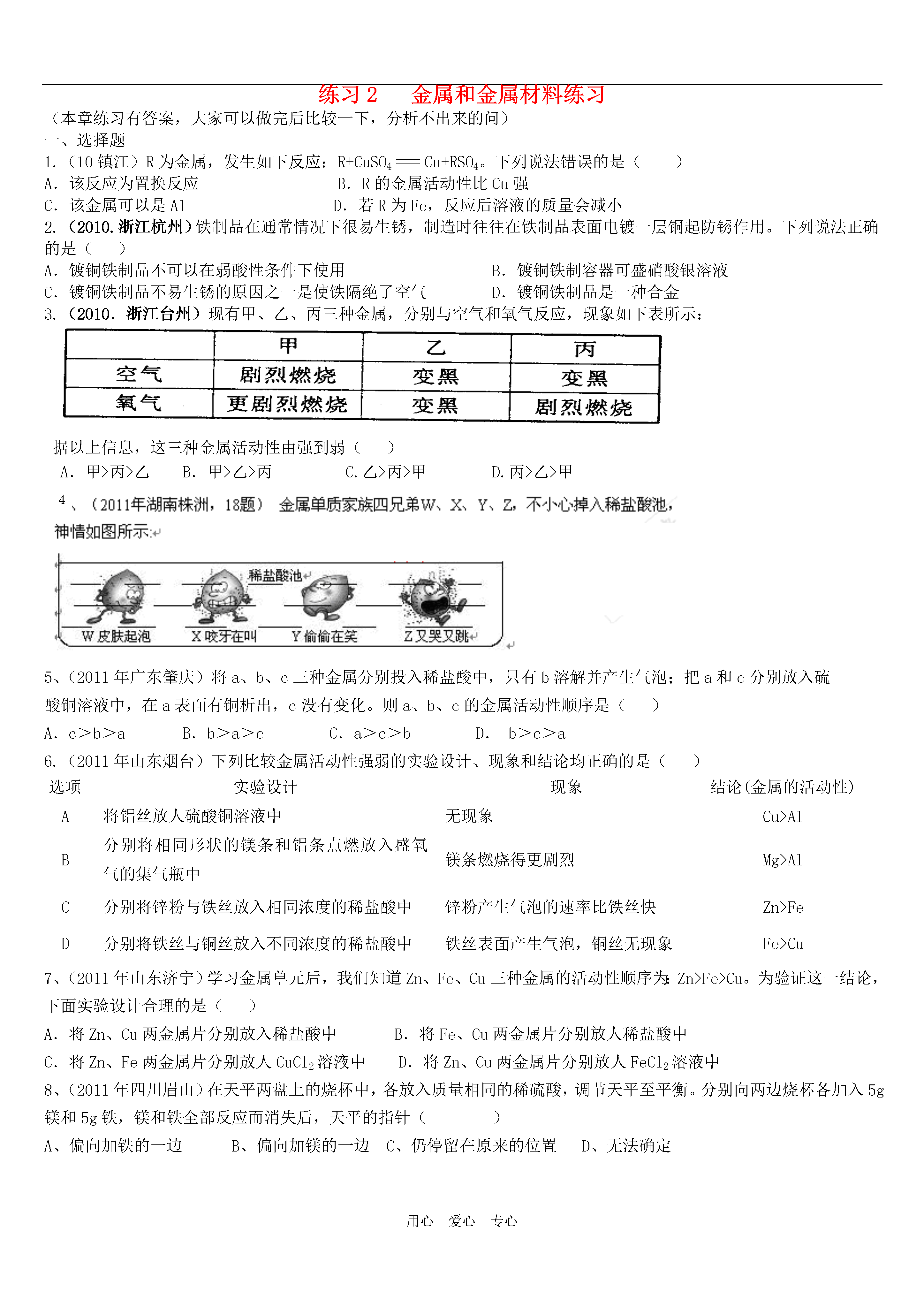 用心爱心专心练习2金属和金属材料练习(本章练习有答案,大家可以做完后比较一下,分析不出来的问)一、选择题1.(10镇江)R为金属,发生如下反应:R+CuSO4=Cu+RSO4。下列说法错误的是()A.该反应为置换反应B.R的金属活动性比Cu强C.该金属可以是AlD.若R为Fe,反应后溶液的质量会减小2.(2010.浙江杭州)铁制品在通常情况下很易生锈,制造时往往在铁制品表面电镀一层铜起防锈作用。下列说法正确的是()A.镀铜铁制品不可以在弱酸性条件下使用B.镀铜铁制容器可盛硝酸银溶液C.镀铜铁制品不易生锈的原因之一是使铁隔绝了空气D.镀铜铁制品是一种合金3.(2010.浙江台州)现有甲、乙、丙三种金属,分别与空气和氧气反应,现象如下表所示:据以上信息,这三种金属活动性由强到弱()4、A.甲>丙>乙B.甲>乙>丙C.乙>丙>甲D.丙>乙>甲则W、X、Y、Z的金属活动性顺序为()A.X>W>Z>YB.Z>X>W>YC.W>X>Y>ZD.Y>Z>X>W5、(2011年广东肇庆)将a、b、c三种金属分别投入稀盐酸中,只有b溶解并产生气泡;把a和c分别放入硫酸铜溶液中,在a表面有铜析出,c没有变化。则a、b、c的金属活动性顺序是()A.c>b>aB.b>a>cC.a>c>bD.b>c>a6.(2011年山东烟台)下列比较金属活动性强弱的实验设计、现象和结论均正确的是()选项实验设计现象结论(金属的活动性)A将铝丝放人硫酸铜溶液中无现象Cu>AlB分别将相同形状的镁条和铝条点燃放入盛氧气的集气瓶中镁条燃烧得更剧烈Mg>AlC分别将锌粉与铁丝放入相同浓度的稀盐酸中锌粉产生气泡的速率比铁丝快Zn>FeD分别将铁丝与铜丝放入不同浓度的稀盐酸中铁丝表面产生气泡,铜丝无现象Fe>Cu7、(2011年山东济宁)学习金属单元后,我们知道Zn、Fe、Cu三种金属的活动性顺序为:Zn>Fe>Cu。为验证这一结论,下面实验设计合理的是()A.将Zn、Cu两金属片分别放入稀盐酸中B.将Fe、Cu两金属片分别放人稀盐酸中C.将Zn、Fe两金属片分别放人CuCl2溶液中D.将Zn、Cu两金属片分别放人FeCl2溶液中8、(2011年四川眉山)在天平两盘上的烧杯中,各放入质量相同的稀硫酸,调节天平至平衡。分别向两边烧杯各加入5g镁和5g铁,镁和铁全部反应而消失后,天平的指针()A、偏向加铁的一边B、偏向加镁的一边C、仍停留在原来的位置D、无法确定9、(2011年广东揭阳)向氯化铜溶液加入一定量的锌粉充分反应,下列情况中可能出现的是()①溶液中有Zn2+、Cu2+,不溶物为Cu②溶液中有Zn2+、Cu2+,不溶物为Zn③溶液只有Zn2+,不溶物为Zn④溶液只有Zn2+有,不溶物为Zn、CuA.①③B.②③C.①④D.③④10、(2011年山东济南)将一定质量铁粉和银粉的混合物加入Cu(NO3)2溶液中,反应结束后,过滤,下列对滤渣成分的说明中,正确的是()A滤液中一定有单质铁B滤渣中一定有单质铁和单质铜C滤渣中一定有单质铜和单质银D滤渣中一定有单质铁和单质银11、(2011年湖南衡阳,)向Mg(NO3)2和Cu(NO3)2的混合溶液中加入过量的Zn粉,充分反应后过滤、滤纸上的物质为()A.CuB.Mg、CuC.Zn、CuD.Mg、Zn、Cu12、(2011年浙江绍兴)下列实验方案能证明铁、铜、银三种多情活动性顺序的是()A.将铁丝、铜丝分别放入硝酸银溶液中,根据现象,判断结果B.将铁丝分别放入硫酸铜、硝酸银溶液中,根据现象,判断结果C.将铁、铜、银三种金属丝分别放入稀硫酸中,根据现象,判断结果D.先将铁、铜、银三种金属丝分别放入稀硫酸中,再铜丝分别放入硝酸银溶液中,根据现象,判断结果()13、(2011年福建福州)下列各组物质间能发生反应的是A.铜和硝酸钠溶液B.铁和稀盐酸C.锌和氯化钾溶液D.银和稀硫酸14、(2011年湖北黄石)下列各组实验,不能说明铁和铜的金属活动性强弱的是()A.铁丝和铜丝分别插入稀硫酸中B.铁丝和铜丝分别插入氢氧化钠溶液中C.铜丝插入硫酸亚铁溶液中D.铁丝和铜丝分别在氧气中点燃15、(2011年江苏泰州)把某稀硫酸分为等体积的两份,放入两个烧杯中,分别加入等质量的甲、乙两种金属,反应后金属都没有剩余。产生H2的质量随时间变化的趋势如图。下列说法正确的是A.甲的活动性比乙强()B.甲的相对原子质量一定比乙小C.反应消耗等质量的硫酸D.反应消耗等质量的金属16、(2011年江西)有等质量的A、B两种金属,相对原子质量Ar(A)<Ar(B)。将A放入质量分数为15%的稀硫酸中,B放入质量分数15%的稀盐酸中,在反应中A
