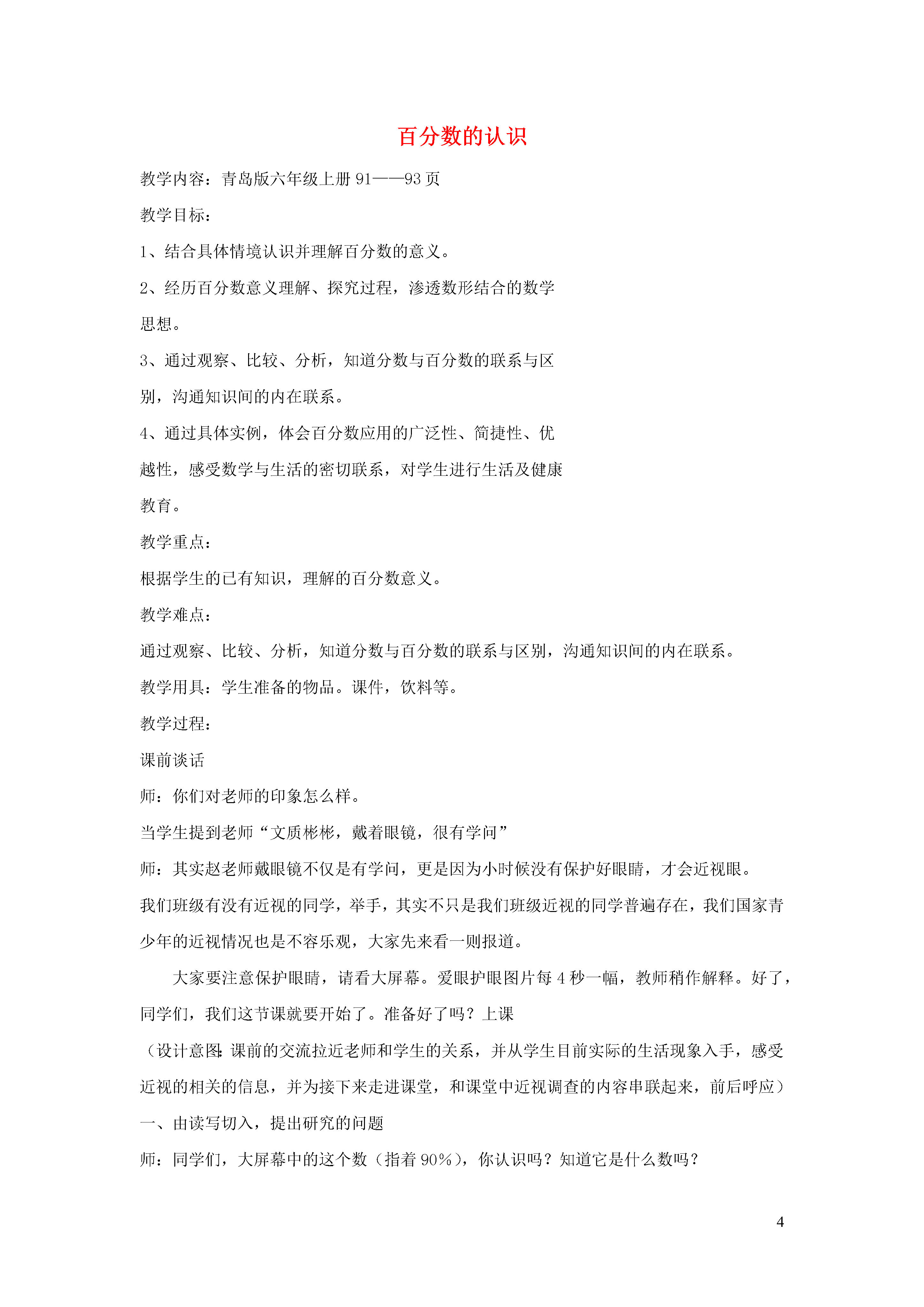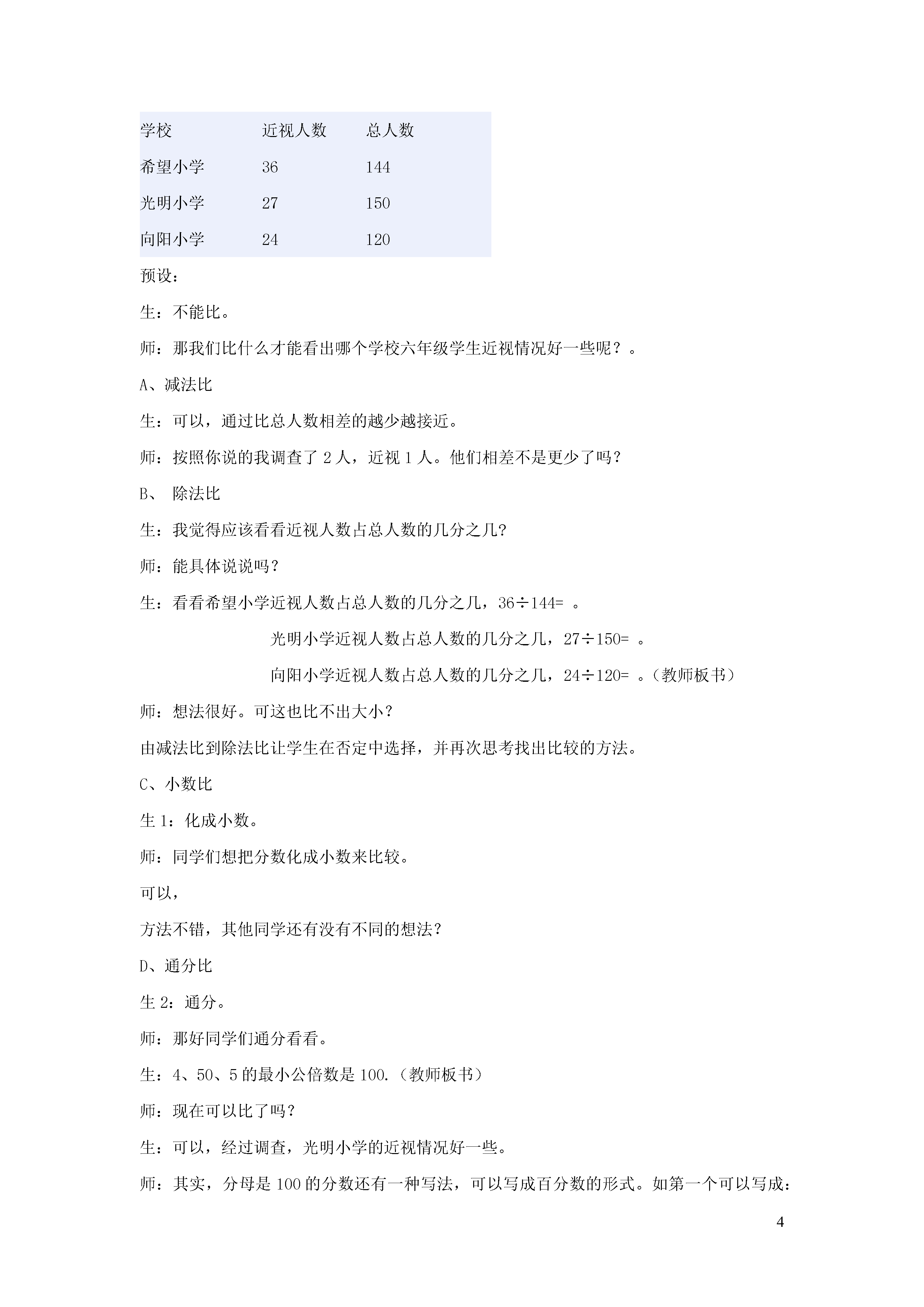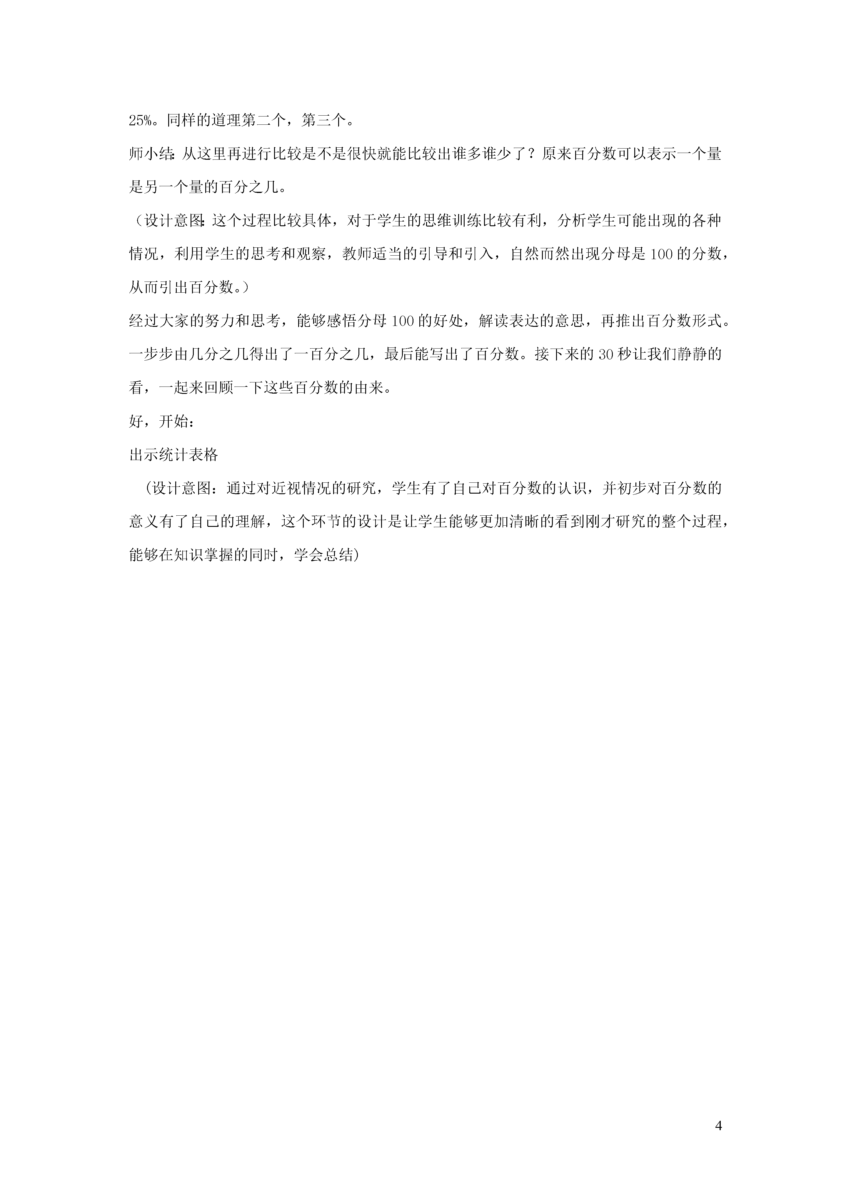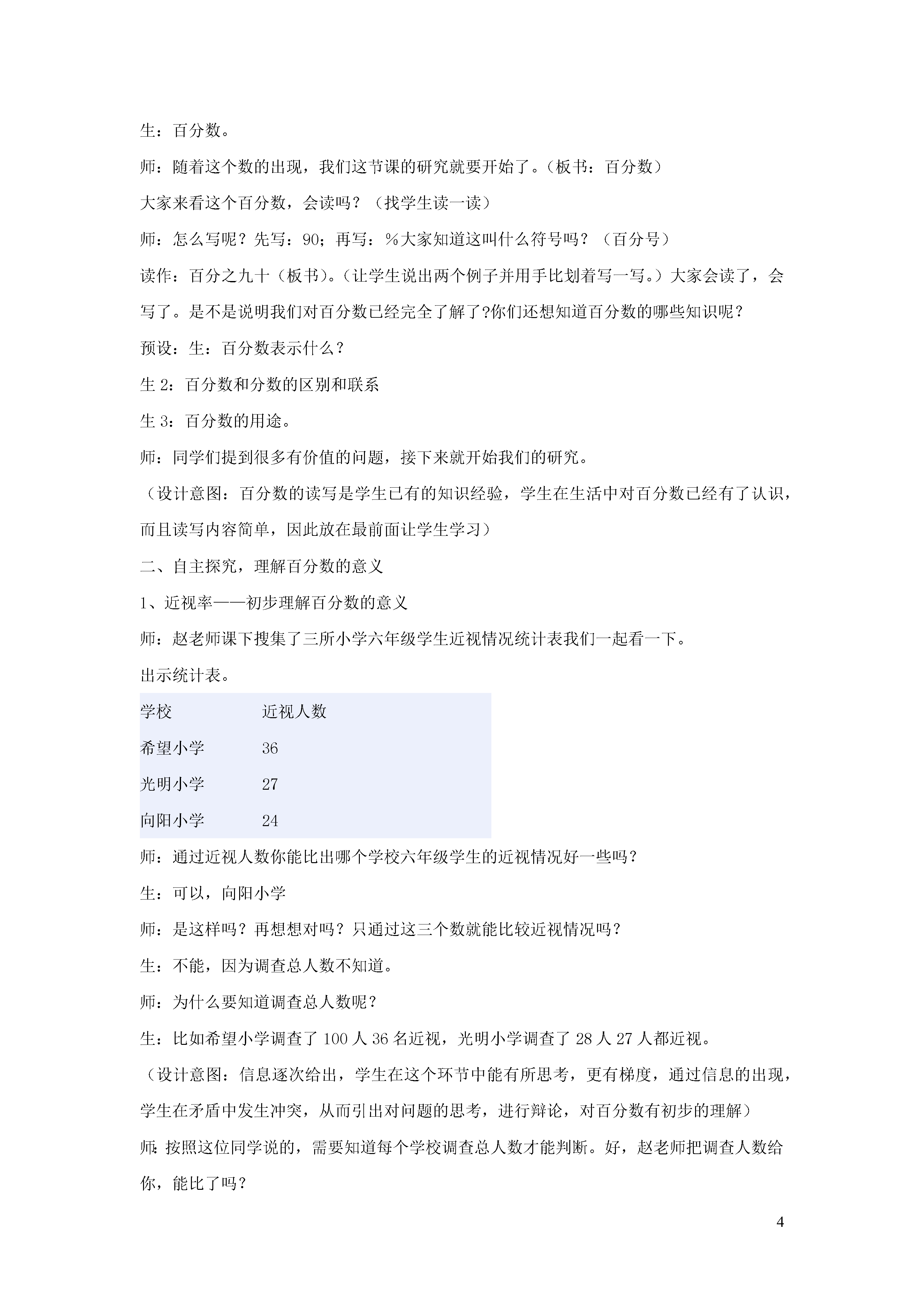4百分数的认识教学内容:青岛版六年级上册91——93页教学目标:1、结合具体情境认识并理解百分数的意义。2、经历百分数意义理解、探究过程,渗透数形结合的数学思想。3、通过观察、比较、分析,知道分数与百分数的联系与区别,沟通知识间的内在联系。4、通过具体实例,体会百分数应用的广泛性、简捷性、优越性,感受数学与生活的密切联系,对学生进行生活及健康教育。教学重点:根据学生的已有知识,理解的百分数意义。教学难点:通过观察、比较、分析,知道分数与百分数的联系与区别,沟通知识间的内在联系。教学用具:学生准备的物品。课件,饮料等。教学过程:课前谈话师:你们对老师的印象怎么样。当学生提到老师“文质彬彬,戴着眼镜,很有学问”师:其实赵老师戴眼镜不仅是有学问,更是因为小时候没有保护好眼睛,才会近视眼。我们班级有没有近视的同学,举手,其实不只是我们班级近视的同学普遍存在,我们国家青少年的近视情况也是不容乐观,大家先来看一则报道。大家要注意保护眼睛,请看大屏幕。爱眼护眼图片每4秒一幅,教师稍作解释。好了,同学们,我们这节课就要开始了。准备好了吗?上课(设计意图:课前的交流拉近老师和学生的关系,并从学生目前实际的生活现象入手,感受近视的相关的信息,并为接下来走进课堂,和课堂中近视调查的内容串联起来,前后呼应)一、由读写切入,提出研究的问题师:同学们,大屏幕中的这个数(指着90%),你认识吗?知道它是什么数吗?生:百分数。师:随着这个数的出现,我们这节课的研究就要开始了。(板书:百分数)大家来看这个百分数,会读吗?(找学生读一读)师:怎么写呢?先写:90;再写:%大家知道这叫什么符号吗?(百分号)读作:百分之九十(板书)。(让学生说出两个例子并用手比划着写一写。)大家会读了,会写了。是不是说明我们对百分数已经完全了解了?你们还想知道百分数的哪些知识呢?预设:生:百分数表示什么?生2:百分数和分数的区别和联系生3:百分数的用途。师:同学们提到很多有价值的问题,接下来就开始我们的研究。(设计意图:百分数的读写是学生已有的知识经验,学生在生活中对百分数已经有了认识,而且读写内容简单,因此放在最前面让学生学习)二、自主探究,理解百分数的意义1、近视率——初步理解百分数的意义师:赵老师课下搜集了三所小学六年级学生近视情况统计表我们一起看一下。出示统计表。学校近视人数希望小学36光明小学27向阳小学24师:通过近视人数你能比出哪个学校六年级学生的近视情况好一些吗?生:可以,向阳小学师:是这样吗?再想想对吗?只通过这三个数就能比较近视情况吗?生:不能,因为调查总人数不知道。师:为什么要知道调查总人数呢?生:比如希望小学调查了100人36名近视,光明小学调查了28人27人都近视。(设计意图:信息逐次给出,学生在这个环节中能有所思考,更有梯度,通过信息的出现,学生在矛盾中发生冲突,从而引出对问题的思考,进行辩论,对百分数有初步的理解)师:按照这位同学说的,需要知道每个学校调查总人数才能判断。好,赵老师把调查人数给你,能比了吗?学校近视人数总人数希望小学36144光明小学27150向阳小学24120预设:生:不能比。师:那我们比什么才能看出哪个学校六年级学生近视情况好一些呢?。A、减法比生:可以,通过比总人数相差的越少越接近。师:按照你说的我调查了2人,近视1人。他们相差不是更少了吗?B、除法比生:我觉得应该看看近视人数占总人数的几分之几?师:能具体说说吗?生:看看希望小学近视人数占总人数的几分之几,36÷144=。光明小学近视人数占总人数的几分之几,27÷150=。向阳小学近视人数占总人数的几分之几,24÷120=。(教师板书)师:想法很好。可这也比不出大小?由减法比到除法比让学生在否定中选择,并再次思考找出比较的方法。C、小数比生1:化成小数。师:同学们想把分数化成小数来比较。可以,方法不错,其他同学还有没有不同的想法?D、通分比生2:通分。师:那好同学们通分看看。生:4、50、5的最小公倍数是100.(教师板书)师:现在可以比了吗?生:可以,经过调查,光明小学的近视情况好一些。师:其实,分母是100的分数还有一种写法,可以写成百分数的形式。如第一个可以写成:25%。同样的道理第二个,第三个。师小结:从这里再进行比较是不是很快就能比较出谁多谁少了?原来百分数可以表示一个量是另一个量的百分之几。(设计意图:这个过程比较具体,对于学生的思维训练比较有利,分析学生可能出现的各种情况,利用学生的思考和观察,教师适当的引导和引入,自然而然出现分母是10