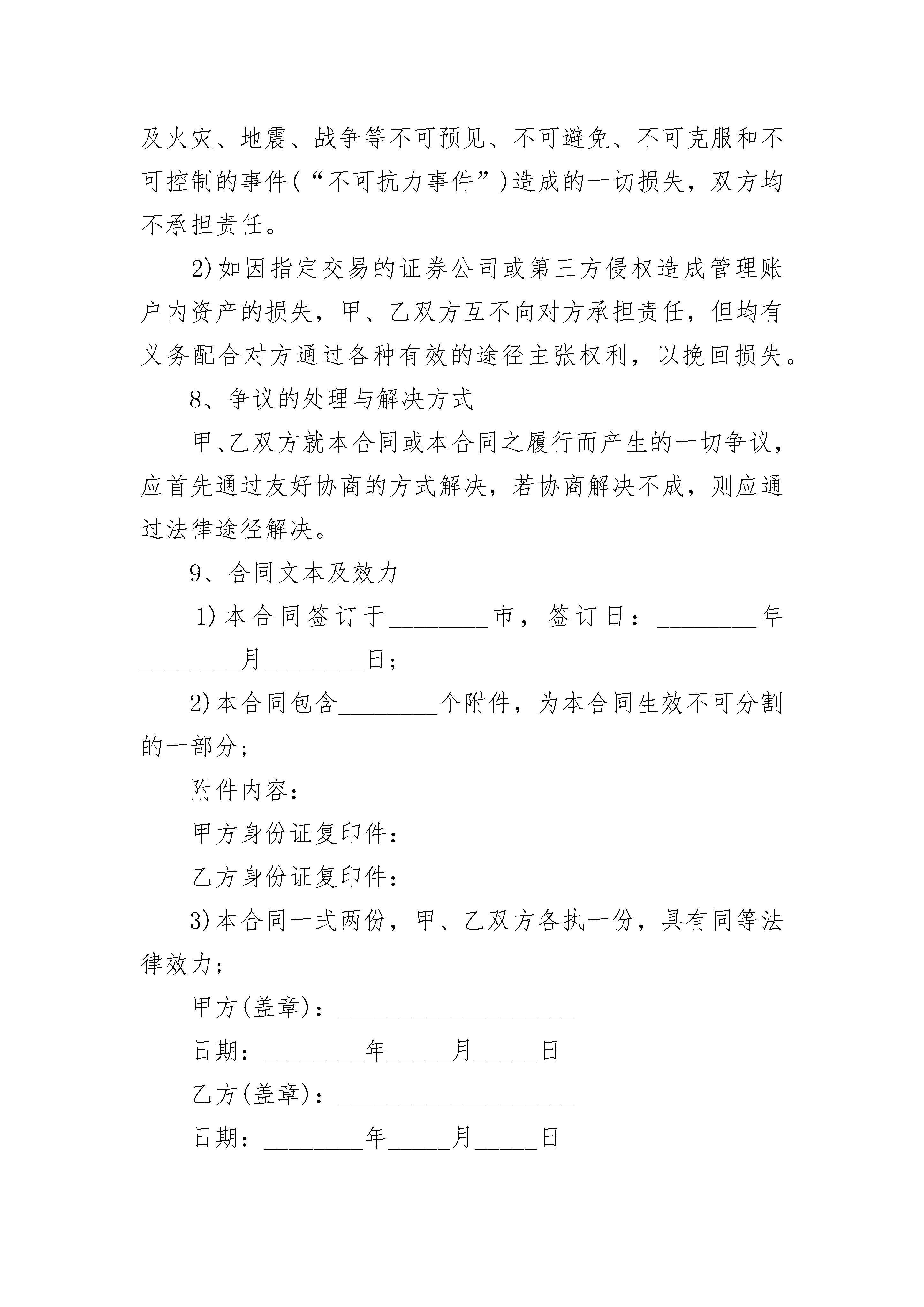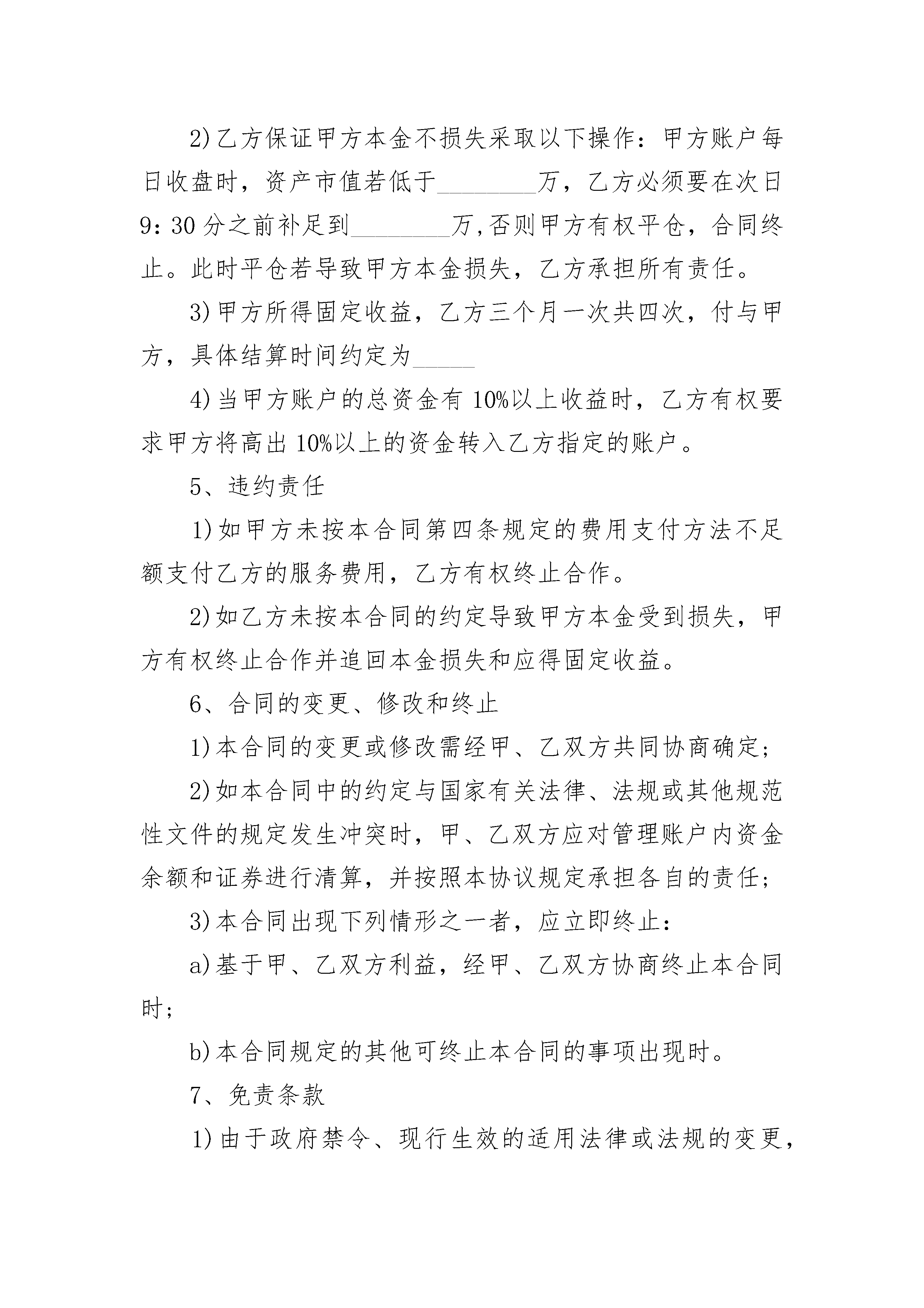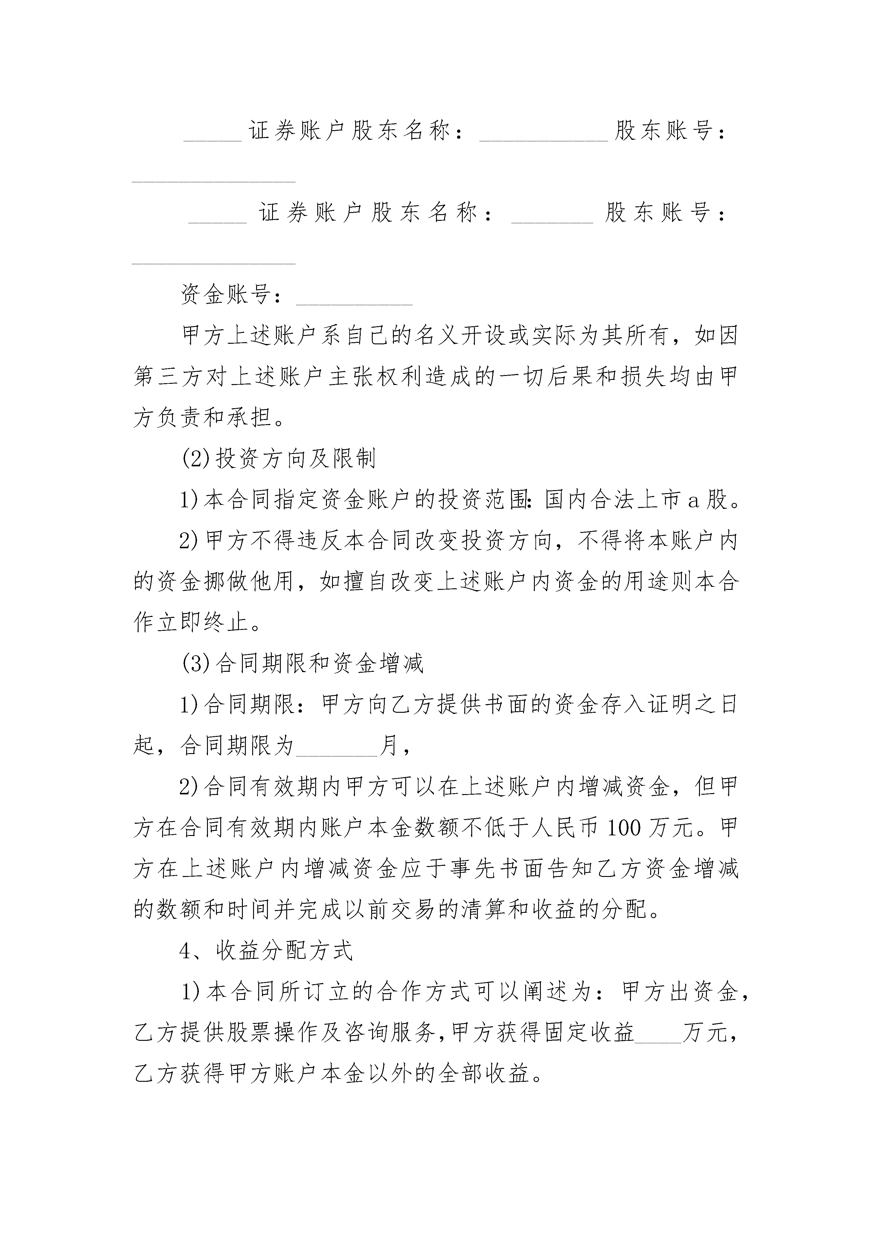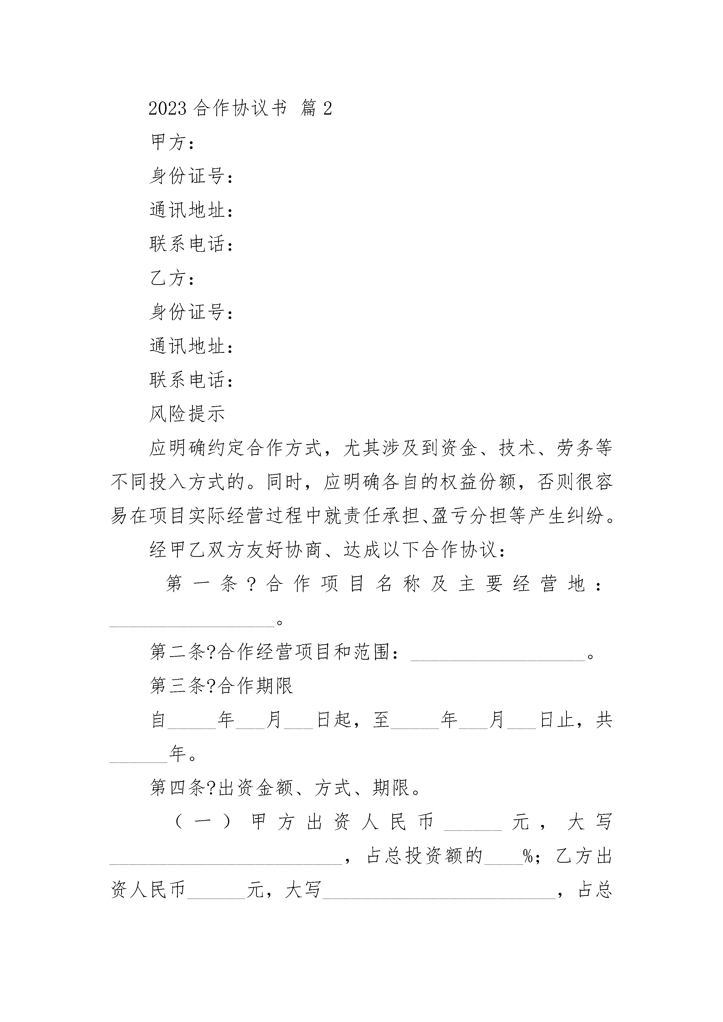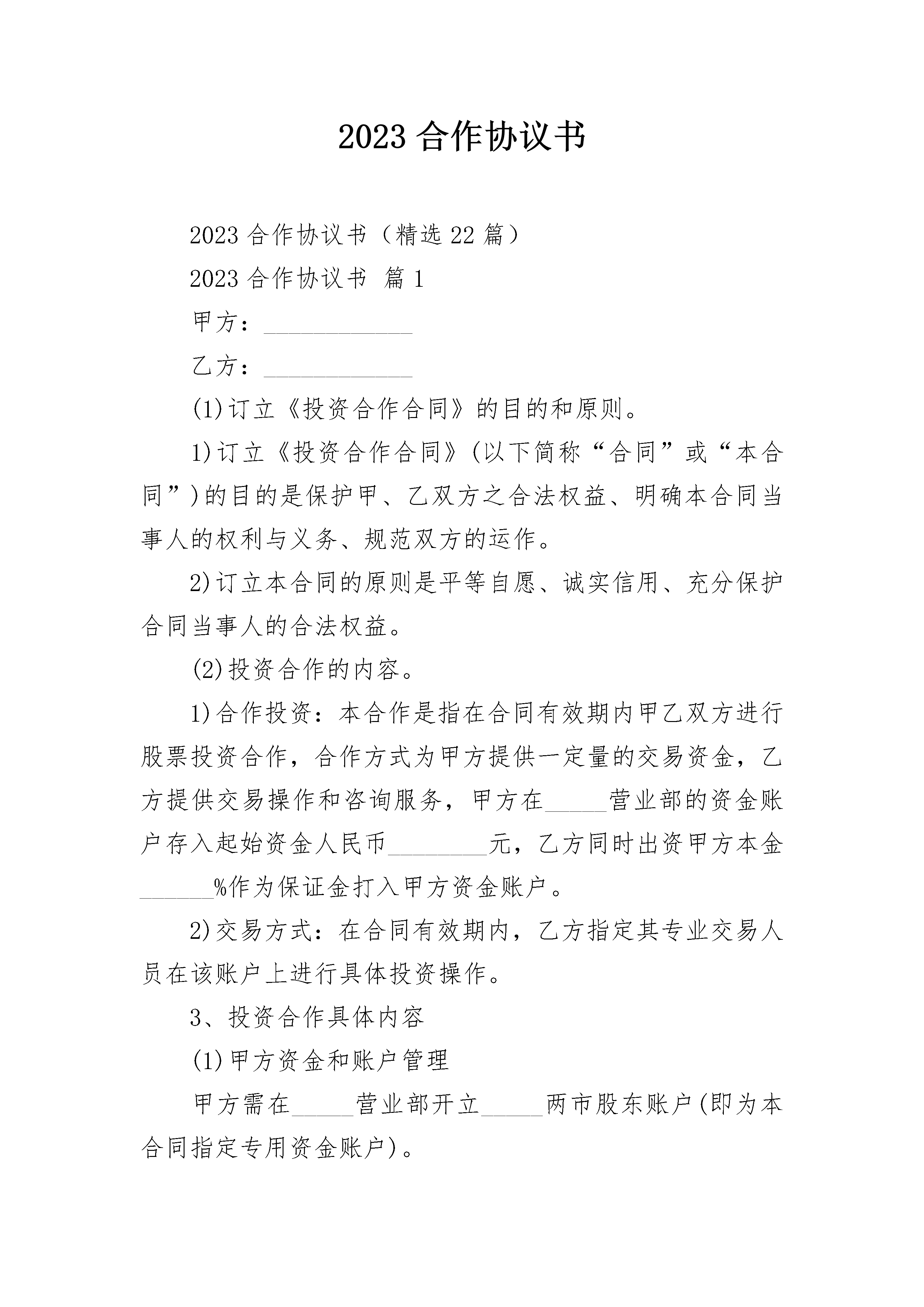 2023合作协议书2023合作协议书(精选22篇)2023合作协议书篇1甲方:____________乙方:____________(1)订立《投资合作合同》的目的和原则。1)订立《投资合作合同》(以下简称“合同”或“本合同”)的目的是保护甲、乙双方之合法权益、明确本合同当事人的权利与义务、规范双方的运作。2)订立本合同的原则是平等自愿、诚实信用、充分保护合同当事人的合法权益。(2)投资合作的内容。1)合作投资:本合作是指在合同有效期内甲乙双方进行股票投资合作,合作方式为甲方提供一定量的交易资金,乙方提供交易操作和咨询服务,甲方在_____营业部的资金账户存入起始资金人民币________元,乙方同时出资甲方本金______%作为保证金打入甲方资金账户。2)交易方式:在合同有效期内,乙方指定其专业交易人员在该账户上进行具体投资操作。3、投资合作具体内容(1)甲方资金和账户管理甲方需在_____营业部开立_____两市股东账户(即为本合同指定专用资金账户)。_____证券账户股东名称:___________股东账号:___________________证券账户股东名称:_______股东账号:______________资金账号:__________甲方上述账户系自己的名义开设或实际为其所有,如因第三方对上述账户主张权利造成的一切后果和损失均由甲方负责和承担。(2)投资方向及限制1)本合同指定资金账户的投资范围:国内合法上市a股。2)甲方不得违反本合同改变投资方向,不得将本账户内的资金挪做他用,如擅自改变上述账户内资金的用途则本合作立即终止。(3)合同期限和资金增减1)合同期限:甲方向乙方提供书面的资金存入证明之日起,合同期限为_______月,2)合同有效期内甲方可以在上述账户内增减资金,但甲方在合同有效期内账户本金数额不低于人民币100万元。甲方在上述账户内增减资金应于事先书面告知乙方资金增减的数额和时间并完成以前交易的清算和收益的分配。4、收益分配方式1)本合同所订立的合作方式可以阐述为:甲方出资金,乙方提供股票操作及咨询服务,甲方获得固定收益____万元,乙方获得甲方账户本金以外的全部收益。2)乙方保证甲方本金不损失采取以下操作:甲方账户每日收盘时,资产市值若低于________万,乙方必须要在次日9:30分之前补足到________万,否则甲方有权平仓,合同终止。此时平仓若导致甲方本金损失,乙方承担所有责任。3)甲方所得固定收益,乙方三个月一次共四次,付与甲方,具体结算时间约定为_____4)当甲方账户的总资金有10%以上收益时,乙方有权要求甲方将高出10%以上的资金转入乙方指定的账户。5、违约责任1)如甲方未按本合同第四条规定的费用支付方法不足额支付乙方的服务费用,乙方有权终止合作。2)如乙方未按本合同的约定导致甲方本金受到损失,甲方有权终止合作并追回本金损失和应得固定收益。6、合同的变更、修改和终止1)本合同的变更或修改需经甲、乙双方共同协商确定;2)如本合同中的约定与国家有关法律、法规或其他规范性文件的规定发生冲突时,甲、乙双方应对管理账户内资金余额和证券进行清算,并按照本协议规定承担各自的责任;3)本合同出现下列情形之一者,应立即终止:a)基于甲、乙双方利益,经甲、乙双方协商终止本合同时;b)本合同规定的其他可终止本合同的事项出现时。7、免责条款1)由于政府禁令、现行生效的适用法律或法规的变更,及火灾、地震、战争等不可预见、不可避免、不可克服和不可控制的事件(“不可抗力事件”)造成的一切损失,双方均不承担责任。2)如因指定交易的证券公司或第三方侵权造成管理账户内资产的损失,甲、乙双方互不向对方承担责任,但均有义务配合对方通过各种有效的途径主张权利,以挽回损失。8、争议的处理与解决方式甲、乙双方就本合同或本合同之履行而产生的一切争议,应首先通过友好协商的方式解决,若协商解决不成,则应通过法律途径解决。9、合同文本及效力1)本合同签订于________市,签订日:________年________月________日;2)本合同包含________个附件,为本合同生效不可分割的一部分;附件内容:甲方身份证复印件:乙方身份证复印件:3)本合同一式两份,甲、乙双方各执一份,具有同等法律效力;甲方(盖章):___________________日期:________年_____月_____日乙方(盖章):___________________日期:________年_____月_____日2023合作协议书篇2甲方:身份证号:通讯地址:联系电话:乙方:身份证号:通讯地址:联系电话:风险提示应明确约定合作方式,尤其涉及到资金、技术、劳务等不同投入方式的。同时,应明确各自的权益份额,否则很容易在项目实际经营过程中就责任