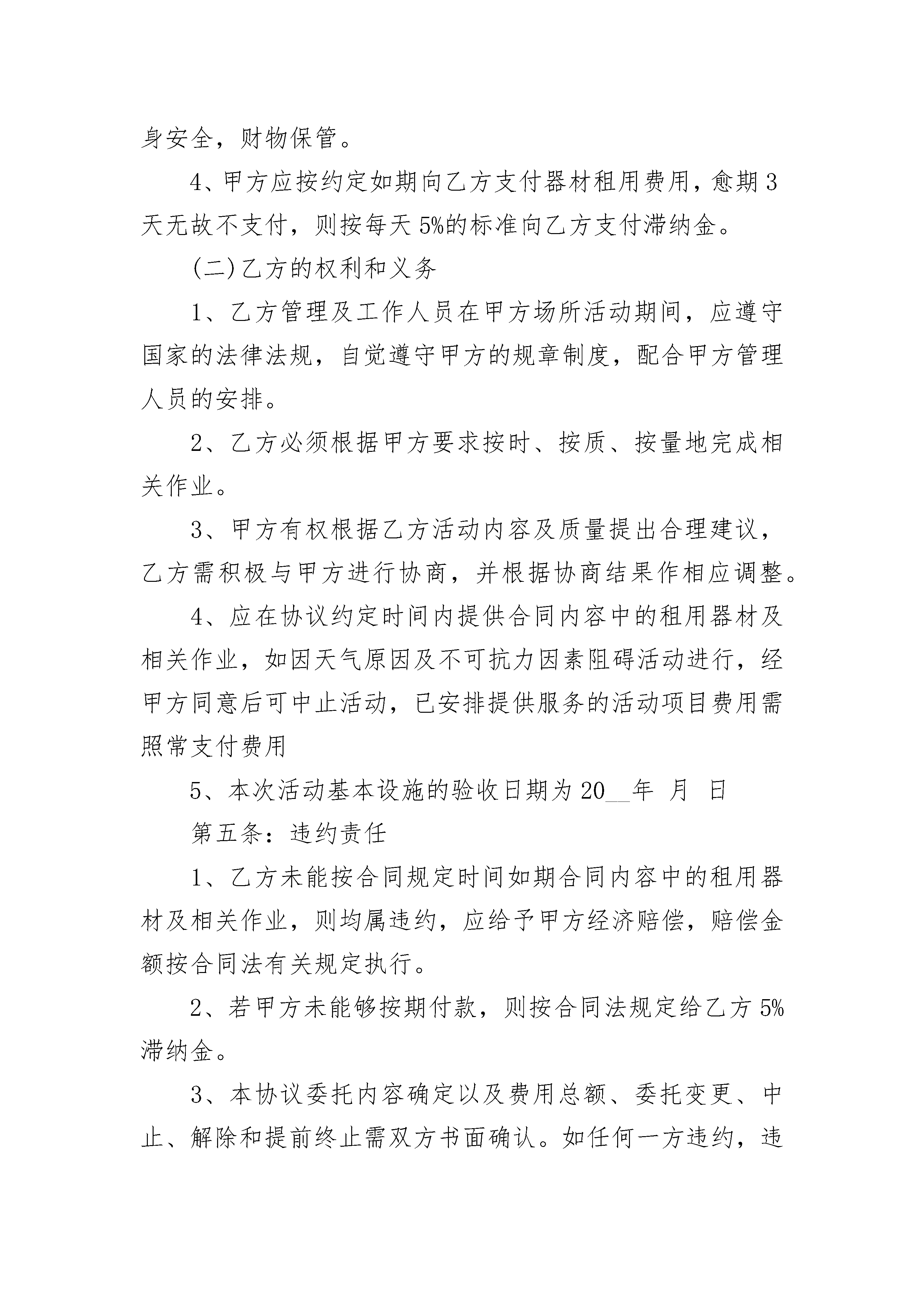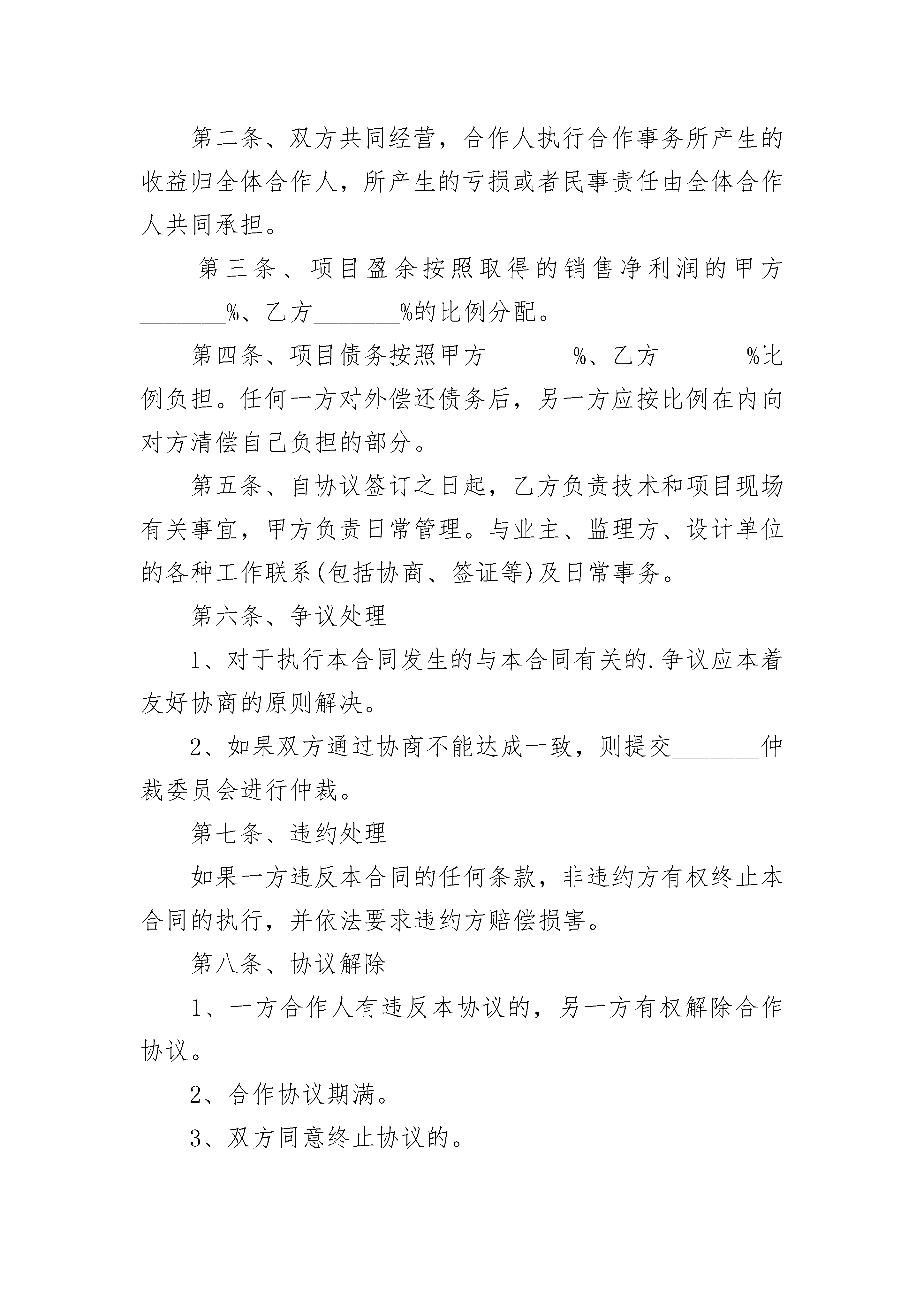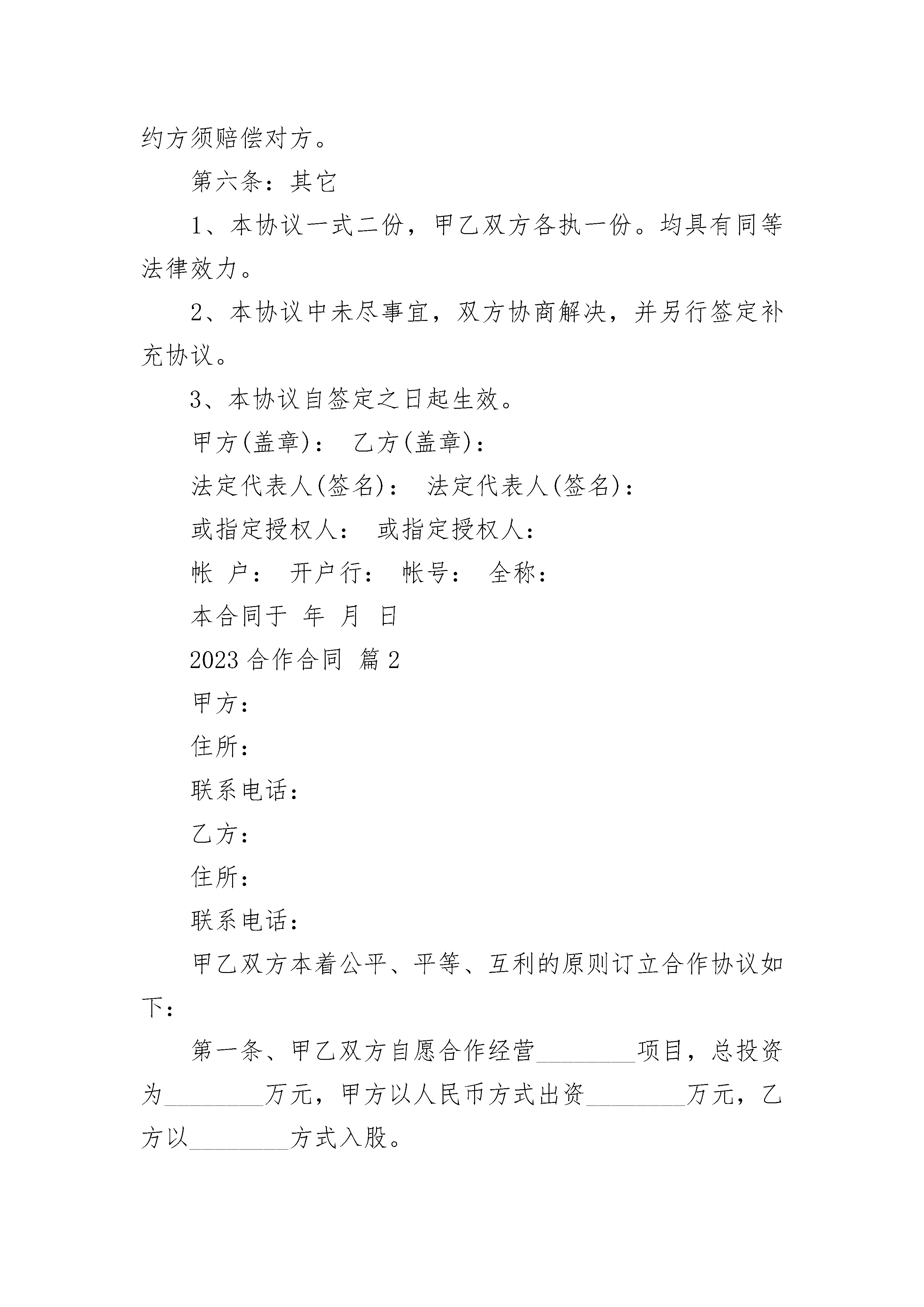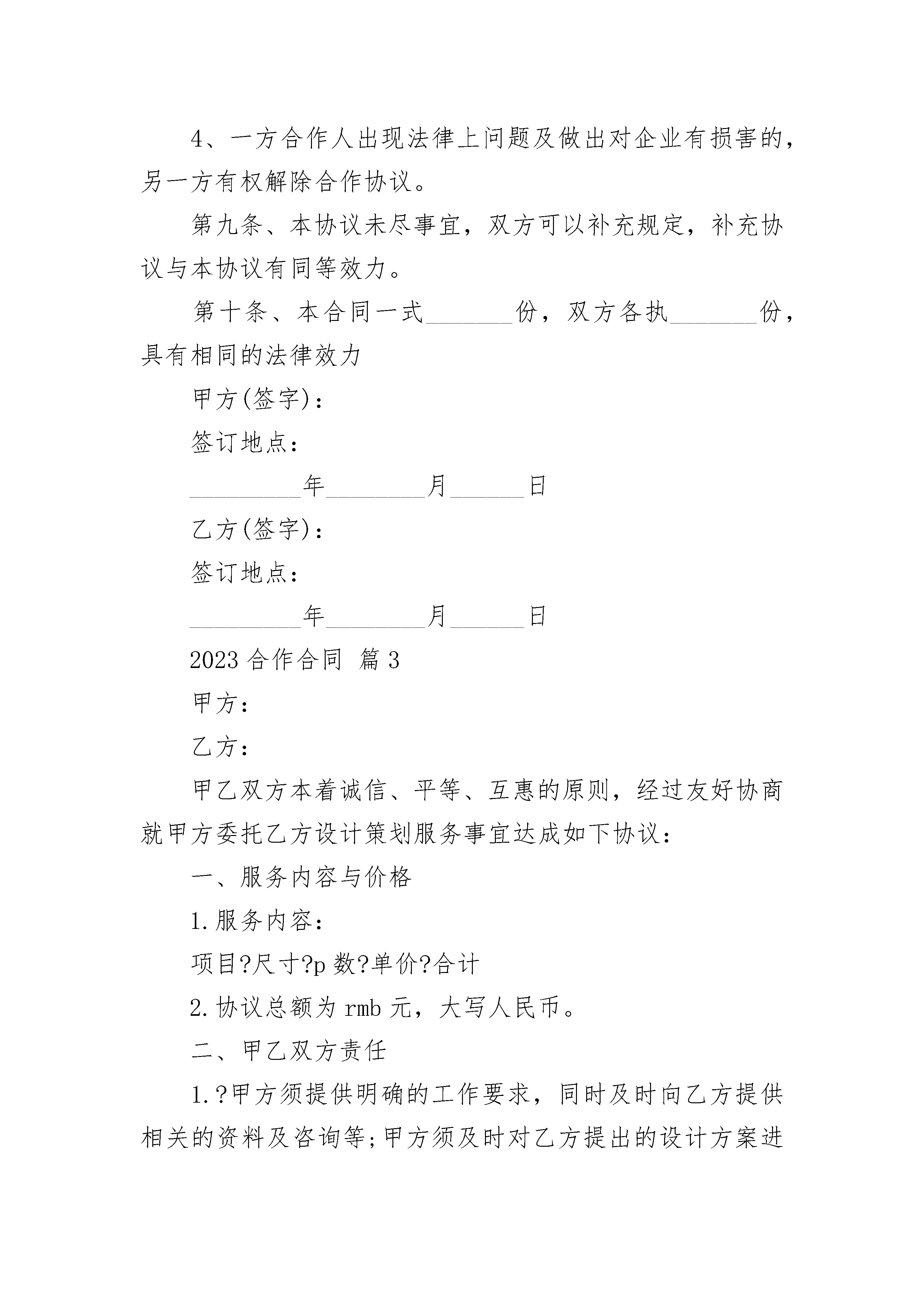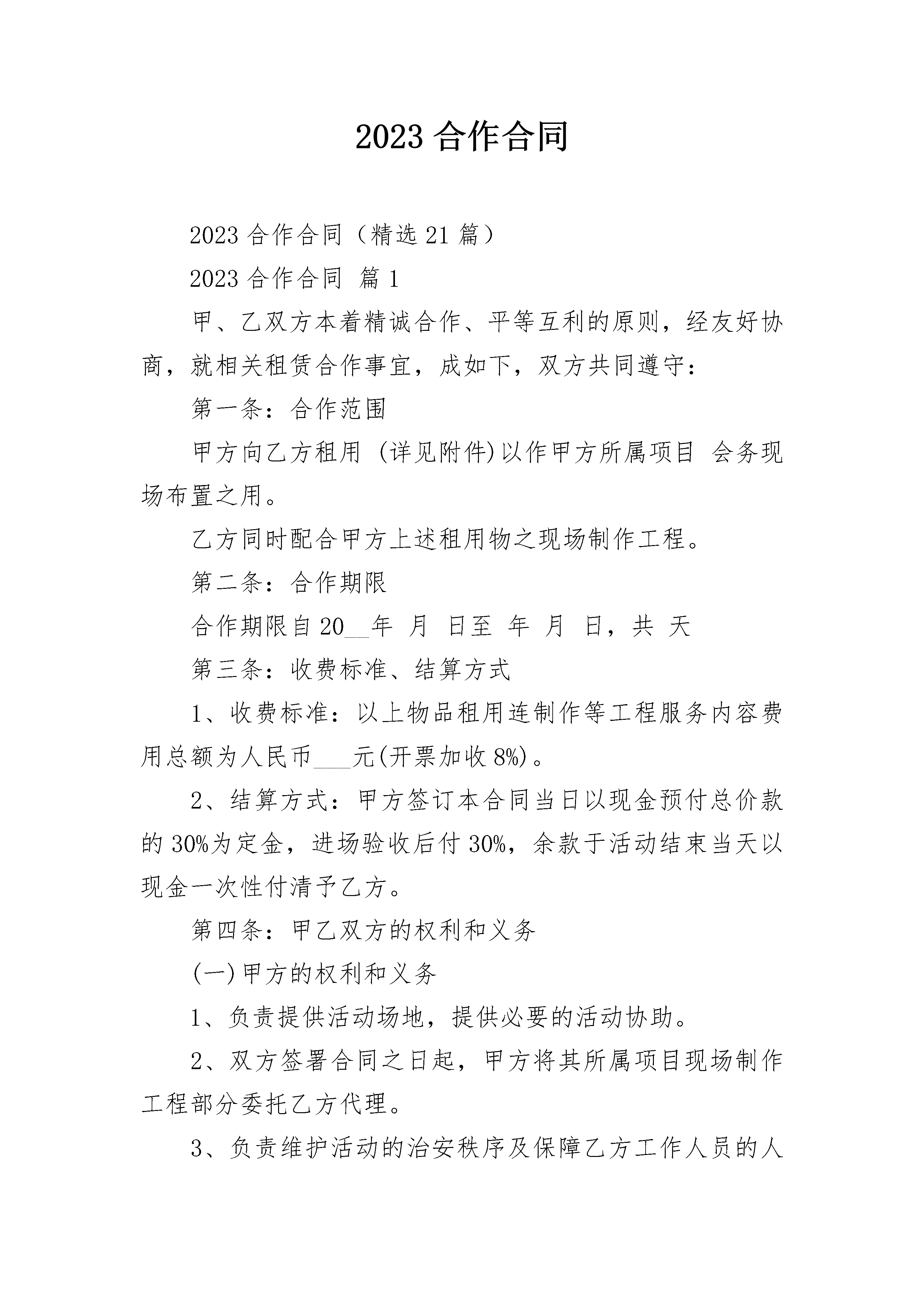 2023合作合同2023合作合同(精选21篇)2023合作合同篇1甲、乙双方本着精诚合作、平等互利的原则,经友好协商,就相关租赁合作事宜,成如下,双方共同遵守:第一条:合作范围甲方向乙方租用(详见附件)以作甲方所属项目会务现场布置之用。乙方同时配合甲方上述租用物之现场制作工程。第二条:合作期限合作期限自20__年月日至年月日,共天第三条:收费标准、结算方式1、收费标准:以上物品租用连制作等工程服务内容费用总额为人民币___元(开票加收8%)。2、结算方式:甲方签订本合同当日以现金预付总价款的30%为定金,进场验收后付30%,余款于活动结束当天以现金一次性付清予乙方。第四条:甲乙双方的权利和义务(一)甲方的权利和义务1、负责提供活动场地,提供必要的活动协助。2、双方签署合同之日起,甲方将其所属项目现场制作工程部分委托乙方代理。3、负责维护活动的治安秩序及保障乙方工作人员的人身安全,财物保管。4、甲方应按约定如期向乙方支付器材租用费用,愈期3天无故不支付,则按每天5%的标准向乙方支付滞纳金。(二)乙方的权利和义务1、乙方管理及工作人员在甲方场所活动期间,应遵守国家的法律法规,自觉遵守甲方的规章制度,配合甲方管理人员的安排。2、乙方必须根据甲方要求按时、按质、按量地完成相关作业。3、甲方有权根据乙方活动内容及质量提出合理建议,乙方需积极与甲方进行协商,并根据协商结果作相应调整。4、应在协议约定时间内提供合同内容中的租用器材及相关作业,如因天气原因及不可抗力因素阻碍活动进行,经甲方同意后可中止活动,已安排提供服务的活动项目费用需照常支付费用5、本次活动基本设施的验收日期为20__年月日第五条:违约责任1、乙方未能按合同规定时间如期合同内容中的租用器材及相关作业,则均属违约,应给予甲方经济赔偿,赔偿金额按合同法有关规定执行。2、若甲方未能够按期付款,则按合同法规定给乙方5%滞纳金。3、本协议委托内容确定以及费用总额、委托变更、中止、解除和提前终止需双方书面确认。如任何一方违约,违约方须赔偿对方。第六条:其它1、本协议一式二份,甲乙双方各执一份。均具有同等法律效力。2、本协议中未尽事宜,双方协商解决,并另行签定补充协议。3、本协议自签定之日起生效。甲方(盖章):乙方(盖章):法定代表人(签名):法定代表人(签名):或指定授权人:或指定授权人:帐户:开户行:帐号:全称:本合同于年月日2023合作合同篇2甲方:住所:联系电话:乙方:住所:联系电话:甲乙双方本着公平、平等、互利的原则订立合作协议如下:第一条、甲乙双方自愿合作经营________项目,总投资为________万元,甲方以人民币方式出资________万元,乙方以________方式入股。第二条、双方共同经营,合作人执行合作事务所产生的收益归全体合作人,所产生的亏损或者民事责任由全体合作人共同承担。第三条、项目盈余按照取得的销售净利润的甲方_______%、乙方_______%的比例分配。第四条、项目债务按照甲方_______%、乙方_______%比例负担。任何一方对外偿还债务后,另一方应按比例在内向对方清偿自己负担的部分。第五条、自协议签订之日起,乙方负责技术和项目现场有关事宜,甲方负责日常管理。与业主、监理方、设计单位的各种工作联系(包括协商、签证等)及日常事务。第六条、争议处理1、对于执行本合同发生的与本合同有关的.争议应本着友好协商的原则解决。2、如果双方通过协商不能达成一致,则提交_______仲裁委员会进行仲裁。第七条、违约处理如果一方违反本合同的任何条款,非违约方有权终止本合同的执行,并依法要求违约方赔偿损害。第八条、协议解除1、一方合作人有违反本协议的,另一方有权解除合作协议。2、合作协议期满。3、双方同意终止协议的。4、一方合作人出现法律上问题及做出对企业有损害的,另一方有权解除合作协议。第九条、本协议未尽事宜,双方可以补充规定,补充协议与本协议有同等效力。第十条、本合同一式_______份,双方各执_______份,具有相同的法律效力甲方(签字):签订地点:_________年________月______日乙方(签字):签订地点:_________年________月______日2023合作合同篇3甲方:乙方:甲乙双方本着诚信、平等、互惠的原则,经过友好协商就甲方委托乙方设计策划服务事宜达成如下协议:一、服务内容与价格1.服务内容:项目?尺寸?p数?单价?合计2.协议总额为rmb元,大写人民币。二、甲乙双方责任1.?甲方须提供明确的工作要求,同时及时向乙方提供相关的资料及咨询等;甲方须及时对乙方提出的设计方案进行反馈;甲方须按协议规定向乙方支付有关费用2.?乙方须通过电子文件向甲方提供详细设计方案,供甲方指定人员审定;乙方须严格按甲方要求,以专业水准进