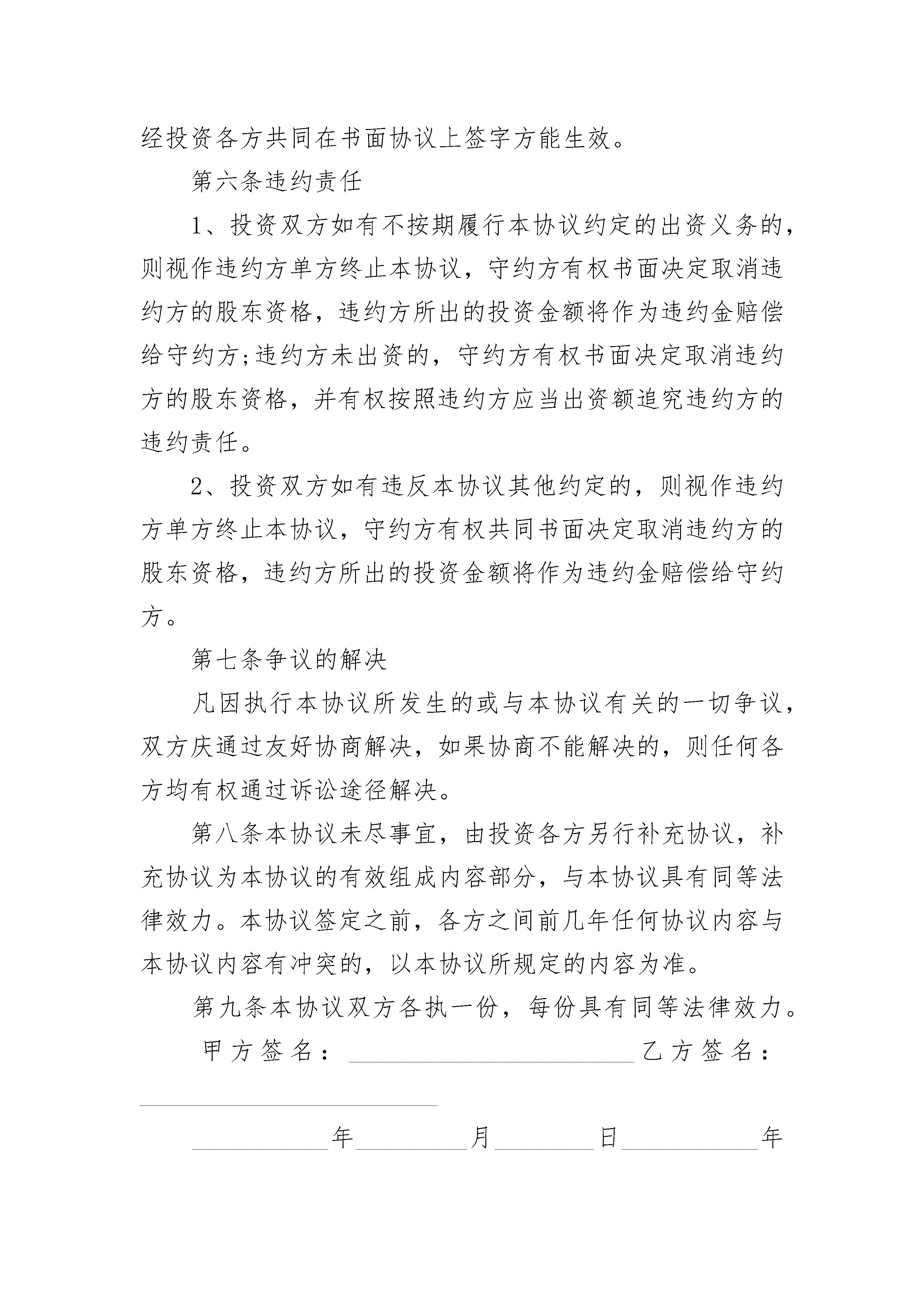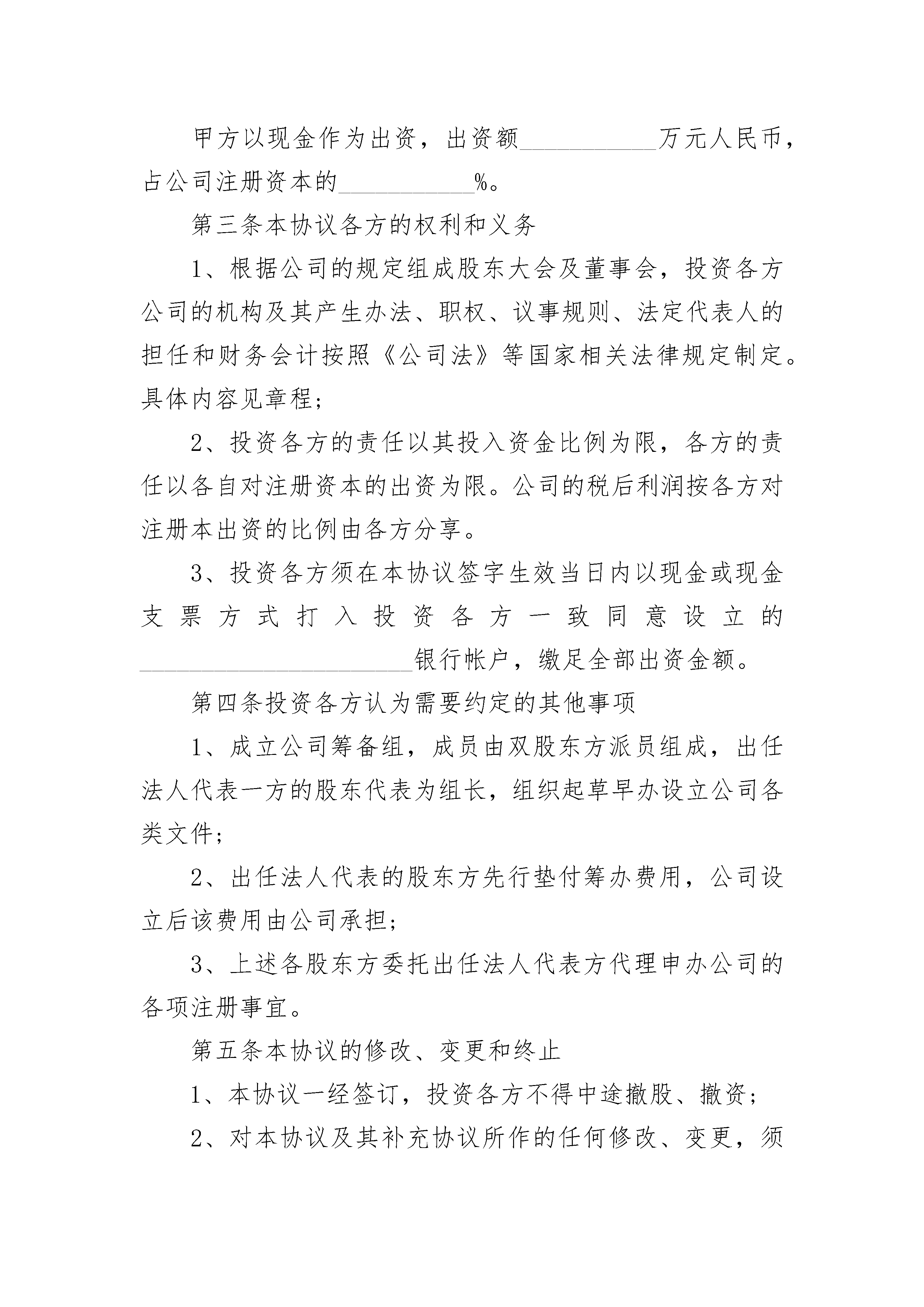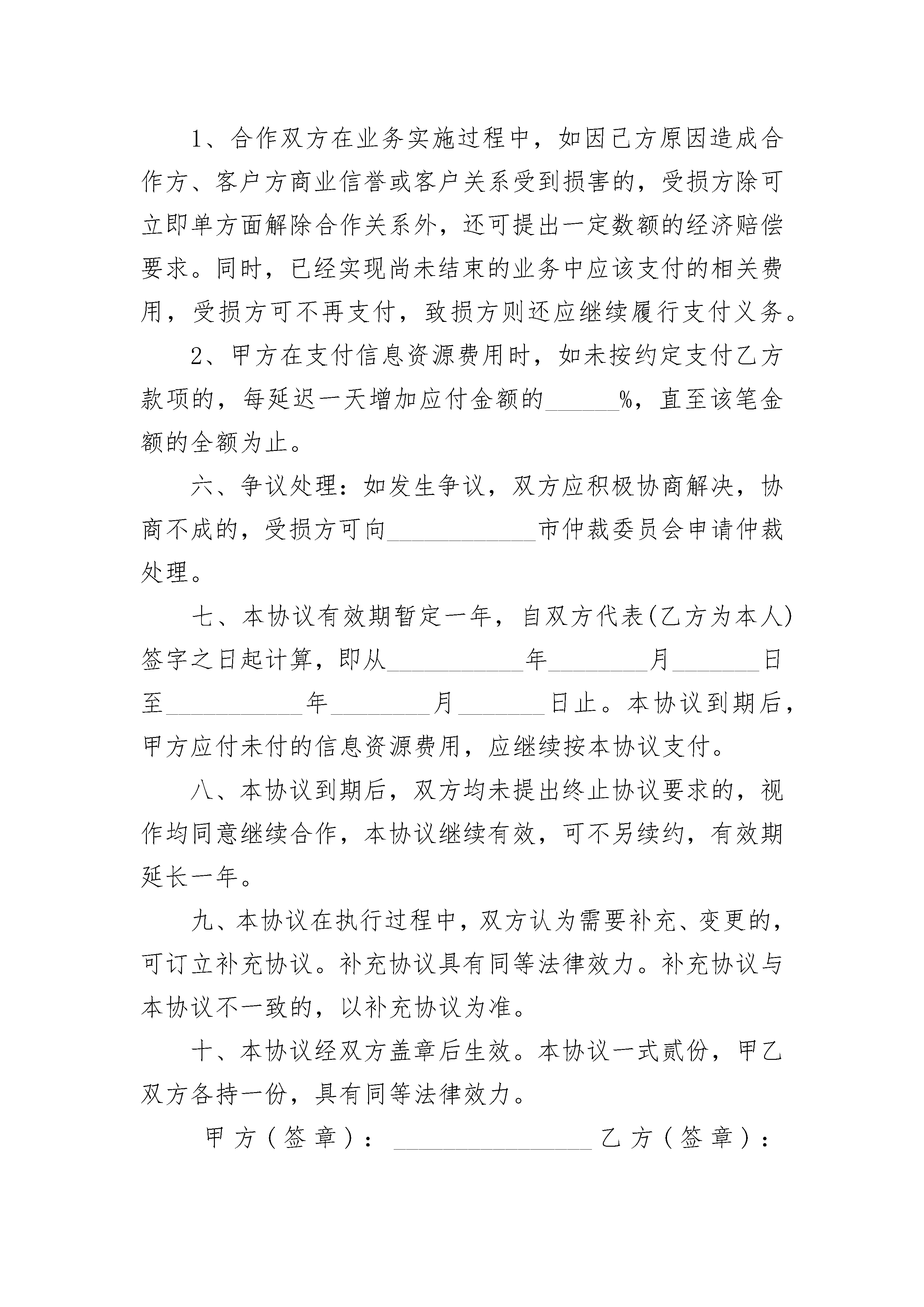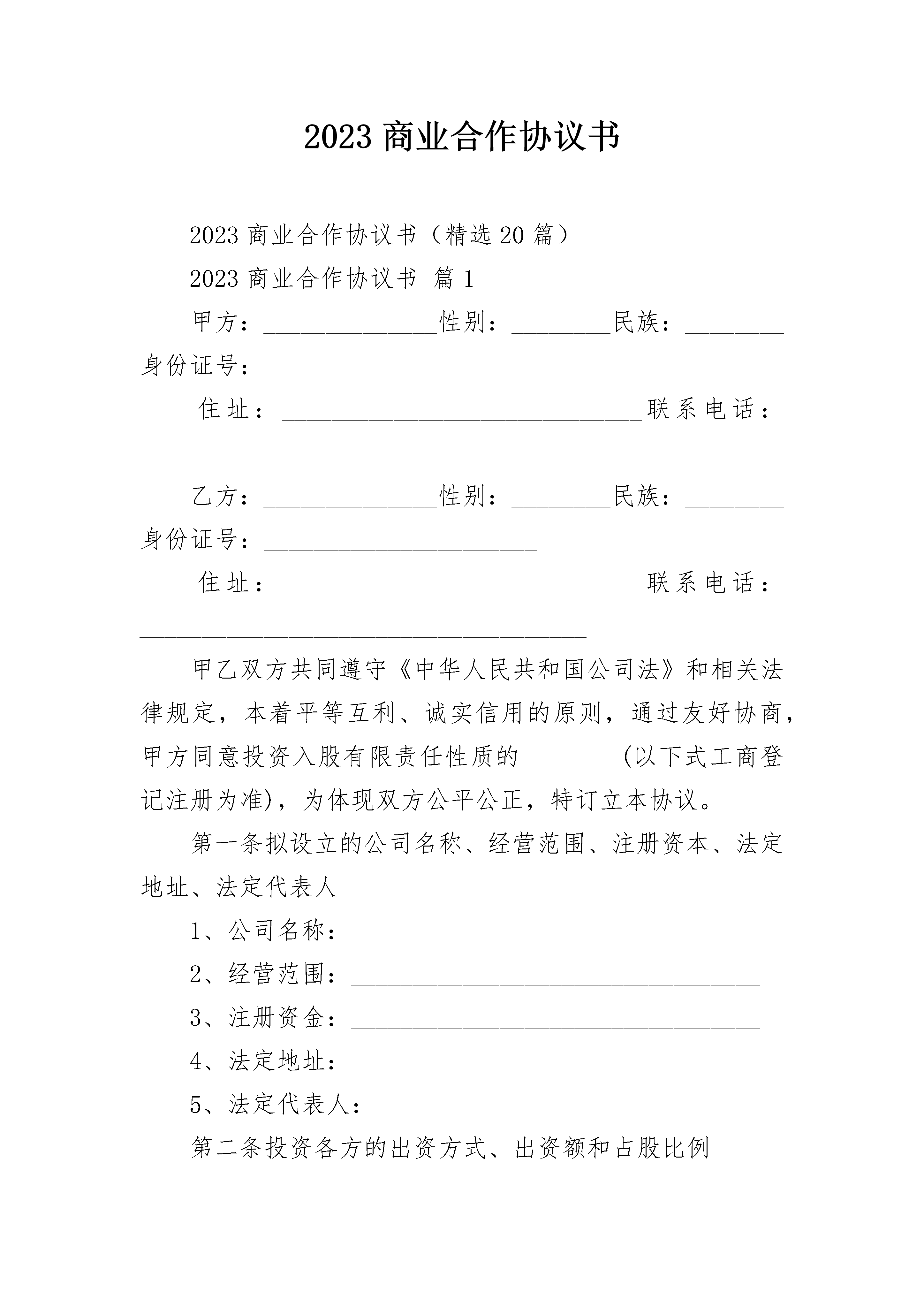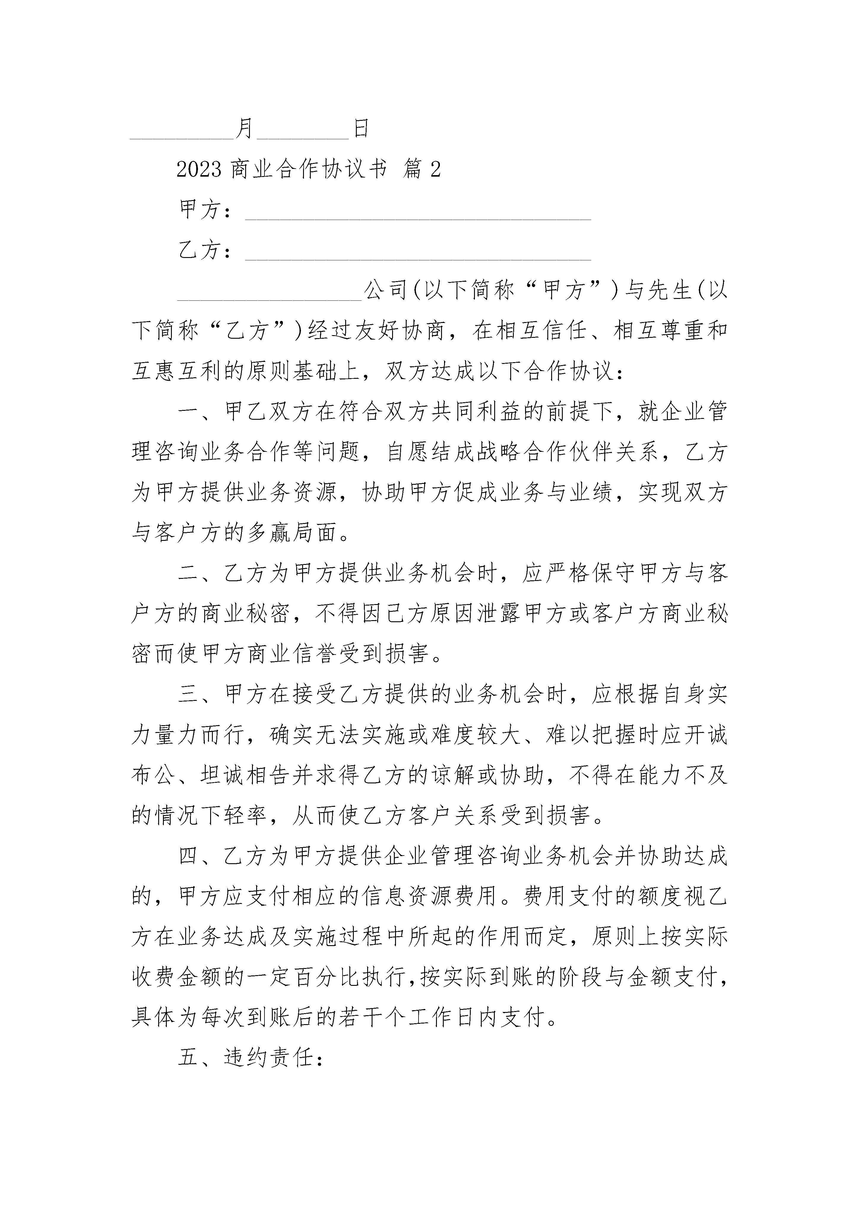 2023商业合作协议书2023商业合作协议书(精选20篇)2023商业合作协议书篇1甲方:______________性别:________民族:________身份证号:______________________住址:_____________________________联系电话:____________________________________乙方:______________性别:________民族:________身份证号:______________________住址:_____________________________联系电话:____________________________________甲乙双方共同遵守《中华人民共和国公司法》和相关法律规定,本着平等互利、诚实信用的原则,通过友好协商,甲方同意投资入股有限责任性质的________(以下式工商登记注册为准),为体现双方公平公正,特订立本协议。第一条拟设立的公司名称、经营范围、注册资本、法定地址、法定代表人1、公司名称:_________________________________2、经营范围:_________________________________3、注册资金:_________________________________4、法定地址:_________________________________5、法定代表人:_______________________________第二条投资各方的出资方式、出资额和占股比例甲方以现金作为出资,出资额___________万元人民币,占公司注册资本的___________%。第三条本协议各方的权利和义务1、根据公司的规定组成股东大会及董事会,投资各方公司的机构及其产生办法、职权、议事规则、法定代表人的担任和财务会计按照《公司法》等国家相关法律规定制定。具体内容见章程;2、投资各方的责任以其投入资金比例为限,各方的责任以各自对注册资本的出资为限。公司的税后利润按各方对注册本出资的比例由各方分享。3、投资各方须在本协议签字生效当日内以现金或现金支票方式打入投资各方一致同意设立的______________________银行帐户,缴足全部出资金额。第四条投资各方认为需要约定的其他事项1、成立公司筹备组,成员由双股东方派员组成,出任法人代表一方的股东代表为组长,组织起草早办设立公司各类文件;2、出任法人代表的股东方先行垫付筹办费用,公司设立后该费用由公司承担;3、上述各股东方委托出任法人代表方代理申办公司的各项注册事宜。第五条本协议的修改、变更和终止1、本协议一经签订,投资各方不得中途撤股、撤资;2、对本协议及其补充协议所作的任何修改、变更,须经投资各方共同在书面协议上签字方能生效。第六条违约责任1、投资双方如有不按期履行本协议约定的出资义务的,则视作违约方单方终止本协议,守约方有权书面决定取消违约方的股东资格,违约方所出的投资金额将作为违约金赔偿给守约方;违约方未出资的,守约方有权书面决定取消违约方的股东资格,并有权按照违约方应当出资额追究违约方的违约责任。2、投资双方如有违反本协议其他约定的,则视作违约方单方终止本协议,守约方有权共同书面决定取消违约方的股东资格,违约方所出的投资金额将作为违约金赔偿给守约方。第七条争议的解决凡因执行本协议所发生的或与本协议有关的一切争议,双方庆通过友好协商解决,如果协商不能解决的,则任何各方均有权通过诉讼途径解决。第八条本协议未尽事宜,由投资各方另行补充协议,补充协议为本协议的有效组成内容部分,与本协议具有同等法律效力。本协议签定之前,各方之间前几年任何协议内容与本协议内容有冲突的,以本协议所规定的内容为准。第九条本协议双方各执一份,每份具有同等法律效力。甲方签名:_______________________乙方签名:___________________________________年_________月________日___________年_________月________日2023商业合作协议书篇2甲方:______________________________乙方:______________________________________________公司(以下简称“甲方”)与先生(以下简称“乙方”)经过友好协商,在相互信任、相互尊重和互惠互利的原则基础上,双方达成以下合作协议:一、甲乙双方在符合双方共同利益的前提下,就企业管理咨询业务合作等问题,自愿结成战略合作伙伴关系,乙方为甲方提供业务资源,协助甲方促成业务与业绩,实现双方与客户方的多赢局面。二、乙方为甲方提供业务机会时,应严格保守甲方与客户方的商业秘密,不
