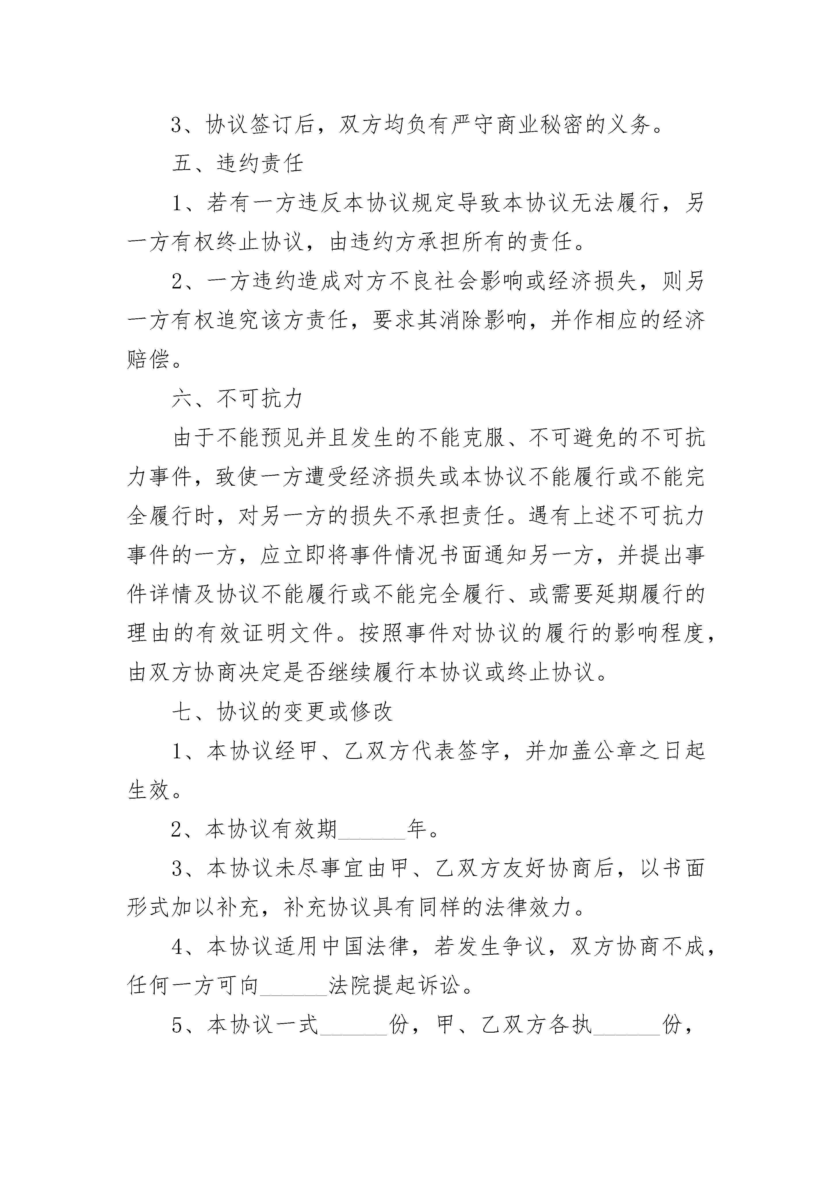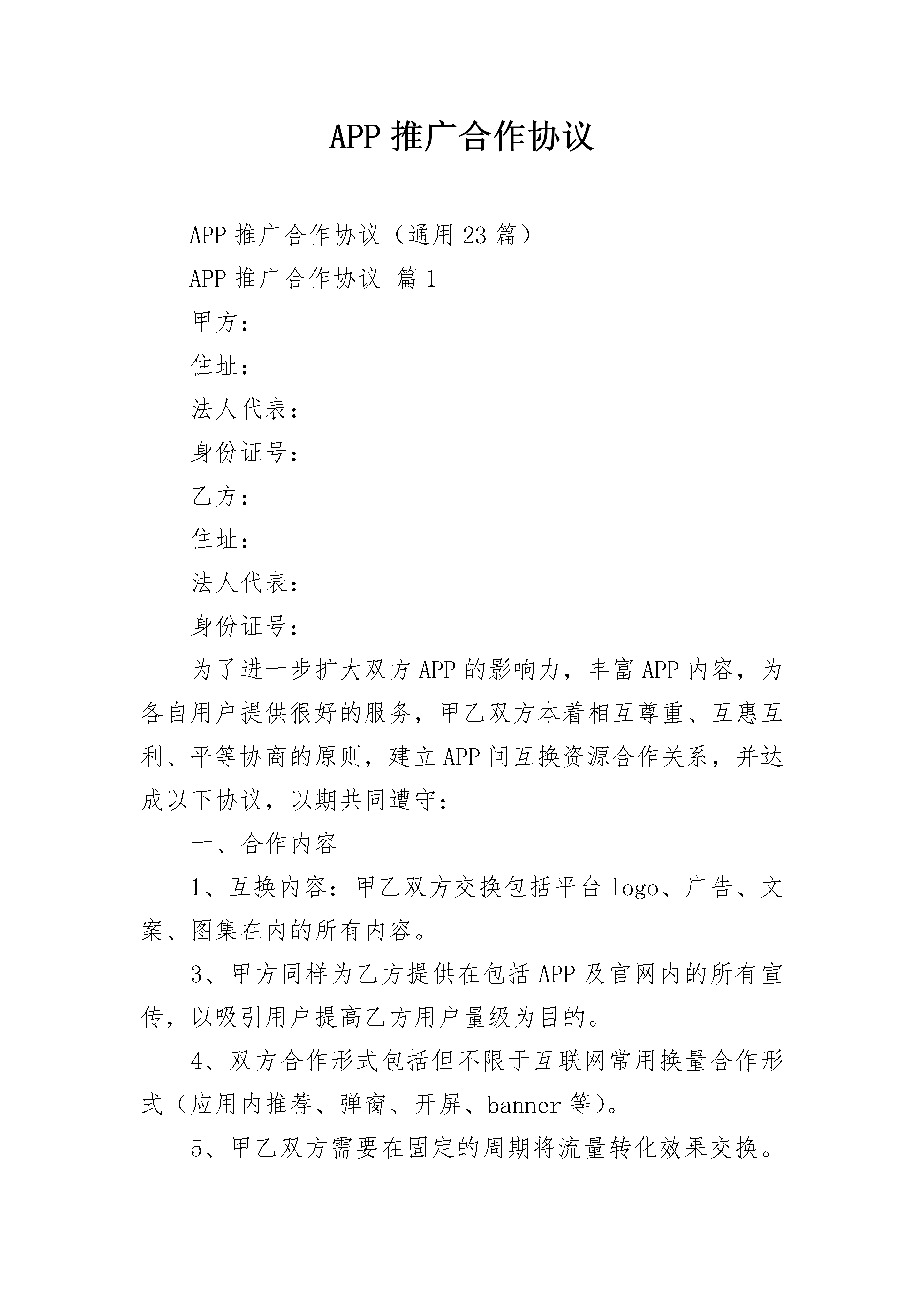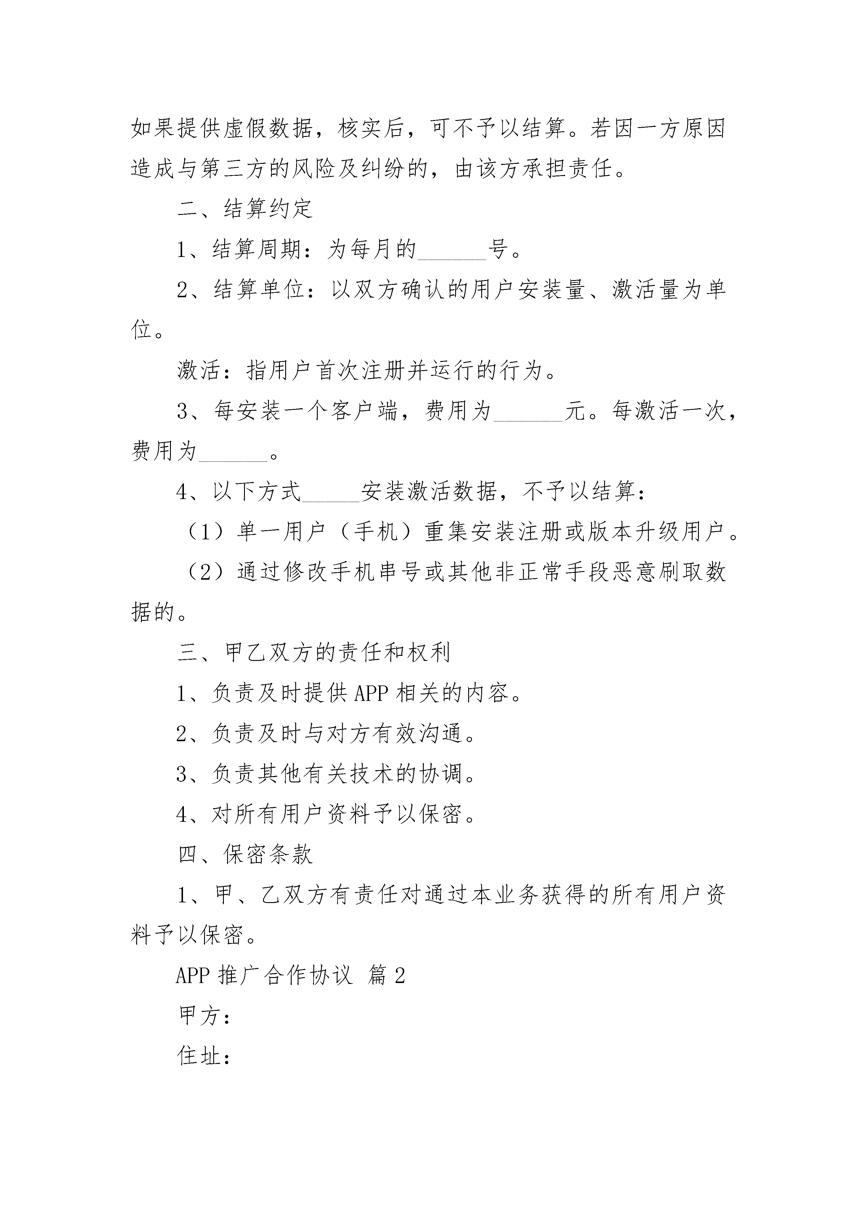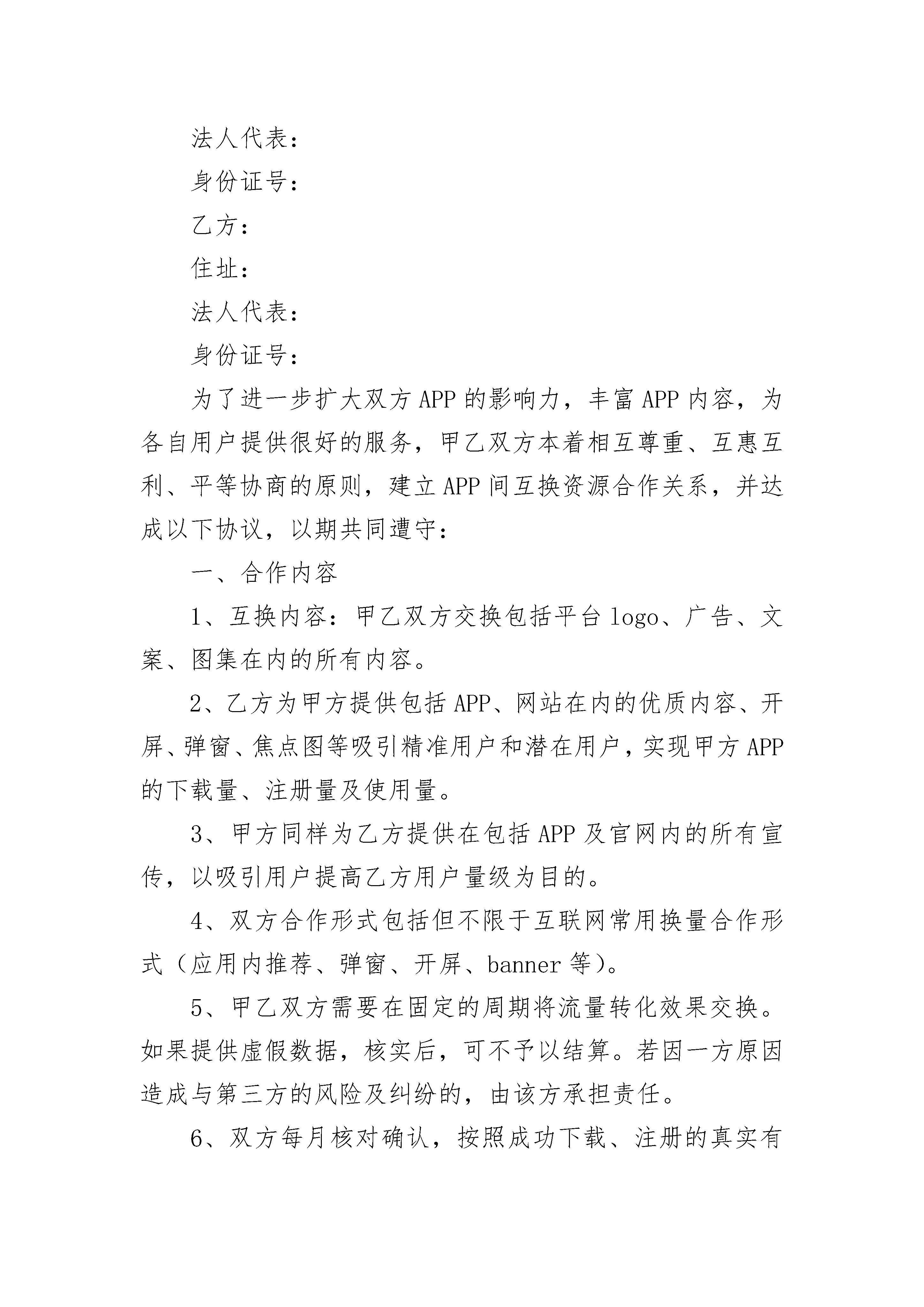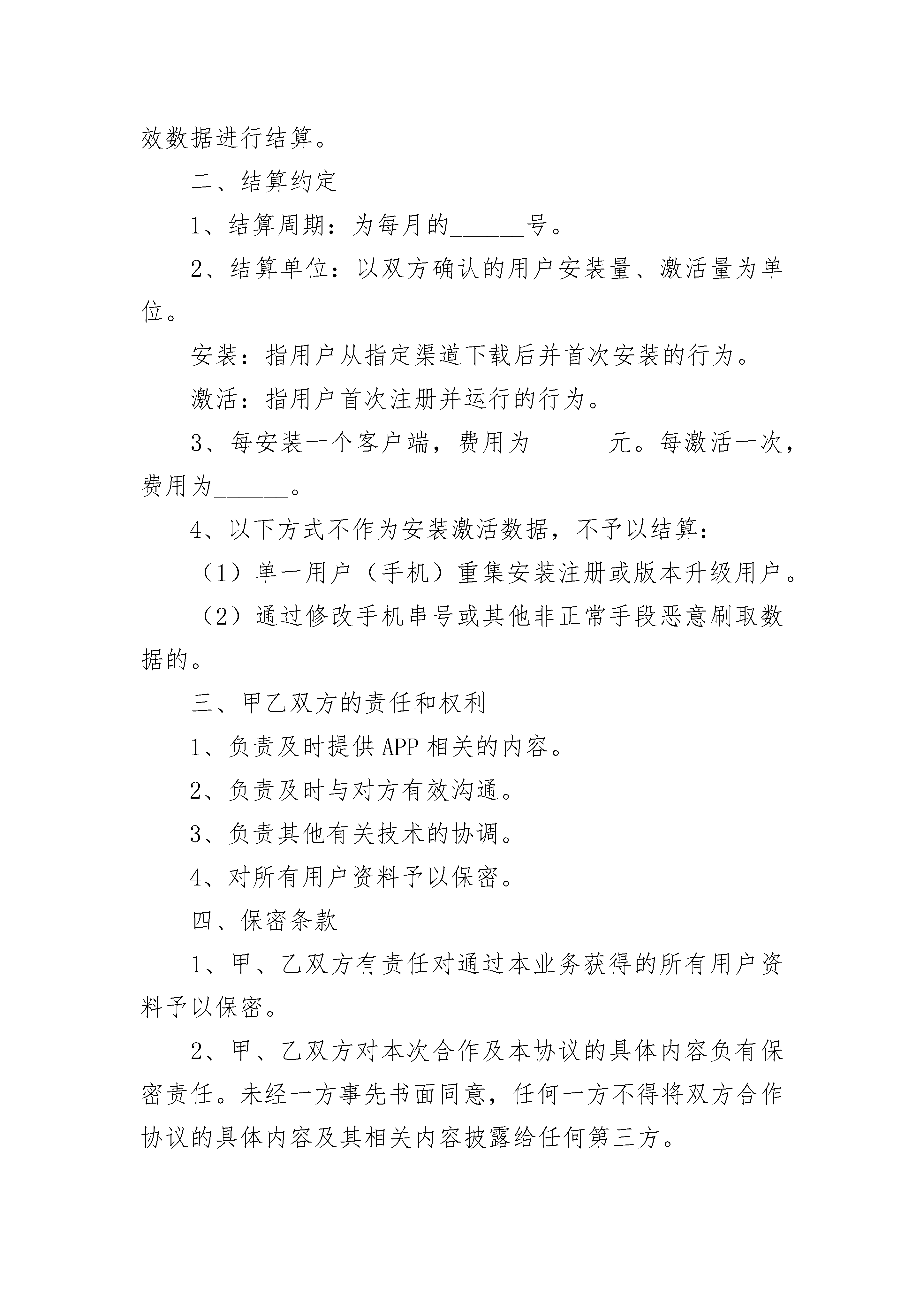 APP推广合作协议APP推广合作协议(通用23篇)APP推广合作协议篇1甲方:住址:法人代表:身份证号:乙方:住址:法人代表:身份证号:为了进一步扩大双方APP的影响力,丰富APP内容,为各自用户提供很好的服务,甲乙双方本着相互尊重、互惠互利、平等协商的原则,建立APP间互换资源合作关系,并达成以下协议,以期共同遭守:一、合作内容1、互换内容:甲乙双方交换包括平台logo、广告、文案、图集在内的所有内容。3、甲方同样为乙方提供在包括APP及官网内的所有宣传,以吸引用户提高乙方用户量级为目的。4、双方合作形式包括但不限于互联网常用换量合作形式(应用内推荐、弹窗、开屏、banner等)。5、甲乙双方需要在固定的周期将流量转化效果交换。如果提供虚假数据,核实后,可不予以结算。若因一方原因造成与第三方的风险及纠纷的,由该方承担责任。二、结算约定1、结算周期:为每月的______号。2、结算单位:以双方确认的用户安装量、激活量为单位。激活:指用户首次注册并运行的行为。3、每安装一个客户端,费用为______元。每激活一次,费用为______。4、以下方式_____安装激活数据,不予以结算:(1)单一用户(手机)重集安装注册或版本升级用户。(2)通过修改手机串号或其他非正常手段恶意刷取数据的。三、甲乙双方的责任和权利1、负责及时提供APP相关的内容。2、负责及时与对方有效沟通。3、负责其他有关技术的协调。4、对所有用户资料予以保密。四、保密条款1、甲、乙双方有责任对通过本业务获得的所有用户资料予以保密。APP推广合作协议篇2甲方:住址:法人代表:身份证号:乙方:住址:法人代表:身份证号:为了进一步扩大双方APP的影响力,丰富APP内容,为各自用户提供很好的服务,甲乙双方本着相互尊重、互惠互利、平等协商的原则,建立APP间互换资源合作关系,并达成以下协议,以期共同遭守:一、合作内容1、互换内容:甲乙双方交换包括平台logo、广告、文案、图集在内的所有内容。2、乙方为甲方提供包括APP、网站在内的优质内容、开屏、弹窗、焦点图等吸引精准用户和潜在用户,实现甲方APP的下载量、注册量及使用量。3、甲方同样为乙方提供在包括APP及官网内的所有宣传,以吸引用户提高乙方用户量级为目的。4、双方合作形式包括但不限于互联网常用换量合作形式(应用内推荐、弹窗、开屏、banner等)。5、甲乙双方需要在固定的周期将流量转化效果交换。如果提供虚假数据,核实后,可不予以结算。若因一方原因造成与第三方的风险及纠纷的,由该方承担责任。6、双方每月核对确认,按照成功下载、注册的真实有效数据进行结算。二、结算约定1、结算周期:为每月的______号。2、结算单位:以双方确认的用户安装量、激活量为单位。安装:指用户从指定渠道下载后并首次安装的行为。激活:指用户首次注册并运行的行为。3、每安装一个客户端,费用为______元。每激活一次,费用为______。4、以下方式不作为安装激活数据,不予以结算:(1)单一用户(手机)重集安装注册或版本升级用户。(2)通过修改手机串号或其他非正常手段恶意刷取数据的。三、甲乙双方的责任和权利1、负责及时提供APP相关的内容。2、负责及时与对方有效沟通。3、负责其他有关技术的协调。4、对所有用户资料予以保密。四、保密条款1、甲、乙双方有责任对通过本业务获得的所有用户资料予以保密。2、甲、乙双方对本次合作及本协议的具体内容负有保密责任。未经一方事先书面同意,任何一方不得将双方合作协议的具体内容及其相关内容披露给任何第三方。3、协议签订后,双方均负有严守商业秘密的义务。五、违约责任1、若有一方违反本协议规定导致本协议无法履行,另一方有权终止协议,由违约方承担所有的责任。2、一方违约造成对方不良社会影响或经济损失,则另一方有权追究该方责任,要求其消除影响,并作相应的经济赔偿。六、不可抗力由于不能预见并且发生的不能克服、不可避免的不可抗力事件,致使一方遭受经济损失或本协议不能履行或不能完全履行时,对另一方的损失不承担责任。遇有上述不可抗力事件的一方,应立即将事件情况书面通知另一方,并提出事件详情及协议不能履行或不能完全履行、或需要延期履行的理由的有效证明文件。按照事件对协议的履行的影响程度,由双方协商决定是否继续履行本协议或终止协议。七、协议的变更或修改1、本协议经甲、乙双方代表签字,并加盖公章之日起生效。2、本协议有效期______年。3、本协议未尽事宜由甲、乙双方友好协商后,以书面形式加以补充,补充协议具有同样的法律效力。4、本协议适用中国法律,若发生争议,双方协商不成,任何一方可向______法院提起诉讼。5、本协议一式______份,甲、乙双方各执______份,具有同等法律效力。甲方:(签章)地址:联系方式:签约日期:________年