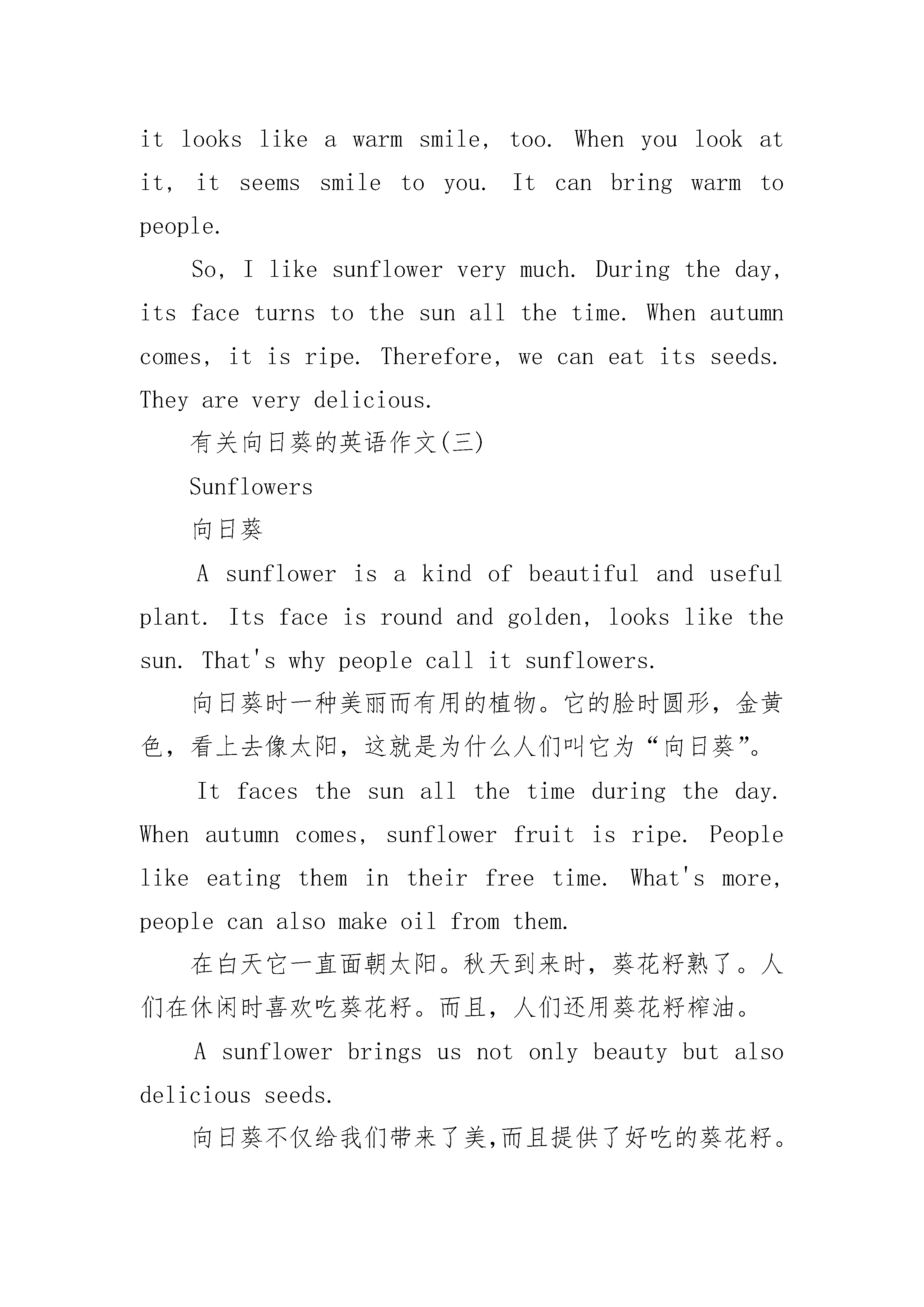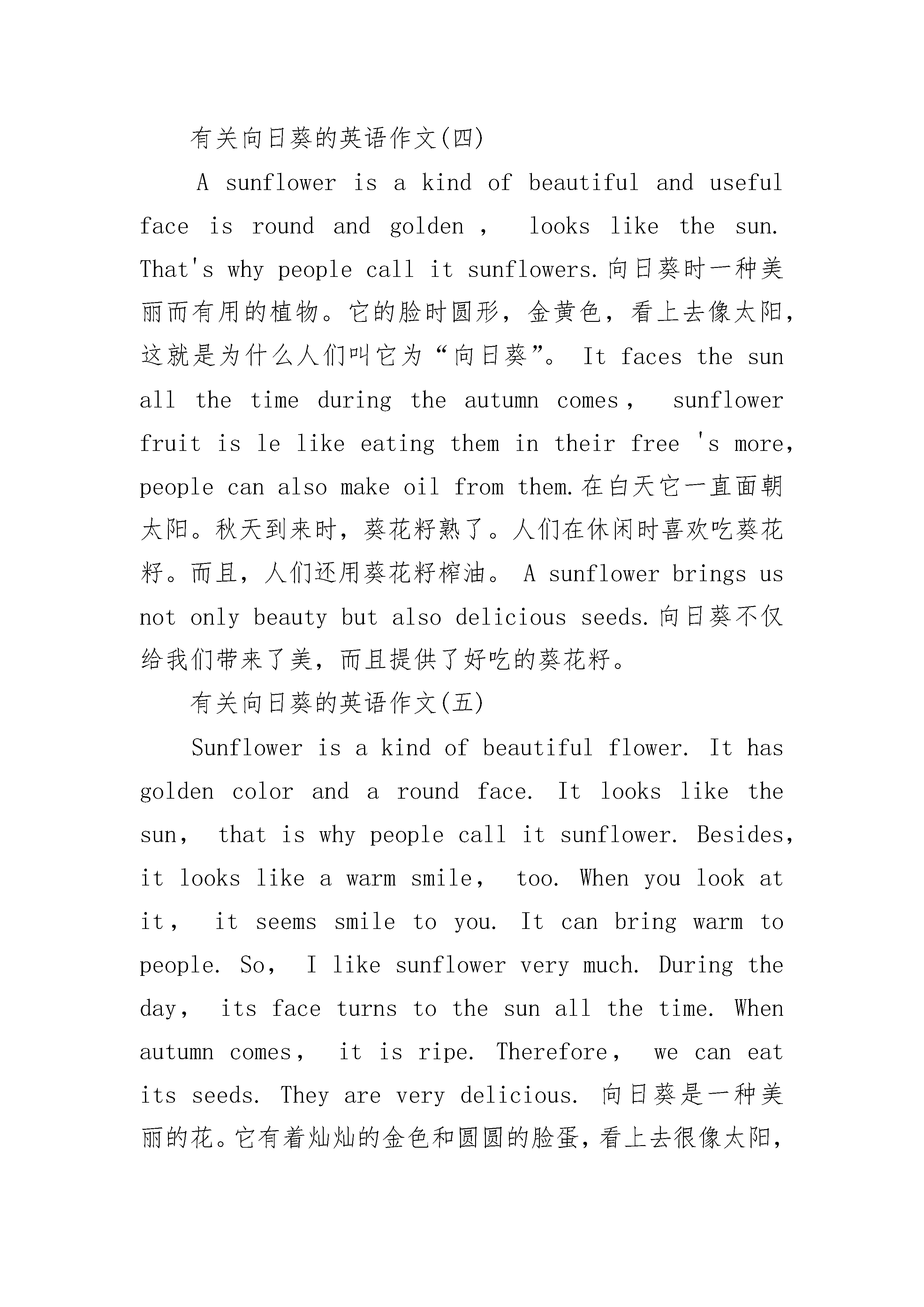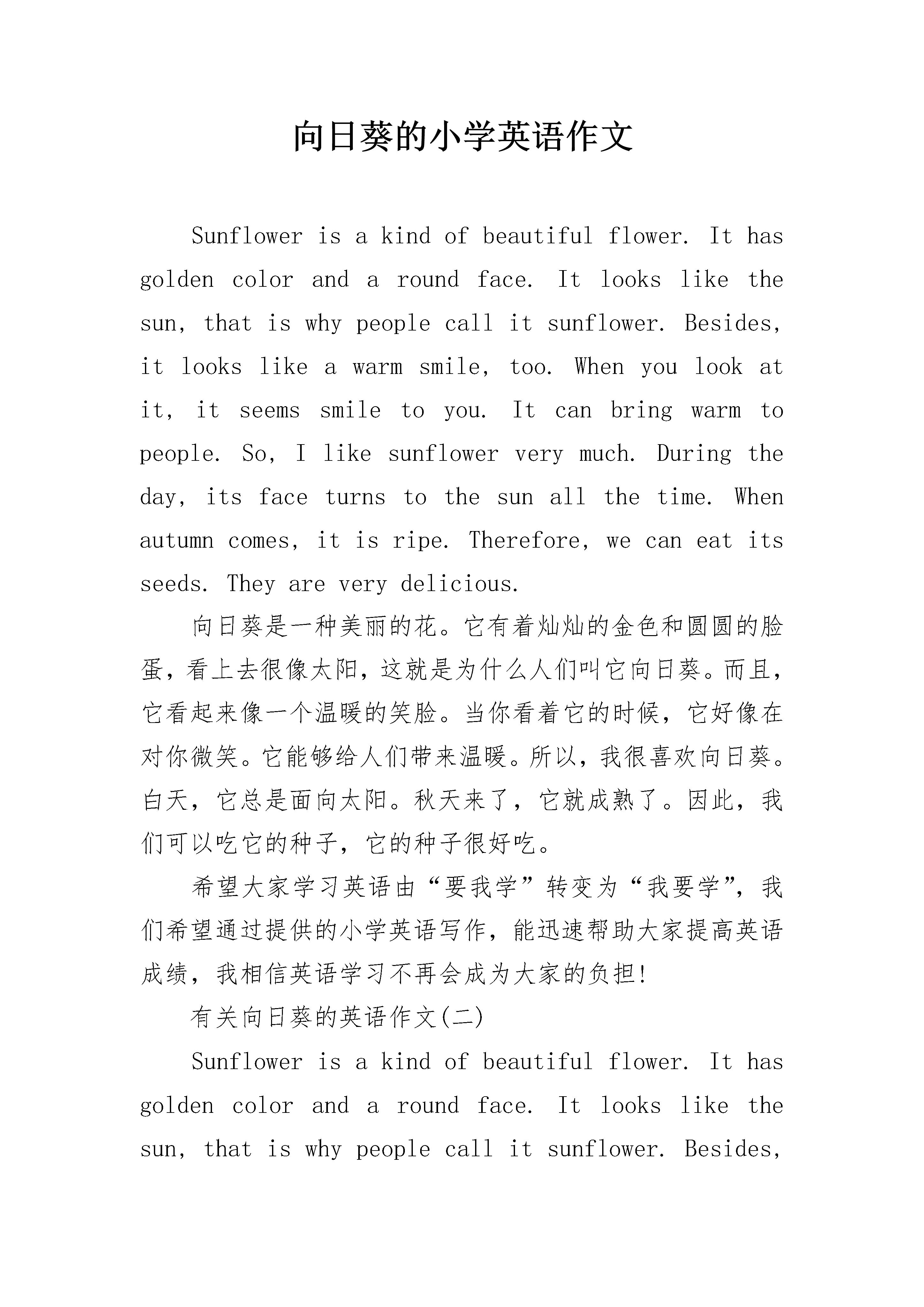 向日葵的小学英语作文Sunflowerisakindofbeautifulflower.Ithasgoldencolorandaroundface.Itlookslikethesun,thatiswhypeoplecallitsunflower.Besides,itlookslikeawarmsmile,too.Whenyoulookatit,itseemssmiletoyou.Itcanbringwarmtopeople.So,Ilikesunflowerverymuch.Duringtheday,itsfaceturnstothesunallthetime.Whenautumncomes,itisripe.Therefore,wecaneatitsseeds.Theyareverydelicious.向日葵是一种美丽的花。它有着灿灿的金色和圆圆的脸蛋,看上去很像太阳,这就是为什么人们叫它向日葵。而且,它看起来像一个温暖的笑脸。当你看着它的时候,它好像在对你微笑。它能够给人们带来温暖。所以,我很喜欢向日葵。白天,它总是面向太阳。秋天来了,它就成熟了。因此,我们可以吃它的种子,它的种子很好吃。希望大家学习英语由“要我学”转变为“我要学”,我们希望通过提供的小学英语写作,能迅速帮助大家提高英语成绩,我相信英语学习不再会成为大家的负担!有关向日葵的英语作文(二)Sunflowerisakindofbeautifulflower.Ithasgoldencolorandaroundface.Itlookslikethesun,thatiswhypeoplecallitsunflower.Besides,itlookslikeawarmsmile,too.Whenyoulookatit,itseemssmiletoyou.Itcanbringwarmtopeople.So,Ilikesunflowerverymuch.Duringtheday,itsfaceturnstothesunallthetime.Whenautumncomes,itisripe.Therefore,wecaneatitsseeds.Theyareverydelicious.有关向日葵的英语作文(三)Sunflowers向日葵Asunflowerisakindofbeautifulandusefulplant.Itsfaceisroundandgolden,lookslikethesun.That'swhypeoplecallitsunflowers.向日葵时一种美丽而有用的植物。它的脸时圆形,金黄色,看上去像太阳,这就是为什么人们叫它为“向日葵”。Itfacesthesunallthetimeduringtheday.Whenautumncomes,sunflowerfruitisripe.Peoplelikeeatingthemintheirfreetime.What'smore,peoplecanalsomakeoilfromthem.在白天它一直面朝太阳。秋天到来时,葵花籽熟了。人们在休闲时喜欢吃葵花籽。而且,人们还用葵花籽榨油。Asunflowerbringsusnotonlybeautybutalsodeliciousseeds.向日葵不仅给我们带来了美,而且提供了好吃的葵花籽。有关向日葵的英语作文(四)Asunflowerisakindofbeautifulandusefulfaceisroundandgolden,lookslikethesun.That'swhypeoplecallitsunflowers.向日葵时一种美丽而有用的植物。它的脸时圆形,金黄色,看上去像太阳,这就是为什么人们叫它为“向日葵”。Itfacesthesunallthetimeduringtheautumncomes,sunflowerfruitislelikeeatingthemintheirfree'smore,peoplecanalsomakeoilfromthem.在白天它一直面朝太阳。秋天到来时,葵花籽熟了。人们在休闲时喜欢吃葵花籽。而且,人们还用葵花籽榨油。Asunflowerbringsusnotonlybeautybutalsodeliciousseeds.向日葵不仅给我们带来了美,而且提供了好吃的葵花籽。有关向日葵的英语作文(五)Sunflowerisakindofbeautifulflower.Ithasgoldencolorandaroundface.Itlookslikethesun,thatiswhypeoplecallitsunflower.Besides,itlookslikeawarmsmile,too.Whenyoulookatit,i