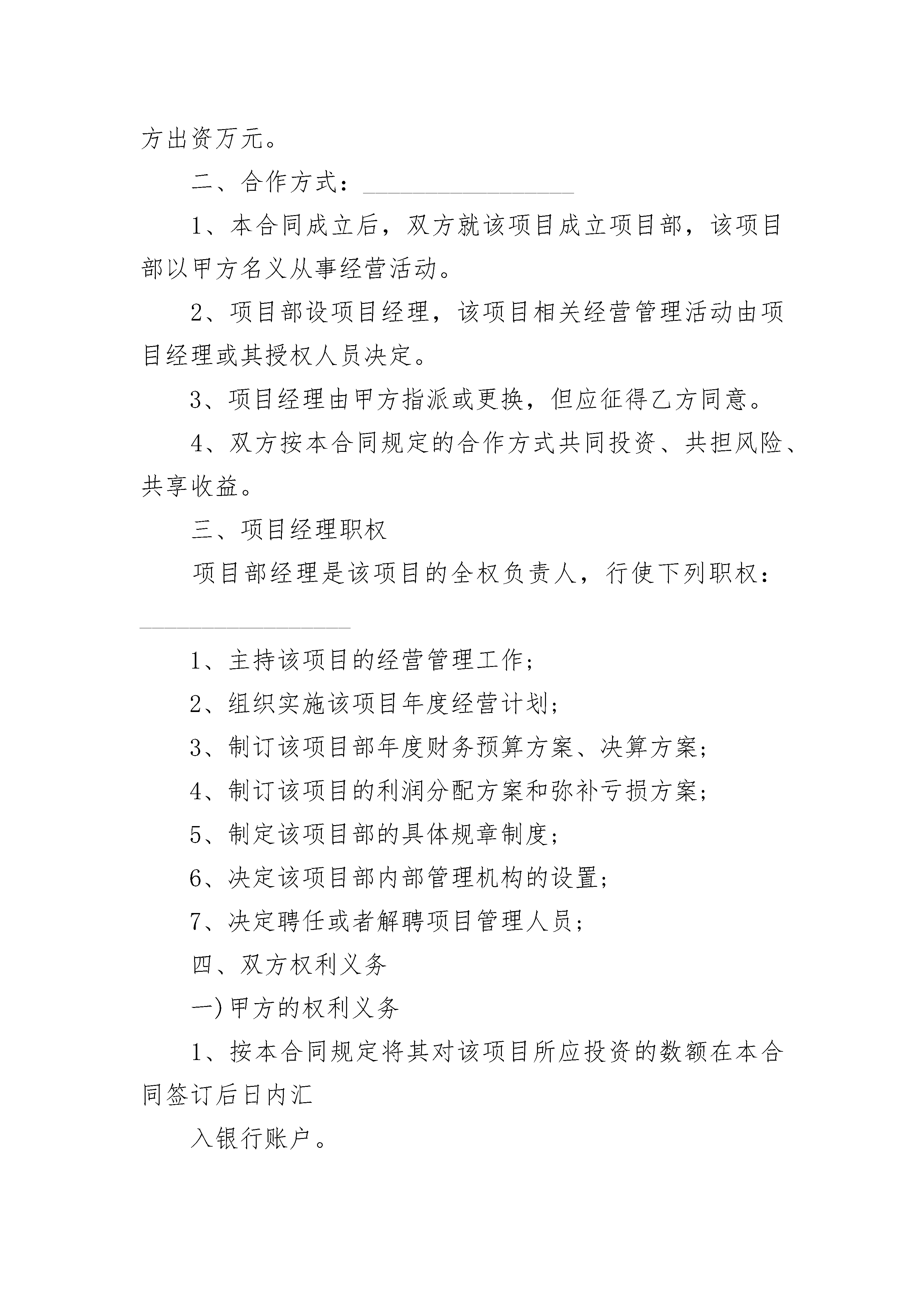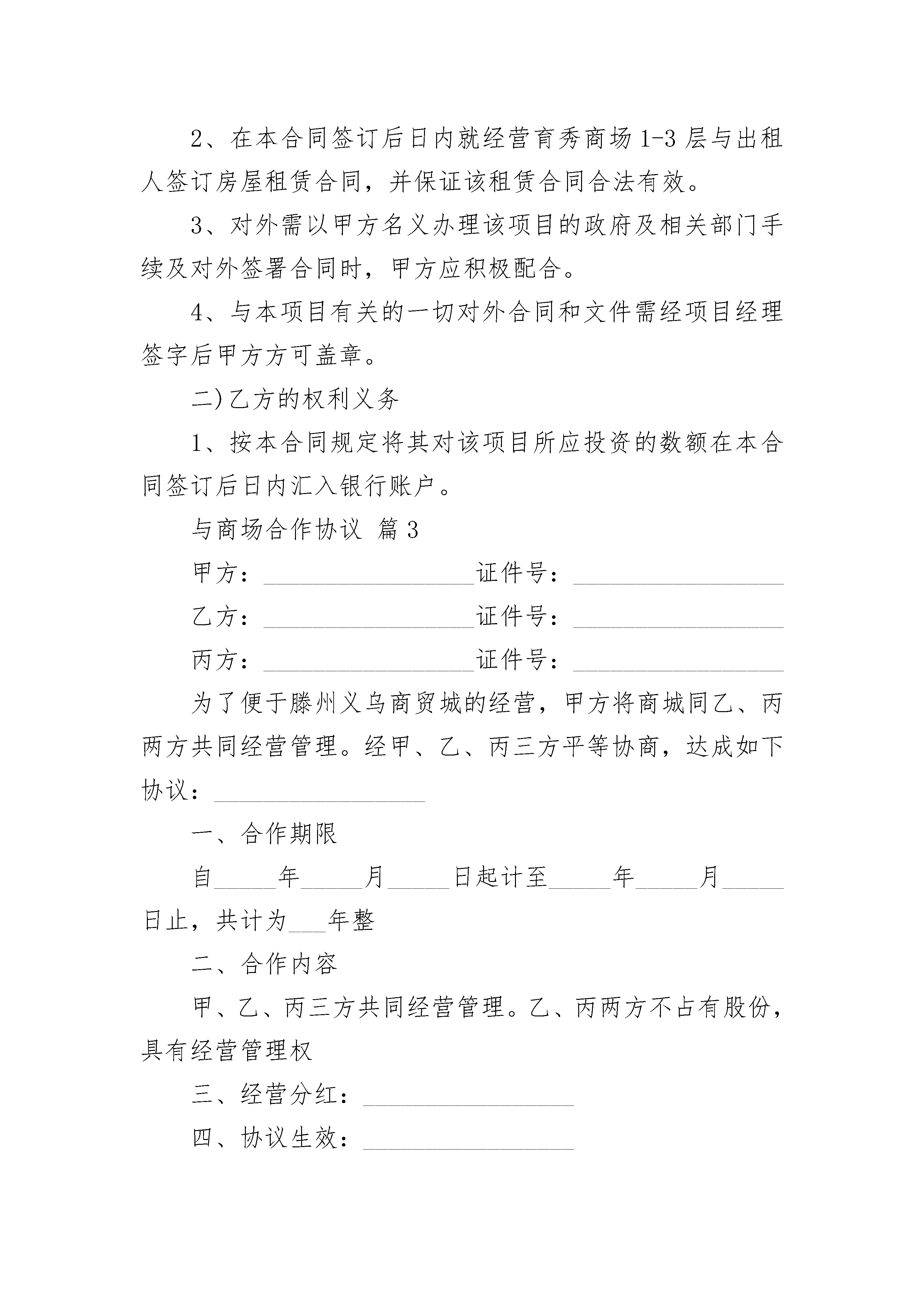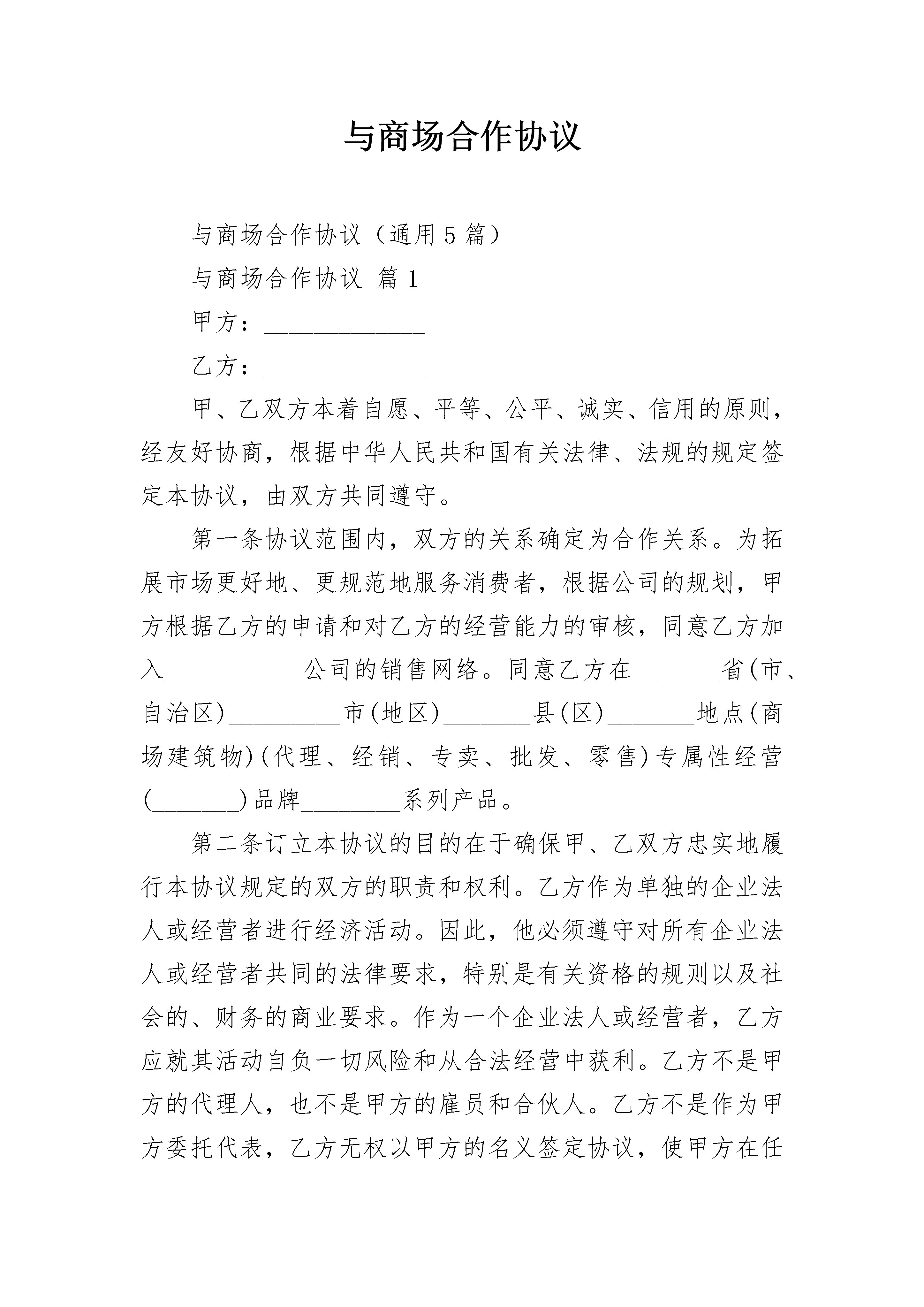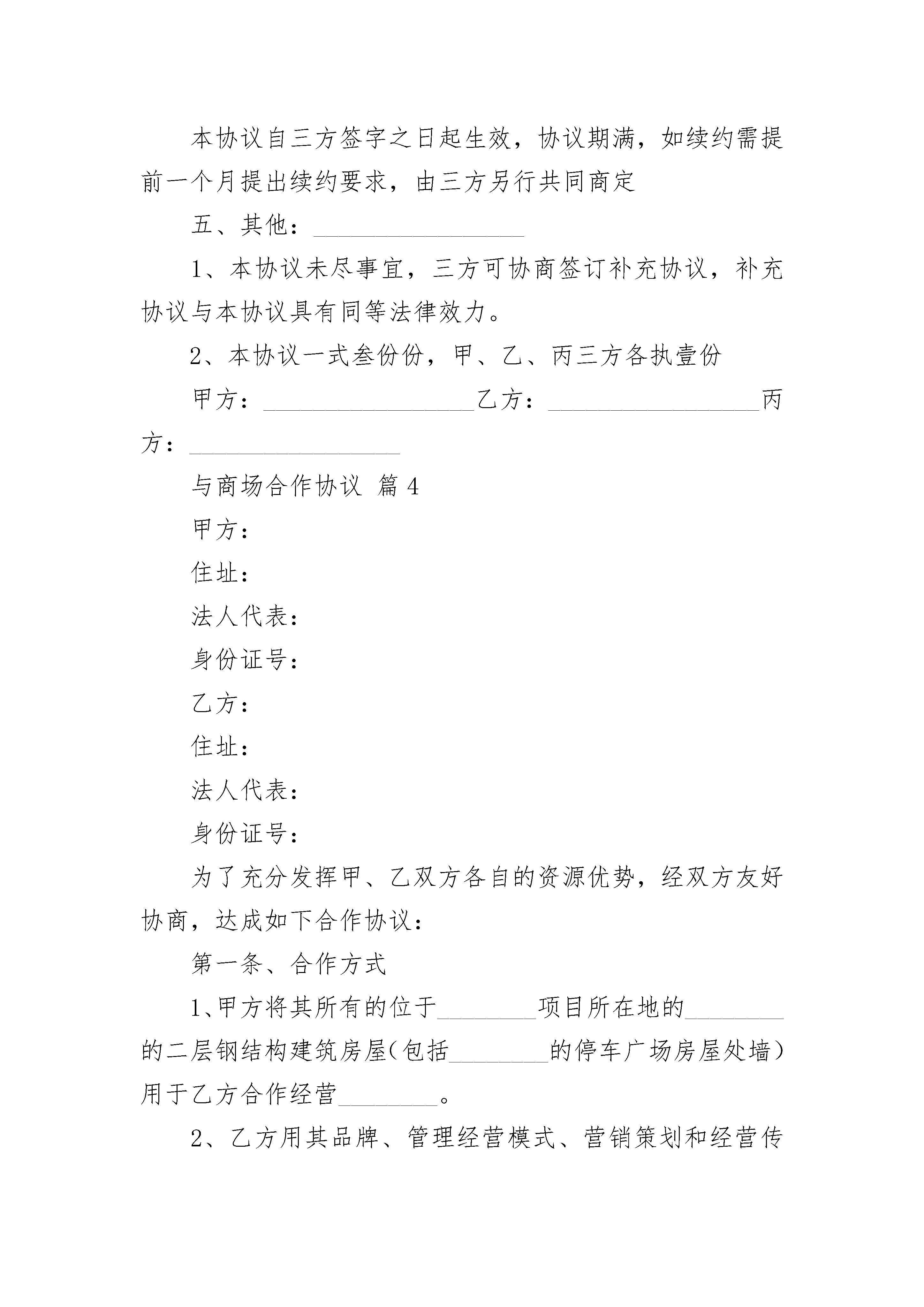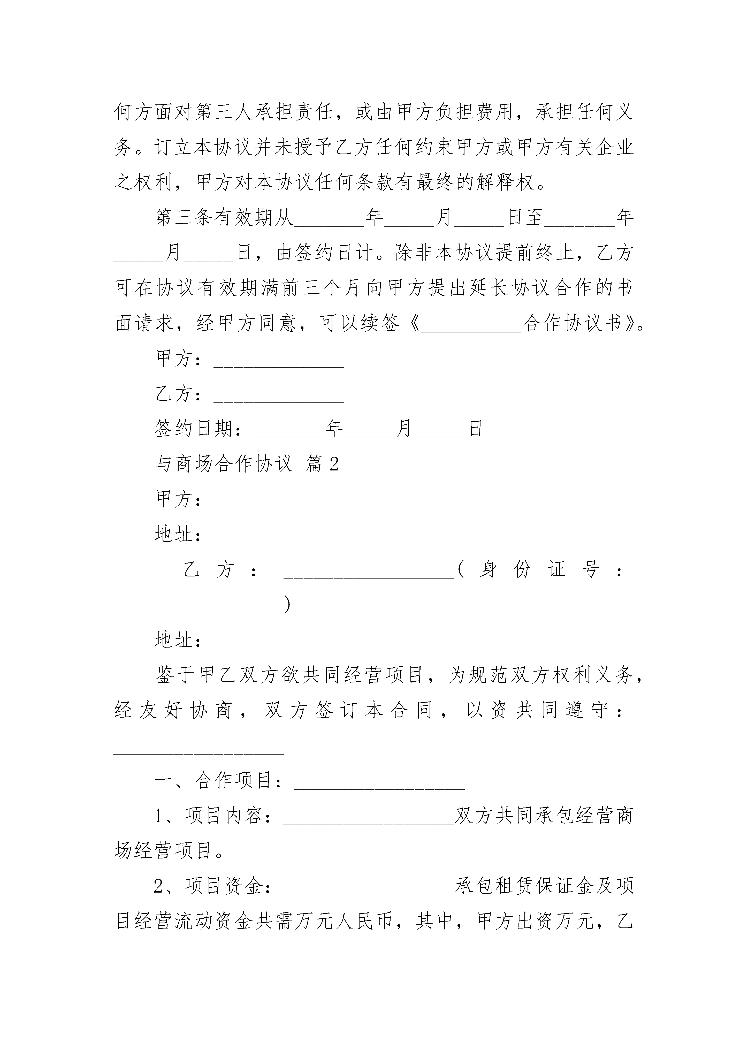 与商场合作协议与商场合作协议(通用5篇)与商场合作协议篇1甲方:_____________乙方:_____________甲、乙双方本着自愿、平等、公平、诚实、信用的原则,经友好协商,根据中华人民共和国有关法律、法规的规定签定本协议,由双方共同遵守。第一条协议范围内,双方的关系确定为合作关系。为拓展市场更好地、更规范地服务消费者,根据公司的规划,甲方根据乙方的申请和对乙方的经营能力的审核,同意乙方加入___________公司的销售网络。同意乙方在_______省(市、自治区)_________市(地区)_______县(区)_______地点(商场建筑物)(代理、经销、专卖、批发、零售)专属性经营(_______)品牌________系列产品。第二条订立本协议的目的在于确保甲、乙双方忠实地履行本协议规定的双方的职责和权利。乙方作为单独的企业法人或经营者进行经济活动。因此,他必须遵守对所有企业法人或经营者共同的法律要求,特别是有关资格的规则以及社会的、财务的商业要求。作为一个企业法人或经营者,乙方应就其活动自负一切风险和从合法经营中获利。乙方不是甲方的代理人,也不是甲方的雇员和合伙人。乙方不是作为甲方委托代表,乙方无权以甲方的名义签定协议,使甲方在任何方面对第三人承担责任,或由甲方负担费用,承担任何义务。订立本协议并未授予乙方任何约束甲方或甲方有关企业之权利,甲方对本协议任何条款有最终的解释权。第三条有效期从_______年_____月_____日至_______年_____月_____日,由签约日计。除非本协议提前终止,乙方可在协议有效期满前三个月向甲方提出延长协议合作的书面请求,经甲方同意,可以续签《__________合作协议书》。甲方:_____________乙方:_____________签约日期:_______年_____月_____日与商场合作协议篇2甲方:_________________地址:_________________乙方:_________________(身份证号:_________________)地址:_________________鉴于甲乙双方欲共同经营项目,为规范双方权利义务,经友好协商,双方签订本合同,以资共同遵守:_________________一、合作项目:_________________1、项目内容:_________________双方共同承包经营商场经营项目。2、项目资金:_________________承包租赁保证金及项目经营流动资金共需万元人民币,其中,甲方出资万元,乙方出资万元。二、合作方式:_________________1、本合同成立后,双方就该项目成立项目部,该项目部以甲方名义从事经营活动。2、项目部设项目经理,该项目相关经营管理活动由项目经理或其授权人员决定。3、项目经理由甲方指派或更换,但应征得乙方同意。4、双方按本合同规定的合作方式共同投资、共担风险、共享收益。三、项目经理职权项目部经理是该项目的全权负责人,行使下列职权:_________________1、主持该项目的经营管理工作;2、组织实施该项目年度经营计划;3、制订该项目部年度财务预算方案、决算方案;4、制订该项目的利润分配方案和弥补亏损方案;5、制定该项目部的具体规章制度;6、决定该项目部内部管理机构的设置;7、决定聘任或者解聘项目管理人员;四、双方权利义务一)甲方的权利义务1、按本合同规定将其对该项目所应投资的数额在本合同签订后日内汇入银行账户。2、在本合同签订后日内就经营育秀商场1-3层与出租人签订房屋租赁合同,并保证该租赁合同合法有效。3、对外需以甲方名义办理该项目的政府及相关部门手续及对外签署合同时,甲方应积极配合。4、与本项目有关的一切对外合同和文件需经项目经理签字后甲方方可盖章。二)乙方的权利义务1、按本合同规定将其对该项目所应投资的数额在本合同签订后日内汇入银行账户。与商场合作协议篇3甲方:_________________证件号:_________________乙方:_________________证件号:_________________丙方:_________________证件号:_________________为了便于滕州义乌商贸城的经营,甲方将商城同乙、丙两方共同经营管理。经甲、乙、丙三方平等协商,达成如下协议:_________________一、合作期限自_____年_____月_____日起计至_____年_____月_____日止,共计为___年整二、合作内容甲、乙、丙三方共同经营管理。乙、丙两方不占有股份,具有经营管理权三、经营分红:_________________四、协议生效:_________________本协议自三方签字之日起生效,