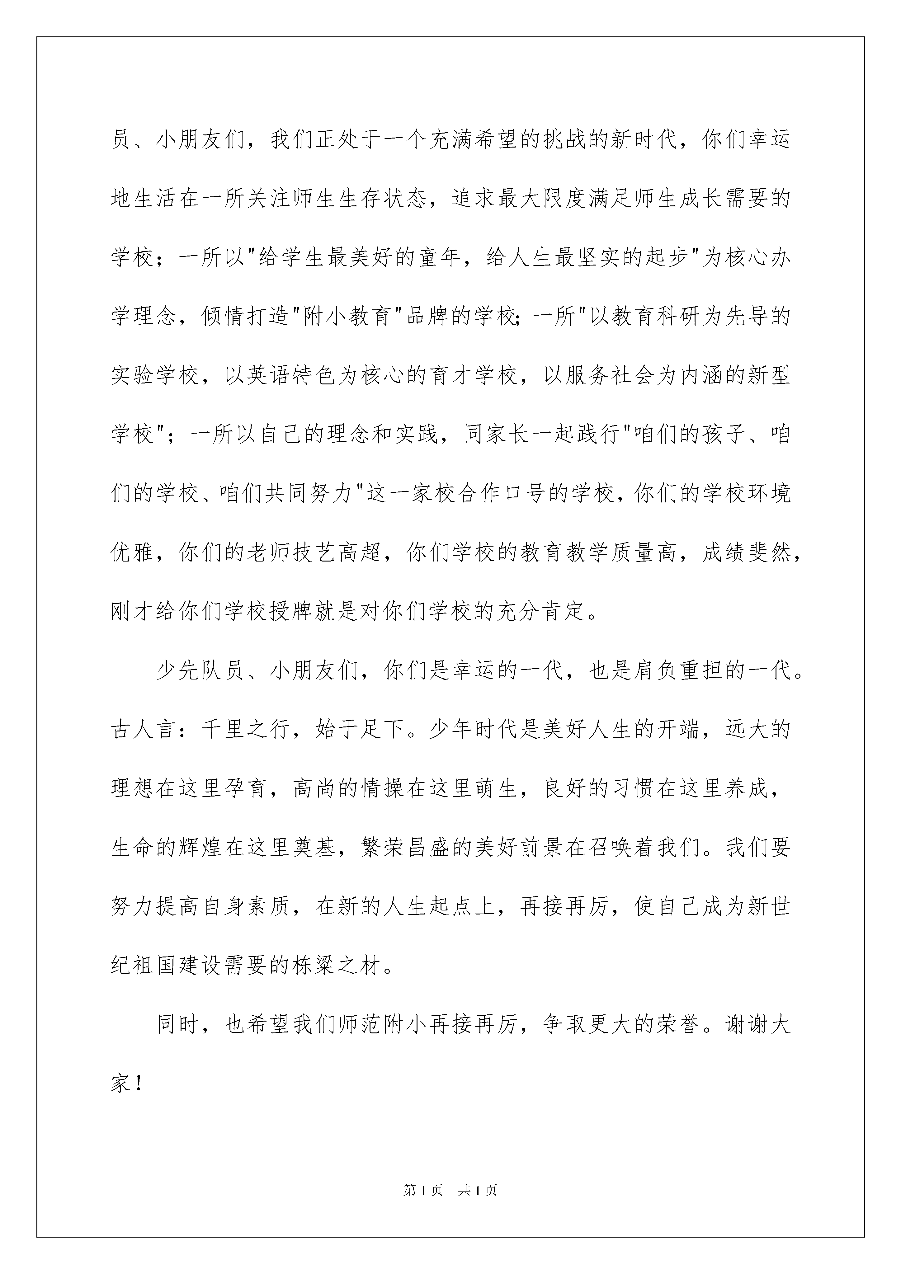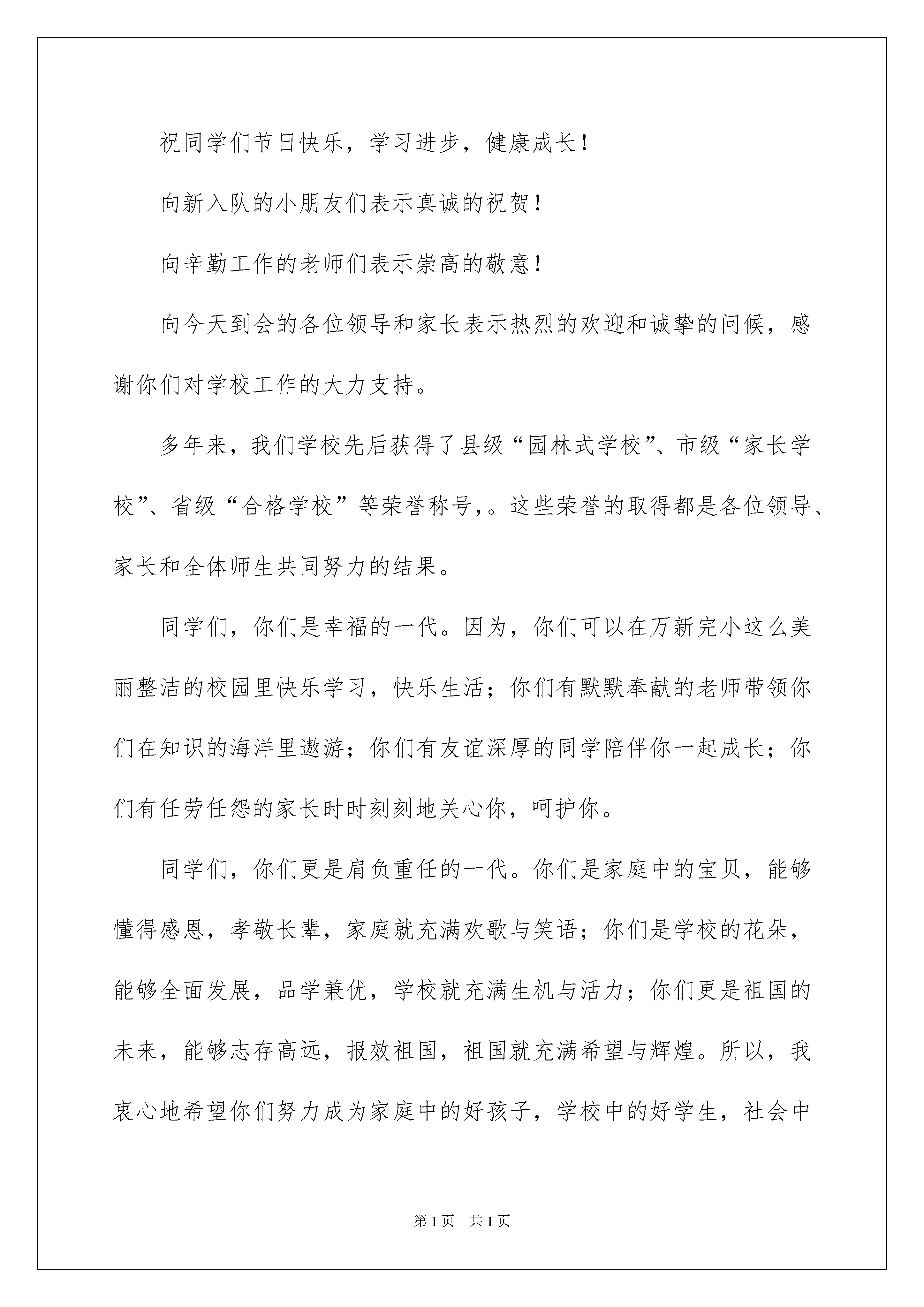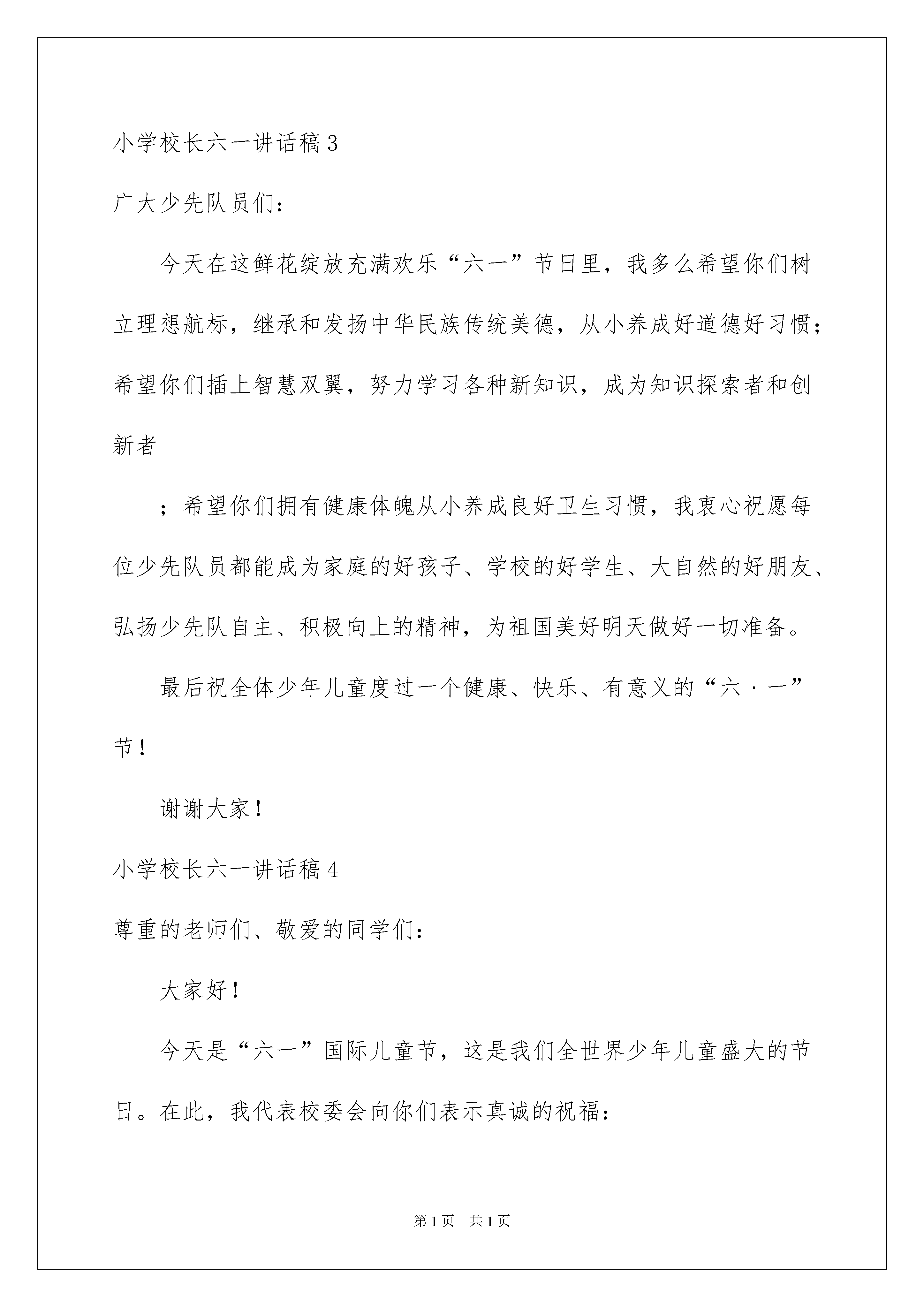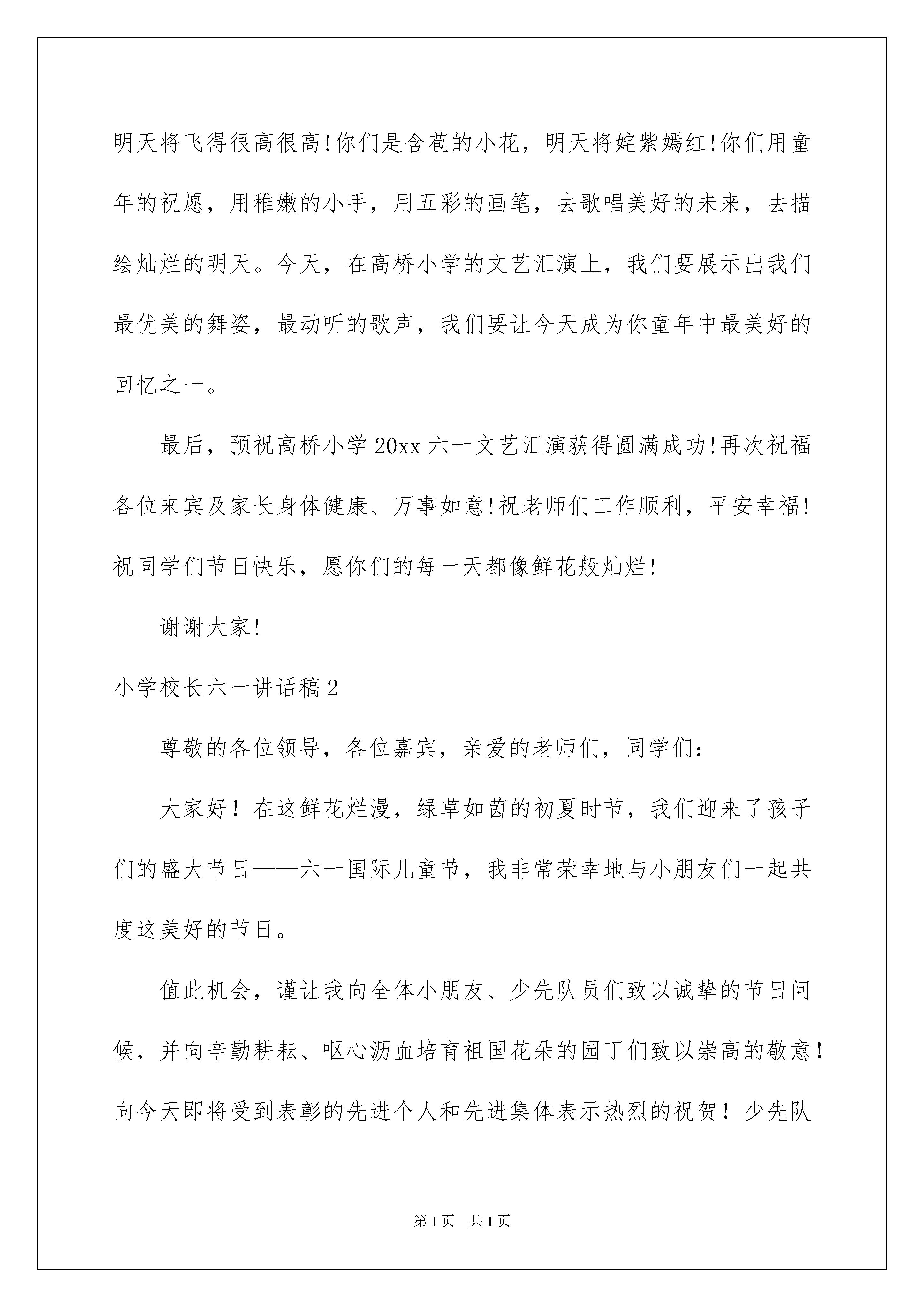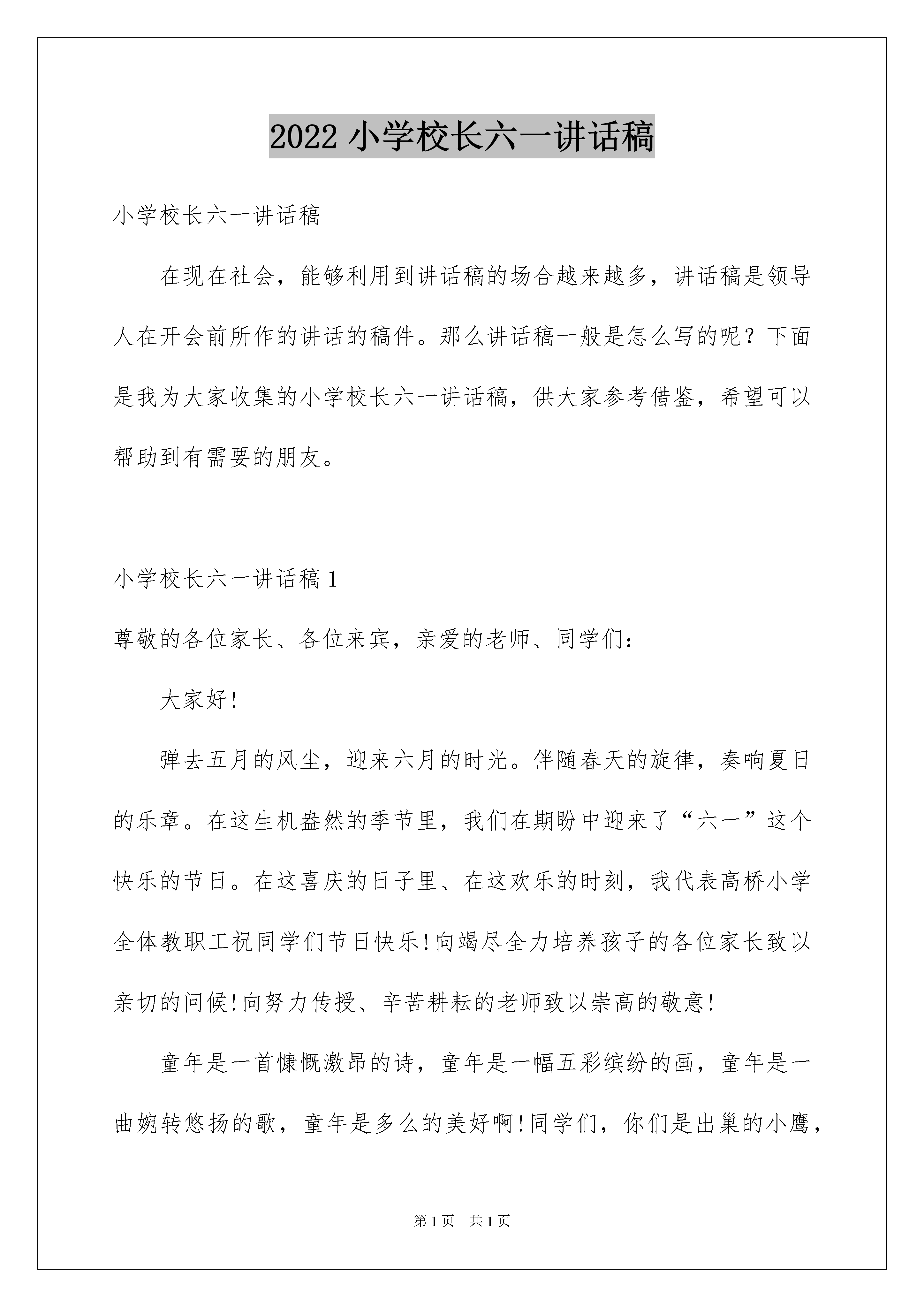 2022小学校长六一讲话稿小学校长六一讲话稿在现在社会,能够利用到讲话稿的场合越来越多,讲话稿是领导人在开会前所作的讲话的稿件。那么讲话稿一般是怎么写的呢?下面是我为大家收集的小学校长六一讲话稿,供大家参考借鉴,希望可以帮助到有需要的朋友。小学校长六一讲话稿1尊敬的各位家长、各位来宾,亲爱的老师、同学们:大家好!弹去五月的风尘,迎来六月的时光。伴随春天的旋律,奏响夏日的乐章。在这生机盎然的季节里,我们在期盼中迎来了“六一”这个快乐的节日。在这喜庆的日子里、在这欢乐的时刻,我代表高桥小学全体教职工祝同学们节日快乐!向竭尽全力培养孩子的各位家长致以亲切的问候!向努力传授、辛苦耕耘的老师致以崇高的敬意!童年是一首慷慨激昂的诗,童年是一幅五彩缤纷的画,童年是一曲婉转悠扬的歌,童年是多么的美好啊!同学们,你们是出巢的小鹰,明天将飞得很高很高!你们是含苞的小花,明天将姹紫嫣红!你们用童年的祝愿,用稚嫩的小手,用五彩的画笔,去歌唱美好的未来,去描绘灿烂的明天。今天,在高桥小学的文艺汇演上,我们要展示出我们最优美的舞姿,最动听的歌声,我们要让今天成为你童年中最美好的回忆之一。最后,预祝高桥小学20xx六一文艺汇演获得圆满成功!再次祝福各位来宾及家长身体健康、万事如意!祝老师们工作顺利,平安幸福!祝同学们节日快乐,愿你们的每一天都像鲜花般灿烂!谢谢大家!小学校长六一讲话稿2尊敬的各位领导,各位嘉宾,亲爱的老师们,同学们:大家好!在这鲜花烂漫,绿草如茵的初夏时节,我们迎来了孩子们的盛大节日——六一国际儿童节,我非常荣幸地与小朋友们一起共度这美好的节日。值此机会,谨让我向全体小朋友、少先队员们致以诚挚的节日问候,并向辛勤耕耘、呕心沥血培育祖国花朵的园丁们致以崇高的敬意!向今天即将受到表彰的先进个人和先进集体表示热烈的祝贺!少先队员、小朋友们,我们正处于一个充满希望的挑战的新时代,你们幸运地生活在一所关注师生生存状态,追求最大限度满足师生成长需要的学校;一所以"给学生最美好的童年,给人生最坚实的起步"为核心办学理念,倾情打造"附小教育"品牌的学校;一所"以教育科研为先导的实验学校,以英语特色为核心的育才学校,以服务社会为内涵的新型学校";一所以自己的理念和实践,同家长一起践行"咱们的孩子、咱们的学校、咱们共同努力"这一家校合作口号的学校,你们的学校环境优雅,你们的老师技艺高超,你们学校的教育教学质量高,成绩斐然,刚才给你们学校授牌就是对你们学校的充分肯定。少先队员、小朋友们,你们是幸运的一代,也是肩负重担的一代。古人言:千里之行,始于足下。少年时代是美好人生的开端,远大的理想在这里孕育,高尚的情操在这里萌生,良好的习惯在这里养成,生命的辉煌在这里奠基,繁荣昌盛的美好前景在召唤着我们。我们要努力提高自身素质,在新的人生起点上,再接再厉,使自己成为新世纪祖国建设需要的栋粱之材。同时,也希望我们师范附小再接再厉,争取更大的荣誉。谢谢大家!小学校长六一讲话稿3广大少先队员们:今天在这鲜花绽放充满欢乐“六一”节日里,我多么希望你们树立理想航标,继承和发扬中华民族传统美德,从小养成好道德好习惯;希望你们插上智慧双翼,努力学习各种新知识,成为知识探索者和创新者;希望你们拥有健康体魄从小养成良好卫生习惯,我衷心祝愿每位少先队员都能成为家庭的好孩子、学校的好学生、大自然的好朋友、弘扬少先队自主、积极向上的精神,为祖国美好明天做好一切准备。最后祝全体少年儿童度过一个健康、快乐、有意义的“六﹒一”节!谢谢大家!小学校长六一讲话稿4尊重的老师们、敬爱的同学们:大家好!今天是“六一”国际儿童节,这是我们全世界少年儿童盛大的节日。在此,我代表校委会向你们表示真诚的祝福:祝同学们节日快乐,学习进步,健康成长!向新入队的小朋友们表示真诚的祝贺!向辛勤工作的老师们表示崇高的敬意!向今天到会的各位领导和家长表示热烈的欢迎和诚挚的问候,感谢你们对学校工作的大力支持。多年来,我们学校先后获得了县级“园林式学校”、市级“家长学校”、省级“合格学校”等荣誉称号,。这些荣誉的取得都是各位领导、家长和全体师生共同努力的结果。同学们,你们是幸福的一代。因为,你们可以在万新完小这么美丽整洁的校园里快乐学习,快乐生活;你们有默默奉献的老师带领你们在知识的海洋里遨游;你们有友谊深厚的同学陪伴你一起成长;你们有任劳任怨的家长时时刻刻地关心你,呵护你。同学们,你们更是肩负重任的一代。你们是家庭中的宝贝,能够懂得感恩,孝敬长辈,家庭就充满欢歌与笑语;你们是学校的花朵,能够全面发展,品学兼优,学校就充满生机与活力;你们更是祖国的未来,能够志存高远,报效祖国,