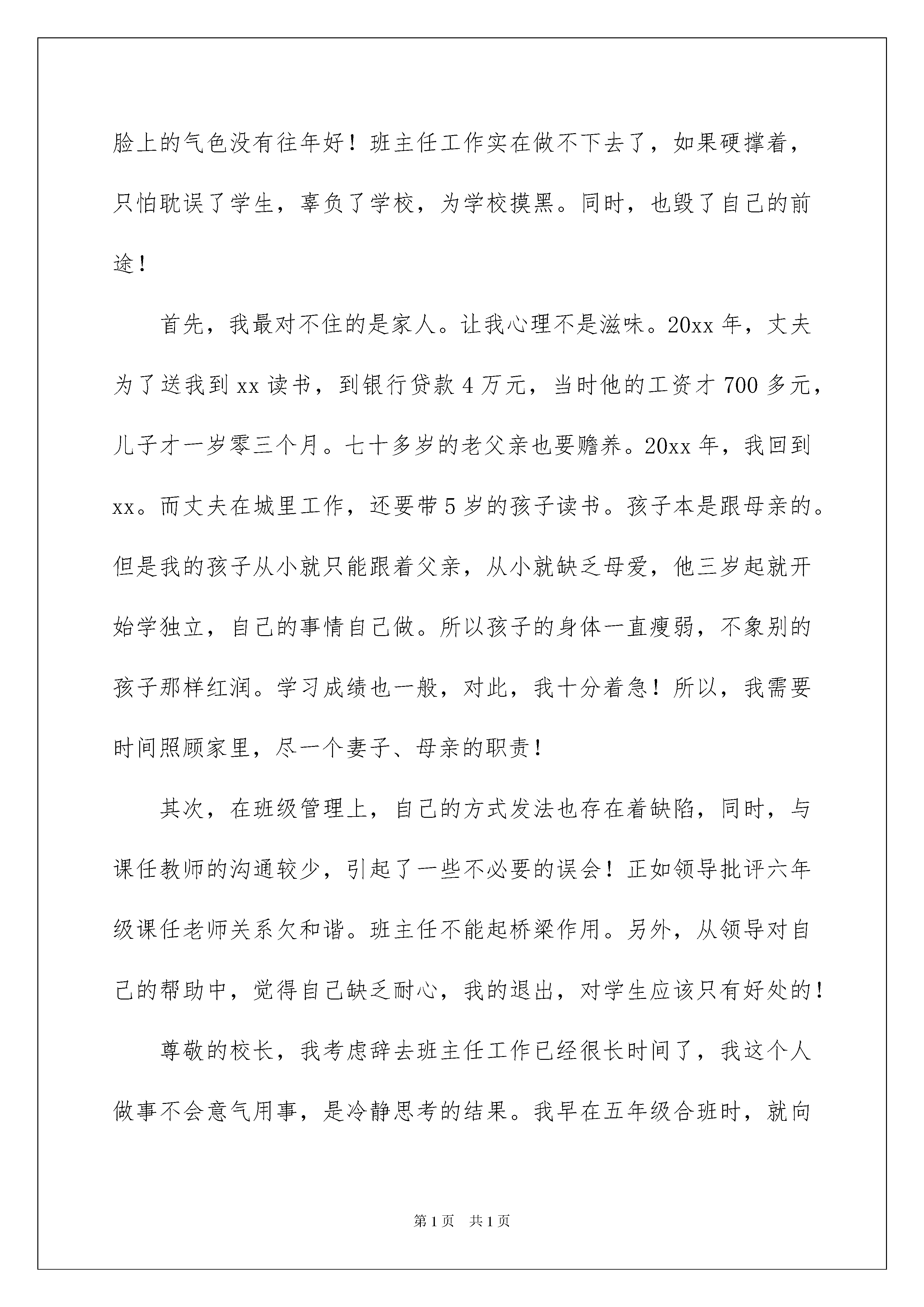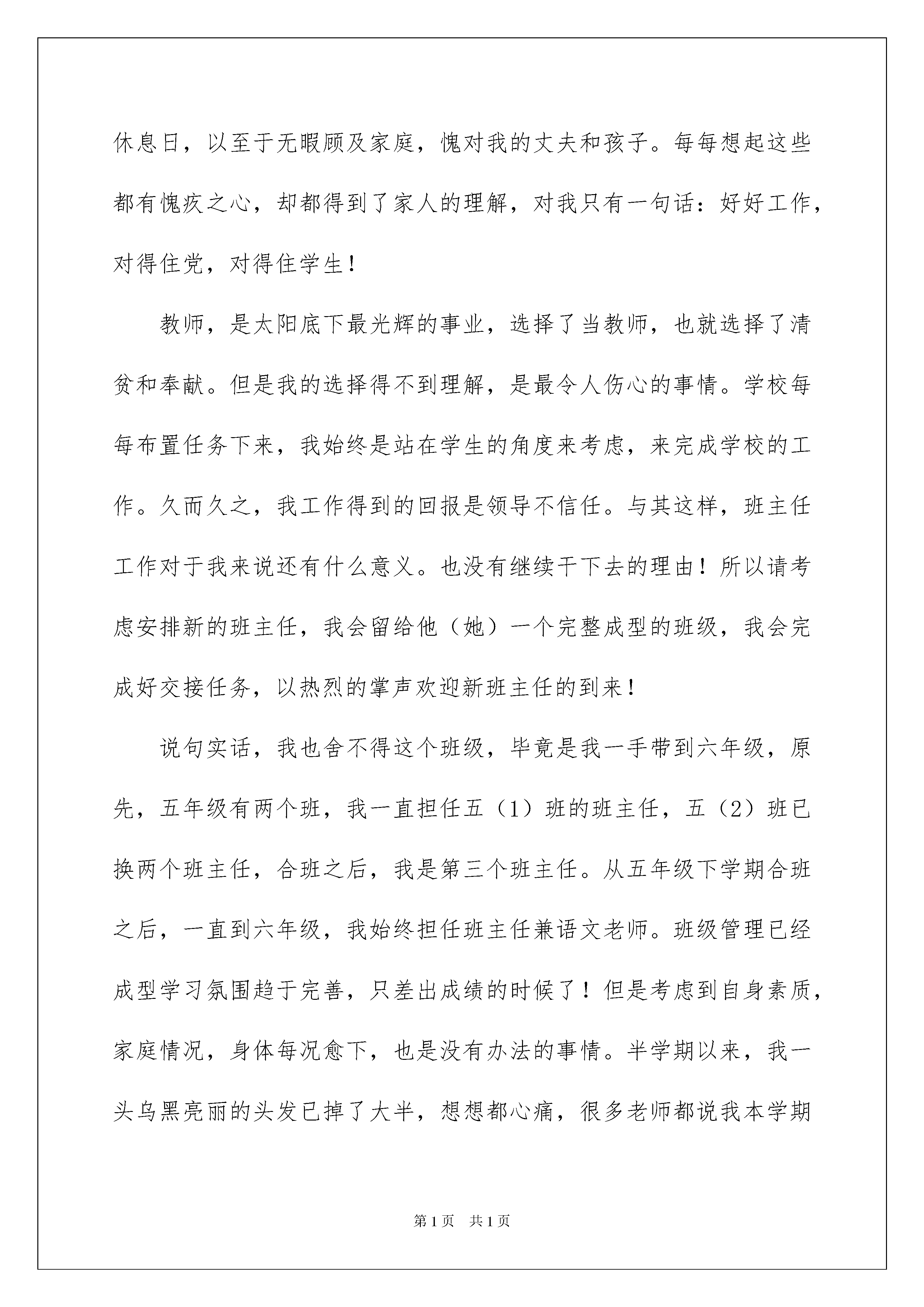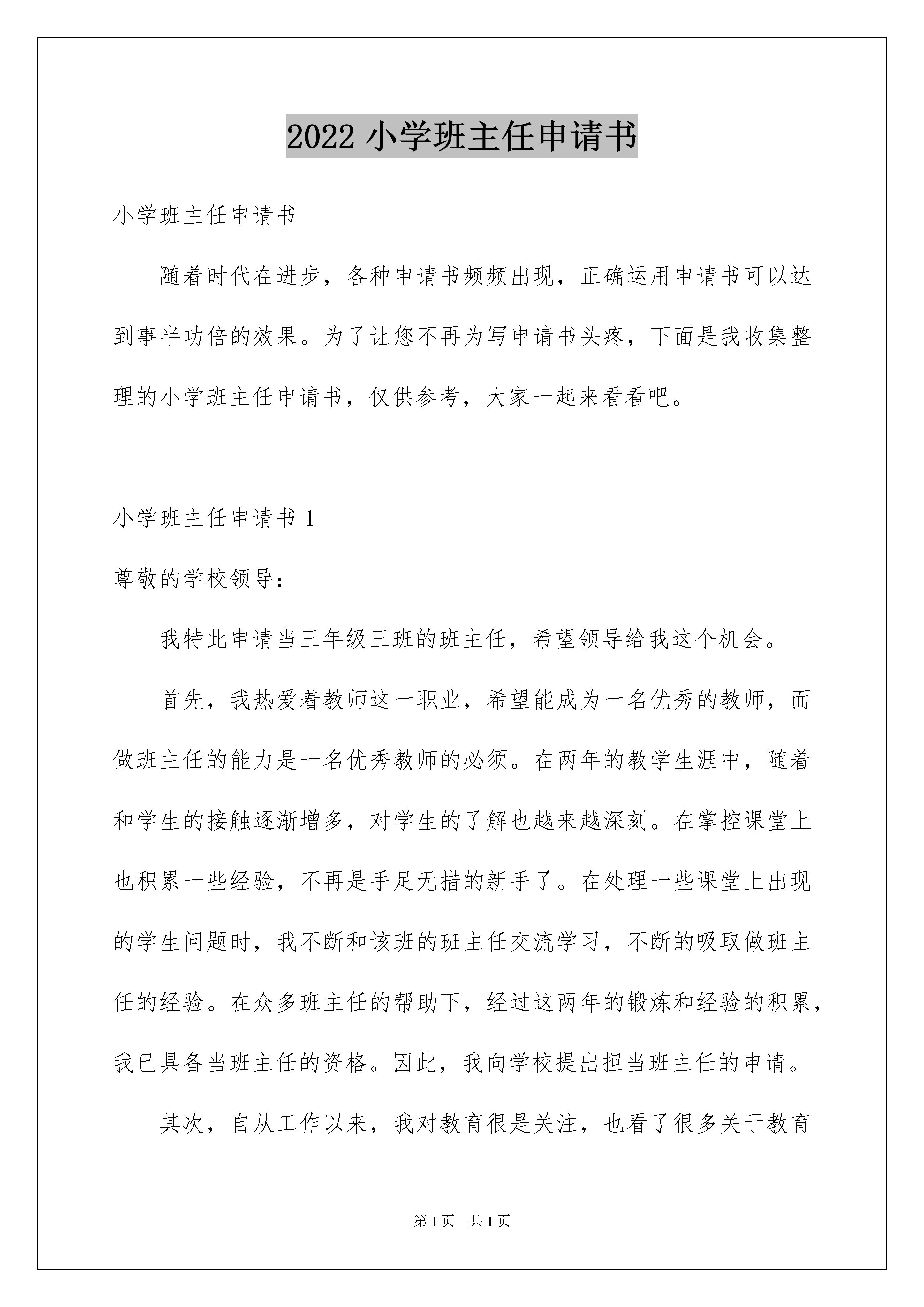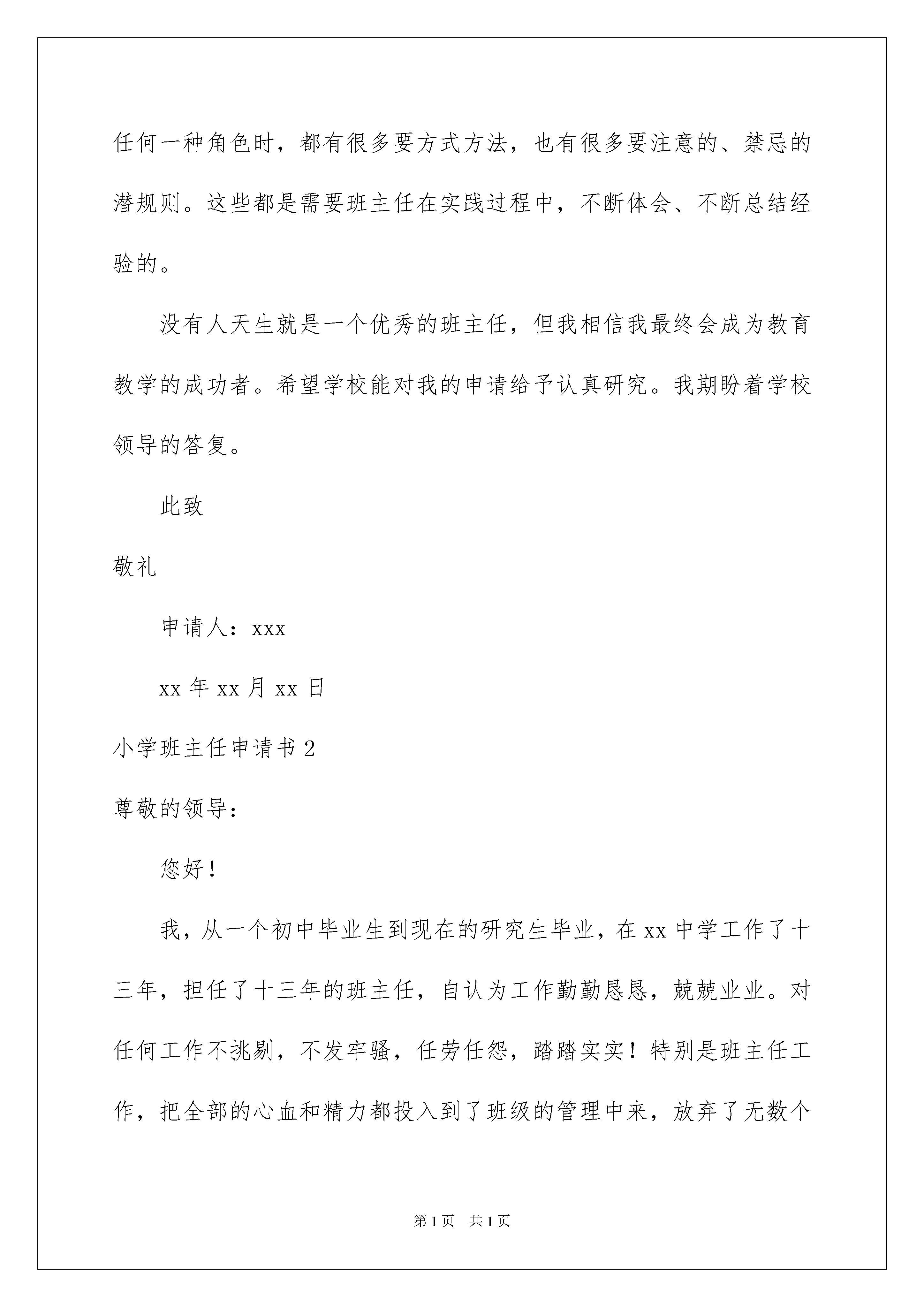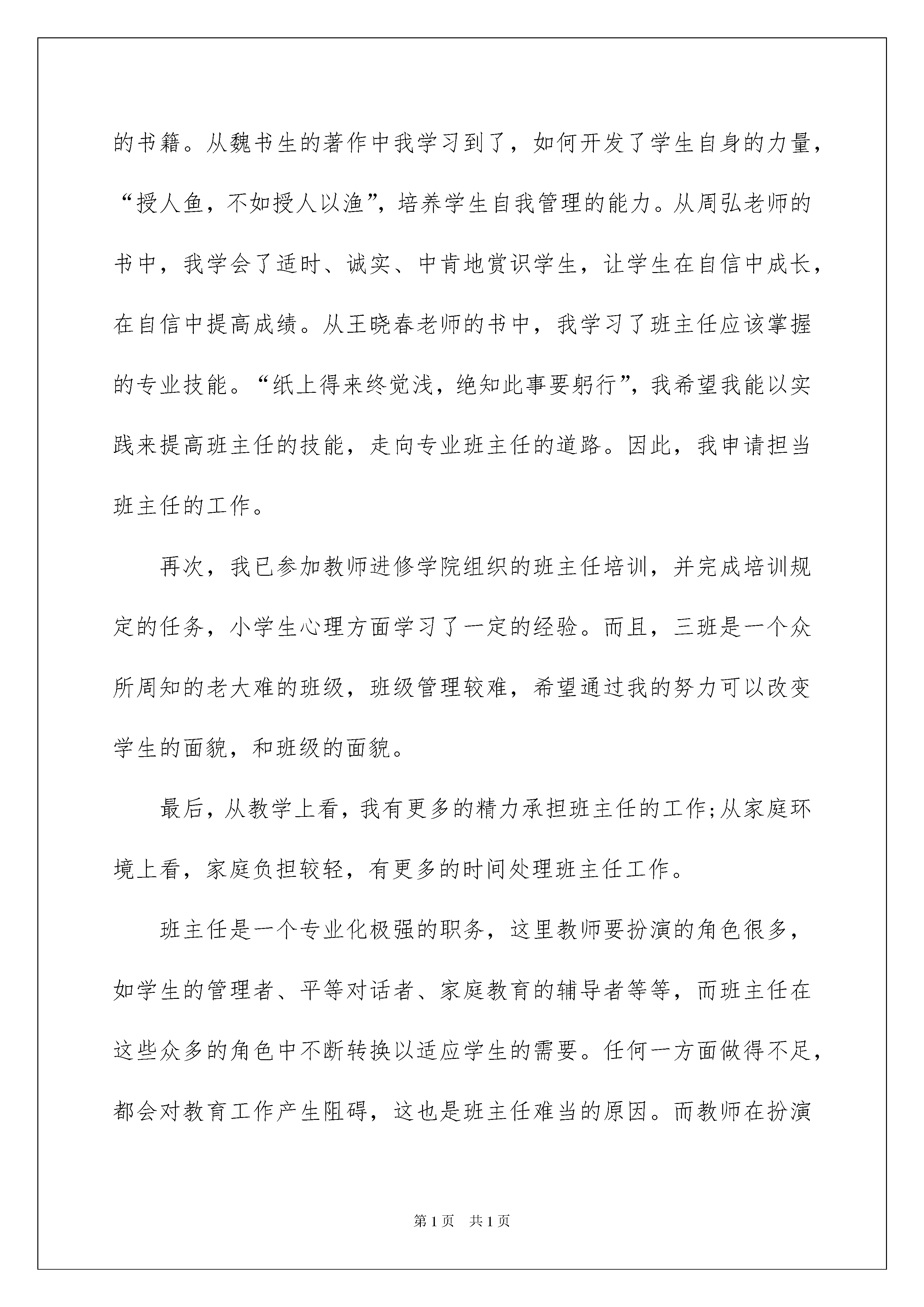 2022小学班主任申请书小学班主任申请书随着时代在进步,各种申请书频频出现,正确运用申请书可以达到事半功倍的效果。为了让您不再为写申请书头疼,下面是我收集整理的小学班主任申请书,仅供参考,大家一起来看看吧。小学班主任申请书1尊敬的学校领导:我特此申请当三年级三班的班主任,希望领导给我这个机会。首先,我热爱着教师这一职业,希望能成为一名优秀的教师,而做班主任的能力是一名优秀教师的必须。在两年的教学生涯中,随着和学生的接触逐渐增多,对学生的了解也越来越深刻。在掌控课堂上也积累一些经验,不再是手足无措的新手了。在处理一些课堂上出现的学生问题时,我不断和该班的班主任交流学习,不断的吸取做班主任的经验。在众多班主任的帮助下,经过这两年的锻炼和经验的积累,我已具备当班主任的资格。因此,我向学校提出担当班主任的申请。其次,自从工作以来,我对教育很是关注,也看了很多关于教育的书籍。从魏书生的著作中我学习到了,如何开发了学生自身的力量,“授人鱼,不如授人以渔”,培养学生自我管理的能力。从周弘老师的书中,我学会了适时、诚实、中肯地赏识学生,让学生在自信中成长,在自信中提高成绩。从王晓春老师的书中,我学习了班主任应该掌握的专业技能。“纸上得来终觉浅,绝知此事要躬行”,我希望我能以实践来提高班主任的技能,走向专业班主任的道路。因此,我申请担当班主任的工作。再次,我已参加教师进修学院组织的班主任培训,并完成培训规定的任务,小学生心理方面学习了一定的经验。而且,三班是一个众所周知的老大难的班级,班级管理较难,希望通过我的努力可以改变学生的面貌,和班级的面貌。最后,从教学上看,我有更多的精力承担班主任的工作;从家庭环境上看,家庭负担较轻,有更多的时间处理班主任工作。班主任是一个专业化极强的职务,这里教师要扮演的角色很多,如学生的管理者、平等对话者、家庭教育的辅导者等等,而班主任在这些众多的角色中不断转换以适应学生的需要。任何一方面做得不足,都会对教育工作产生阻碍,这也是班主任难当的原因。而教师在扮演任何一种角色时,都有很多要方式方法,也有很多要注意的、禁忌的潜规则。这些都是需要班主任在实践过程中,不断体会、不断总结经验的。没有人天生就是一个优秀的班主任,但我相信我最终会成为教育教学的成功者。希望学校能对我的申请给予认真研究。我期盼着学校领导的答复。此致敬礼申请人:xxxxx年xx月xx日小学班主任申请书2尊敬的领导:您好!我,从一个初中毕业生到现在的研究生毕业,在xx中学工作了十三年,担任了十三年的班主任,自认为工作勤勤恳恳,兢兢业业。对任何工作不挑剔,不发牢骚,任劳任怨,踏踏实实!特别是班主任工作,把全部的心血和精力都投入到了班级的管理中来,放弃了无数个休息日,以至于无暇顾及家庭,愧对我的丈夫和孩子。每每想起这些都有愧疚之心,却都得到了家人的理解,对我只有一句话:好好工作,对得住党,对得住学生!教师,是太阳底下最光辉的事业,选择了当教师,也就选择了清贫和奉献。但是我的选择得不到理解,是最令人伤心的事情。学校每每布置任务下来,我始终是站在学生的角度来考虑,来完成学校的工作。久而久之,我工作得到的回报是领导不信任。与其这样,班主任工作对于我来说还有什么意义。也没有继续干下去的理由!所以请考虑安排新的班主任,我会留给他(她)一个完整成型的班级,我会完成好交接任务,以热烈的掌声欢迎新班主任的到来!说句实话,我也舍不得这个班级,毕竟是我一手带到六年级,原先,五年级有两个班,我一直担任五(1)班的班主任,五(2)班已换两个班主任,合班之后,我是第三个班主任。从五年级下学期合班之后,一直到六年级,我始终担任班主任兼语文老师。班级管理已经成型学习氛围趋于完善,只差出成绩的时候了!但是考虑到自身素质,家庭情况,身体每况愈下,也是没有办法的事情。半学期以来,我一头乌黑亮丽的头发已掉了大半,想想都心痛,很多老师都说我本学期脸上的气色没有往年好!班主任工作实在做不下去了,如果硬撑着,只怕耽误了学生,辜负了学校,为学校摸黑。同时,也毁了自己的前途!首先,我最对不住的是家人。让我心理不是滋味。20xx年,丈夫为了送我到xx读书,到银行贷款4万元,当时他的工资才700多元,儿子才一岁零三个月。七十多岁的老父亲也要赡养。20xx年,我回到xx。而丈夫在城里工作,还要带5岁的孩子读书。孩子本是跟母亲的。但是我的孩子从小就只能跟着父亲,从小就缺乏母爱,他三岁起就开始学独立,自己的事情自己做。所以孩子的身体一直瘦弱,不象别的孩子那样红润。学习成绩也一般,对此,我十分着急!所以,我需要时间照顾家里,尽一个妻子、母亲的职责!其次,在班级管理